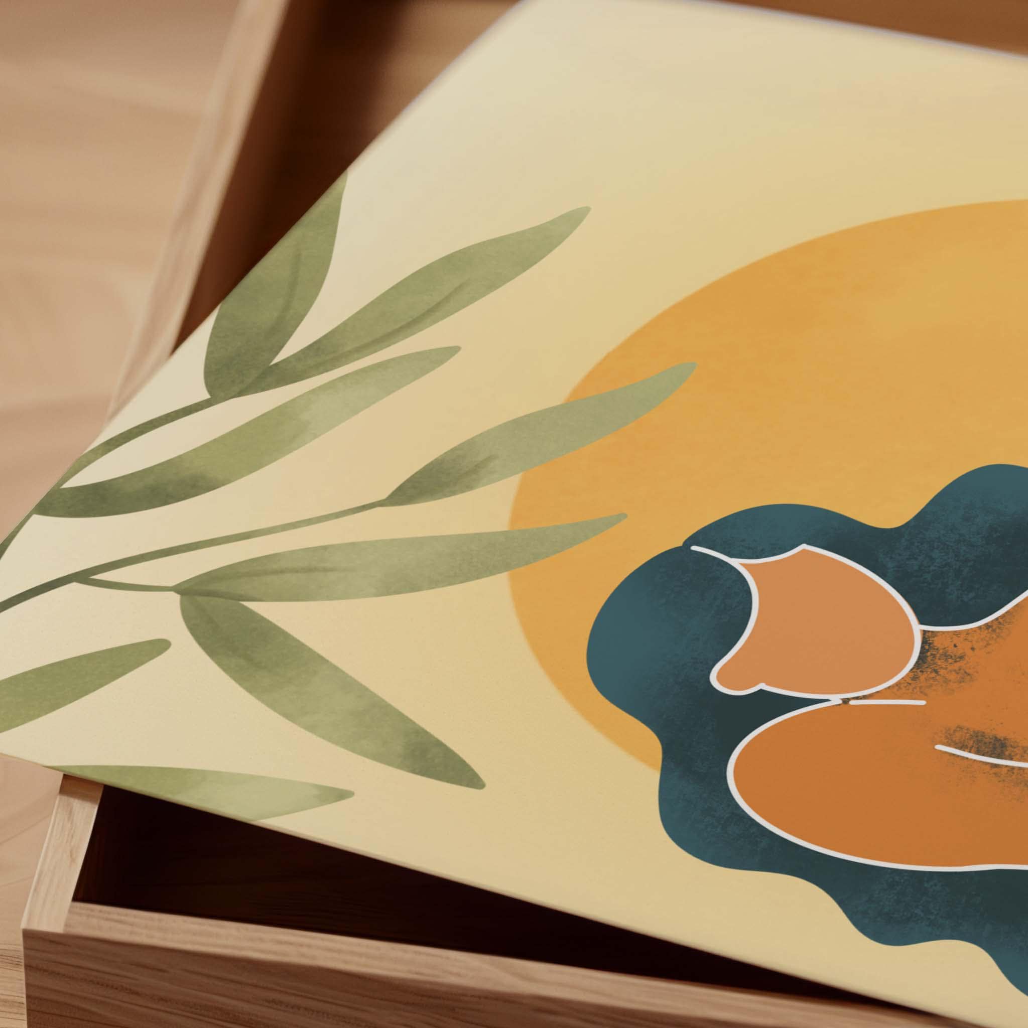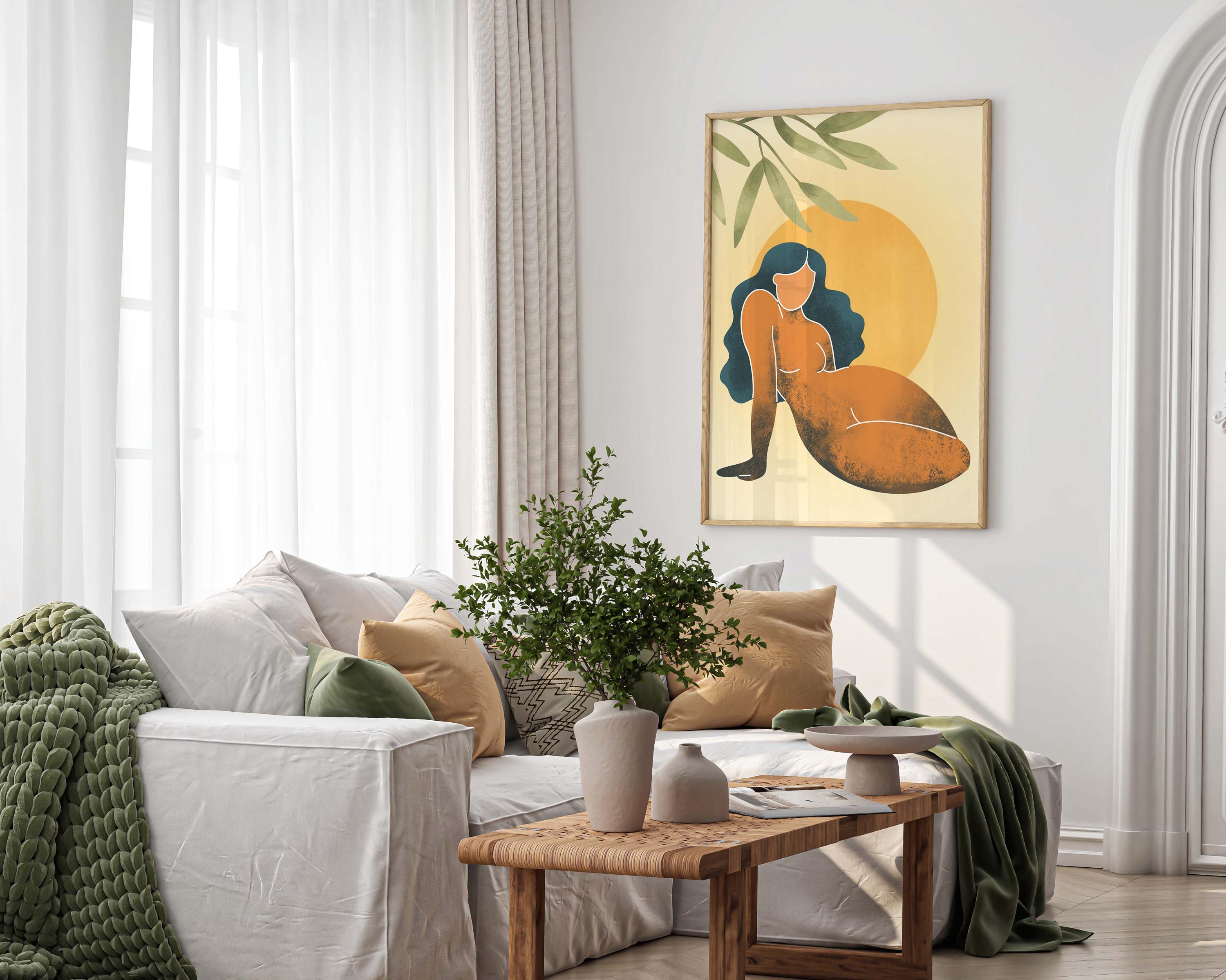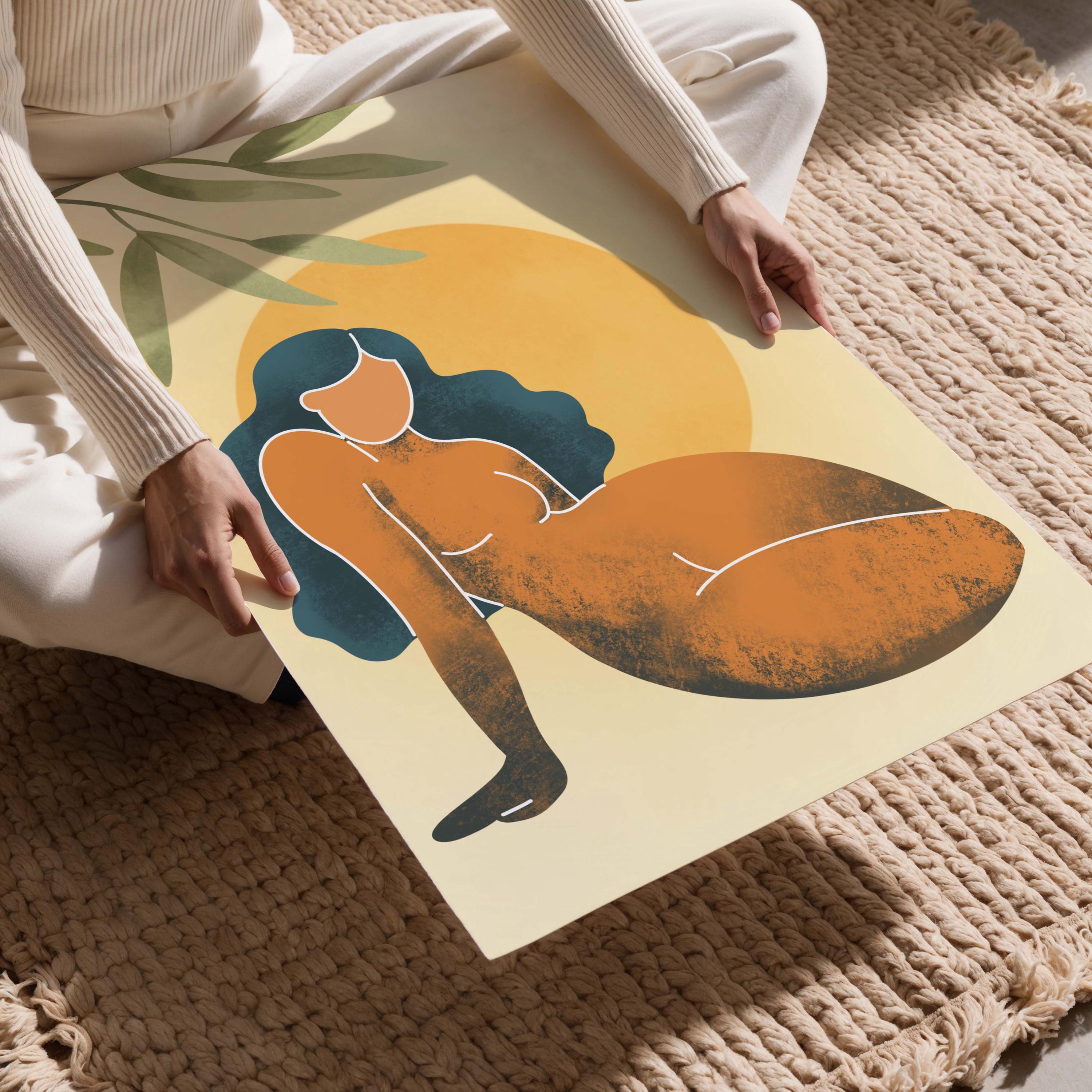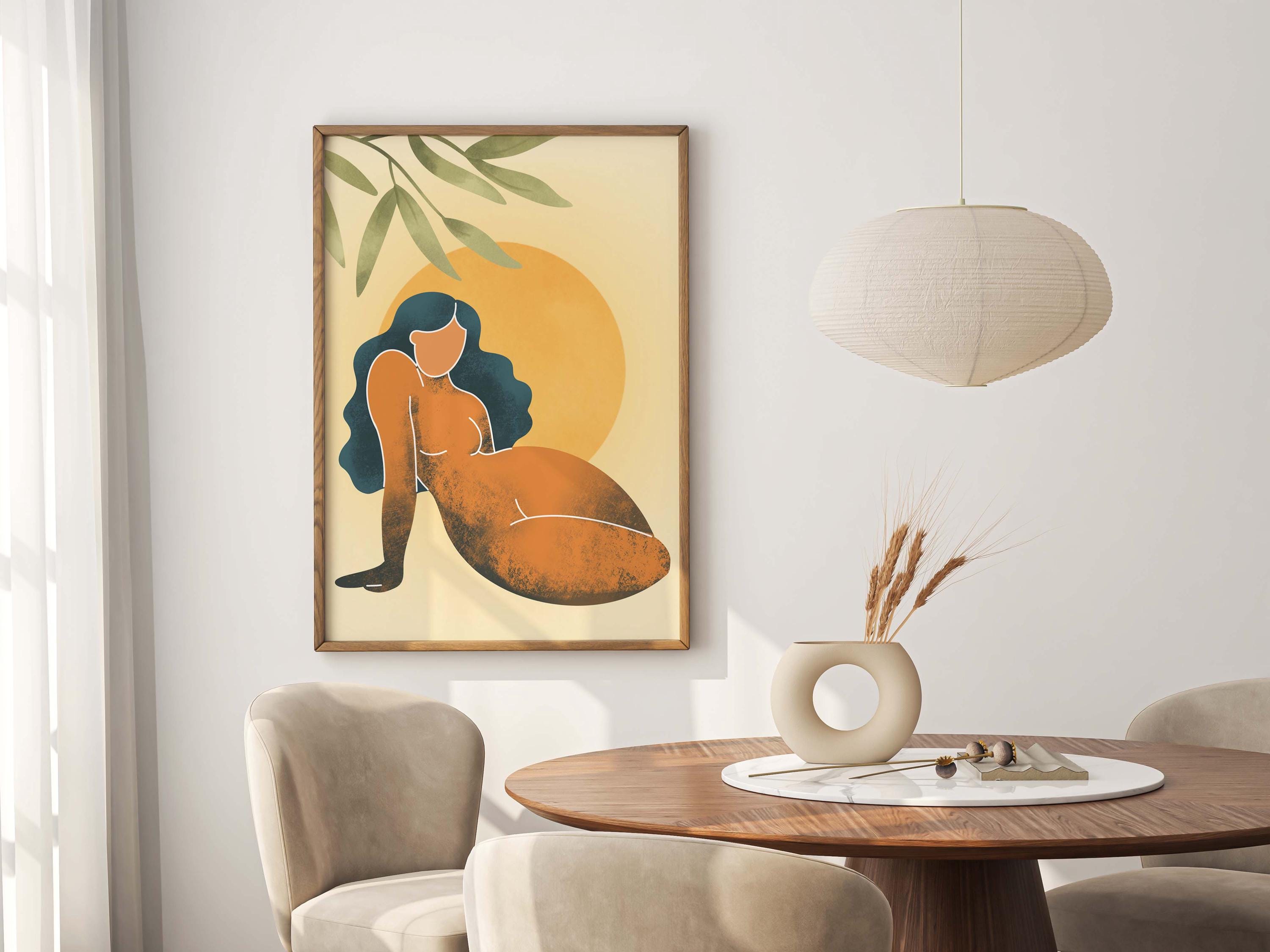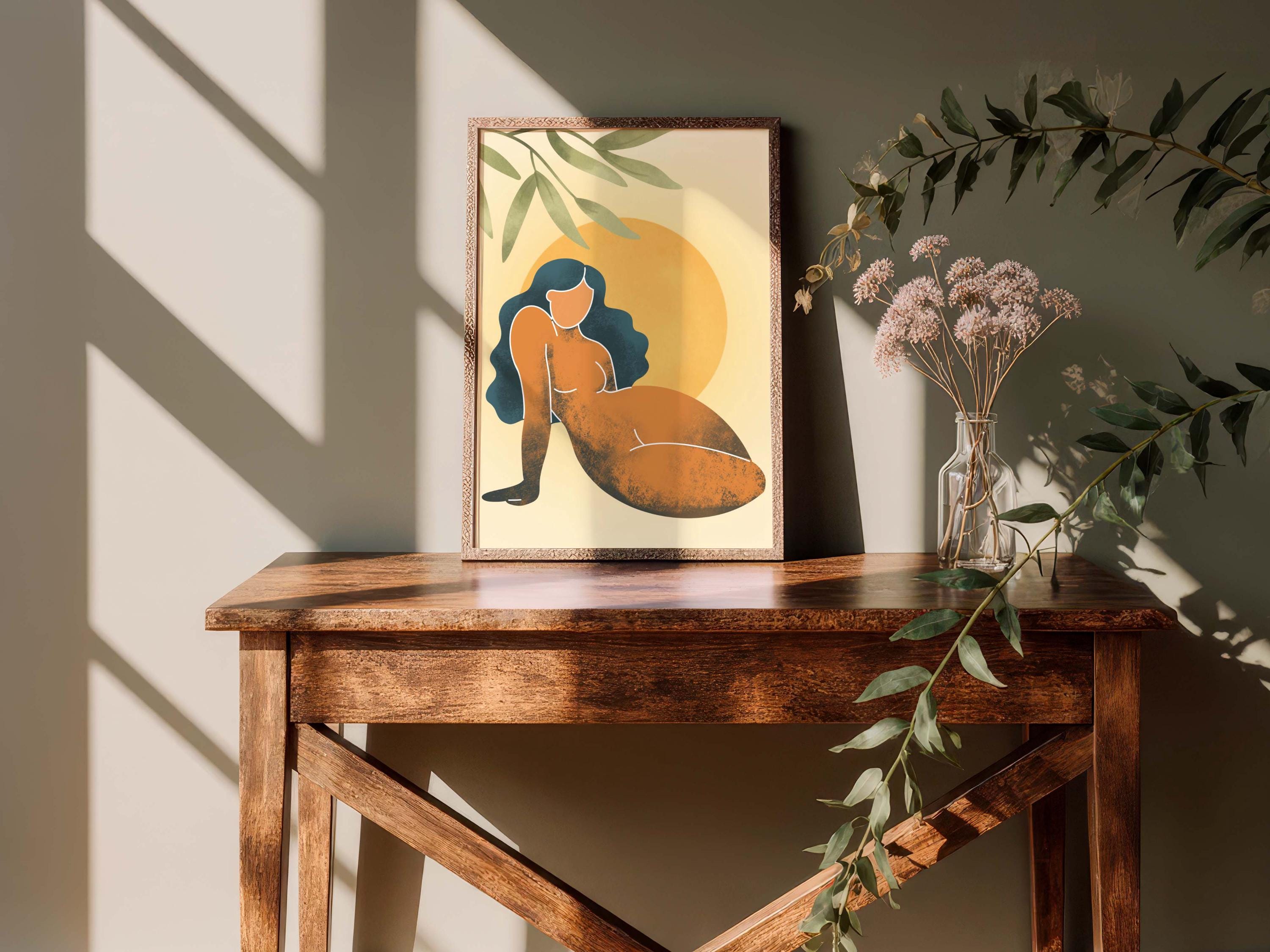 Black woman wall art print featuring a bold feminine silhouette beneath a glowing sun. Surrounded by stylized plant leaves and soft vintage textures, this piece blends femininity, body positivity, and modern boho style.