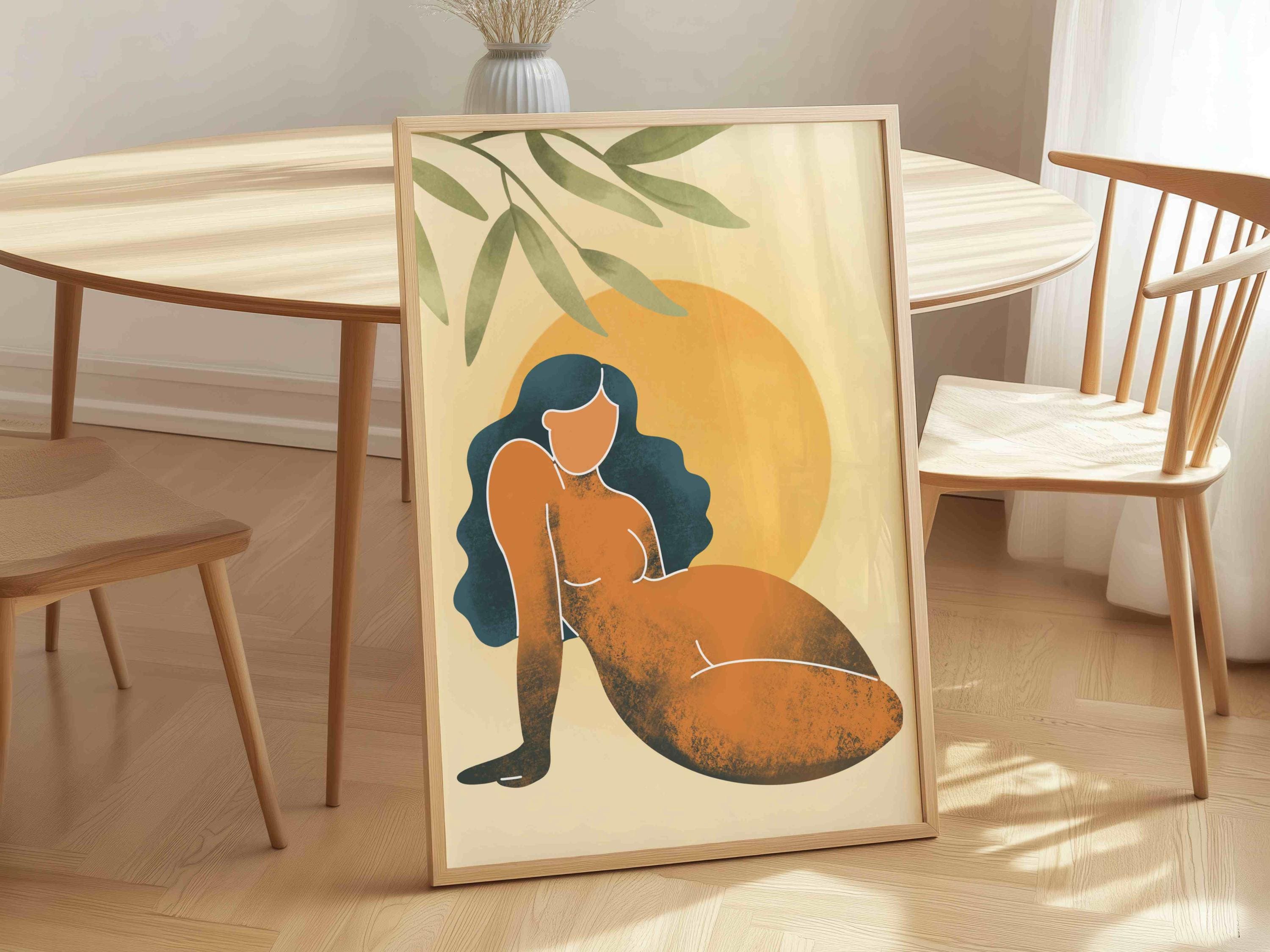 Celebrate confidence and clarity with this radiant black woman wall art print, featuring a bold feminine silhouette beneath a glowing sun. Surrounded by stylized plant leaves and soft vintage textures, this piece blends femininity, body positivity, and modern boho style.