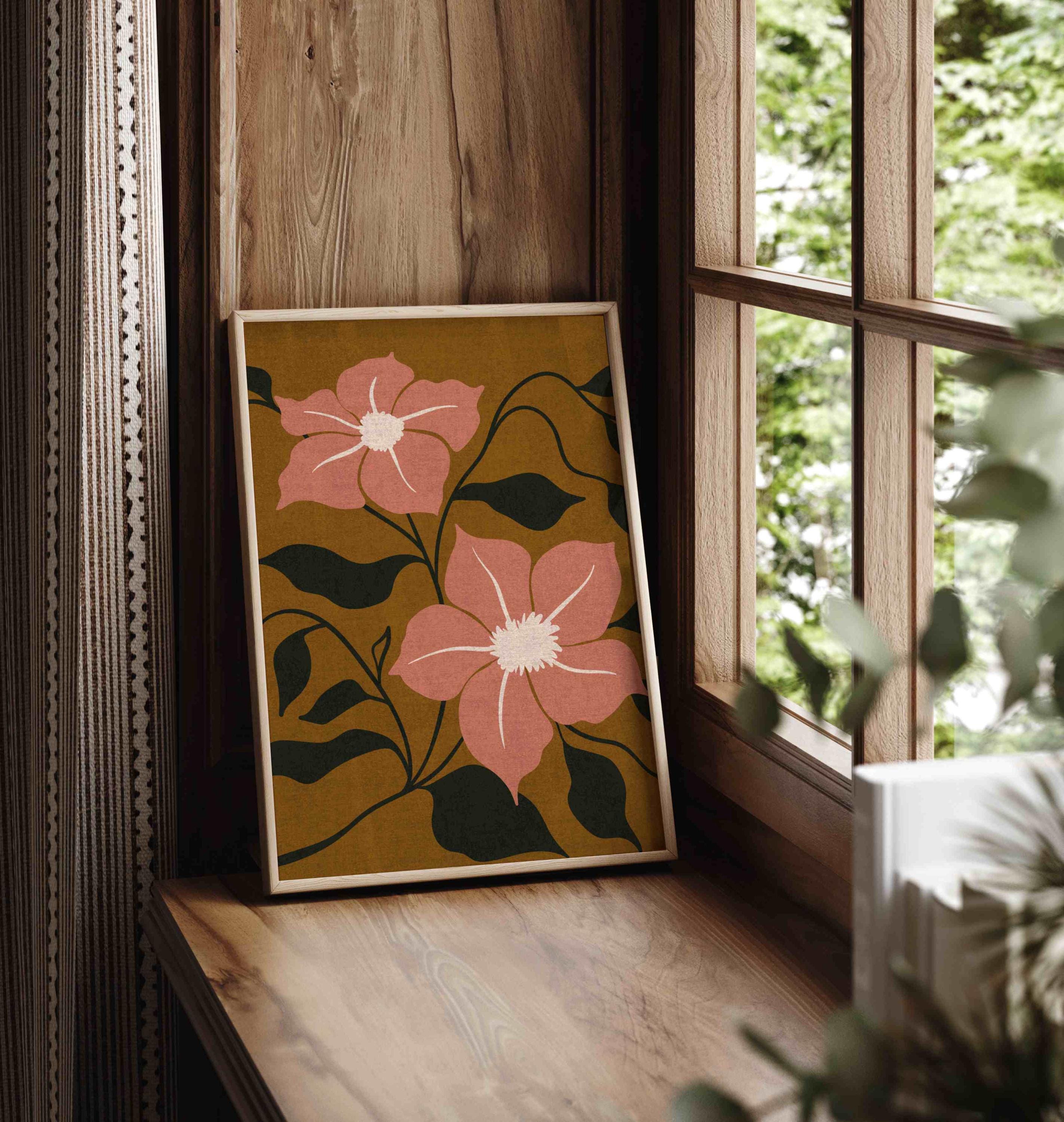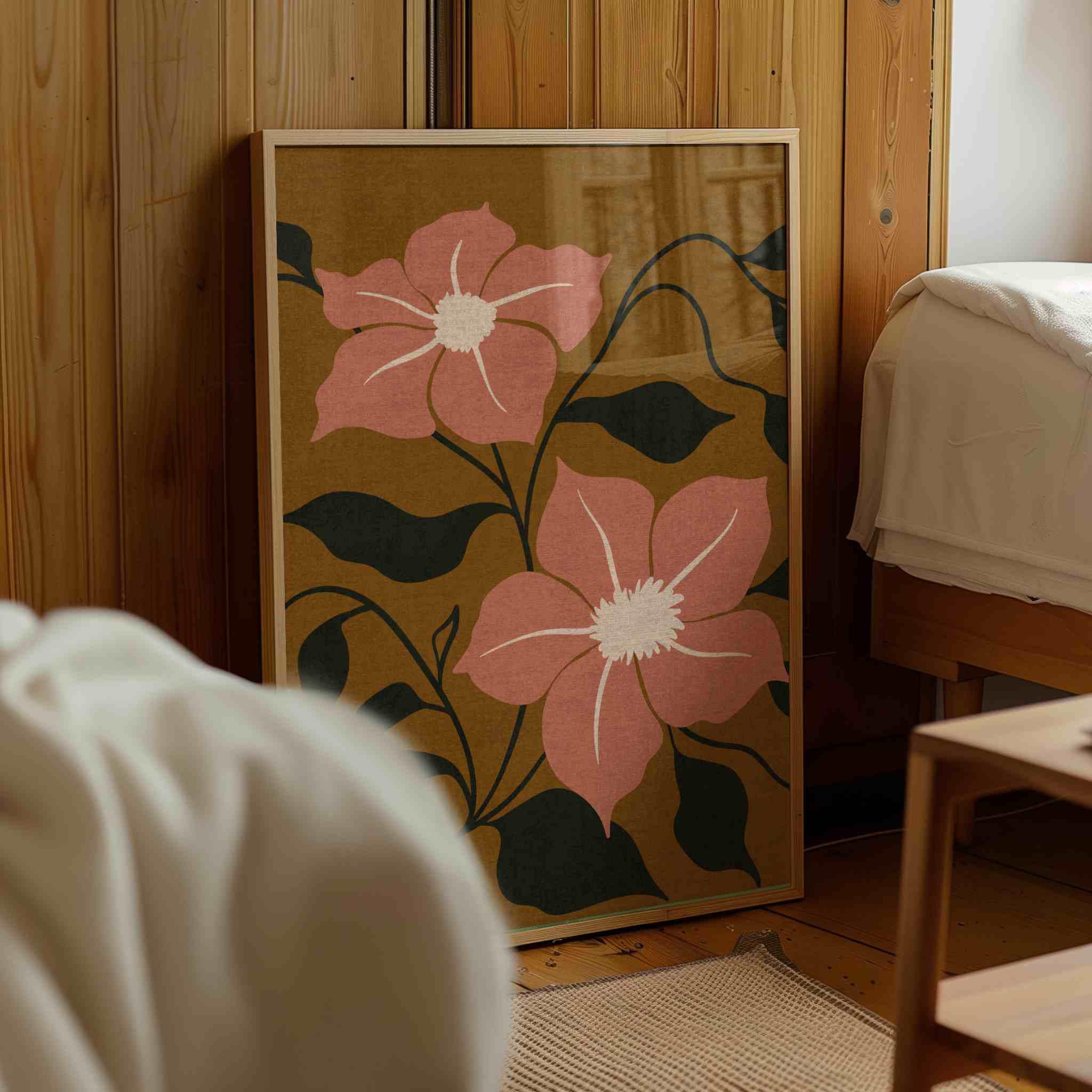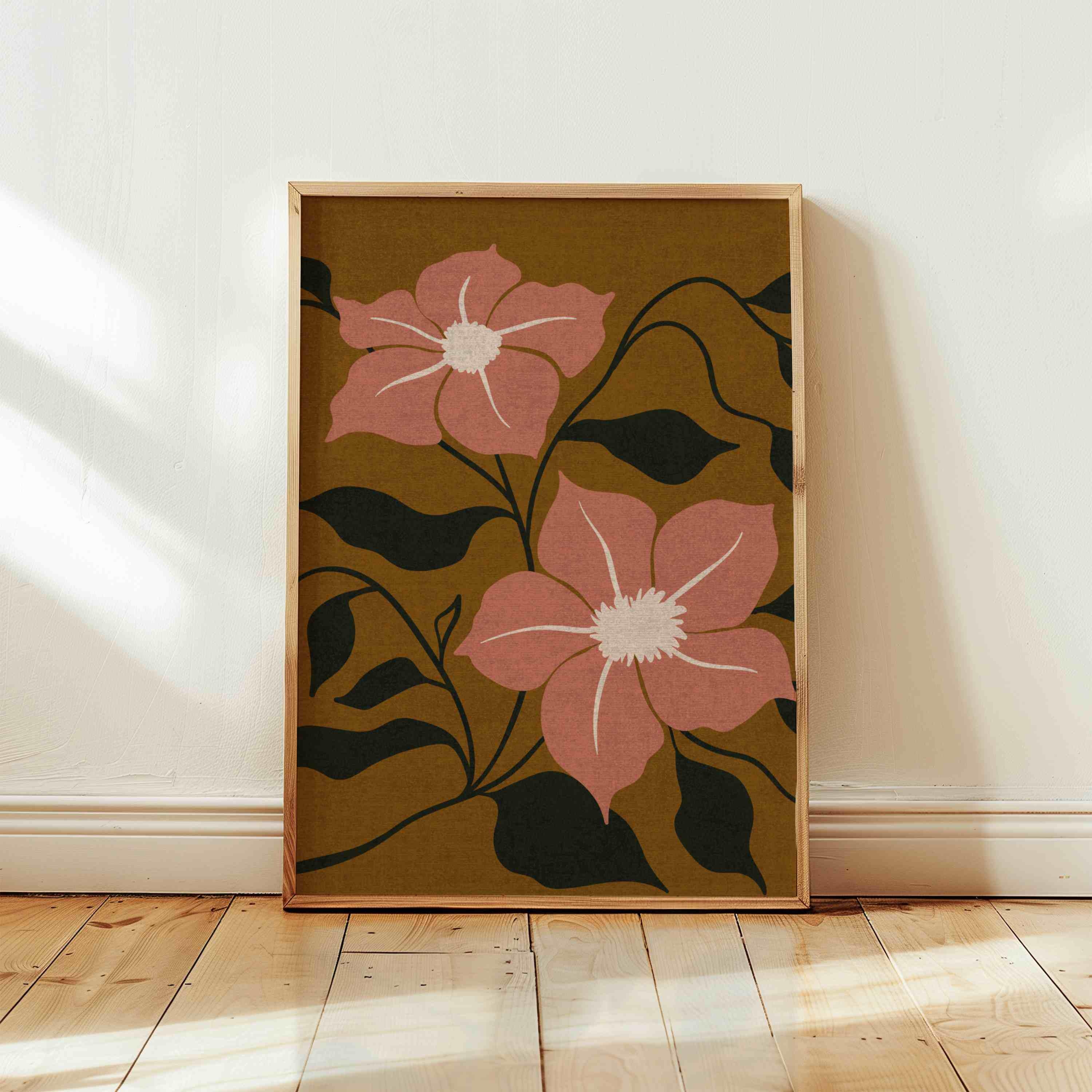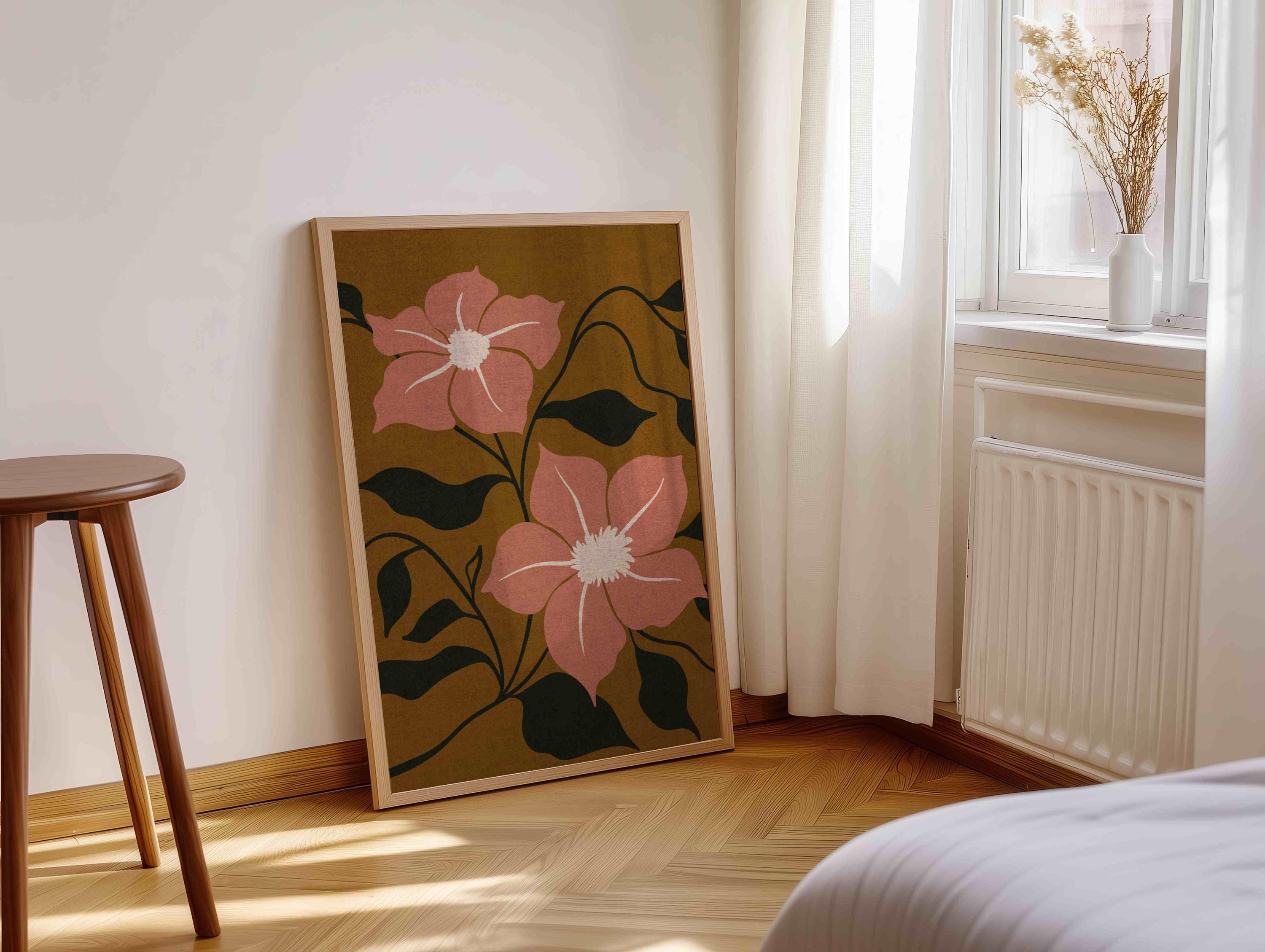 Retro floral print featuring stylized dusty pink flowers with charcoal black leaves, set against a warm brown background. Inspired by mid century modern florals and vintage botanical illustrations, this piece adds a soft, warm tone to any room.