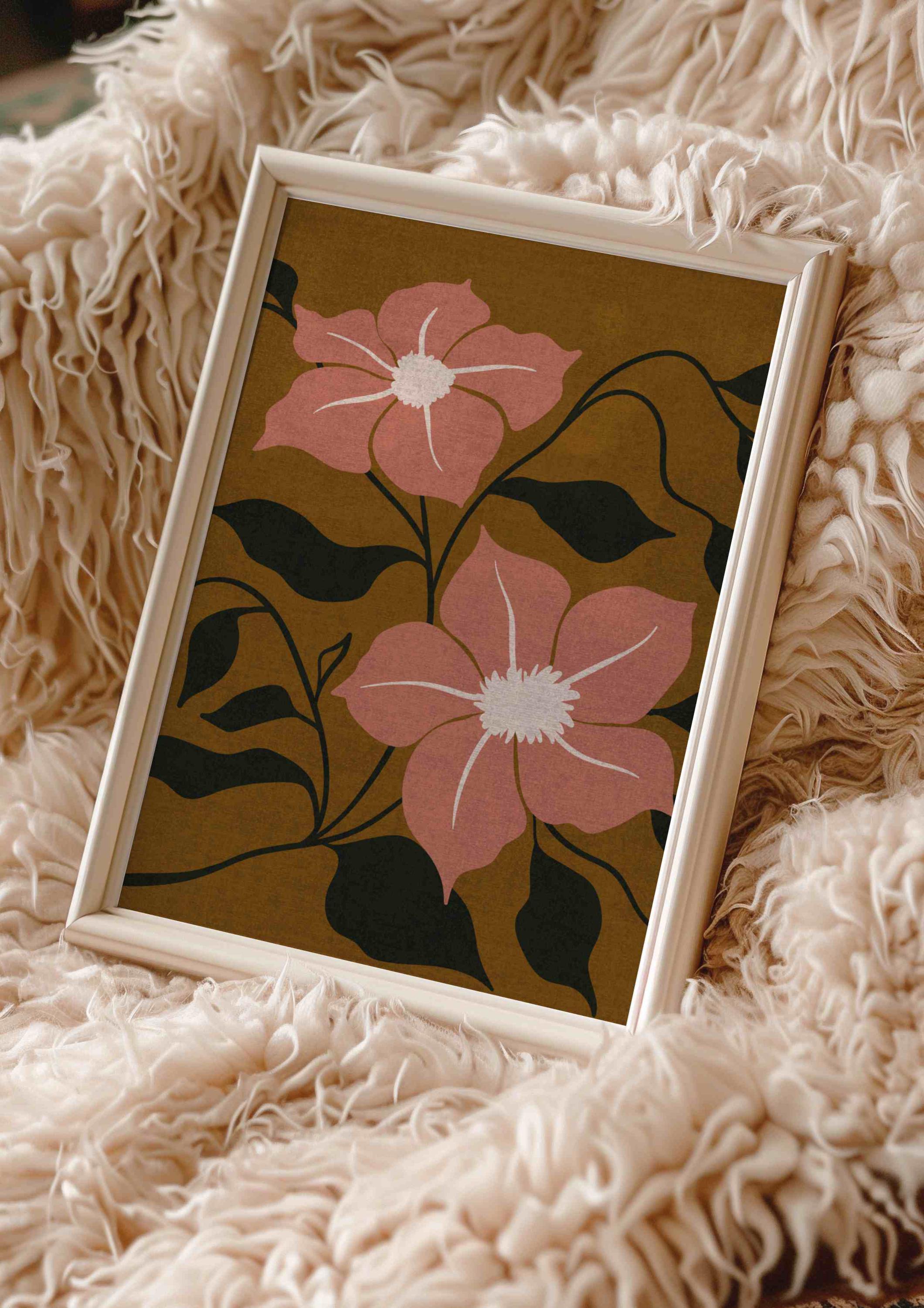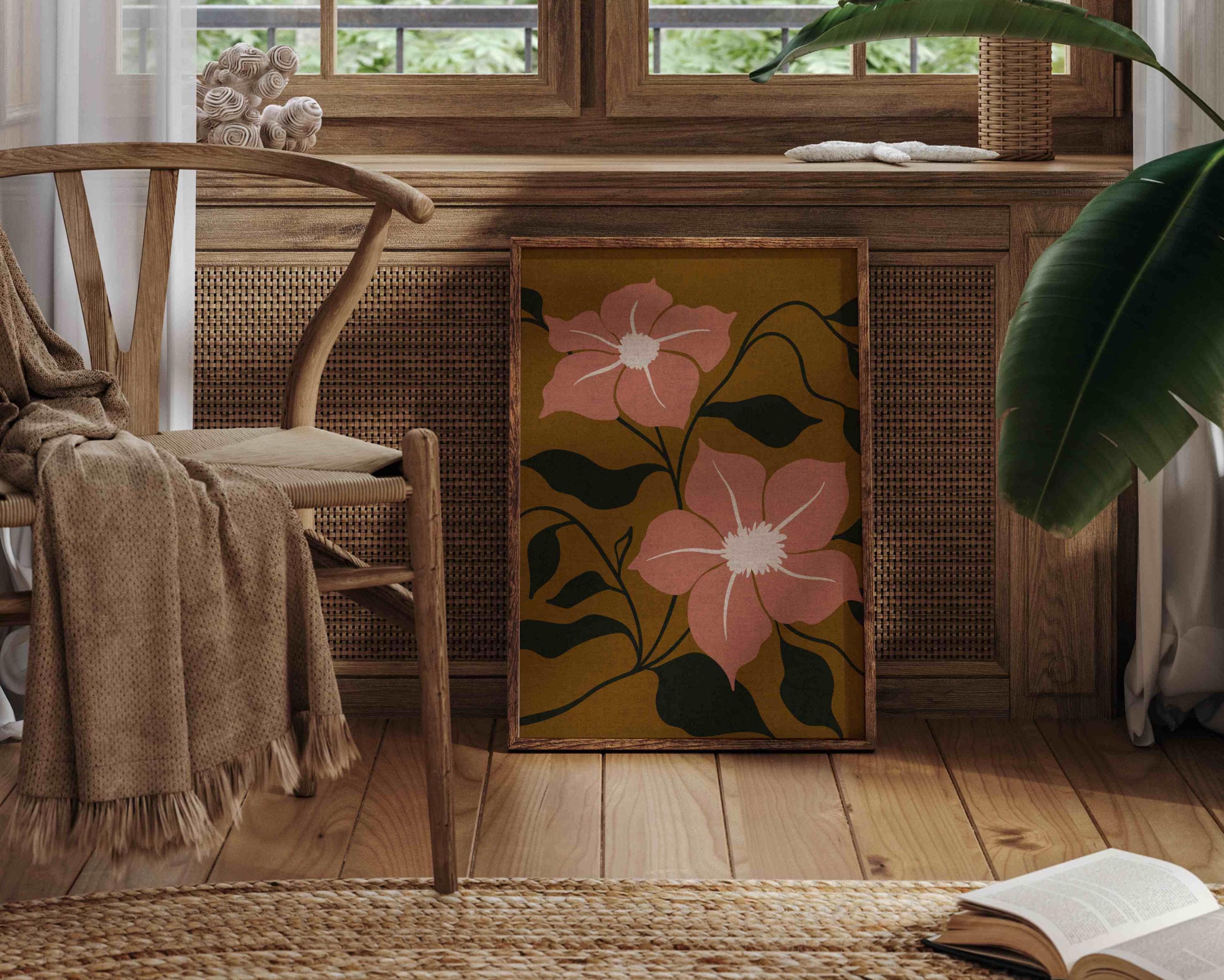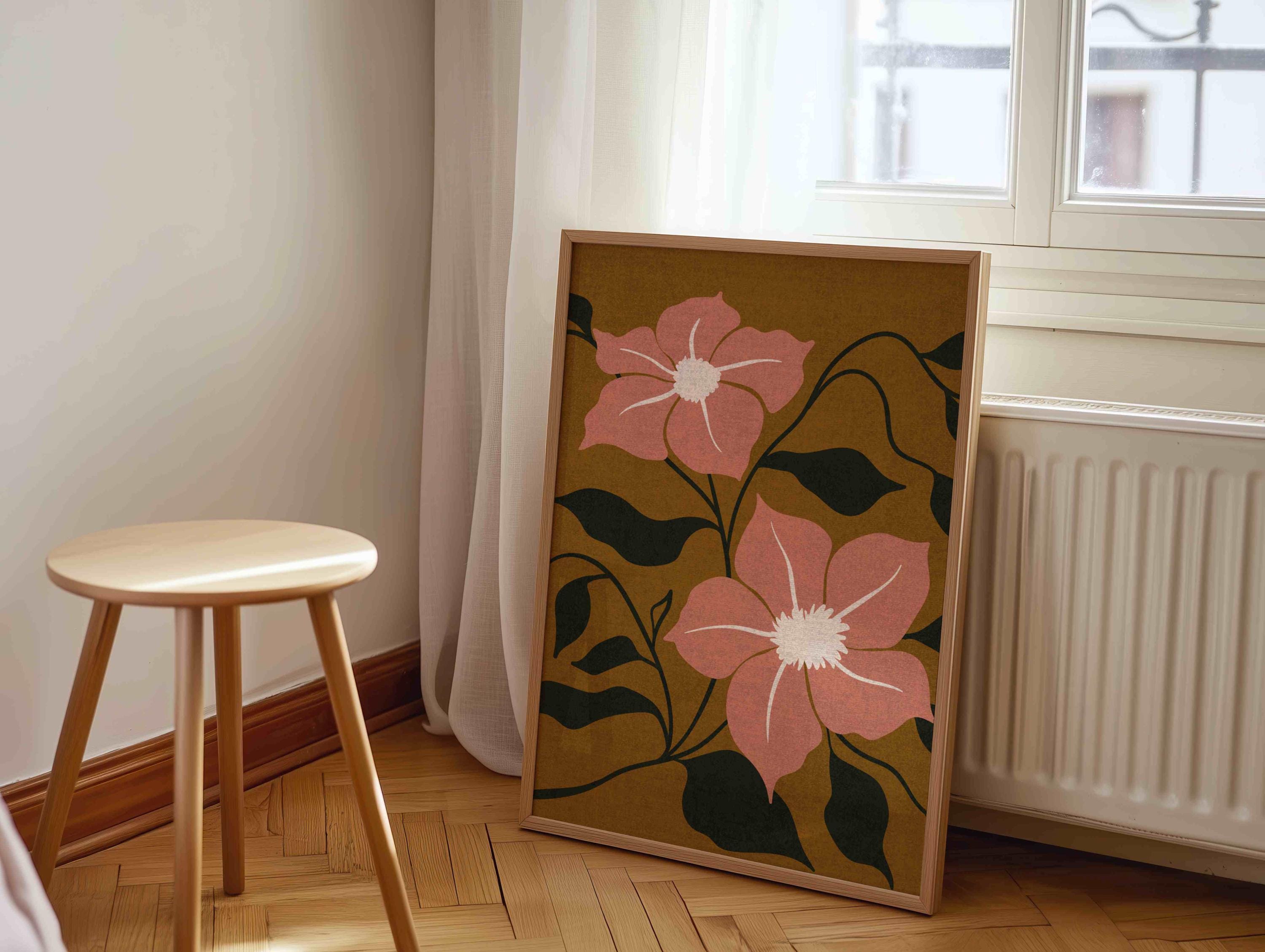 Retro floral print featuring stylized dusty pink flowers with charcoal black leaves, set against a warm brown background. Inspired by mid century modern florals and vintage botanical illustrations, this piece adds a soft, warm tone to any room.