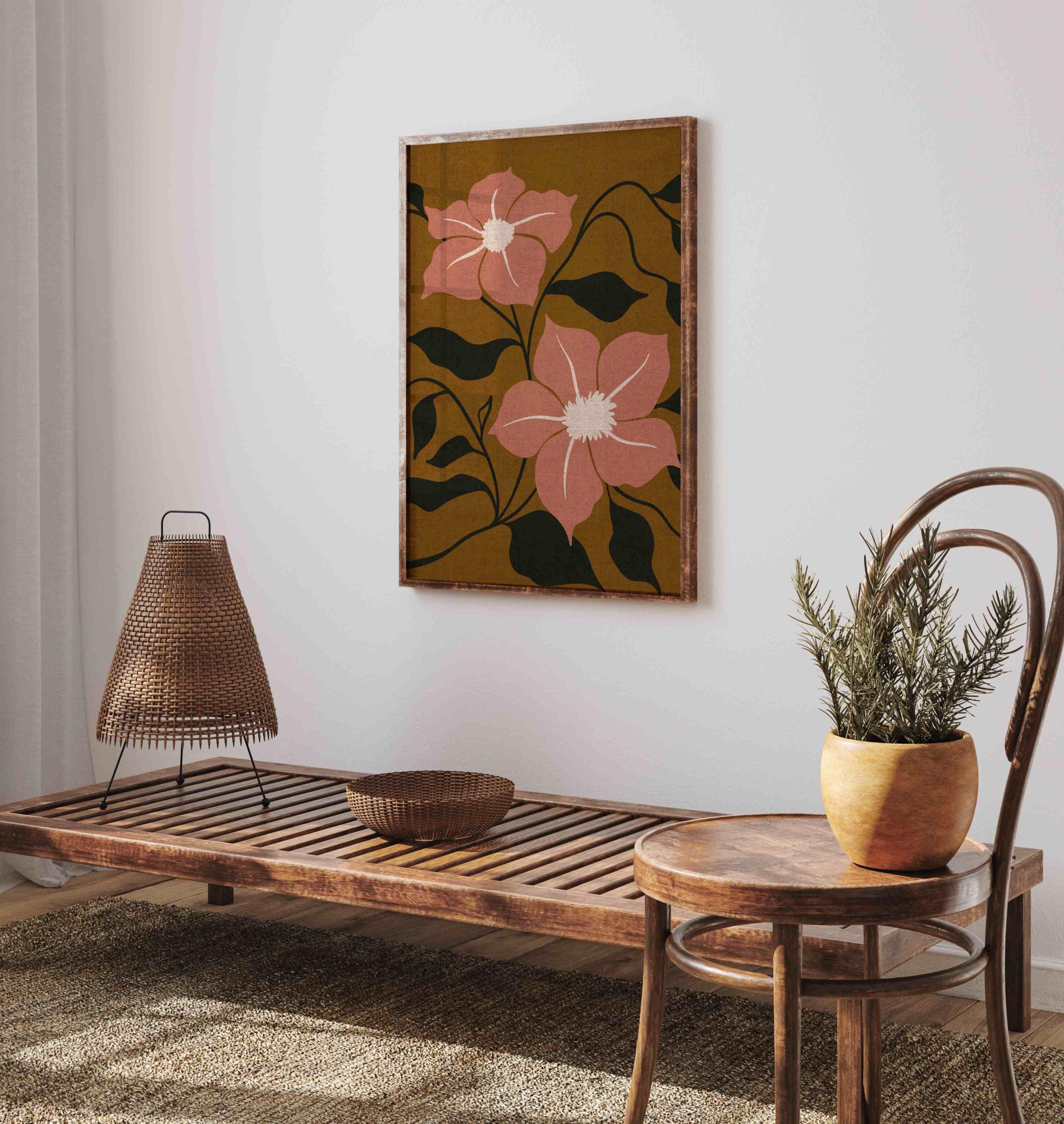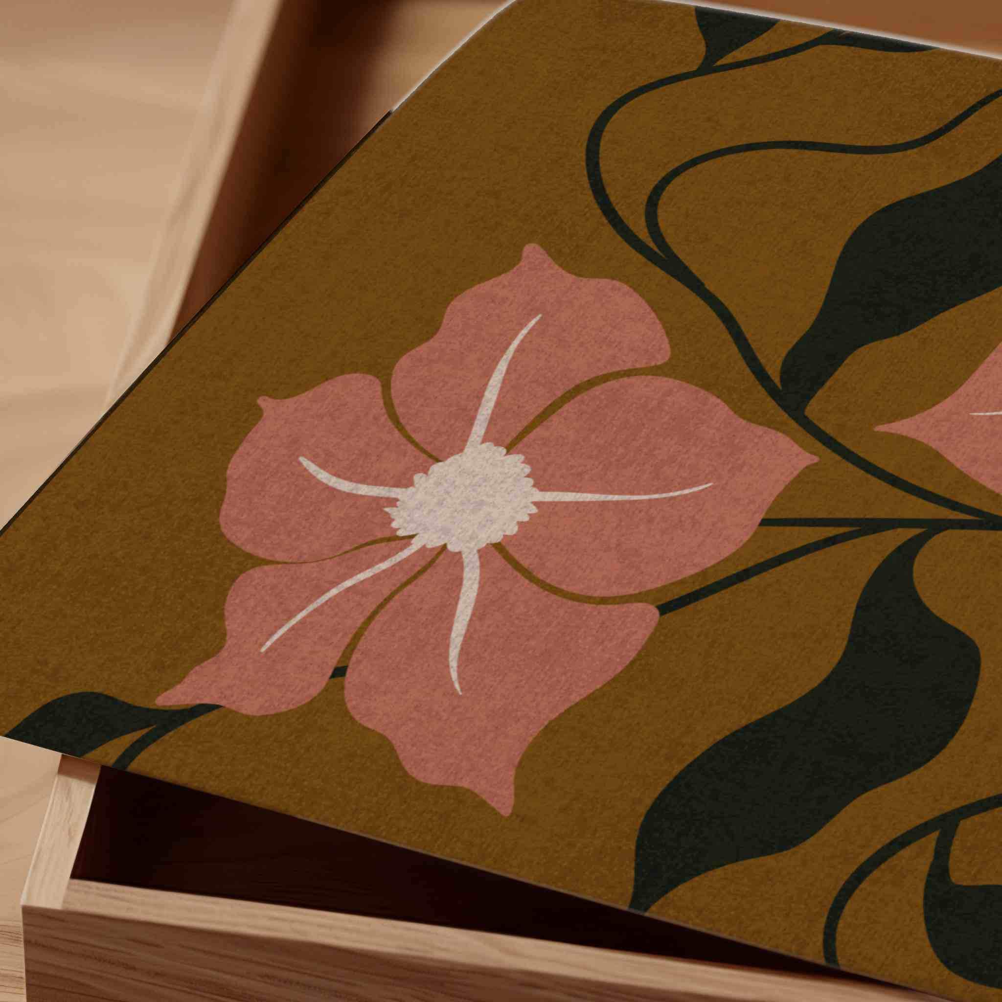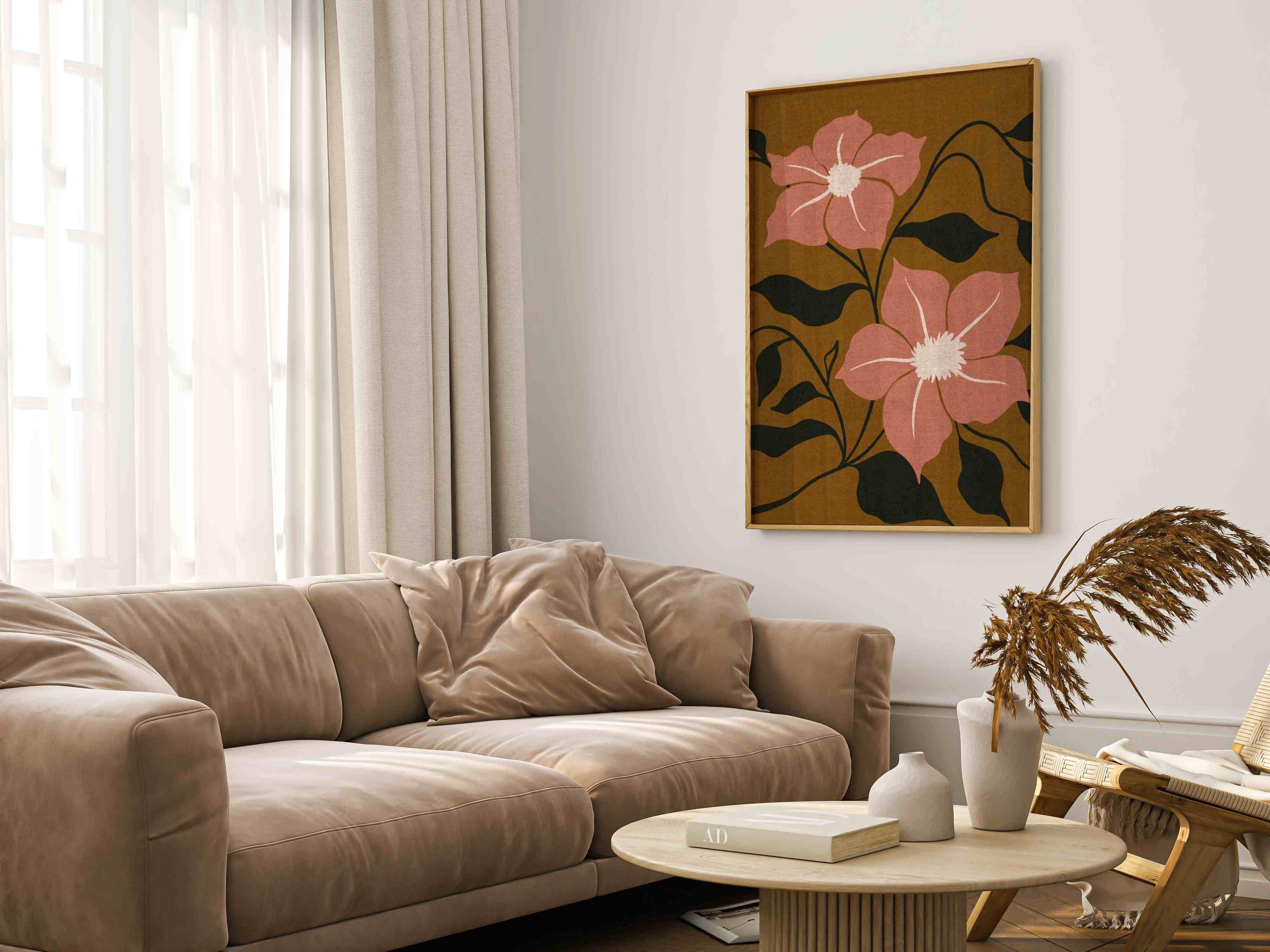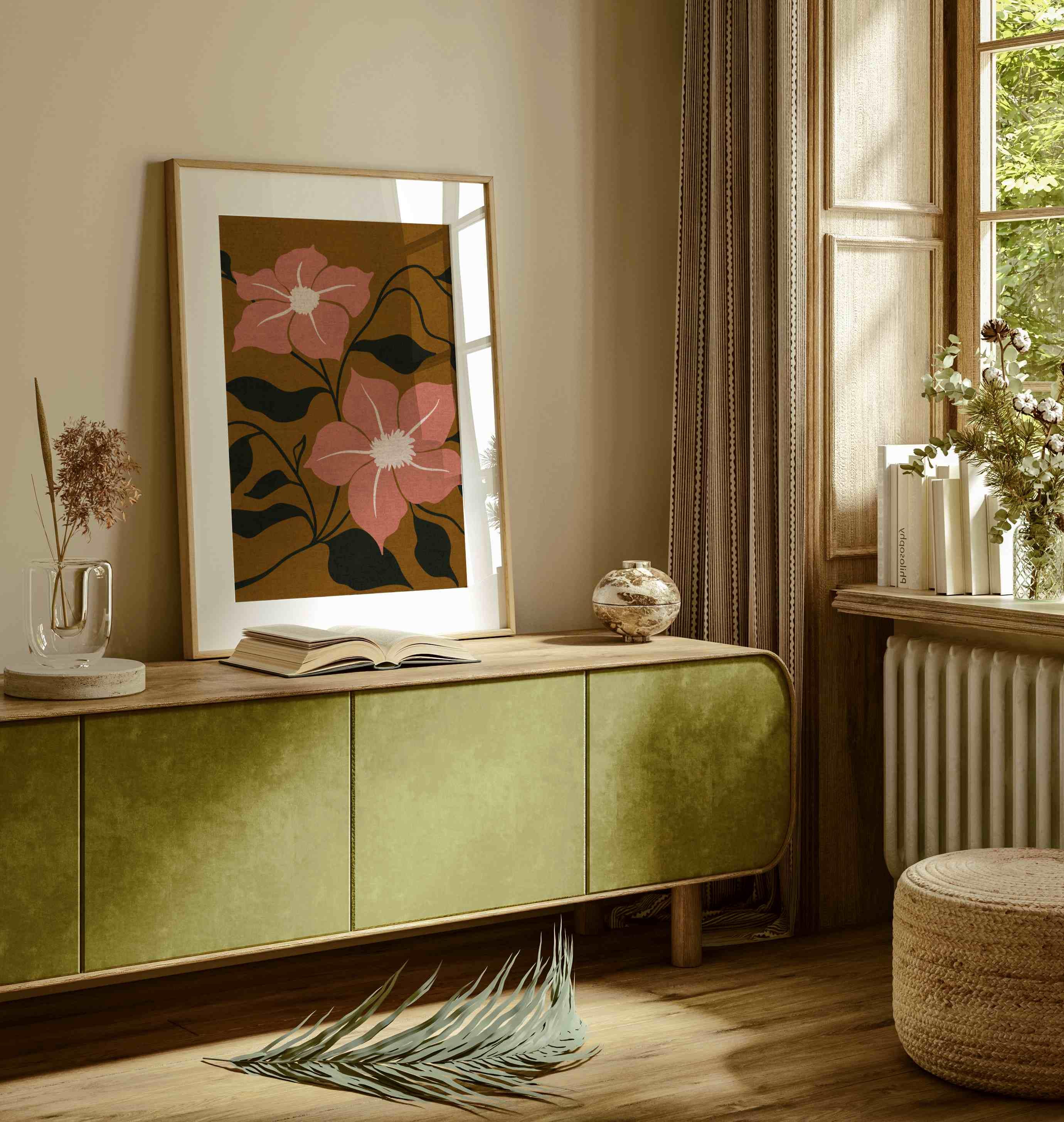 Retro floral print featuring stylized dusty pink flowers with charcoal black leaves, set against a warm brown background. Inspired by mid century modern florals and vintage botanical illustrations, this piece adds a soft, warm tone to any room.