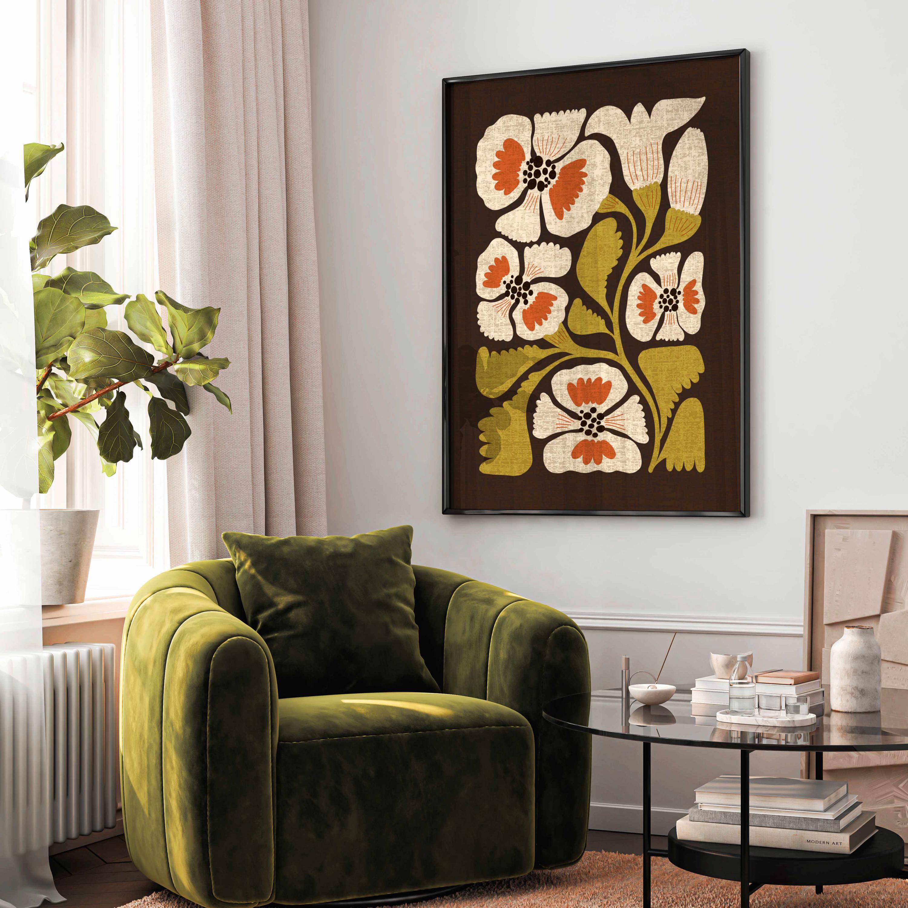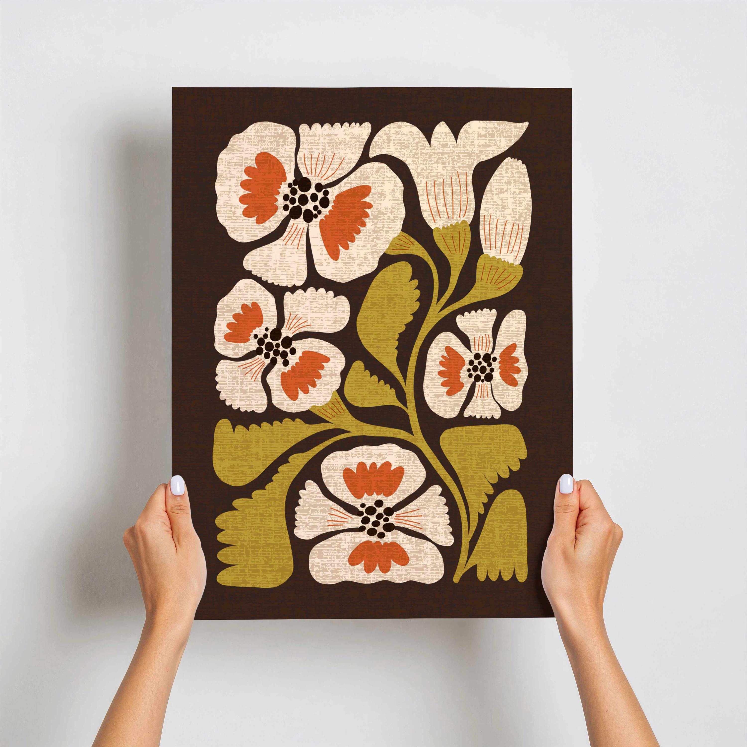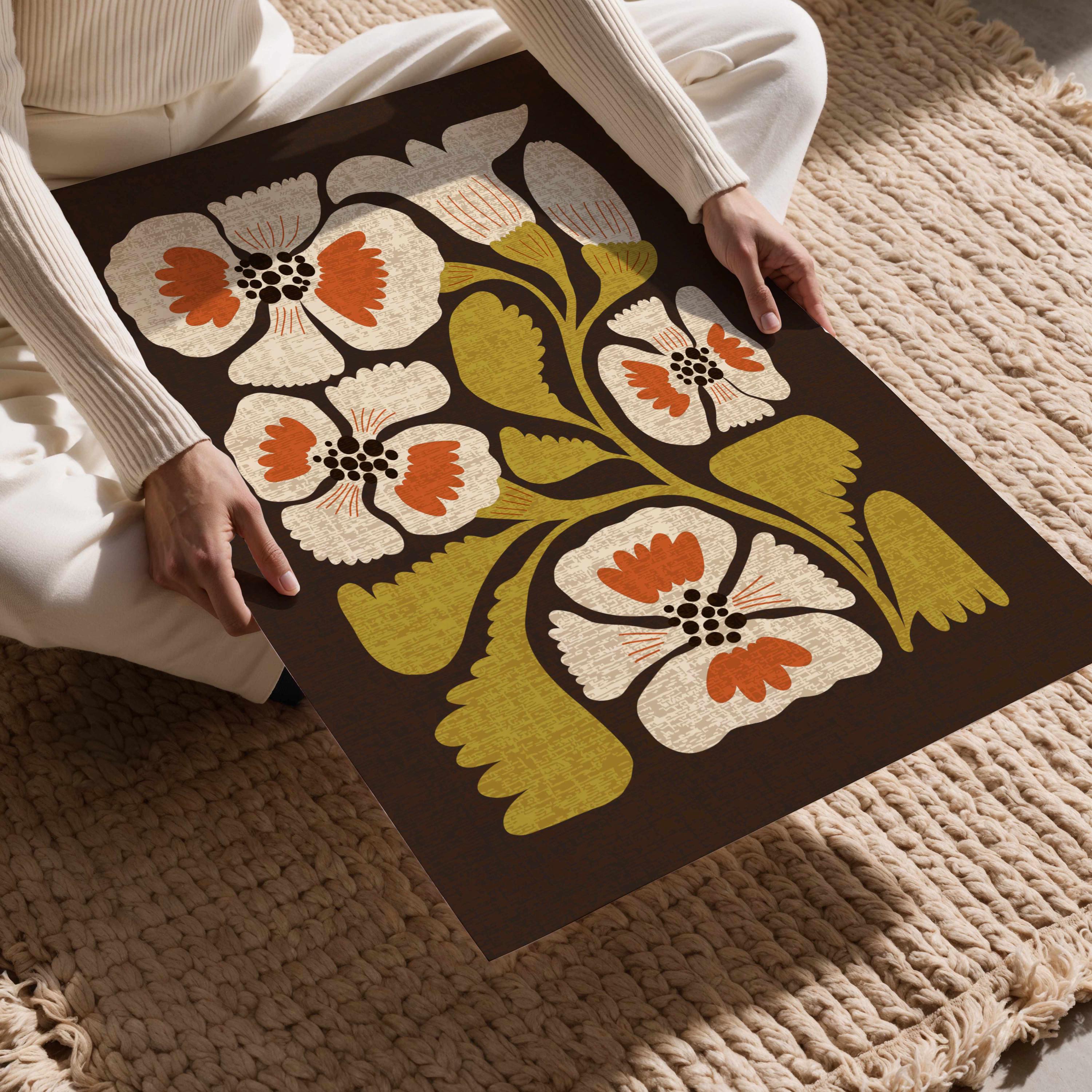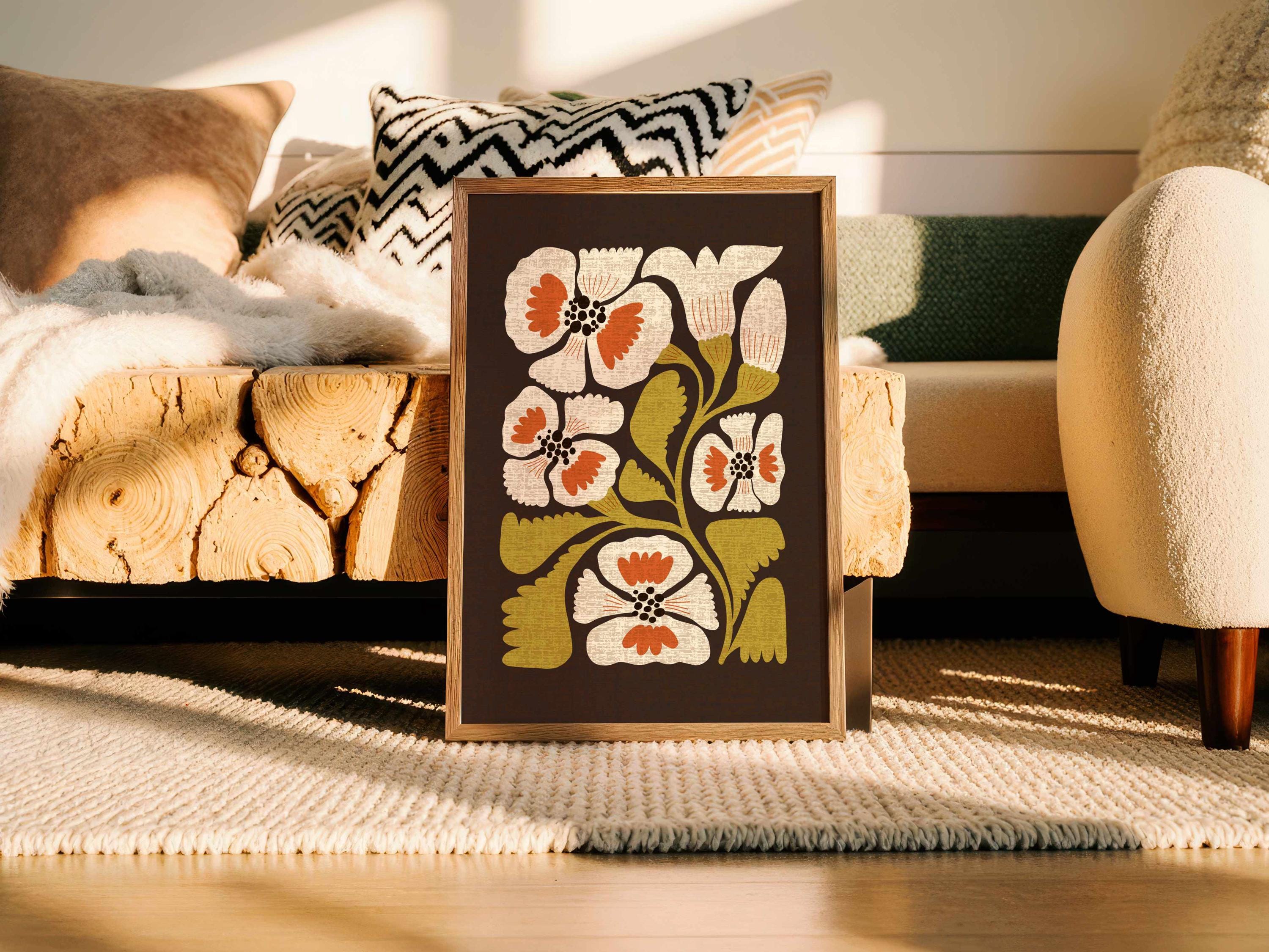 70s retro floral wall art print featuring a Matisse style botanical cutout of large cream petals with burnt orange centers, olive green leaves, and black detailing, set against a deep brown background.