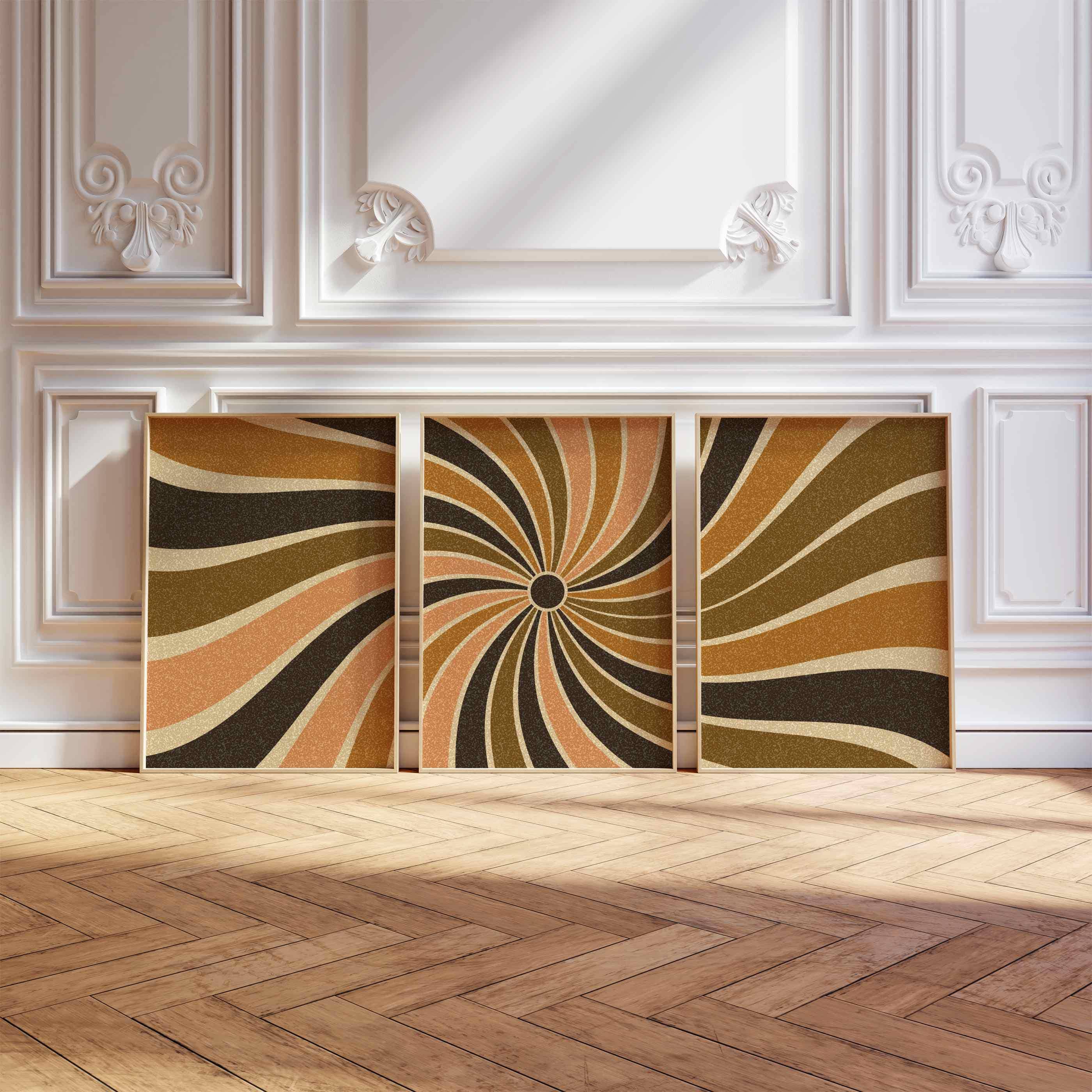 Groovy retro sunburst print set in a neutral color palette. This abstract geometric trio is designed to be displayed as a triptych, creating a stunning focal point on your wall. Perfect for enhancing up any retro, modern boho, or mid century space, be it your living room, bedroom, office or anywhere else.