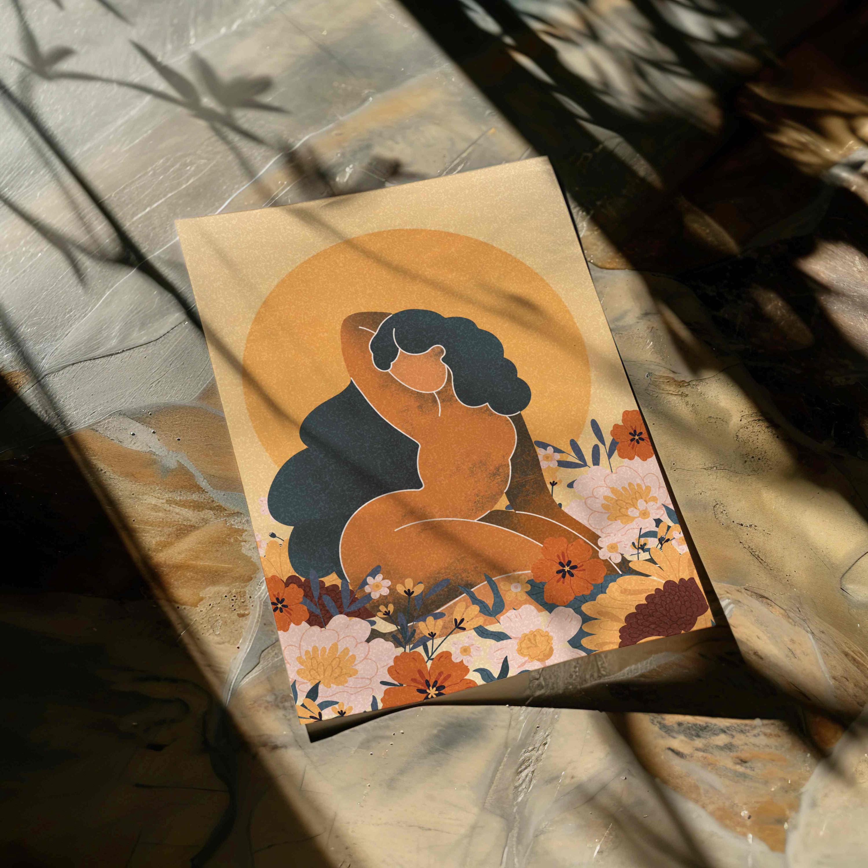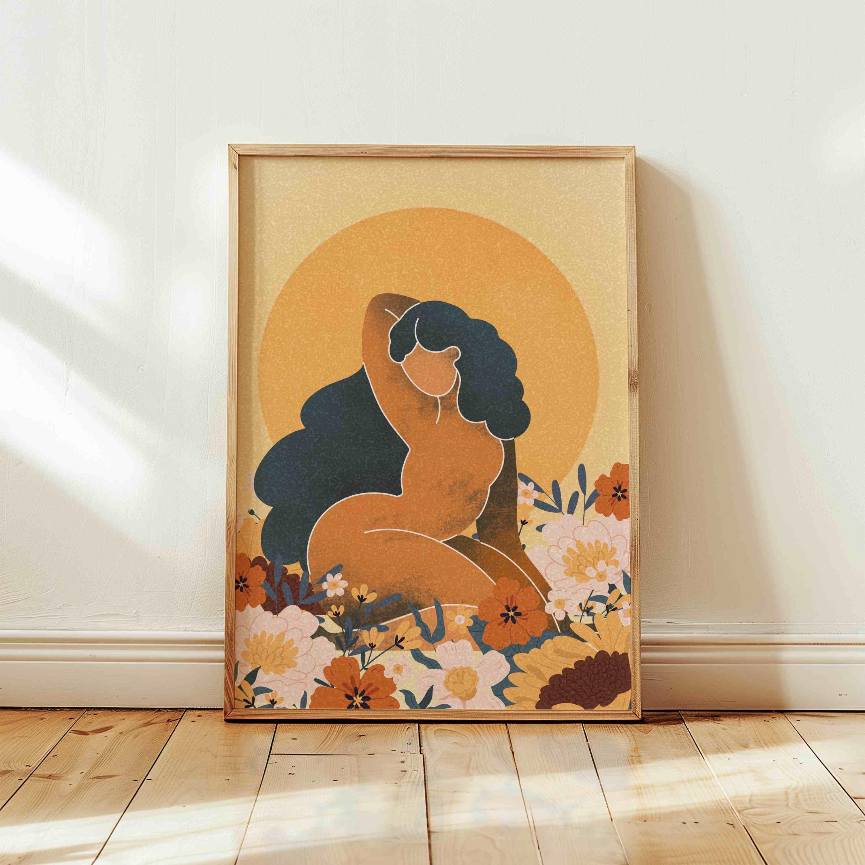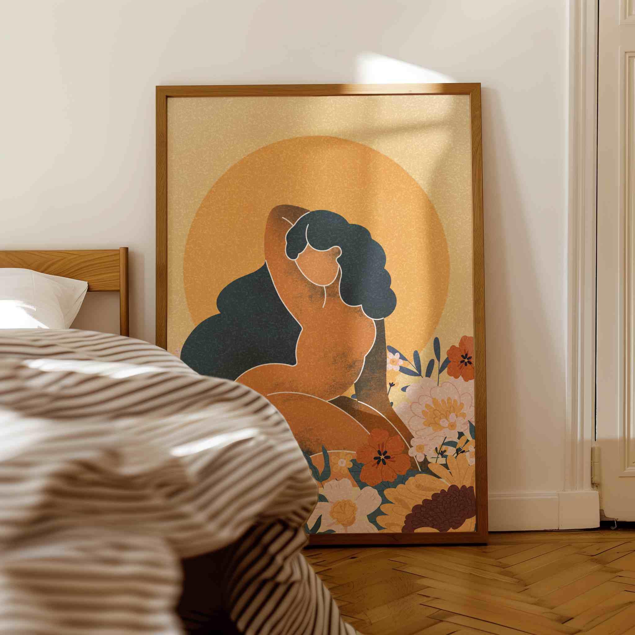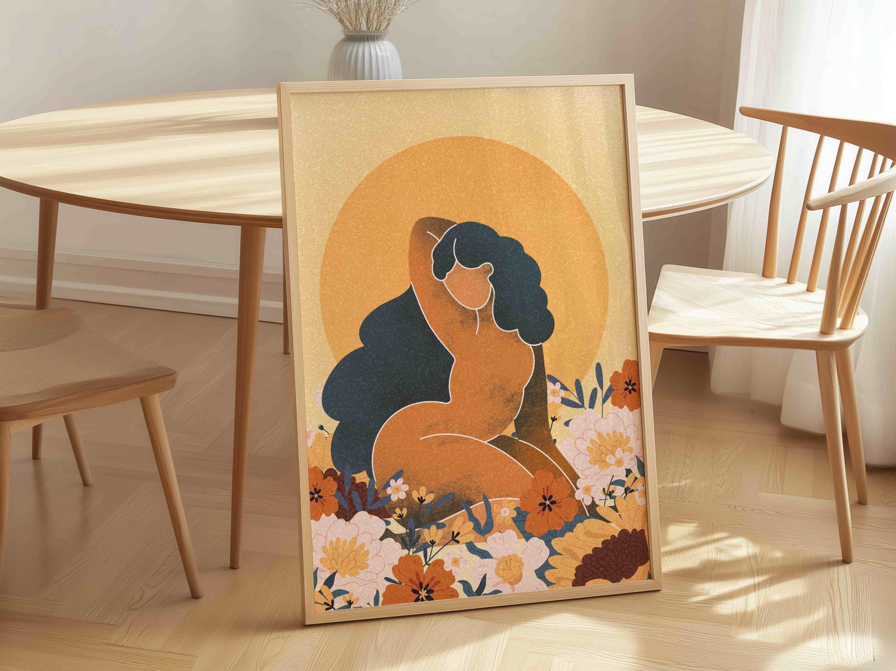 Celebrate the beauty and power of the black woman with this self-love art print. Featuring a confident, curvy figure surrounded by blooming florals and warm retro tones, this piece blends femininity, body positivity, and modern boho style.
