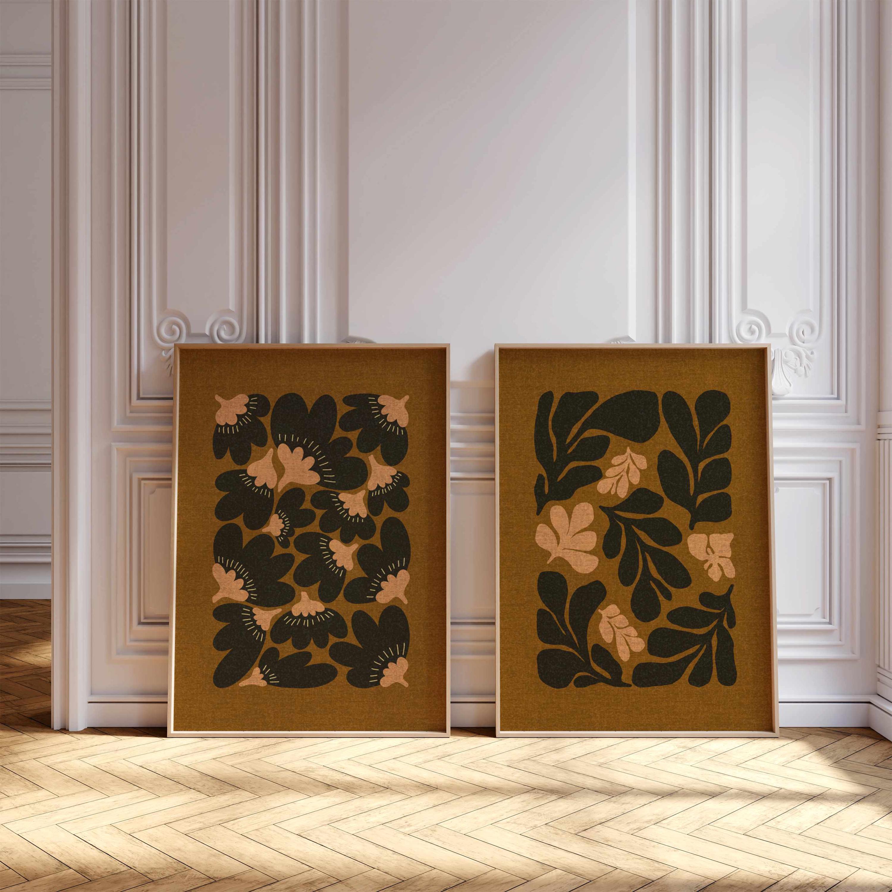 Retro botanical wall art inspired by abstract Matisse style floral cutouts and groovy 70s design. This aesthetic botanical duo features organic shapes in warm vintage colors. Perfect for boho, eclectic, vintage-inspired or mid century modern interiors, these stylish prints add a playful yet grounded vibe to any wall.