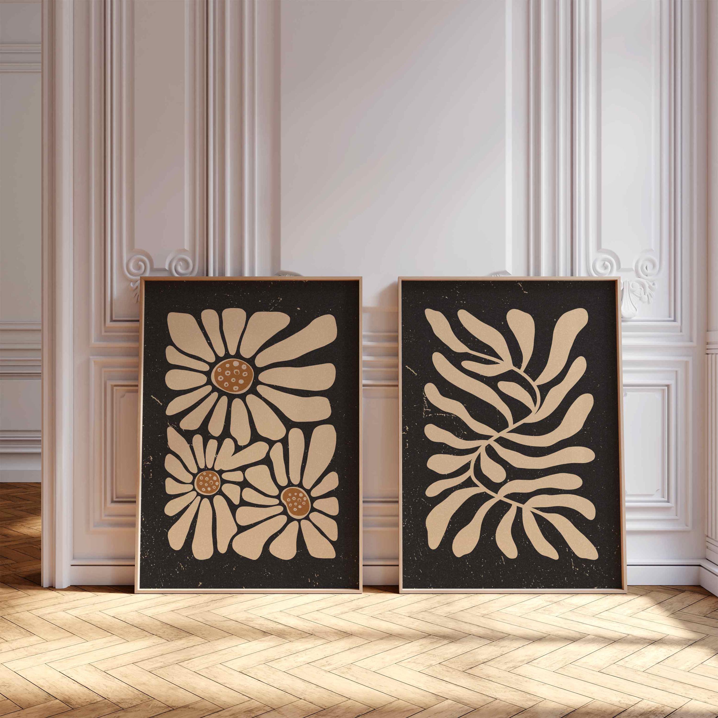 Retro 70s print set of two with abstract Matisse-inspired botanical shapes in neutral, muted colors. This flower print set is perfect for enhancing up any space, be it your living room, bedroom, office or anywhere else. It also makes a thoughtful and unique gift for your friend for a special event like Christmas, birthday, or housewarming.