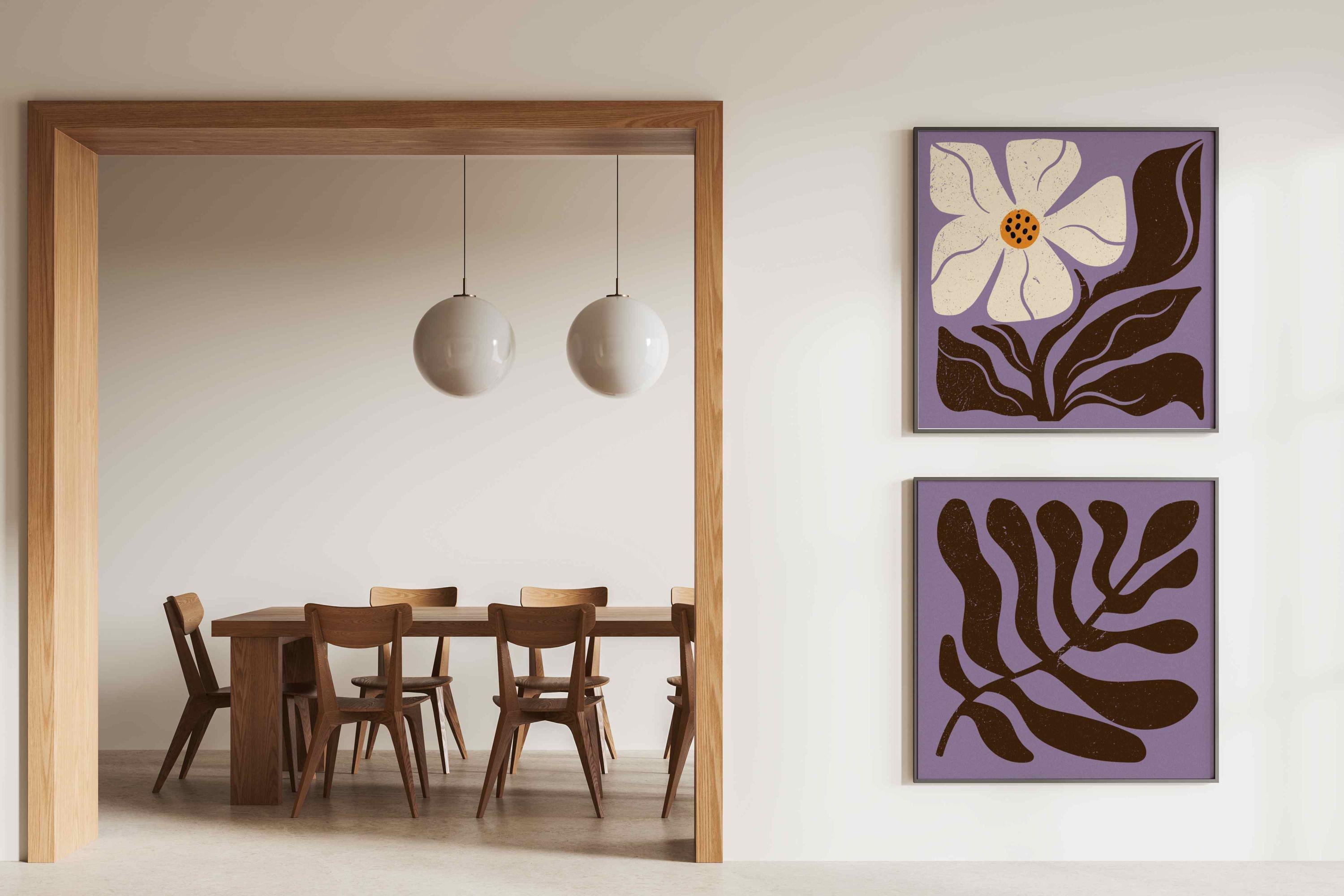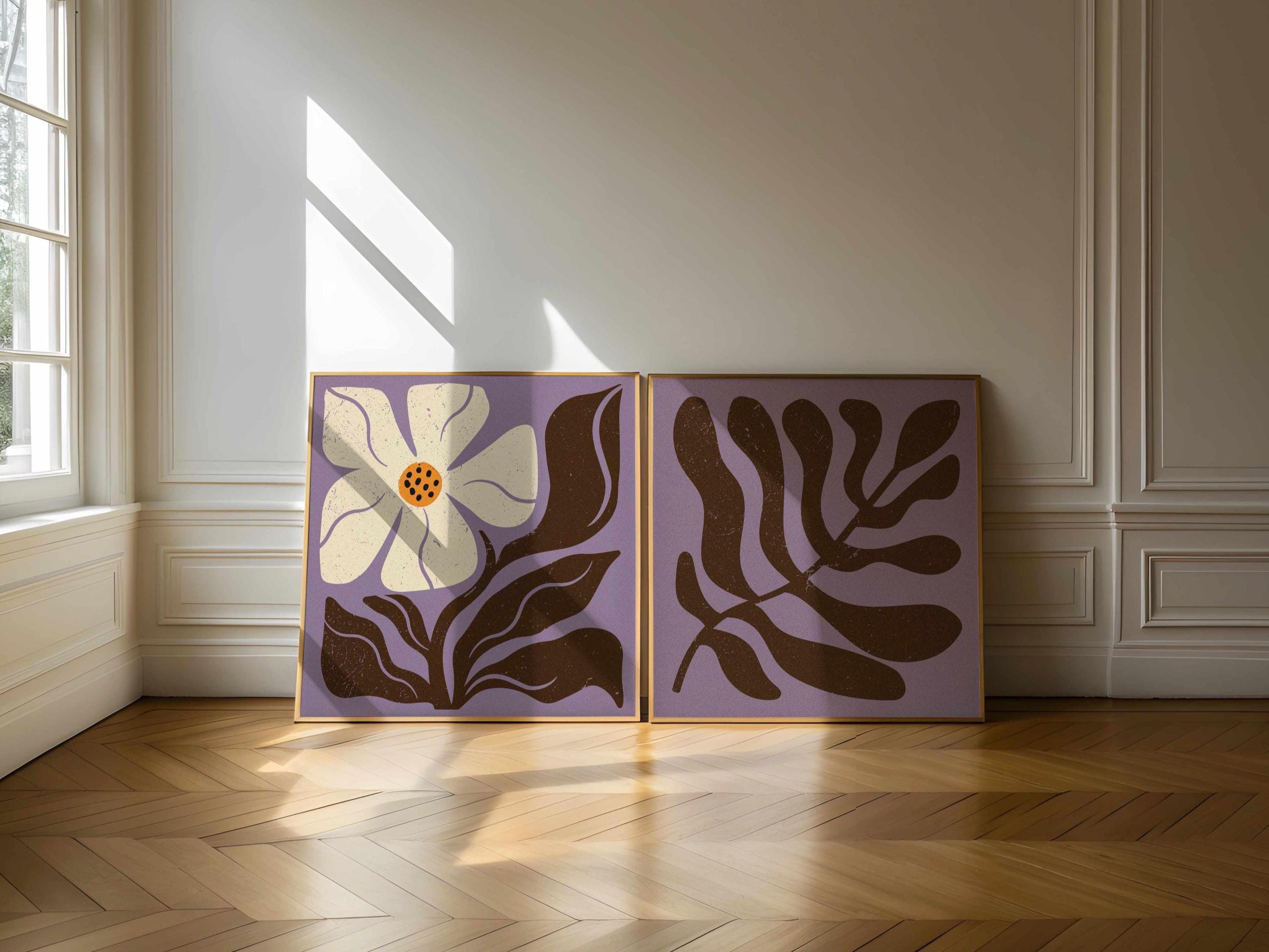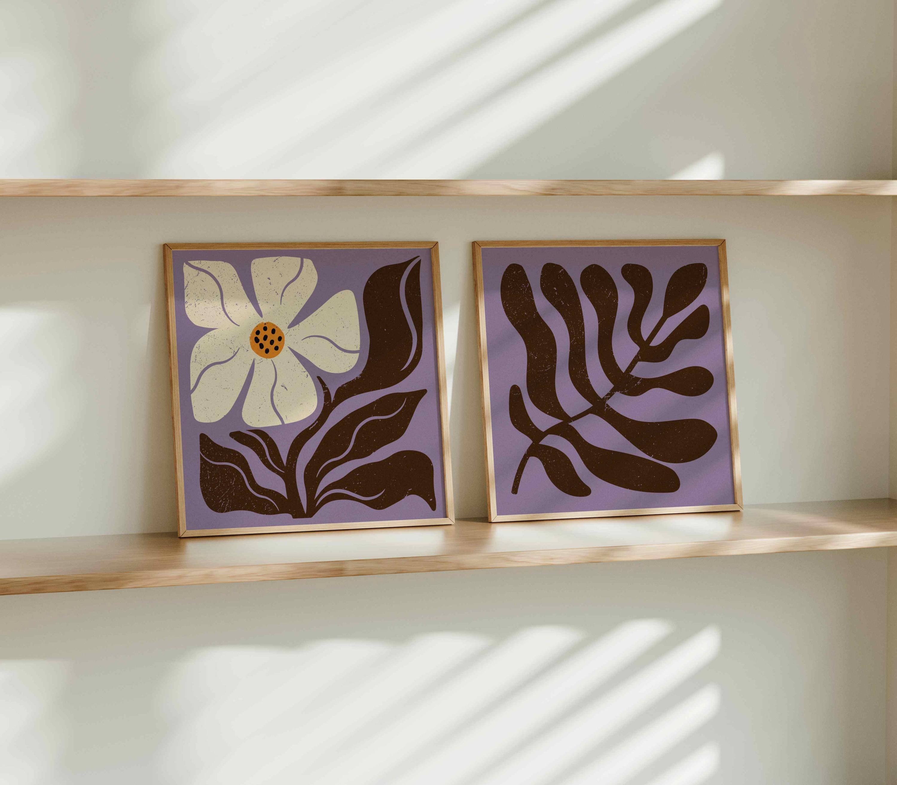Retro floral wall art set featuring Matisse-inspired botanical shapes in beautiful, soft colors. This groovy botanical duo is perfect for enhancing up any boho, mid century, or vintage-inspired space, be it your living room, bedroom, office, nursery or anywhere else. It also makes a thoughtful and unique gift for your friend for a special event like Christmas, birthday, or housewarming.