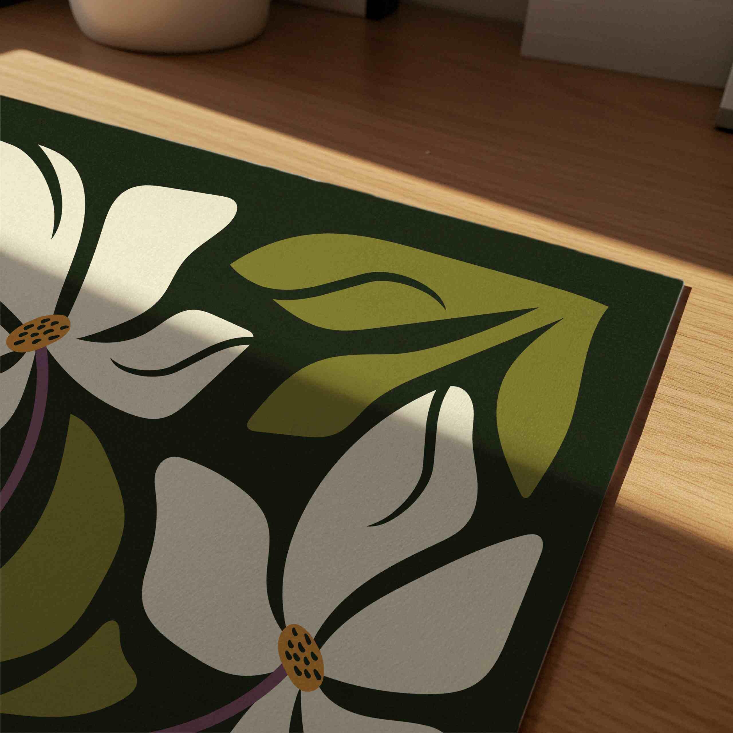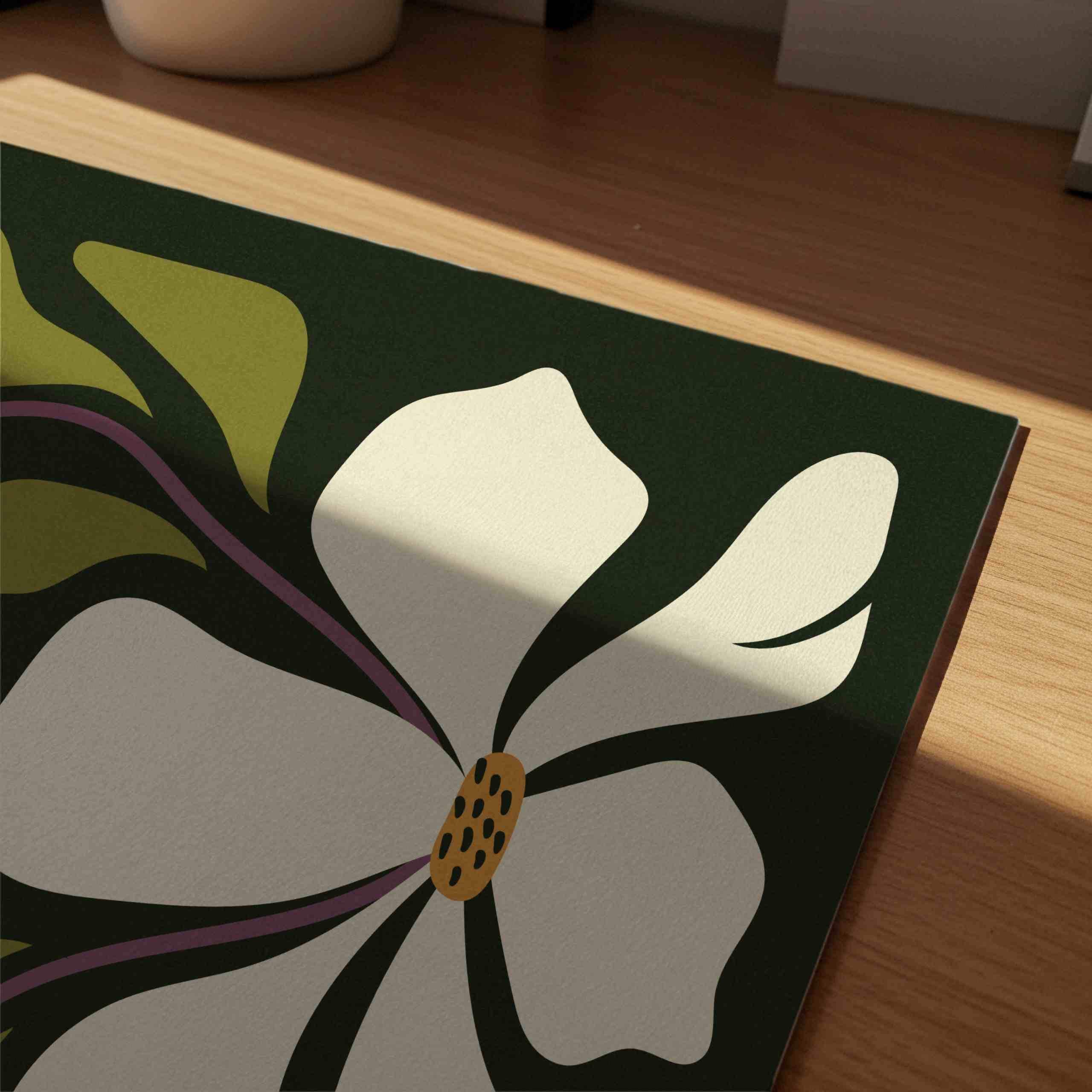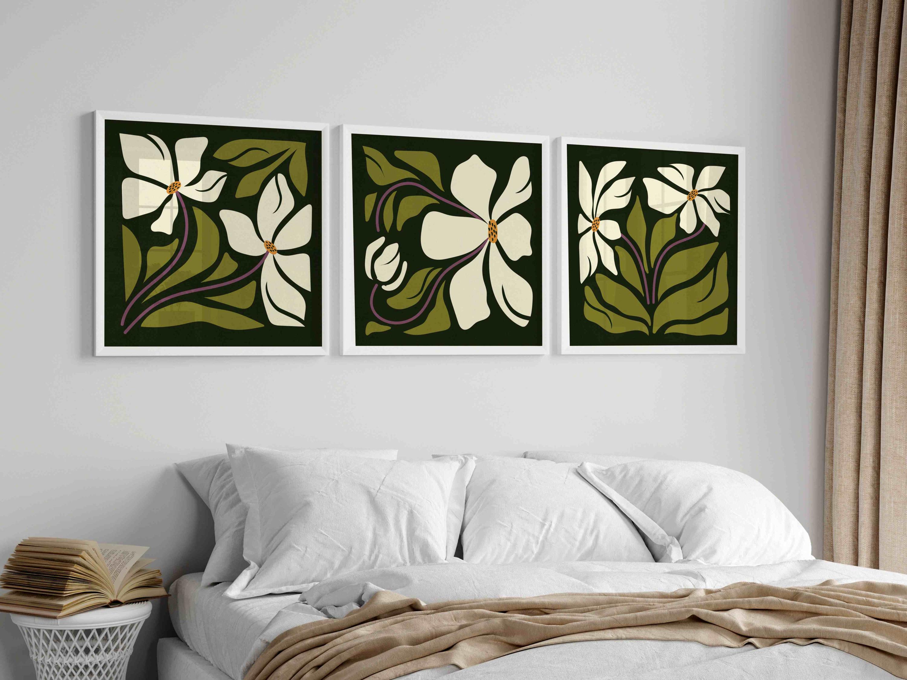 Retro floral wall art set inspired by abstract Matisse style flower shapes and groovy 70s design. This aesthetic botanical trio features warm off-white blooms, soft purple stems and olive green leaves layered over a rich, deep green background. Perfect for boho, eclectic, vintage-inspired or mid century modern interiors, these square prints add a playful yet grounded vibe to any wall.