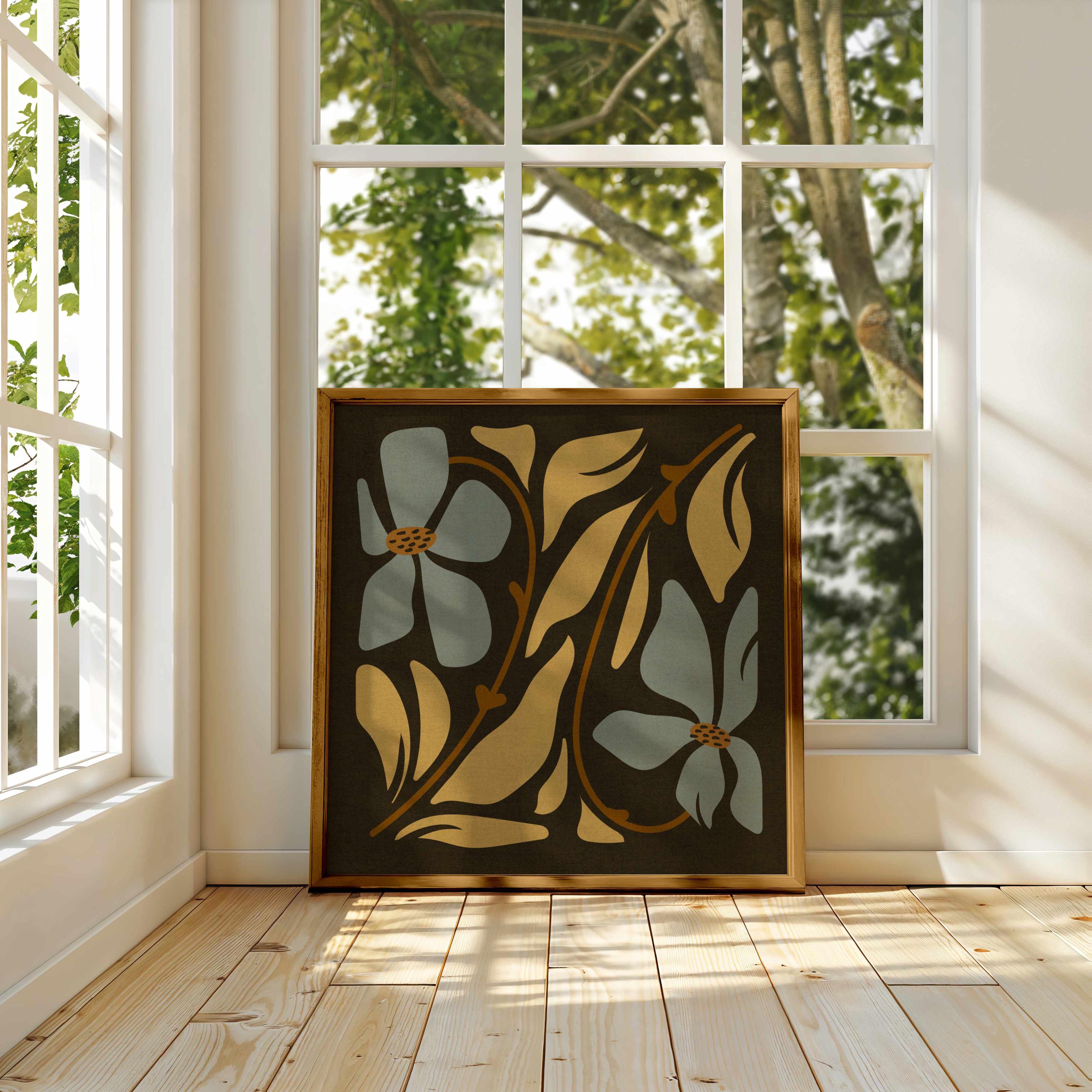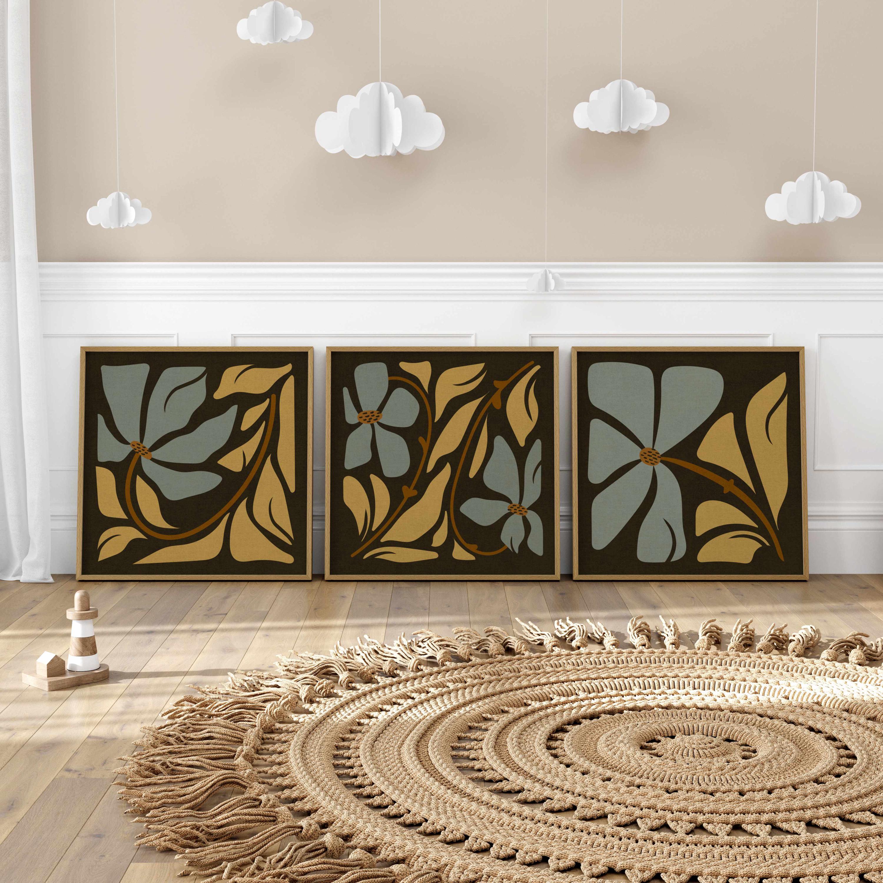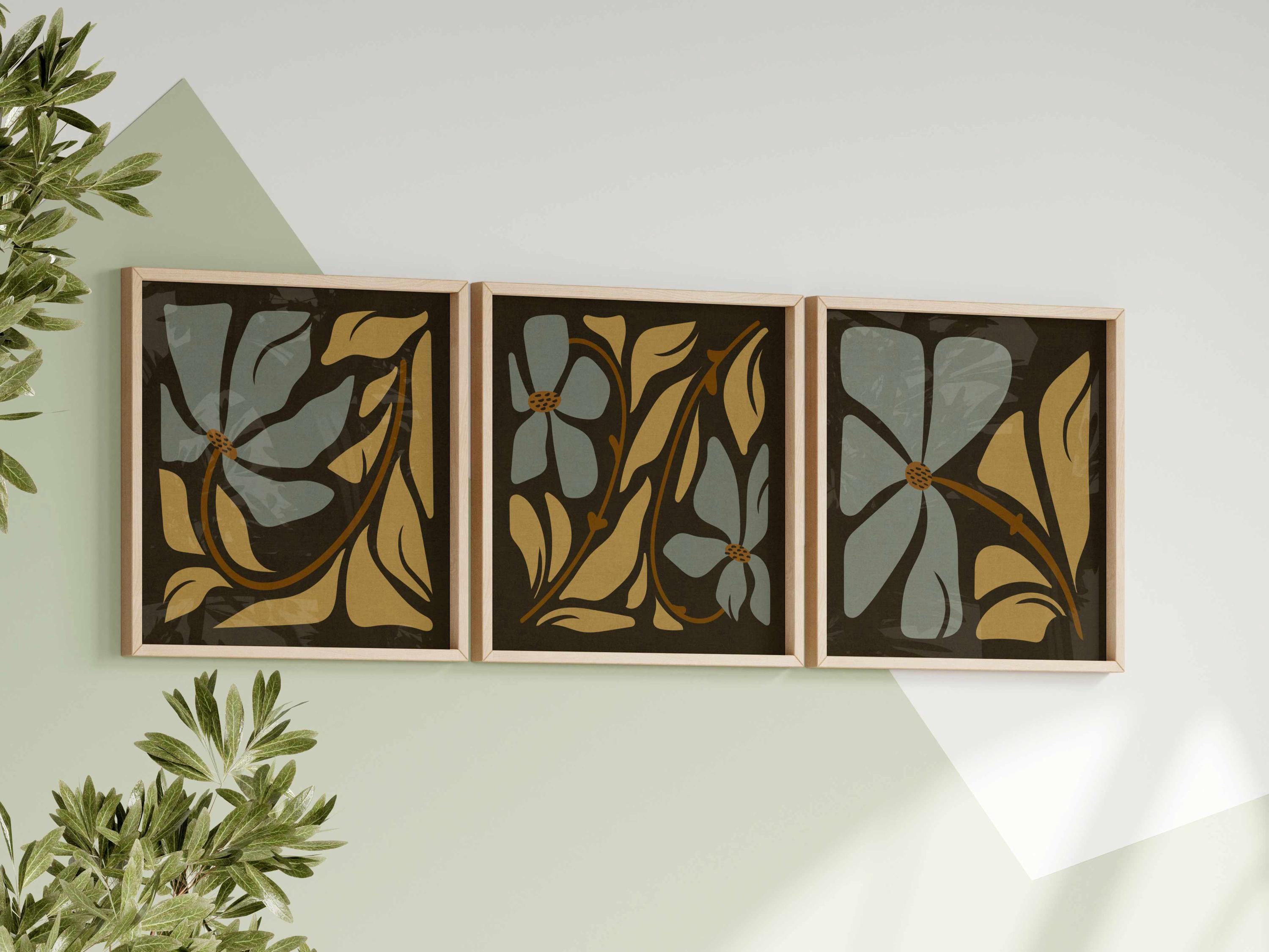 Abstract retro floral wall art set of three prints featuring Matisse-inspired flowers in muted, neutral colors and moody undertones. The square format makes them easy to pair or stack, and the gentle, earthy color palette works beautifully in cozy boho, vintage style, mid century or nature-inspired interiors.