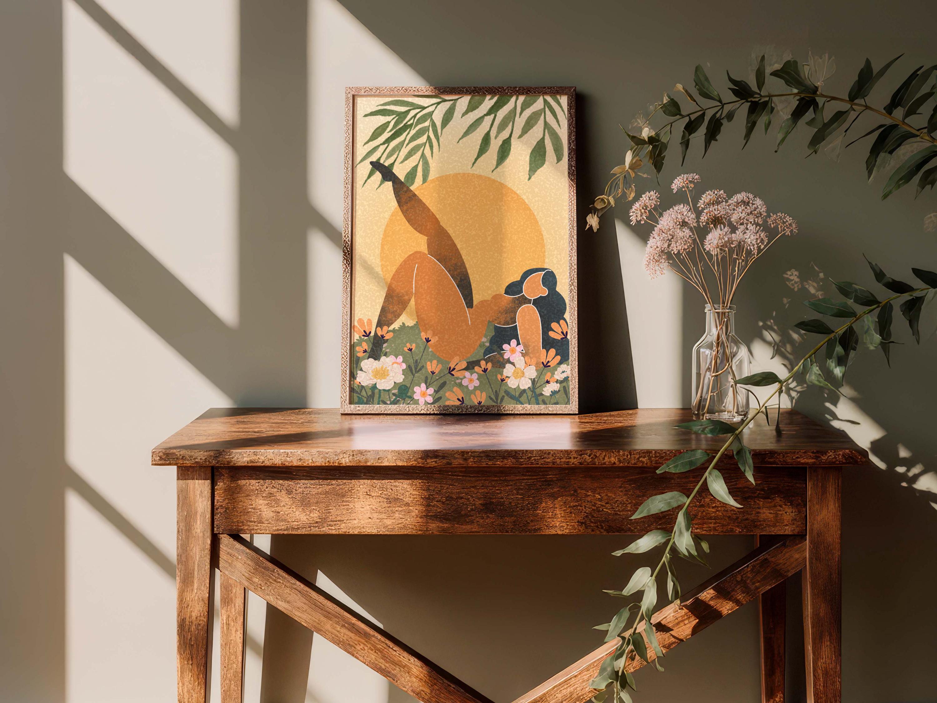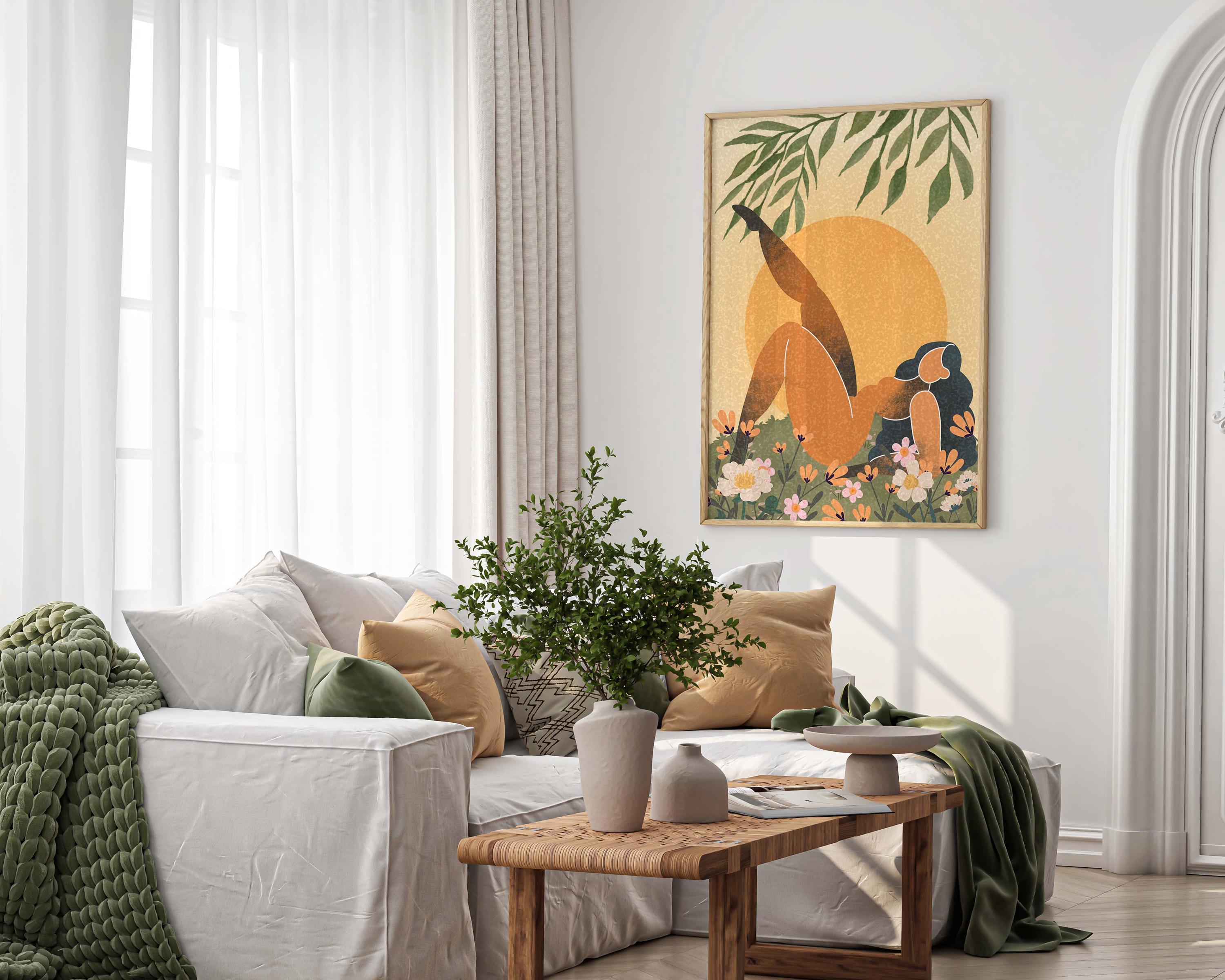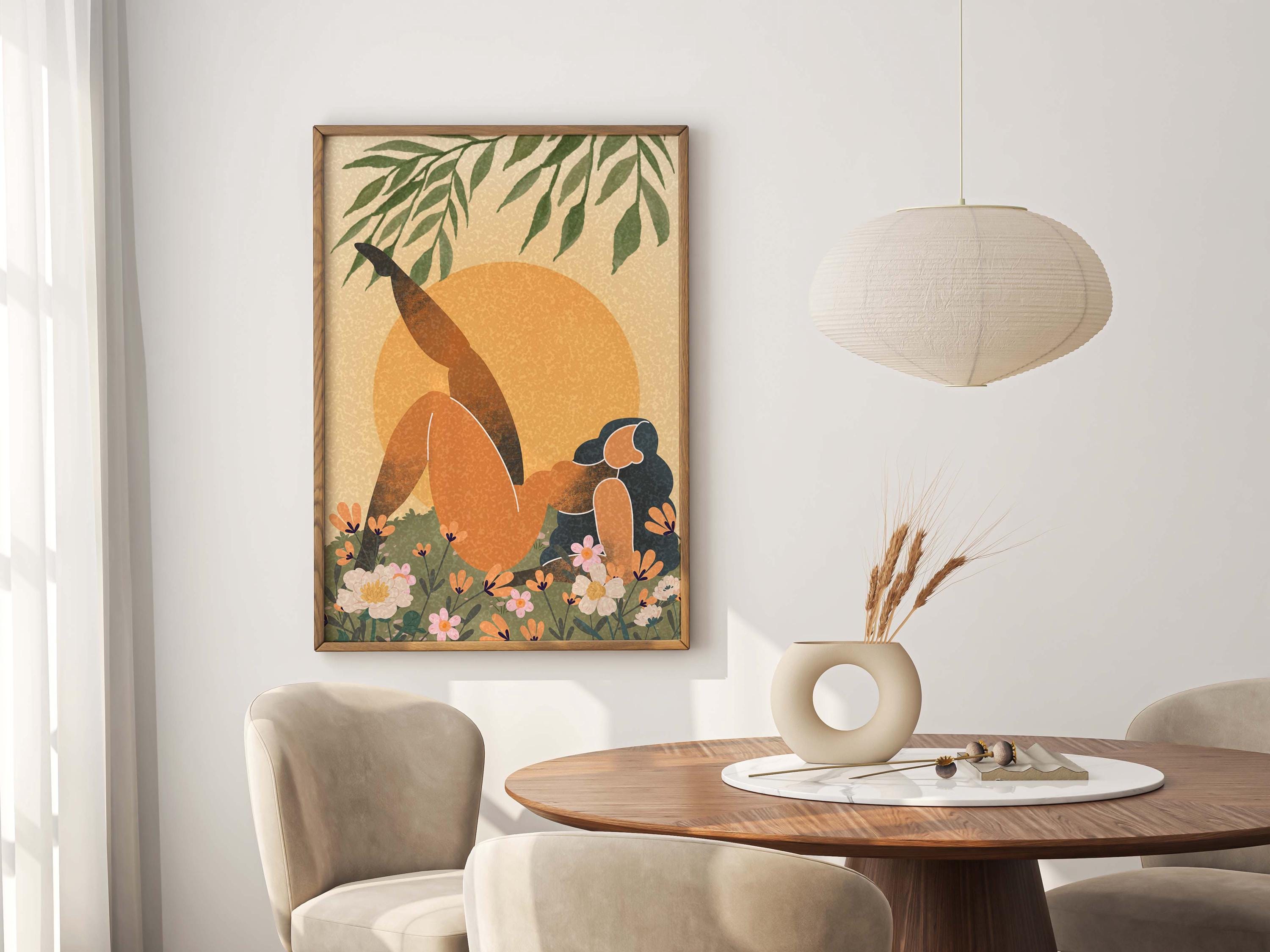 Black woman art print featuring a confident, curvy figure surrounded by blooming florals and warm retro tones, this piece blends femininity, body positivity, and modern boho style.