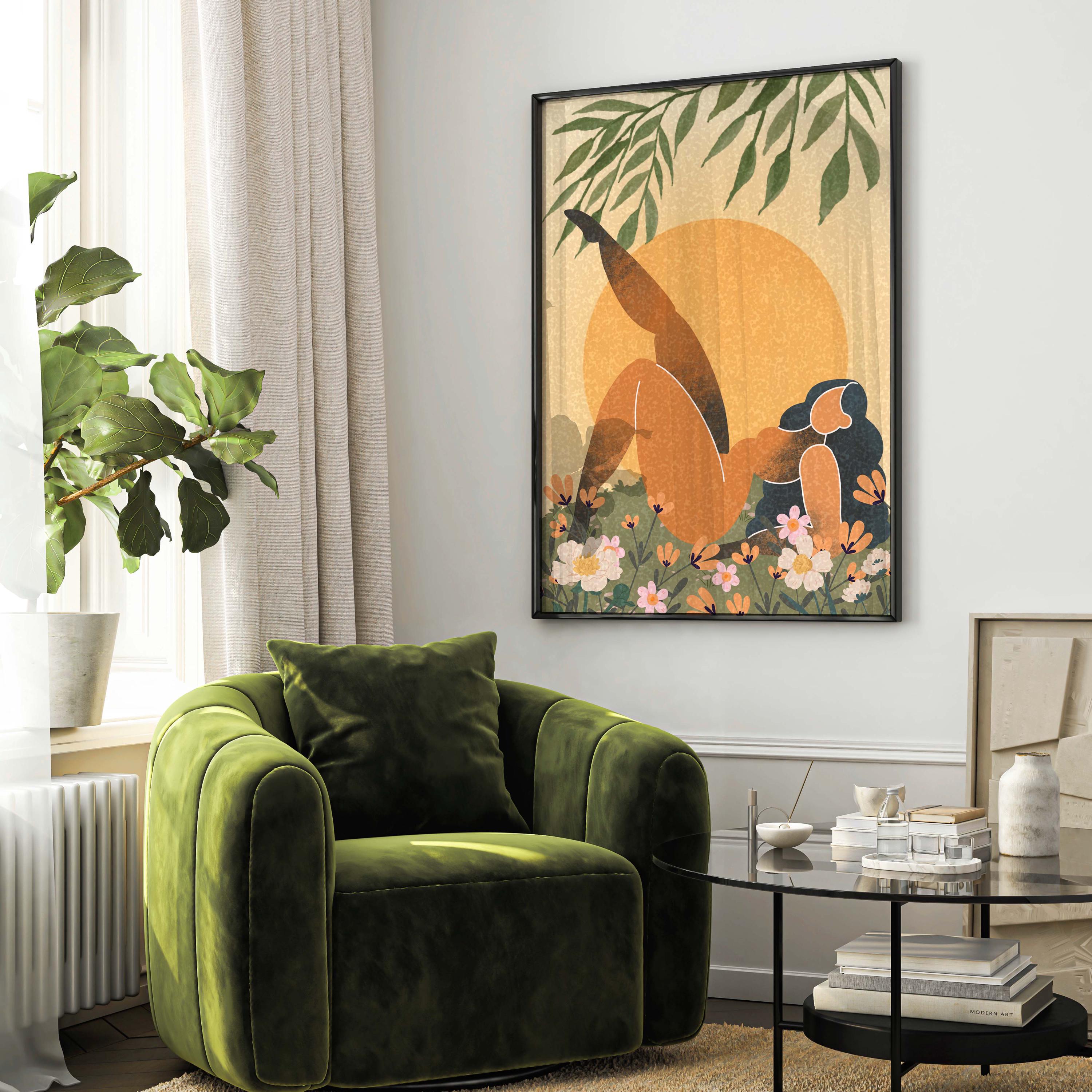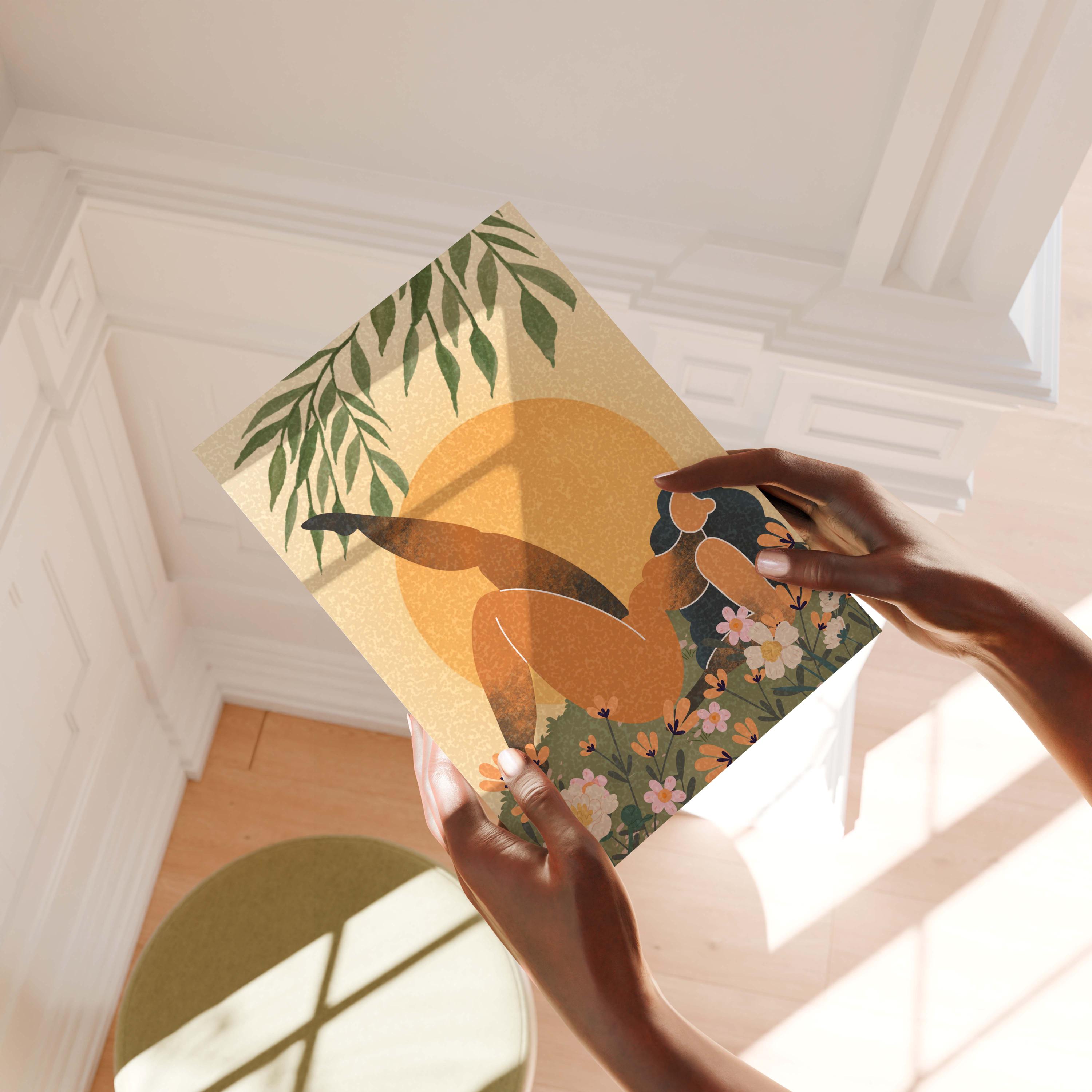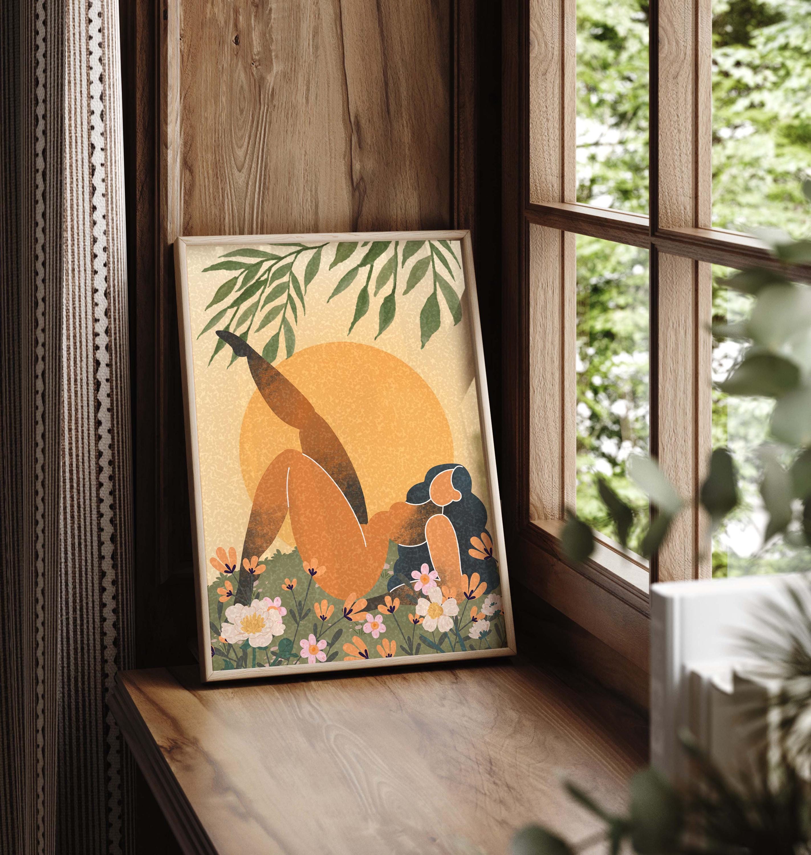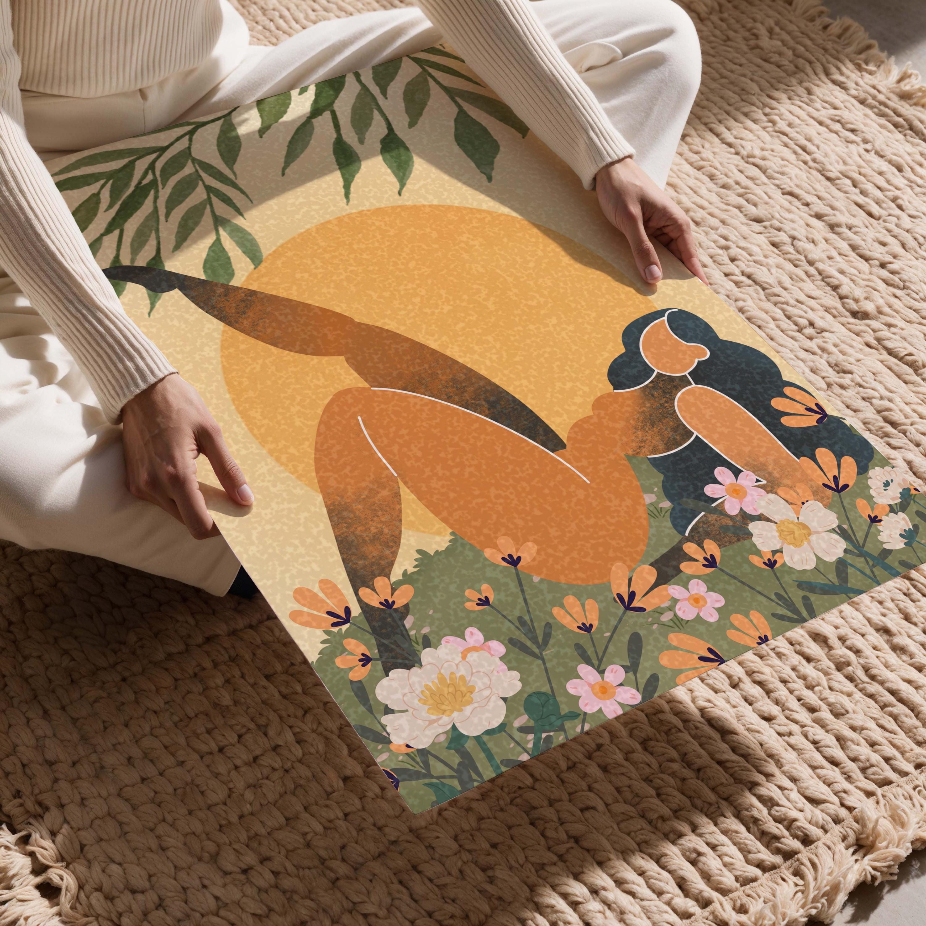 Black woman art print featuring a confident, curvy figure surrounded by blooming florals and warm retro tones, this piece blends femininity, body positivity, and modern boho style.