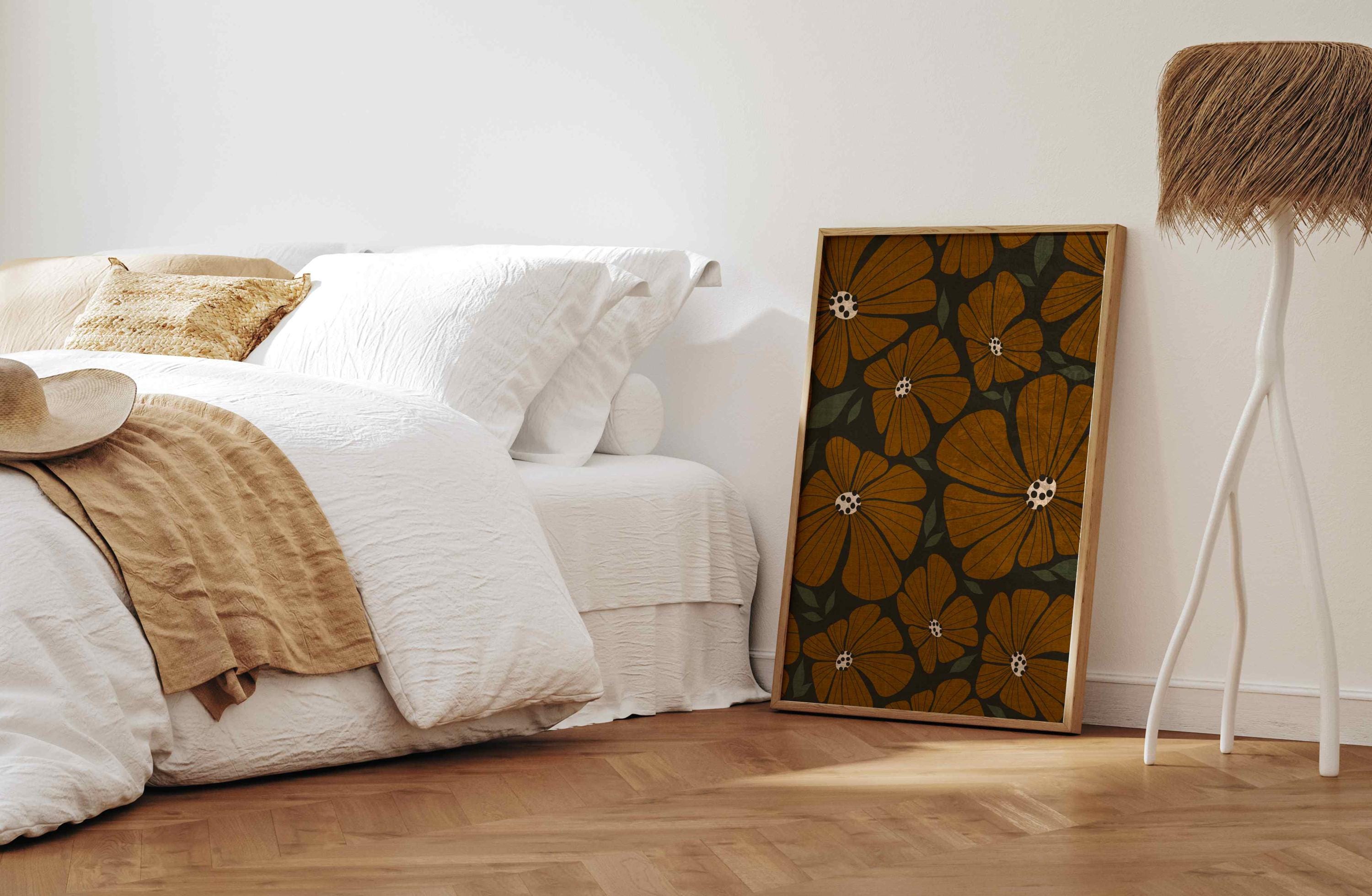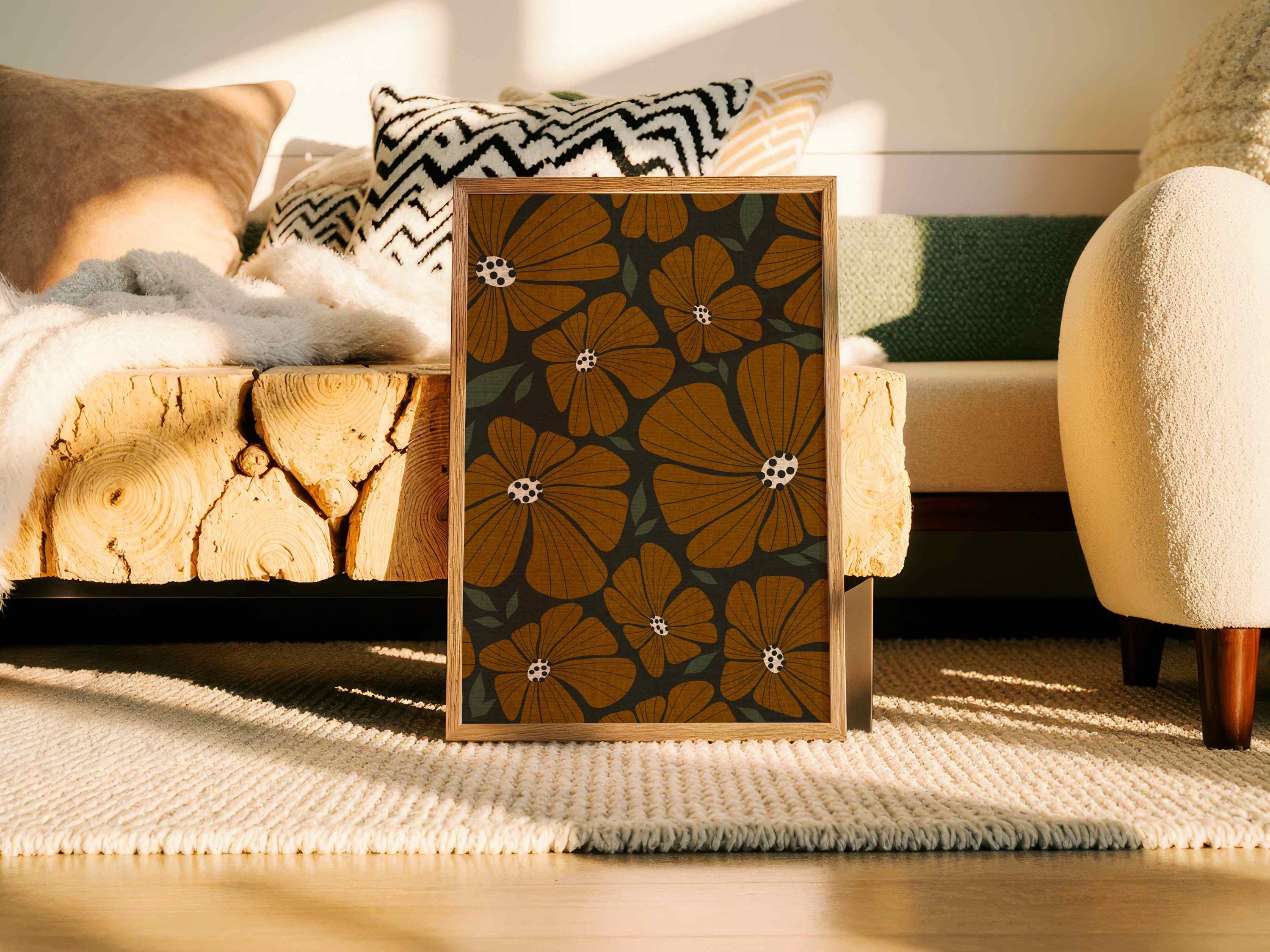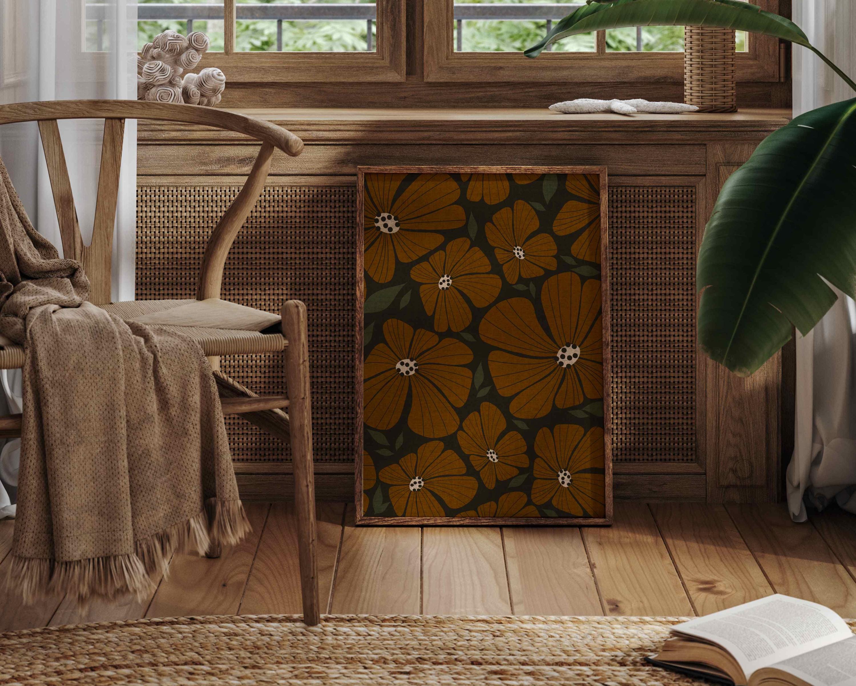 Retro flower print featuring an abstract 70s style botanical pattern in warm earthy colors. Inspired by retro florals and mid century modern design, this piece adds warmth to any living room, kitchen, office, or bedroom. Perfect for earth tone decor, modern boho interiors, and vintage-style spaces.