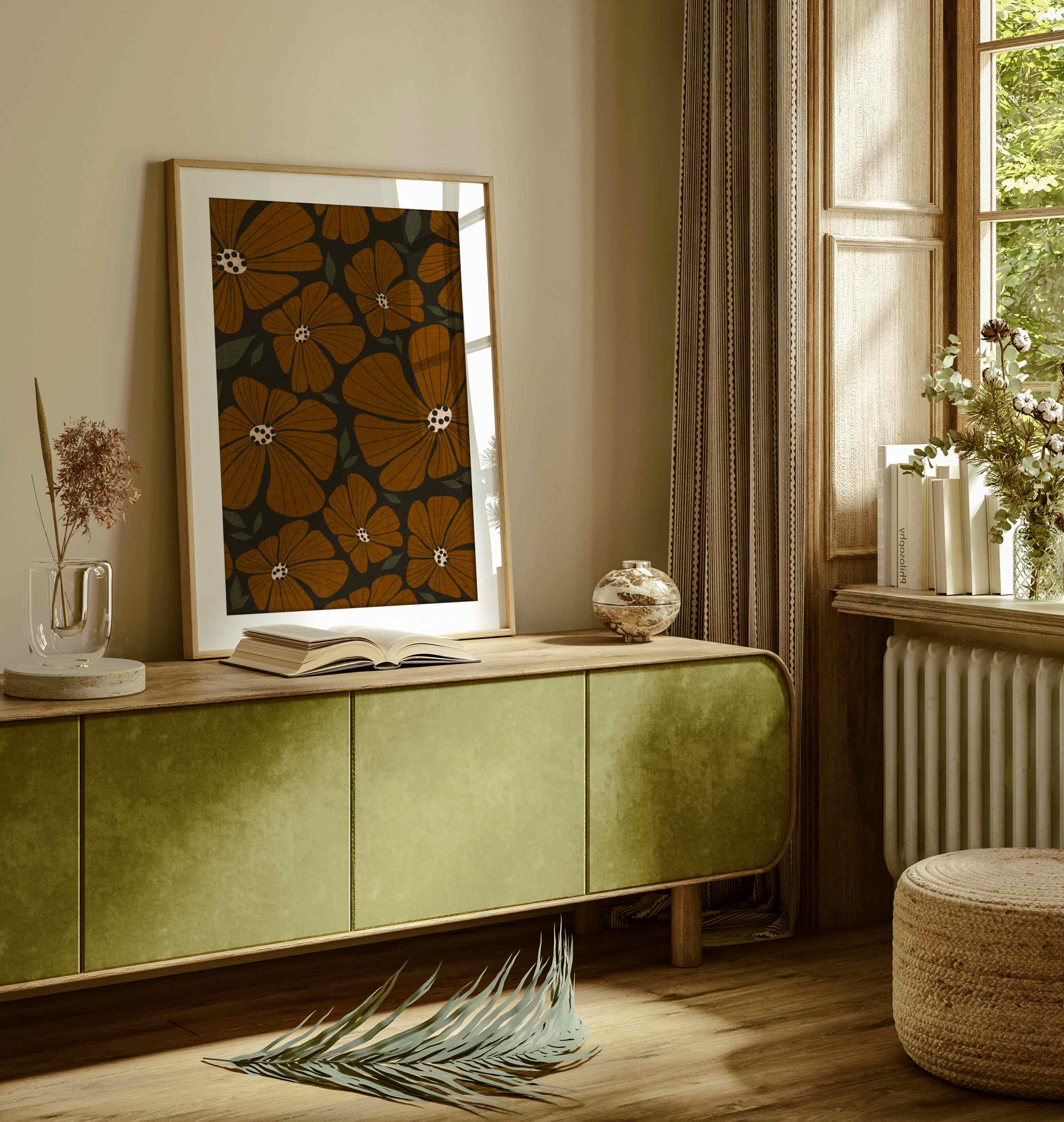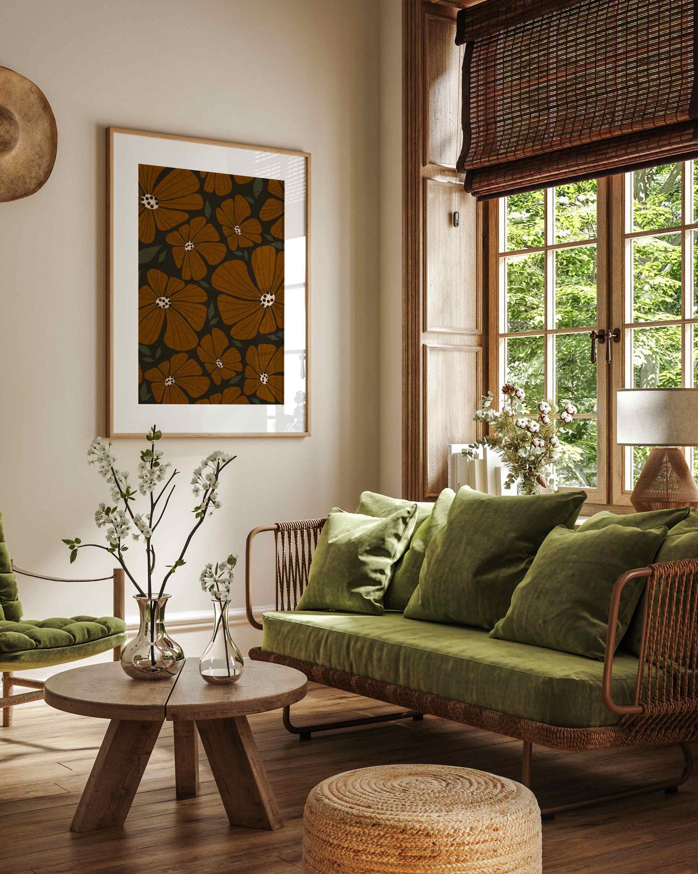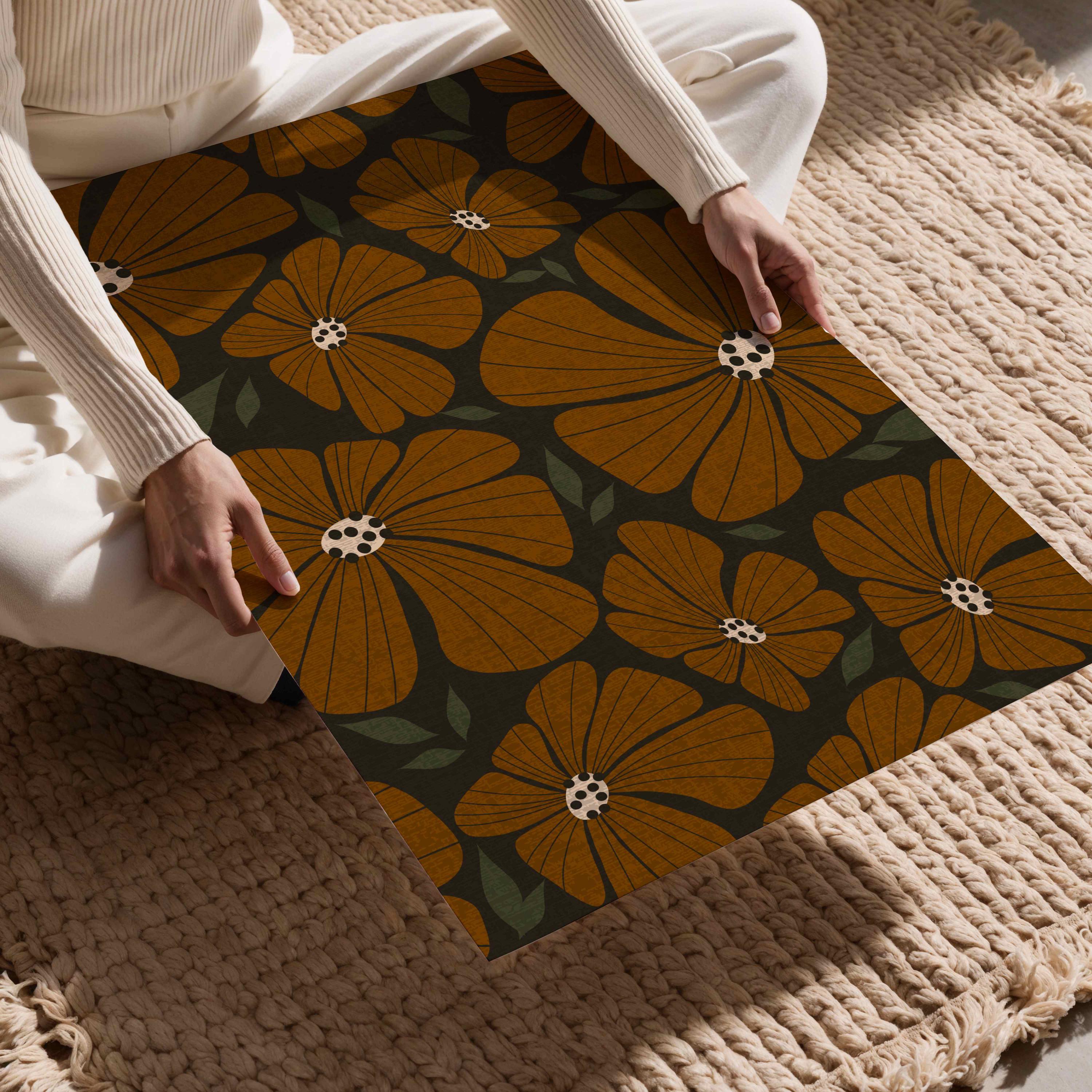 Retro flower print featuring an abstract 70s style botanical pattern in warm earthy colors. Inspired by retro florals and mid century modern design, this piece adds warmth to any living room, kitchen, office, or bedroom. Perfect for earth tone decor, modern boho interiors, and vintage-style spaces.