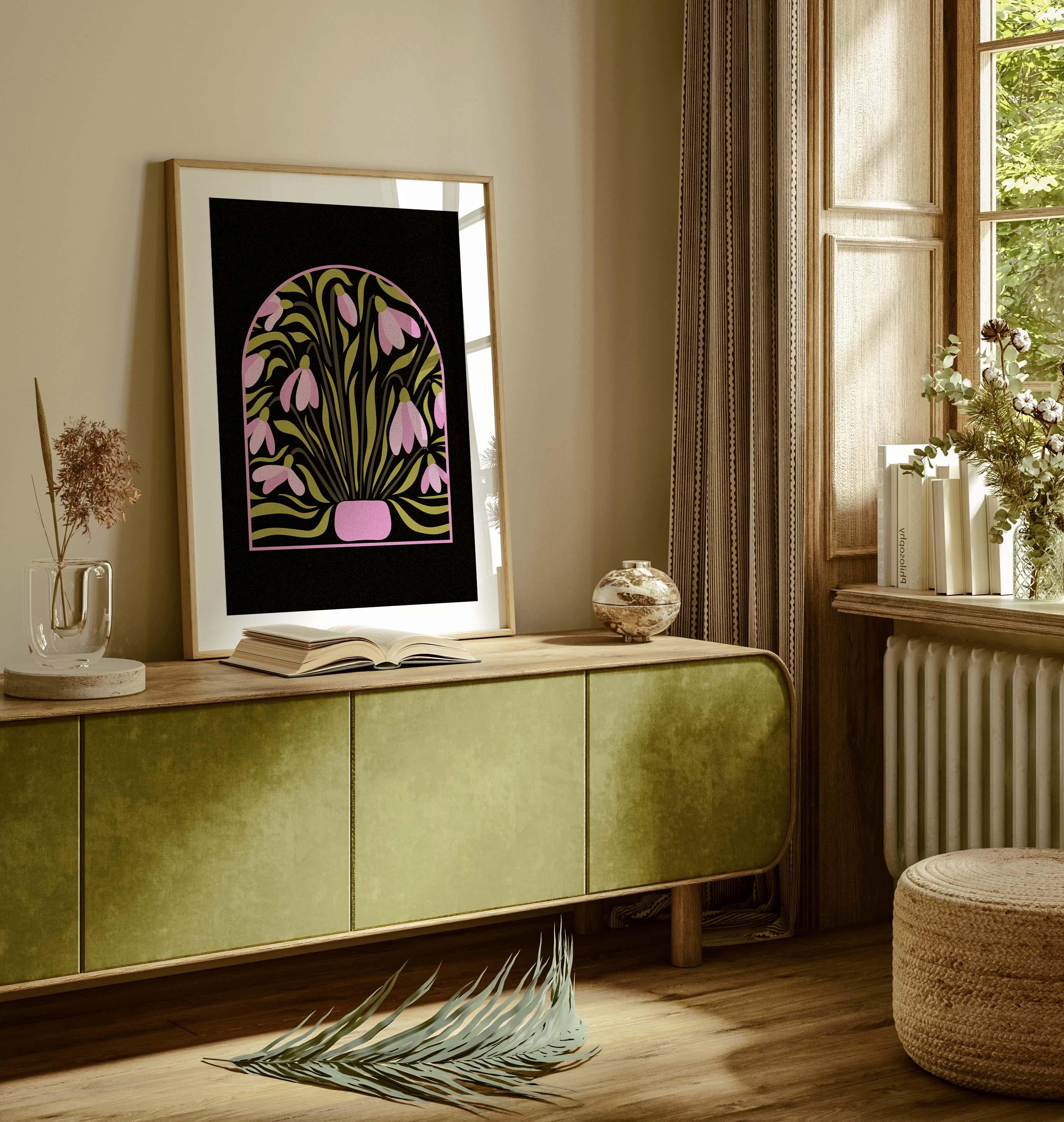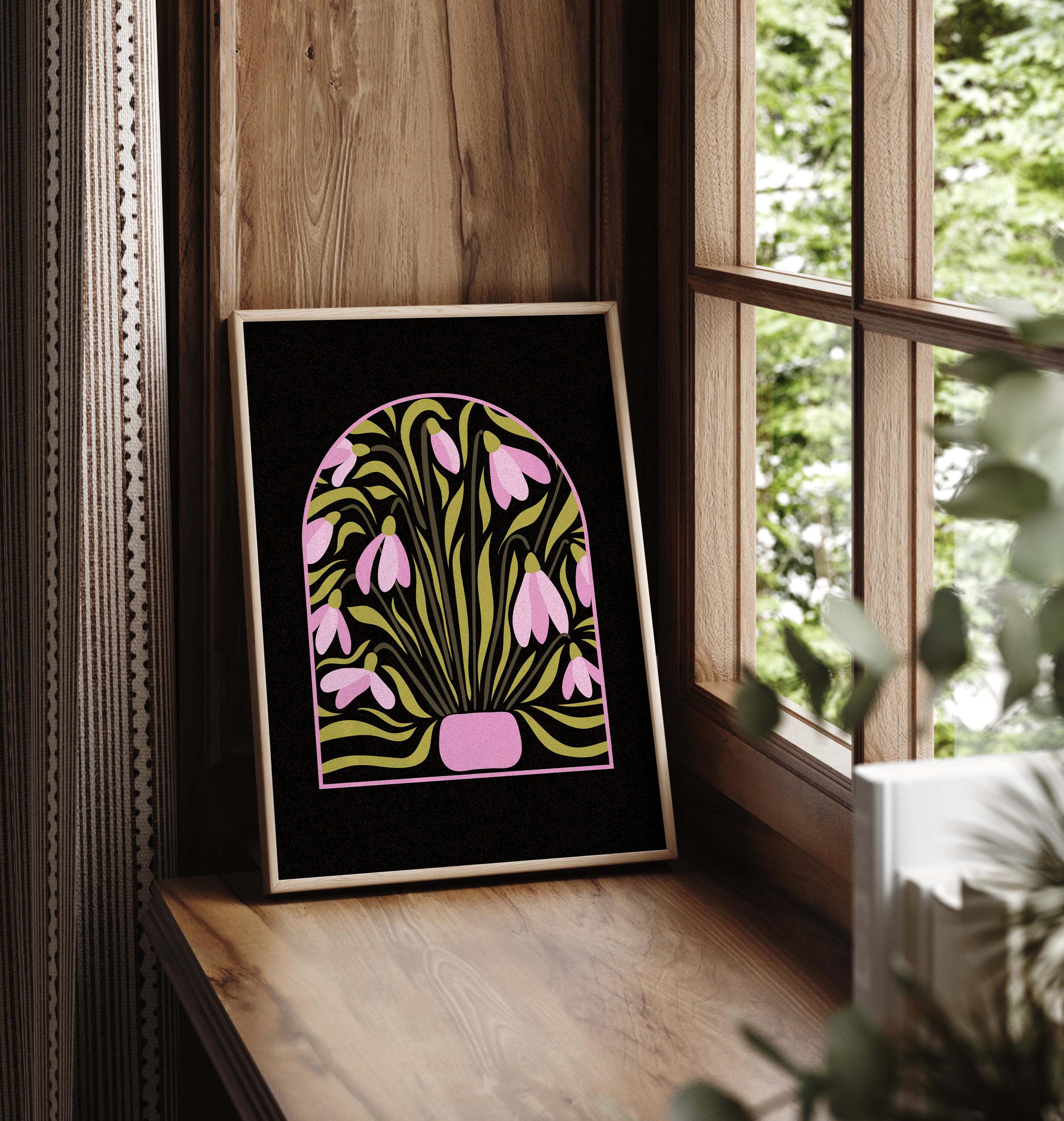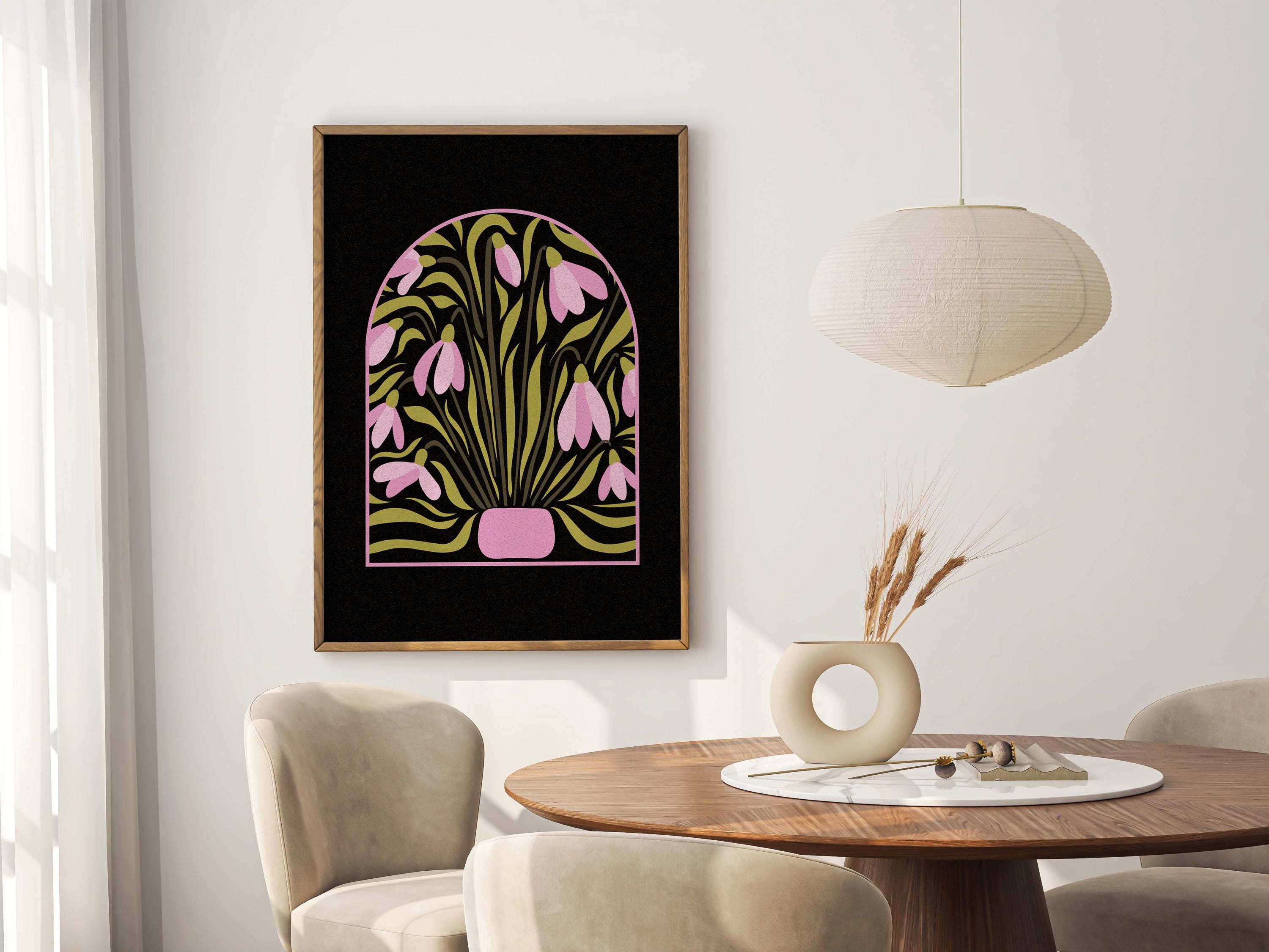 Stylized snowdrop flower print inspired by mid-century botanical illustrations. The bold shapes and warm retro palette create a decorative yet modern piece of wall art. It works well in mid-century, Scandinavian, vintage, or eclectic interiors.