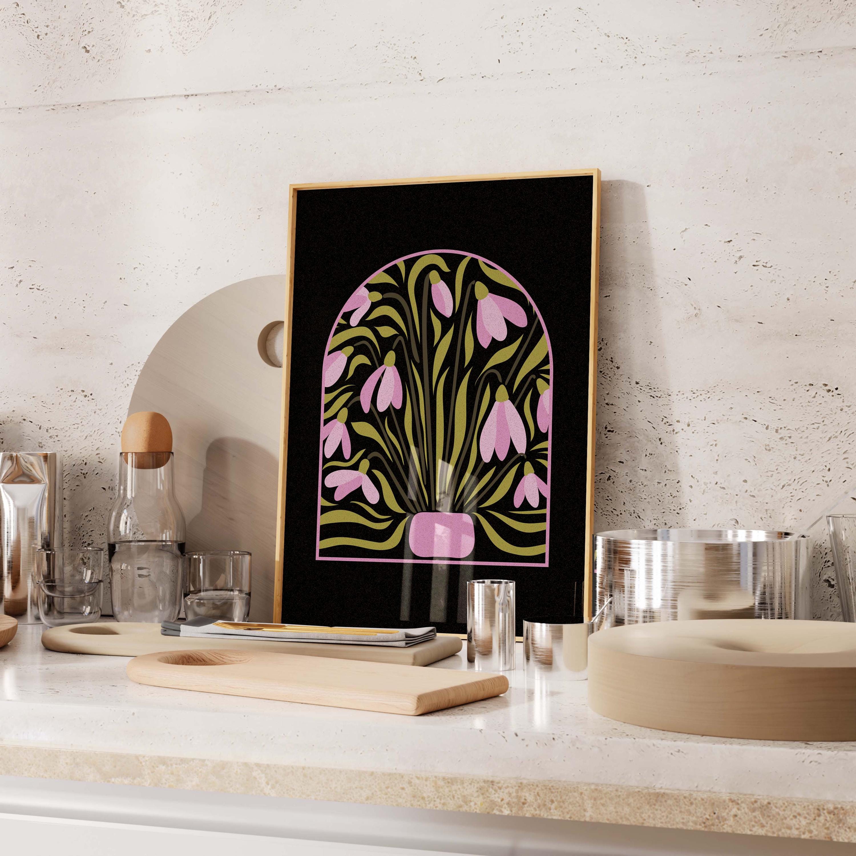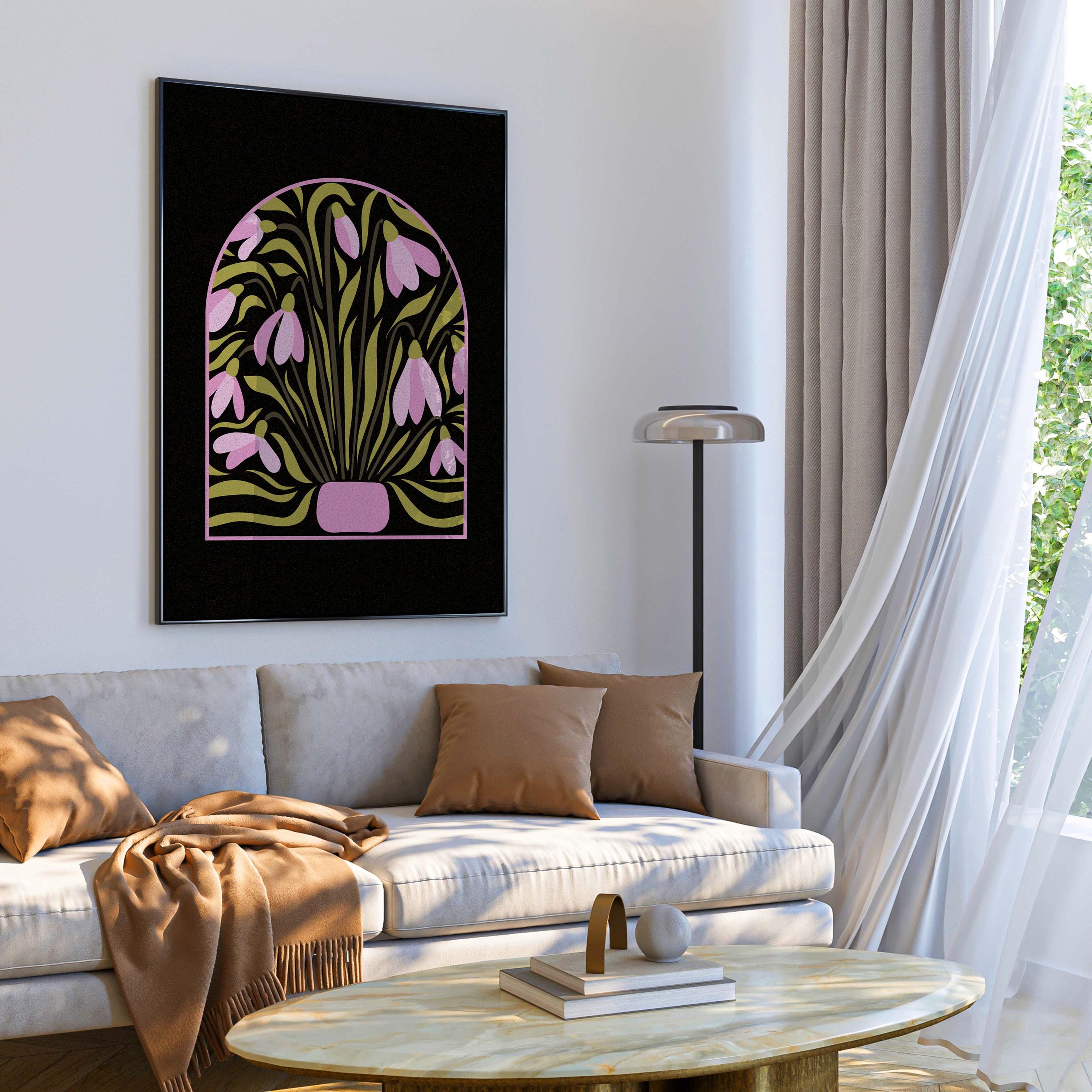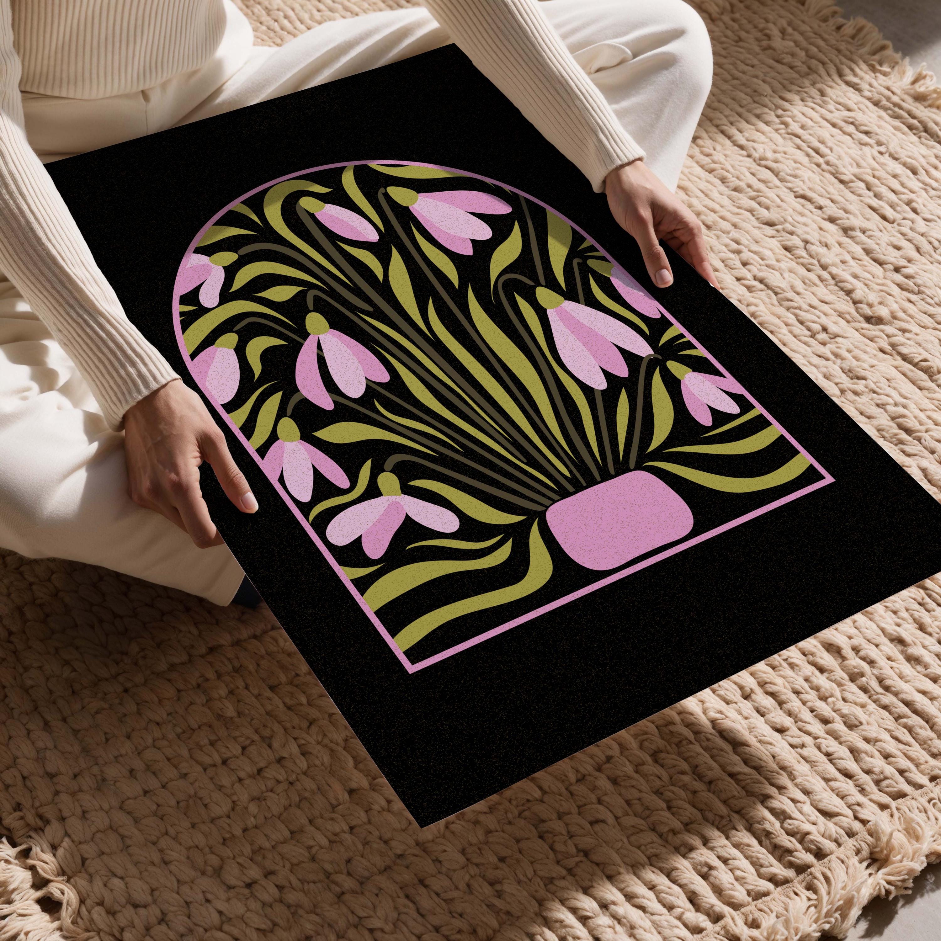Stylized snowdrop flower print inspired by mid-century botanical illustrations. The bold shapes and warm retro palette create a decorative yet modern piece of wall art. It works well in mid-century, Scandinavian, vintage, or eclectic interiors.