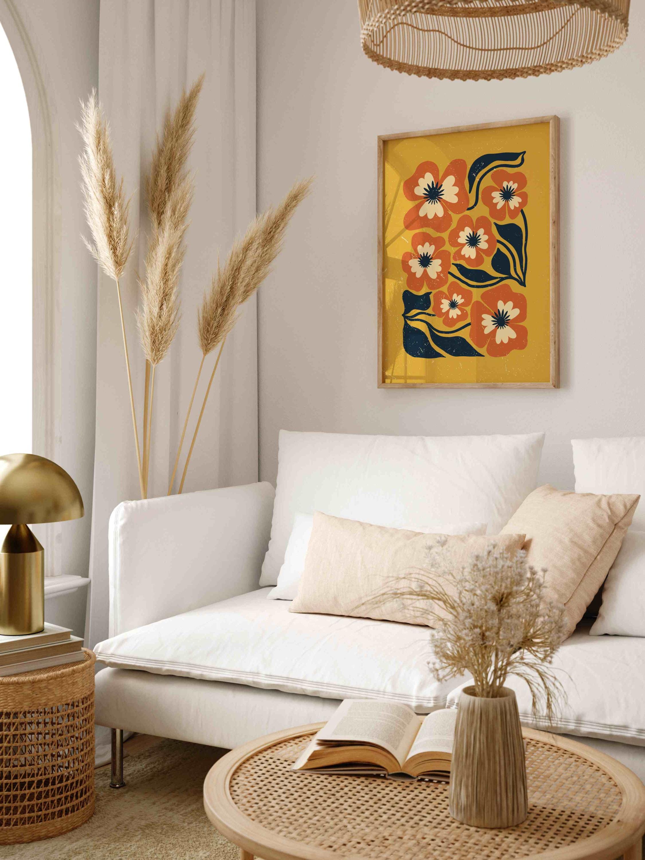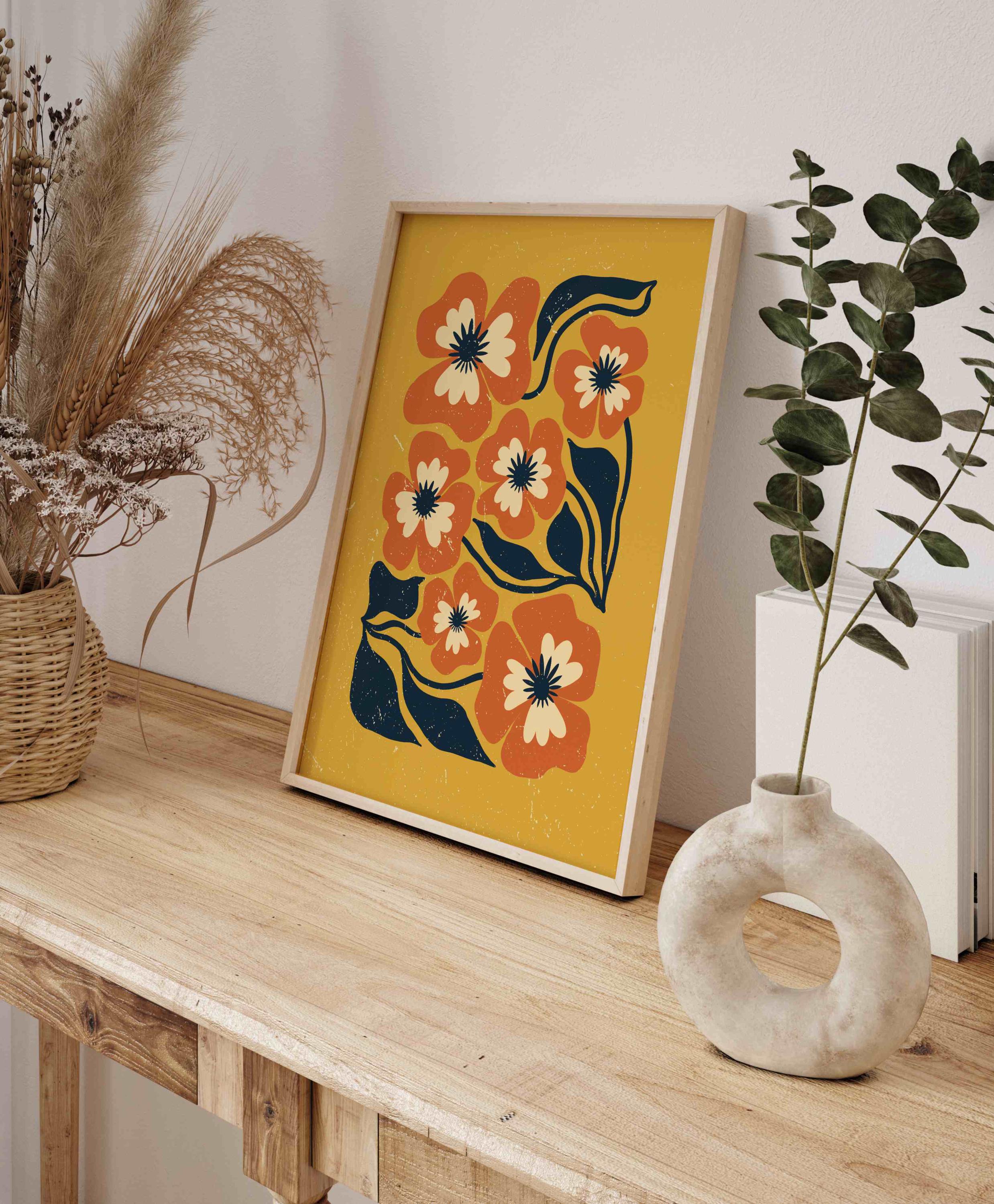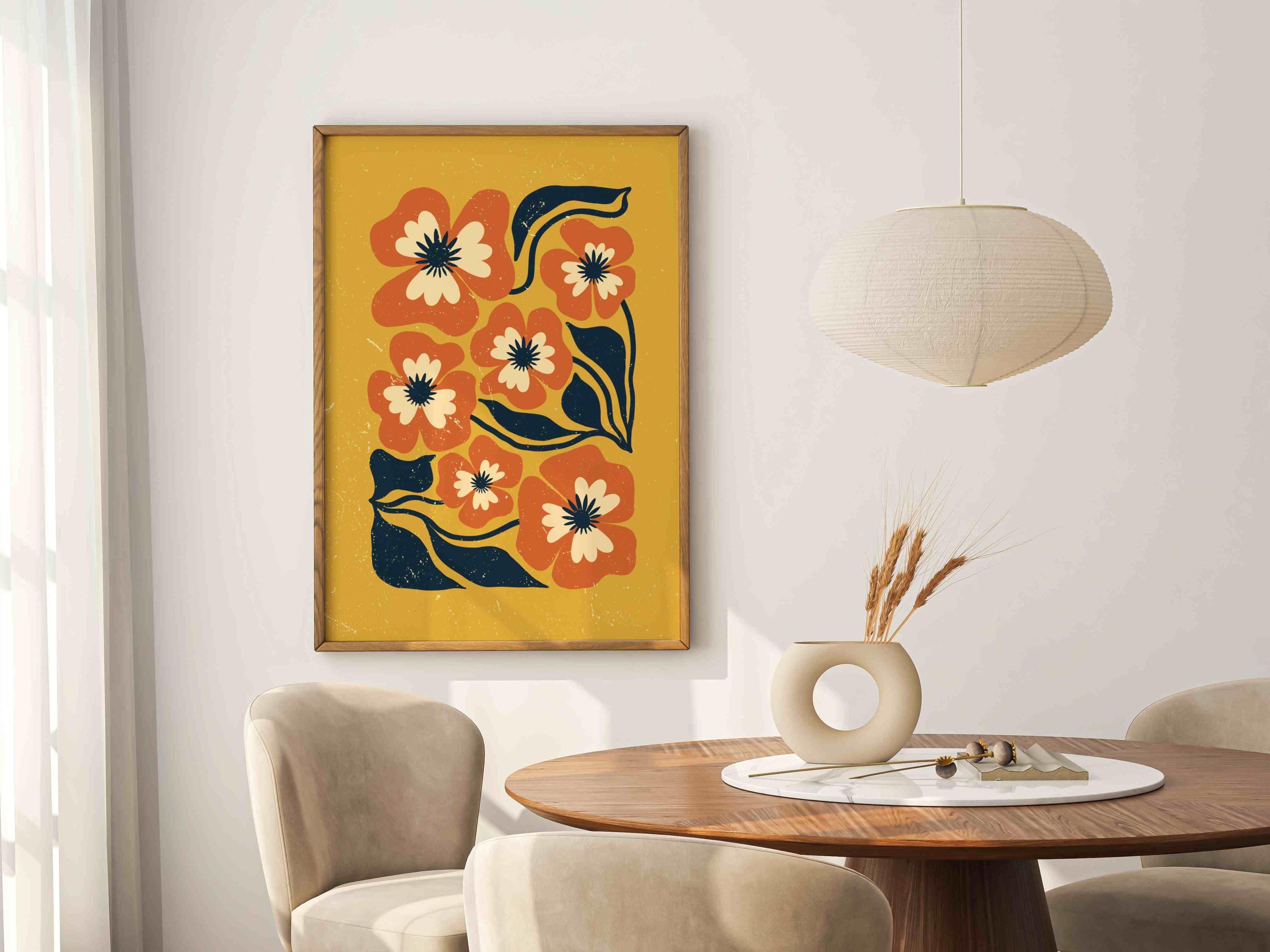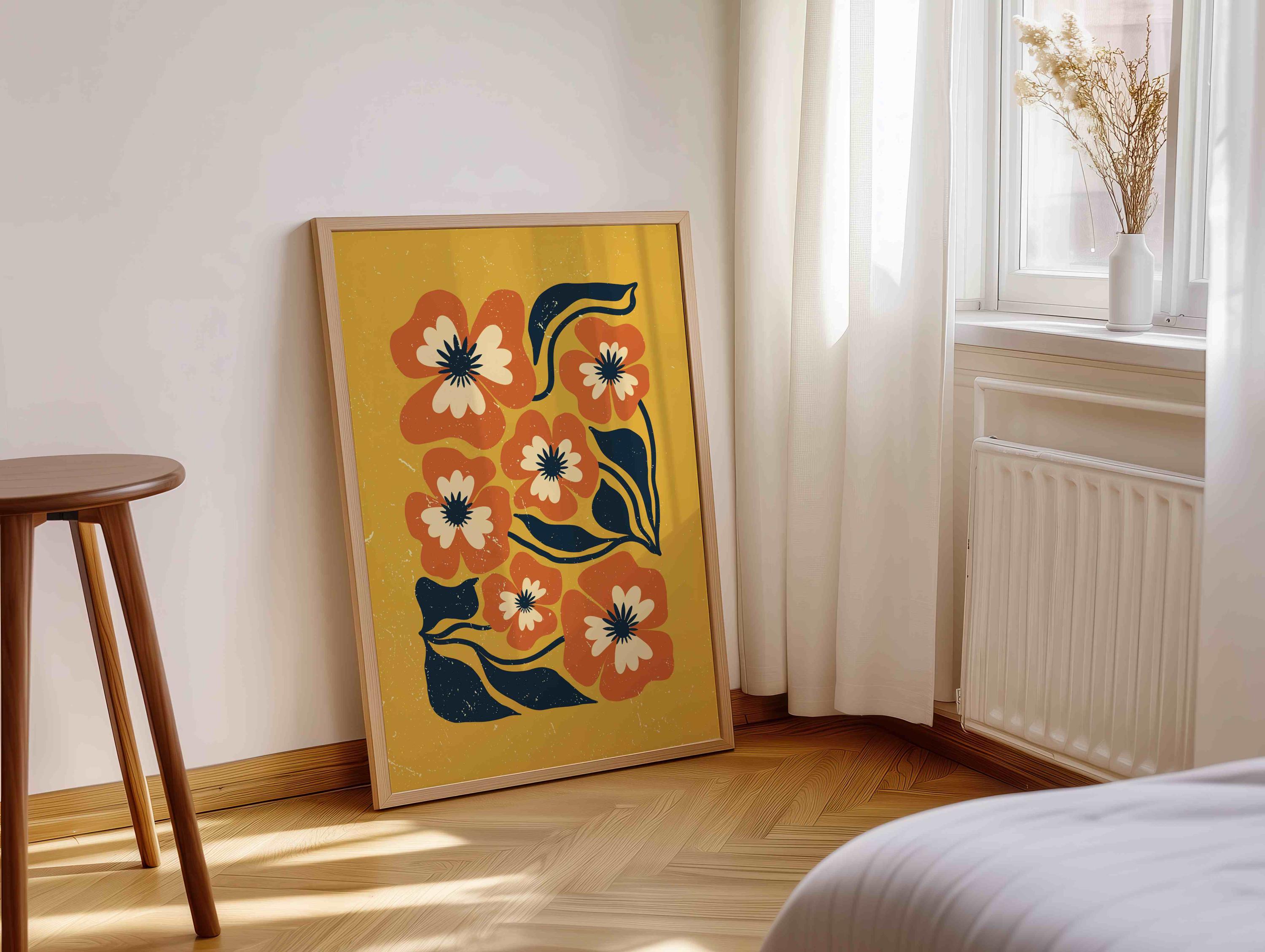 Retro floral wall art inspired by 70s design, Matisse-style shapes, and mid century modern aesthetics. Featuring bold orange flowers, navy blue leaves, and soft cream details on a rich mustard yellow background, this print is perfect for boho, eclectic, and mid century spaces.