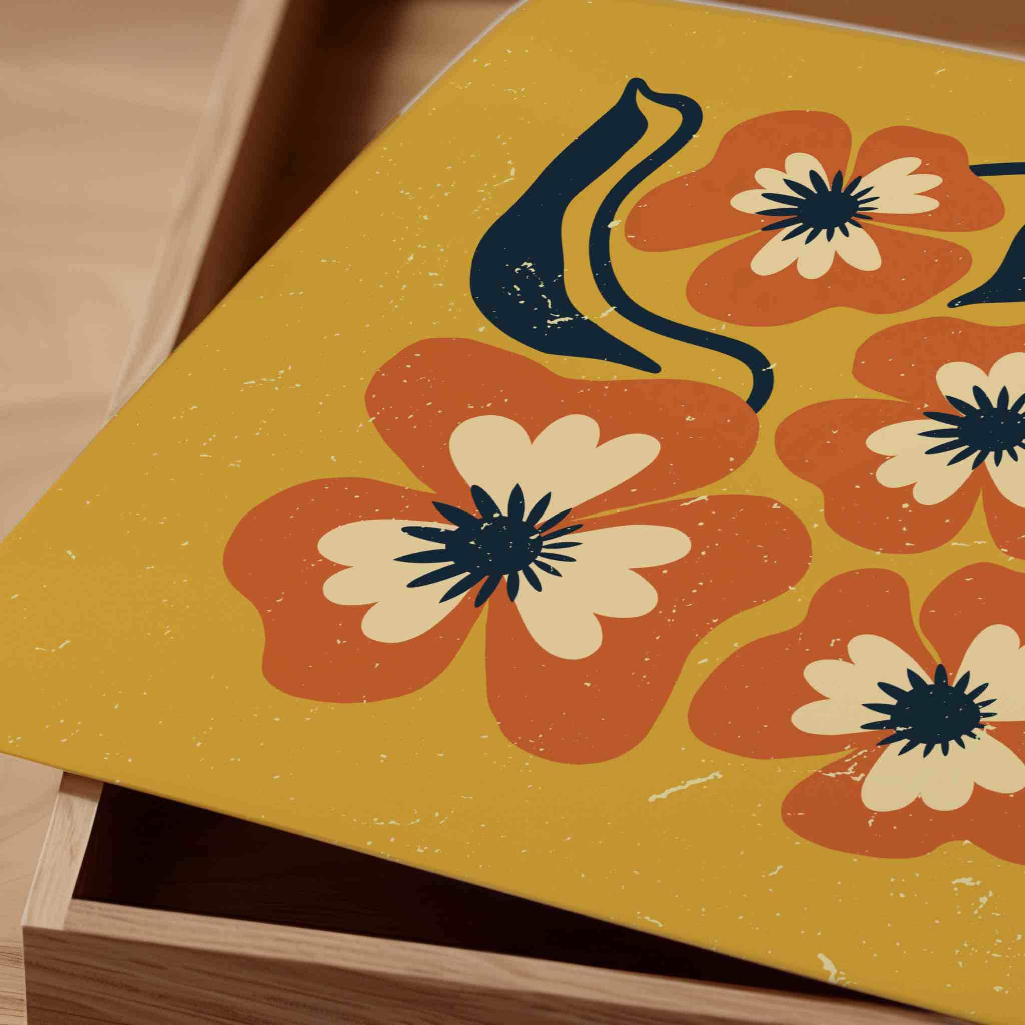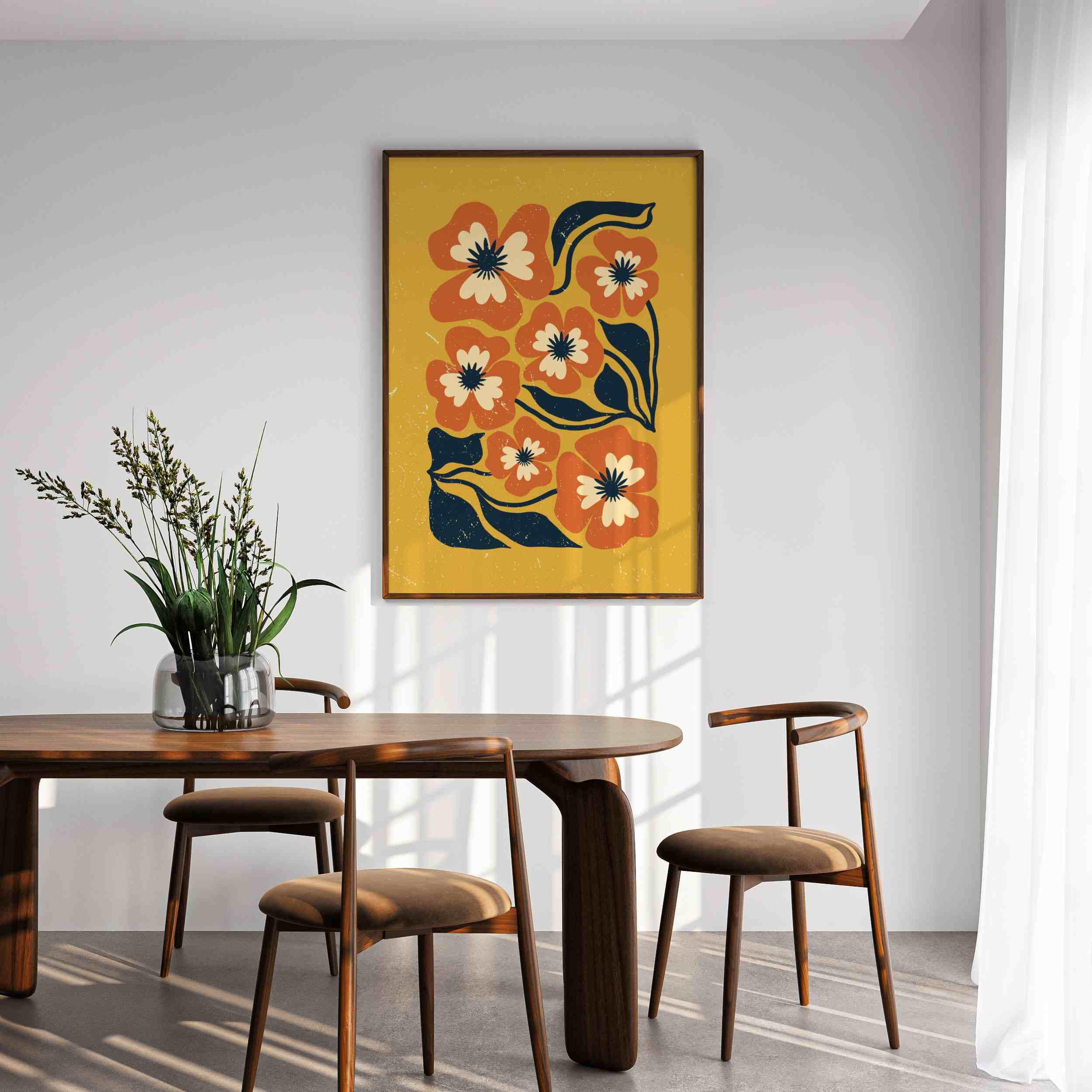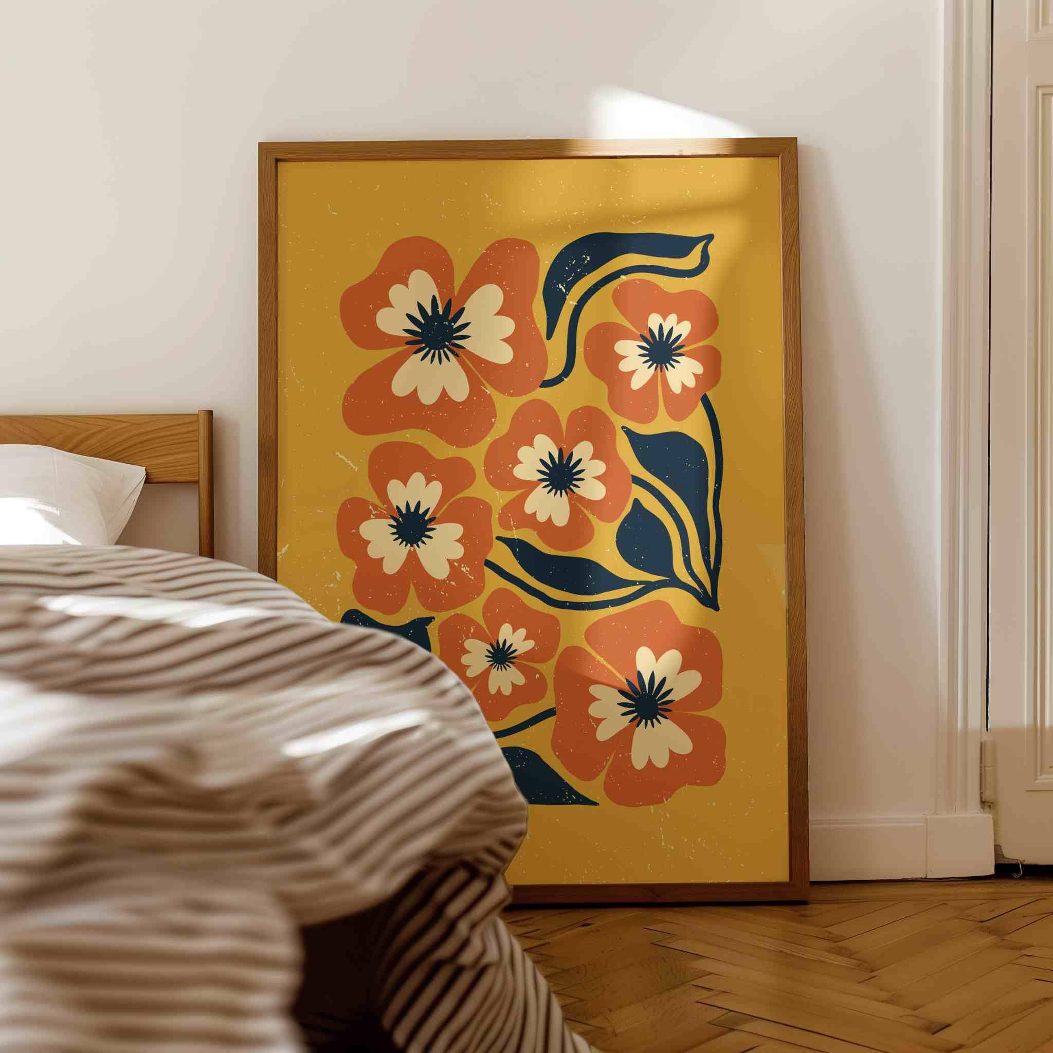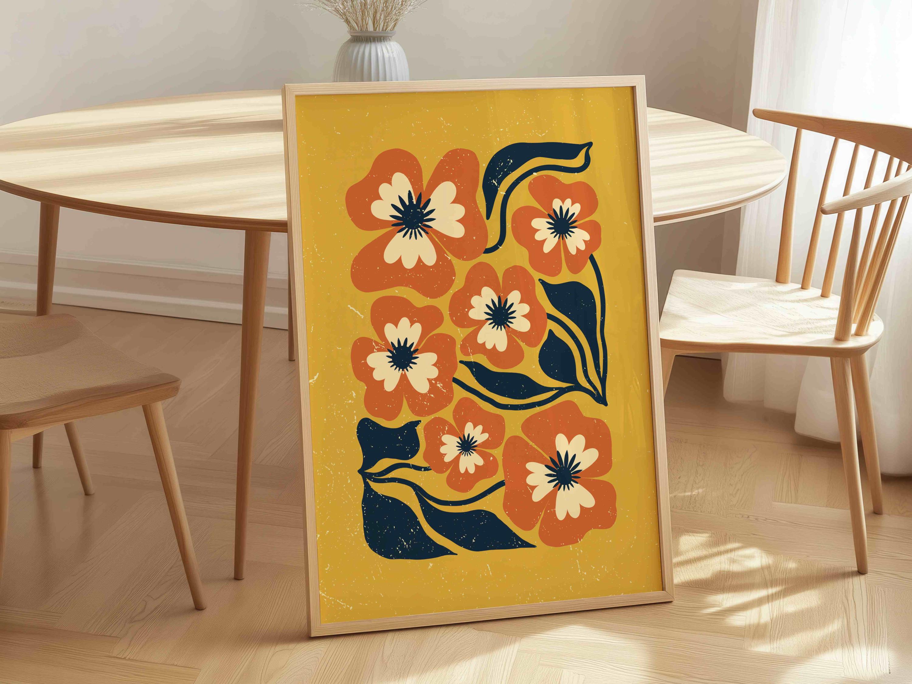 Retro floral wall art inspired by 70s design, Matisse-style shapes, and mid century modern aesthetics. Featuring bold orange flowers, navy blue leaves, and soft cream details on a rich mustard yellow background, this print is perfect for boho, eclectic, and mid century spaces.
