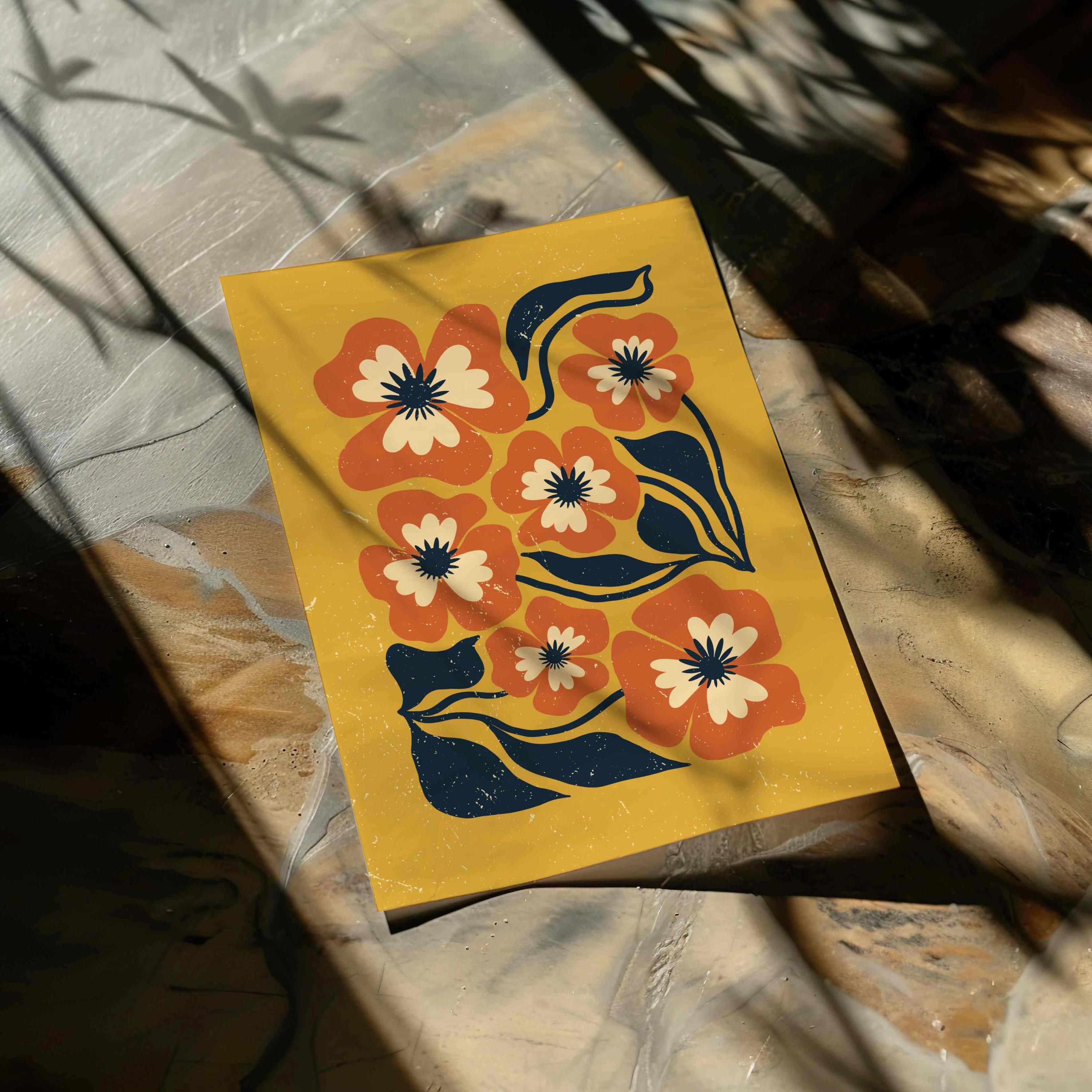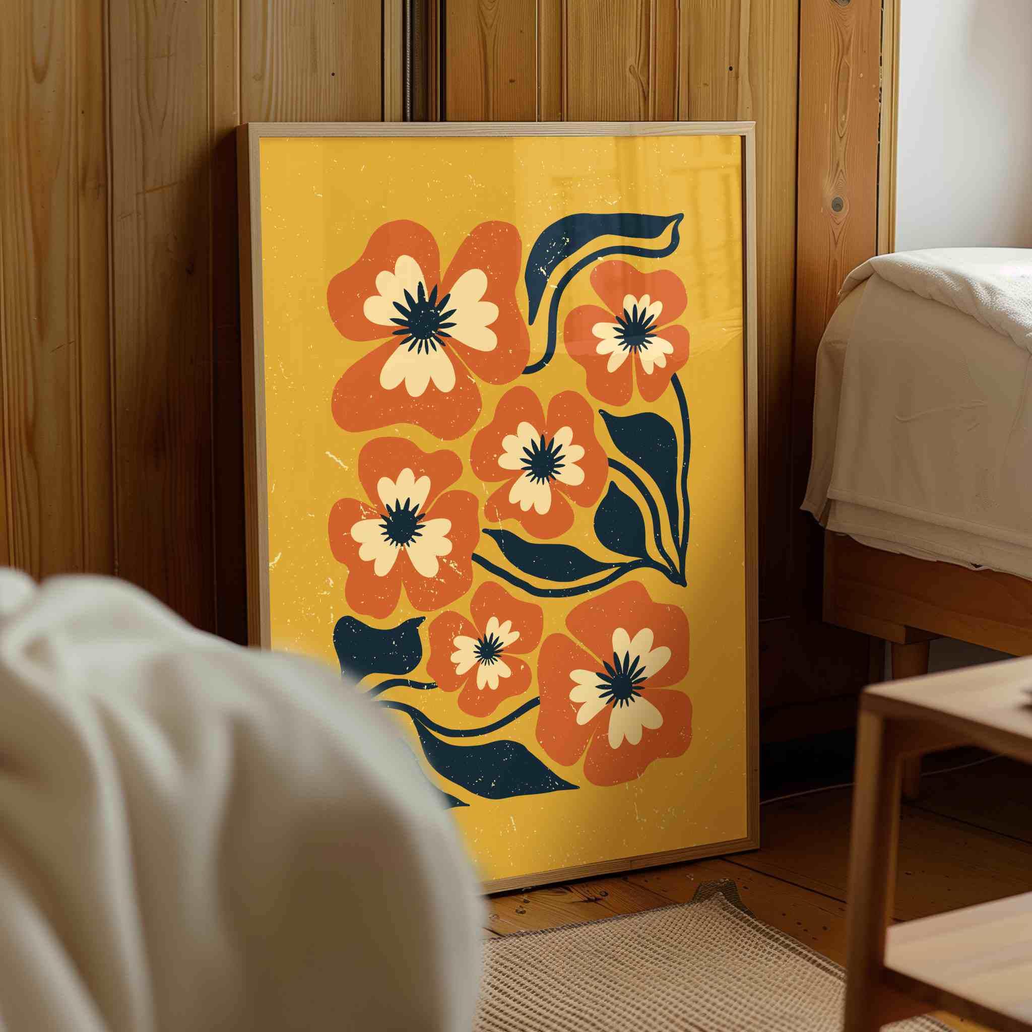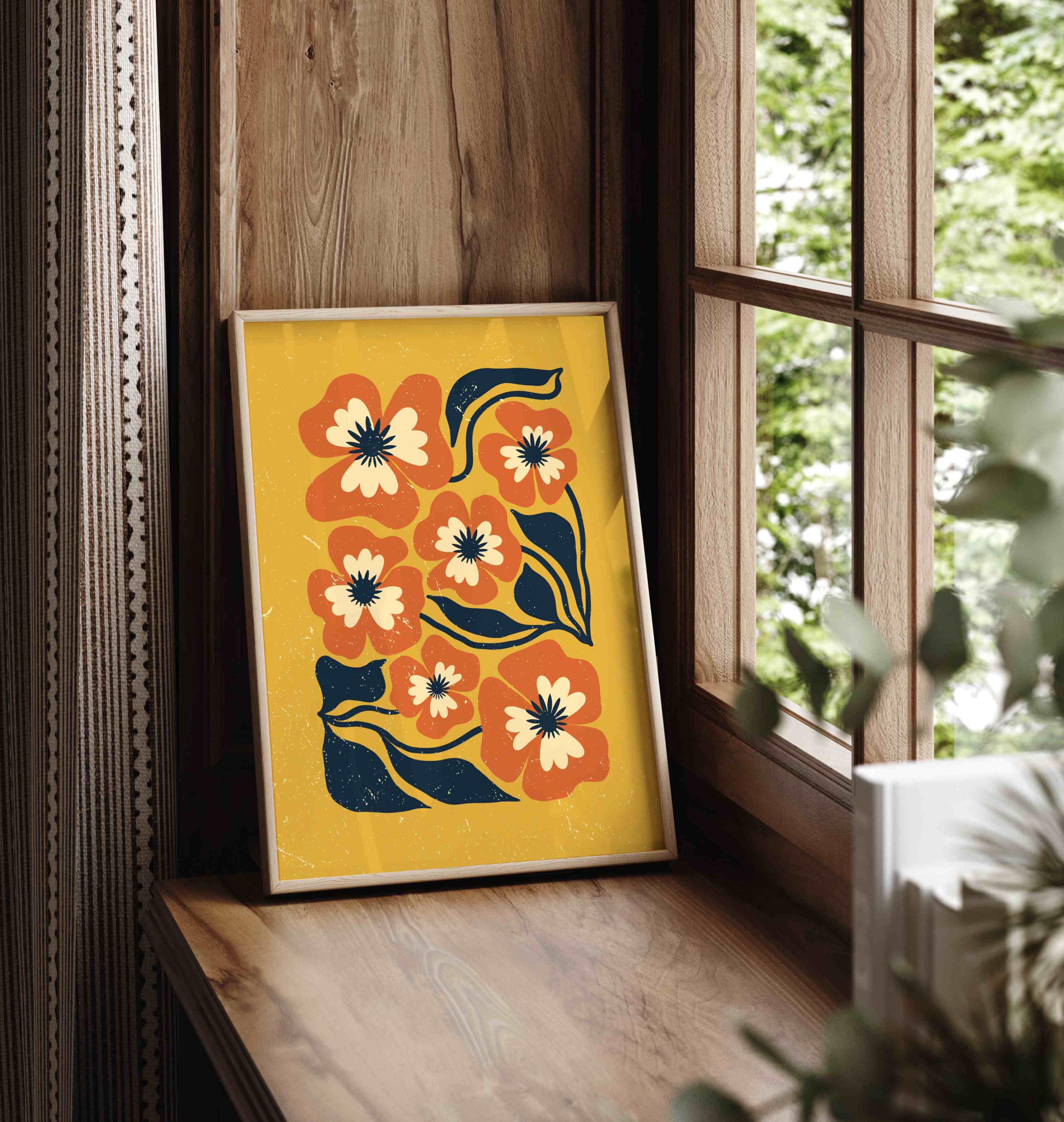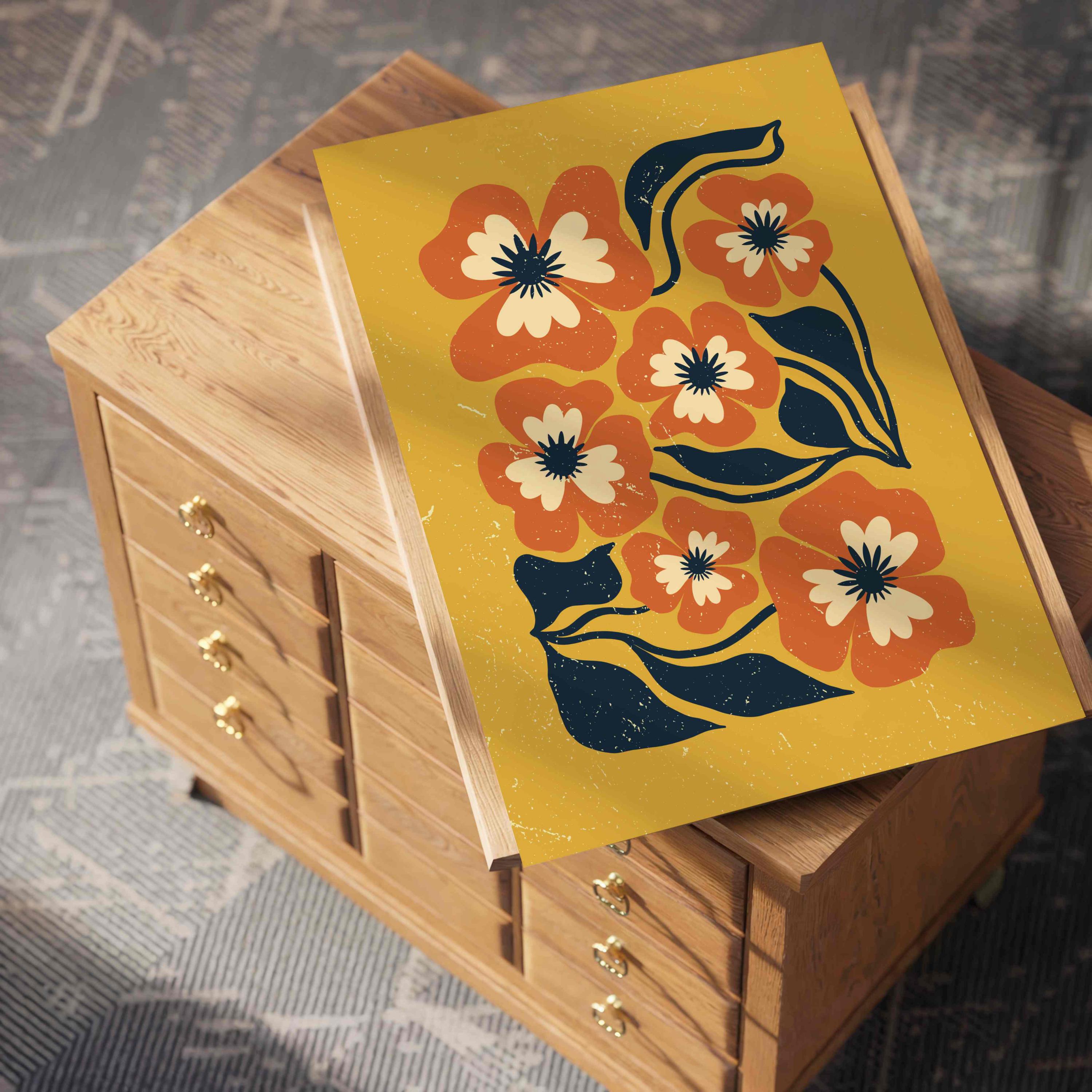 Retro floral wall art inspired by 70s design, Matisse-style shapes, and mid century modern aesthetics. Featuring bold orange flowers, navy blue leaves, and soft cream details on a rich mustard yellow background, this print is perfect for boho, eclectic, and mid century spaces.