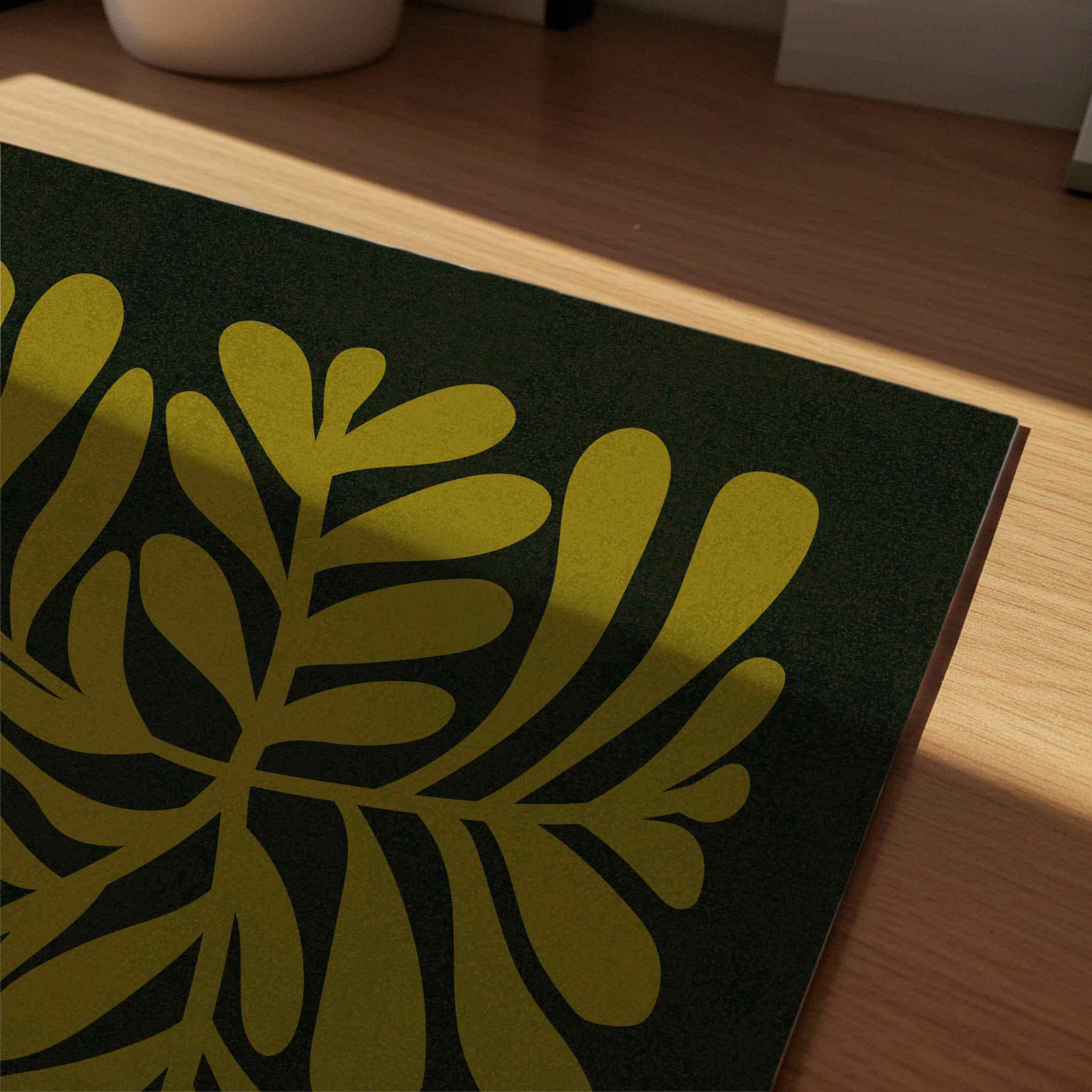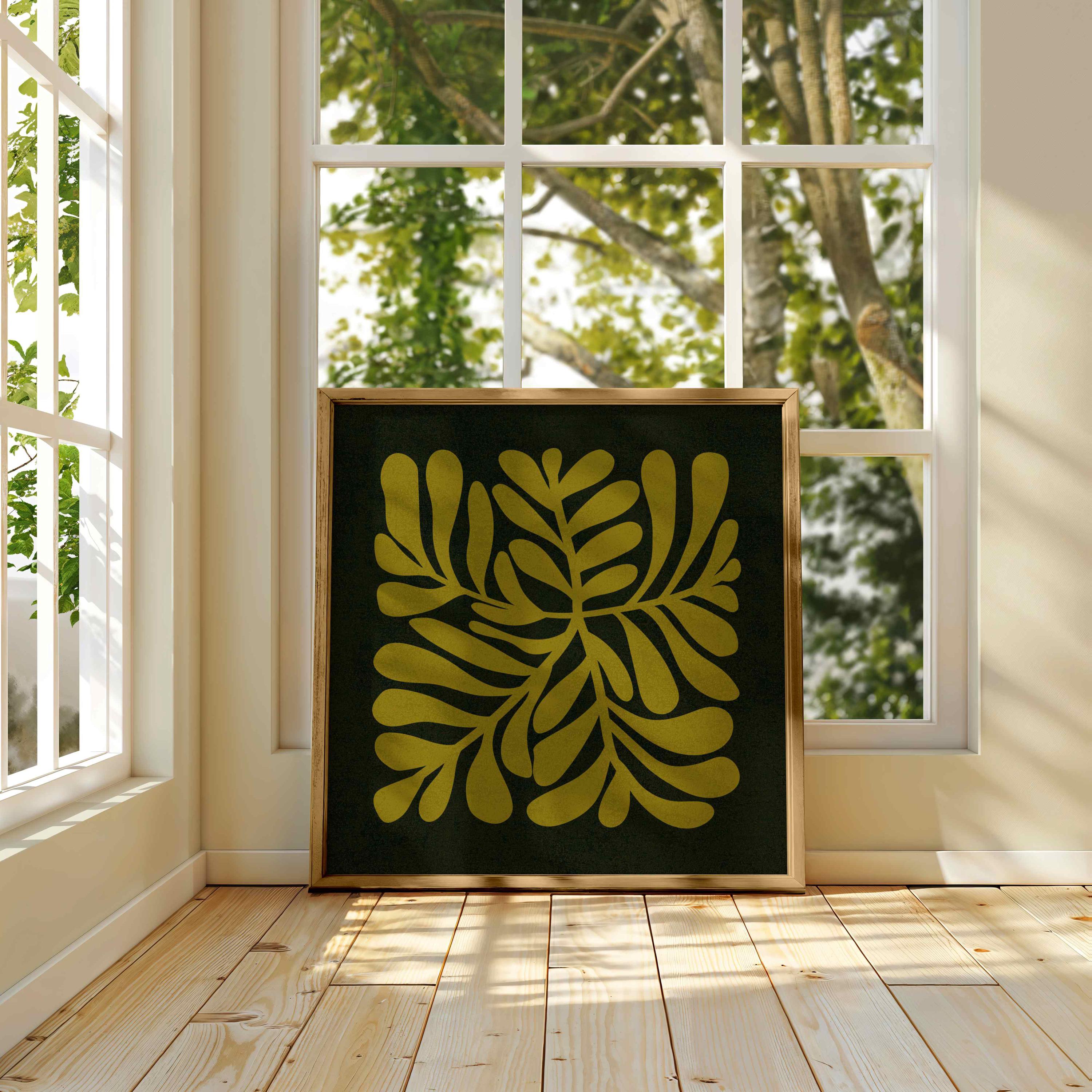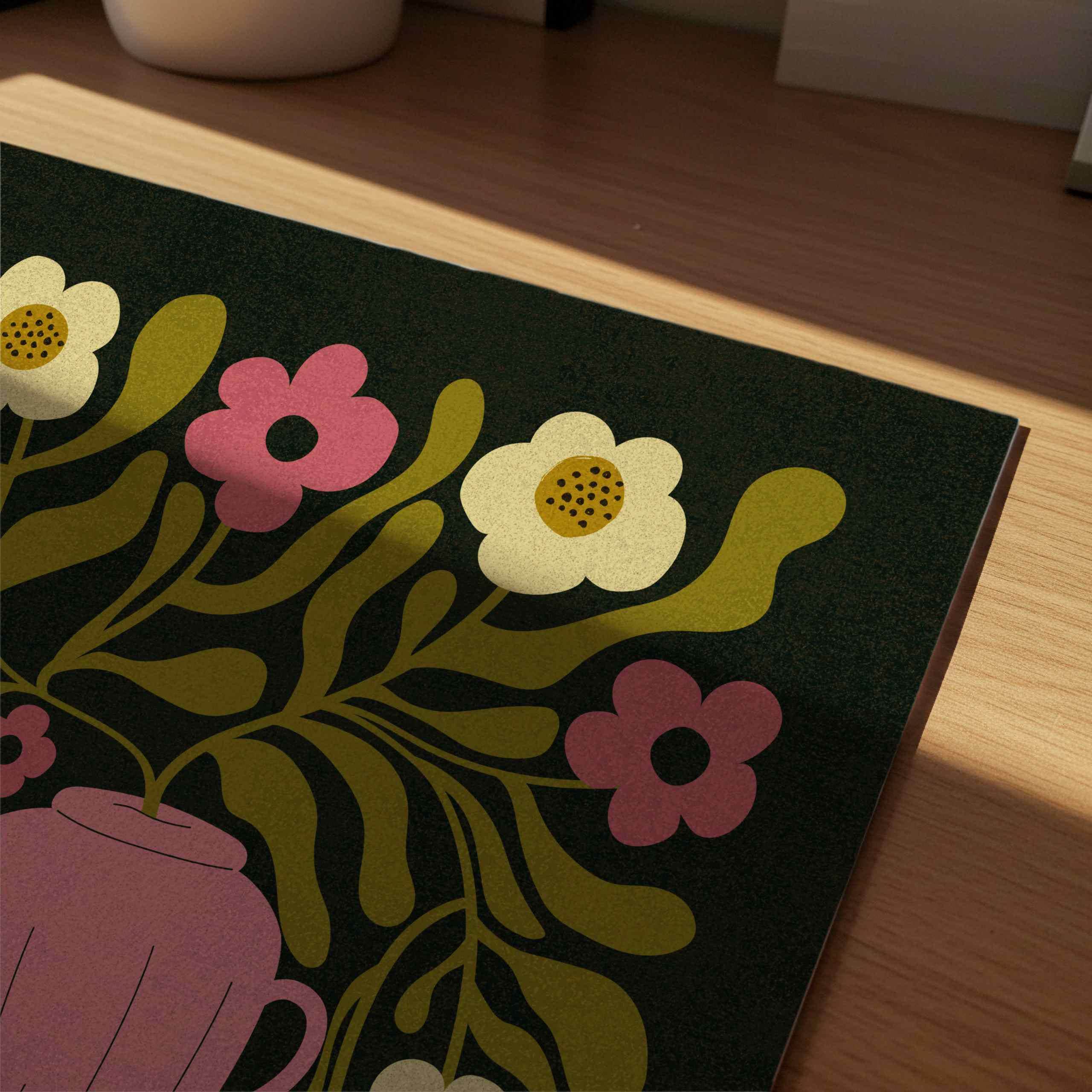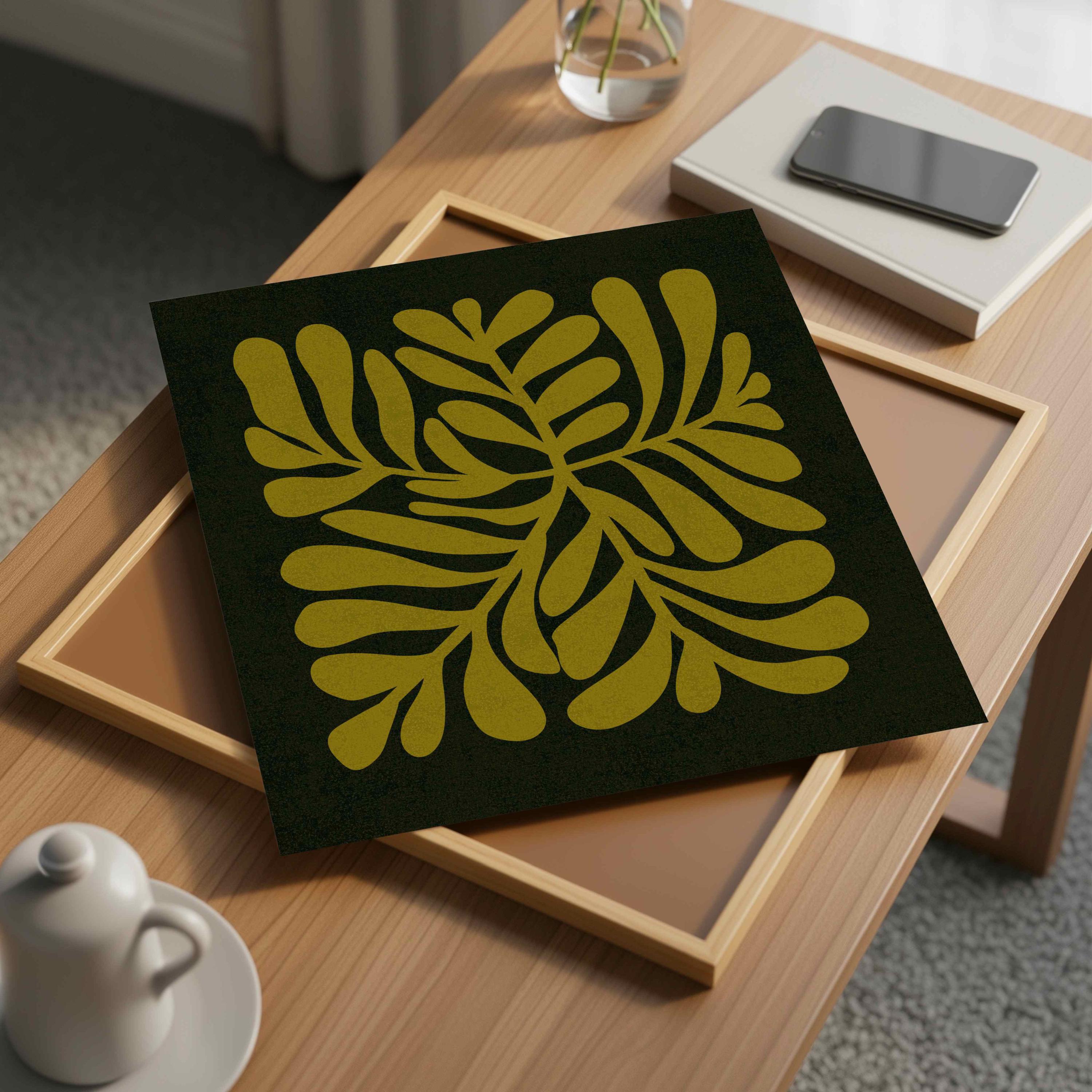 Abstract retro floral wall art set featuring groovy Matisse-inspired organic shapes in olive green, light beige, ochre and bold pink set on a deep black background. Perfect for vintage-inspired homes, eclectic gallery walls, boho interiors or mid century style decors.