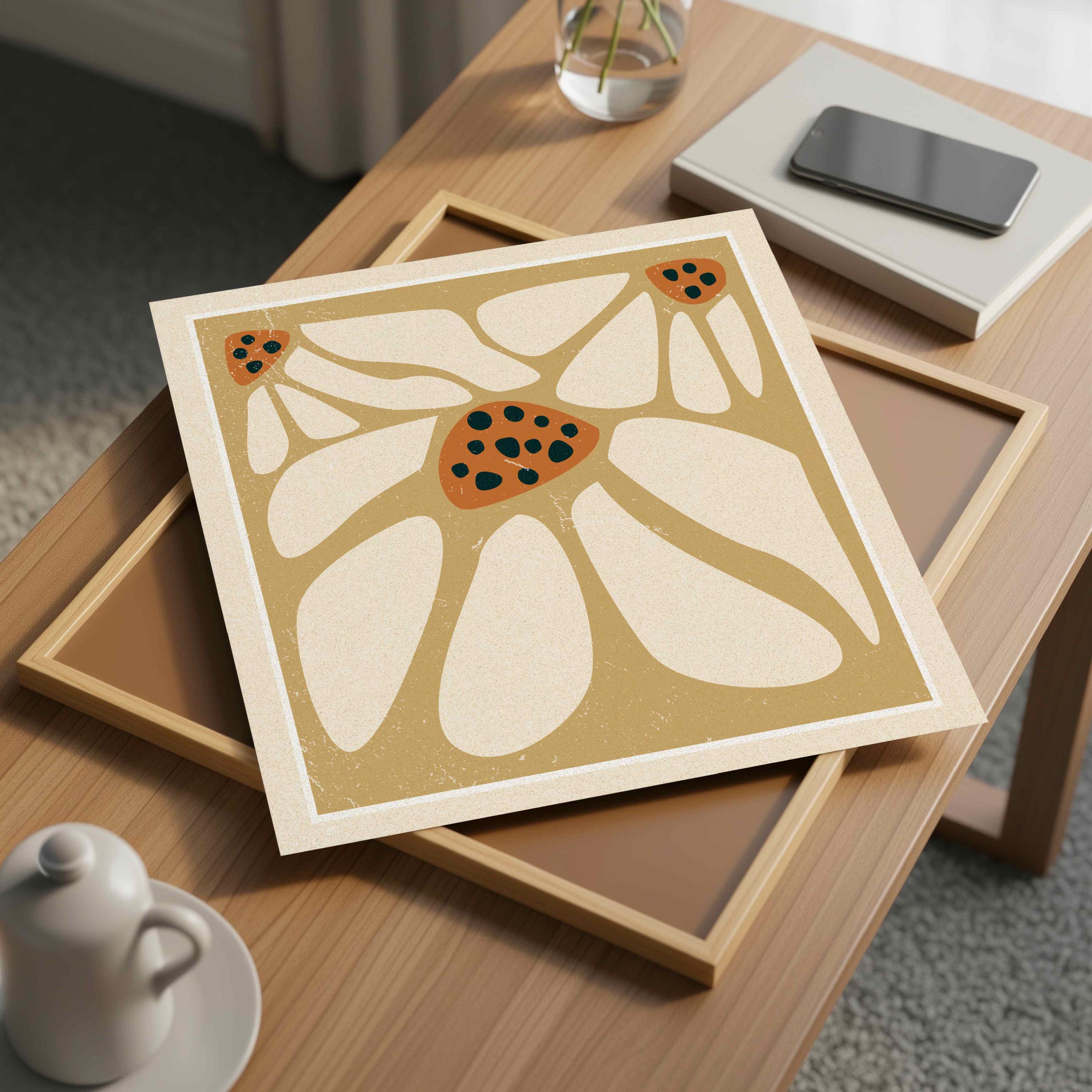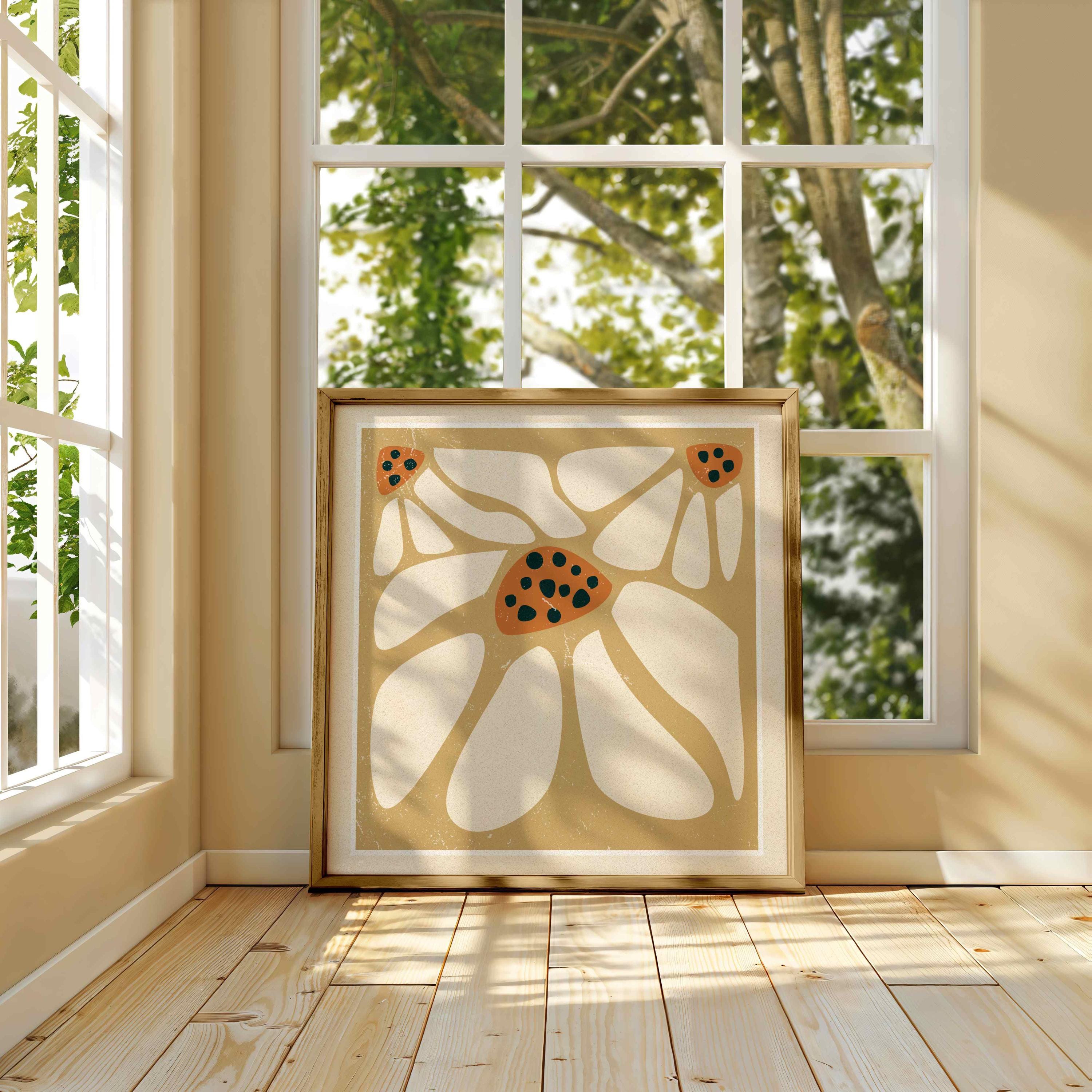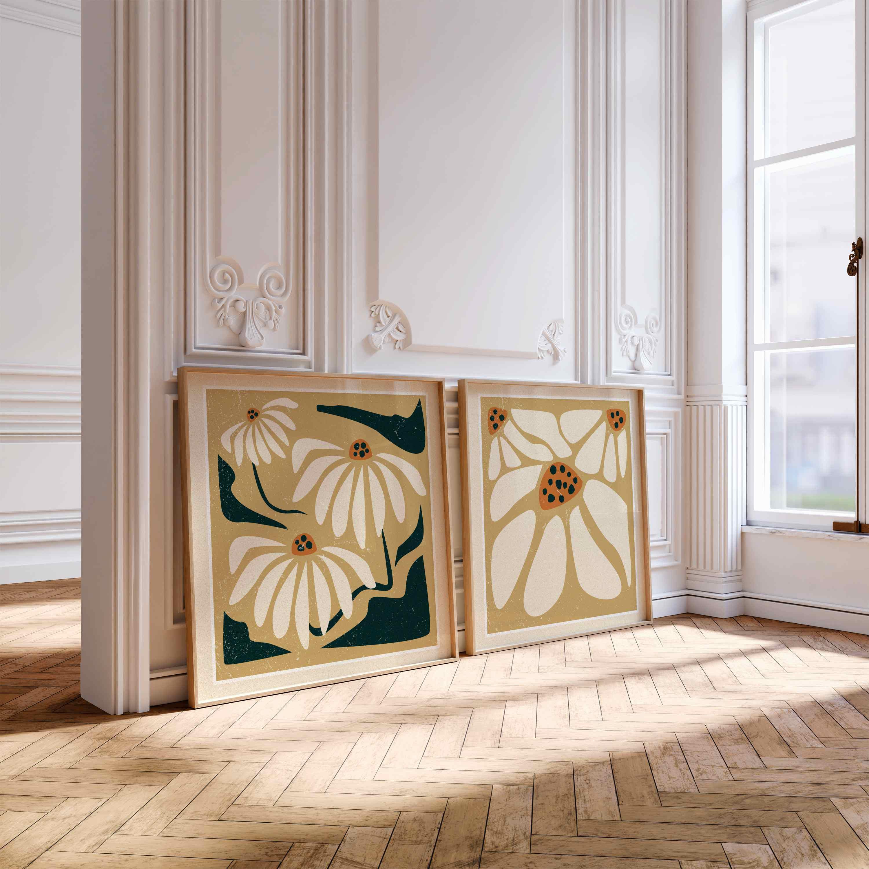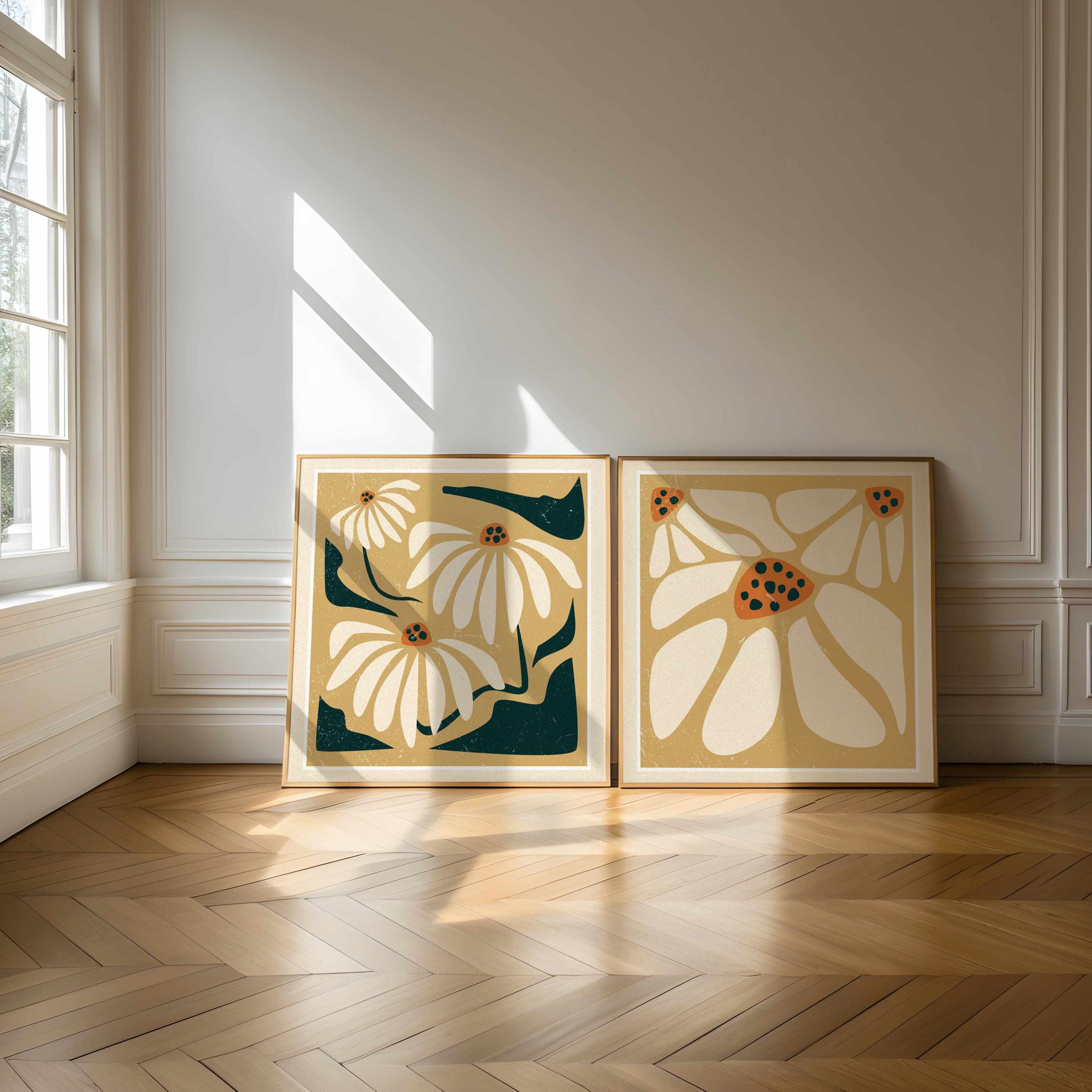Neutral retro floral wall art set of two square prints featuring abstract botanical forms in muted beige, warm orange and rich dark teal. Inspired by Matisse cutouts and 70s floral motifs, this set blends vintage style with modern minimalism. The square format makes them easy to pair or stack, and the gentle color palette works beautifully in boho, cozy, vintage-inspired or minimalist interiors.