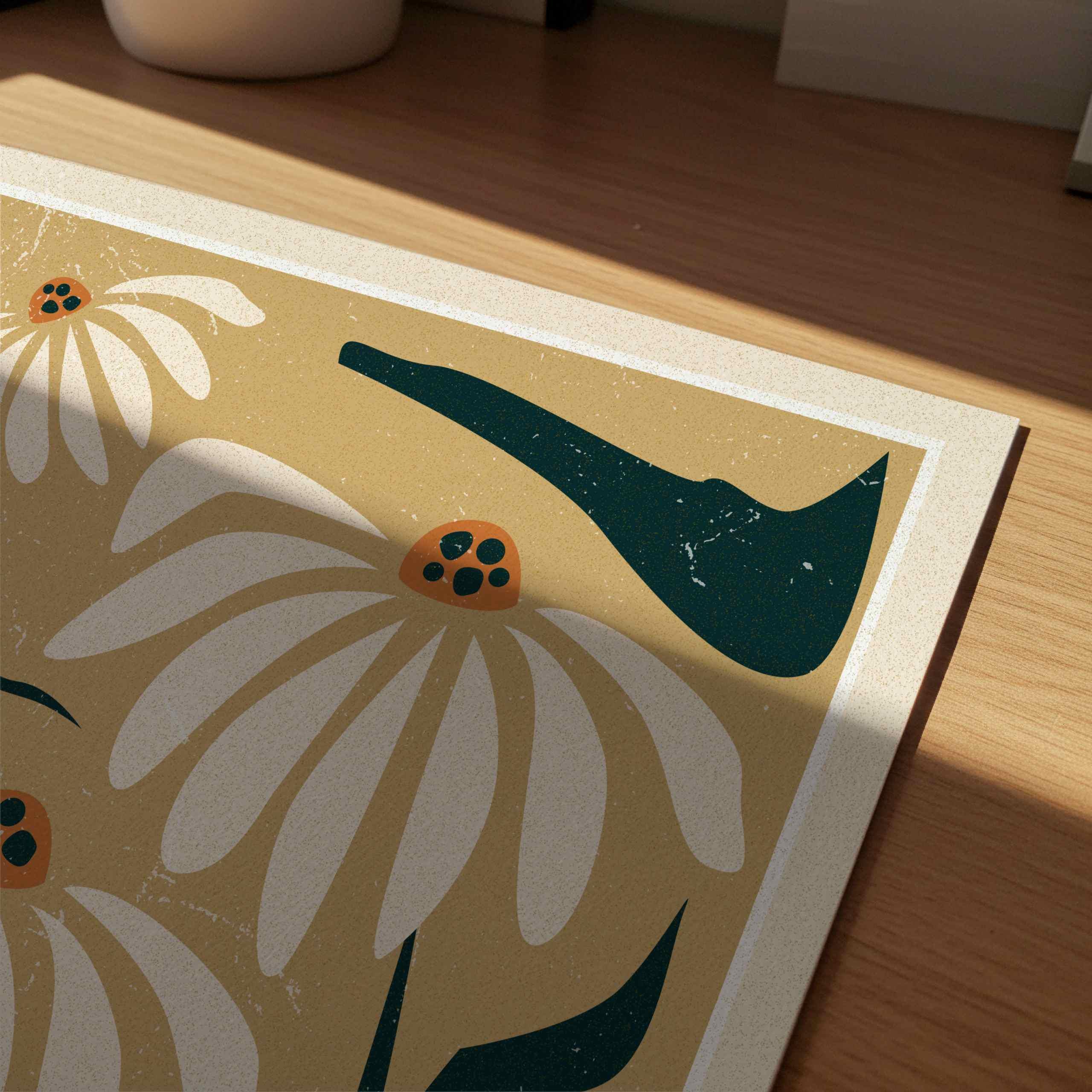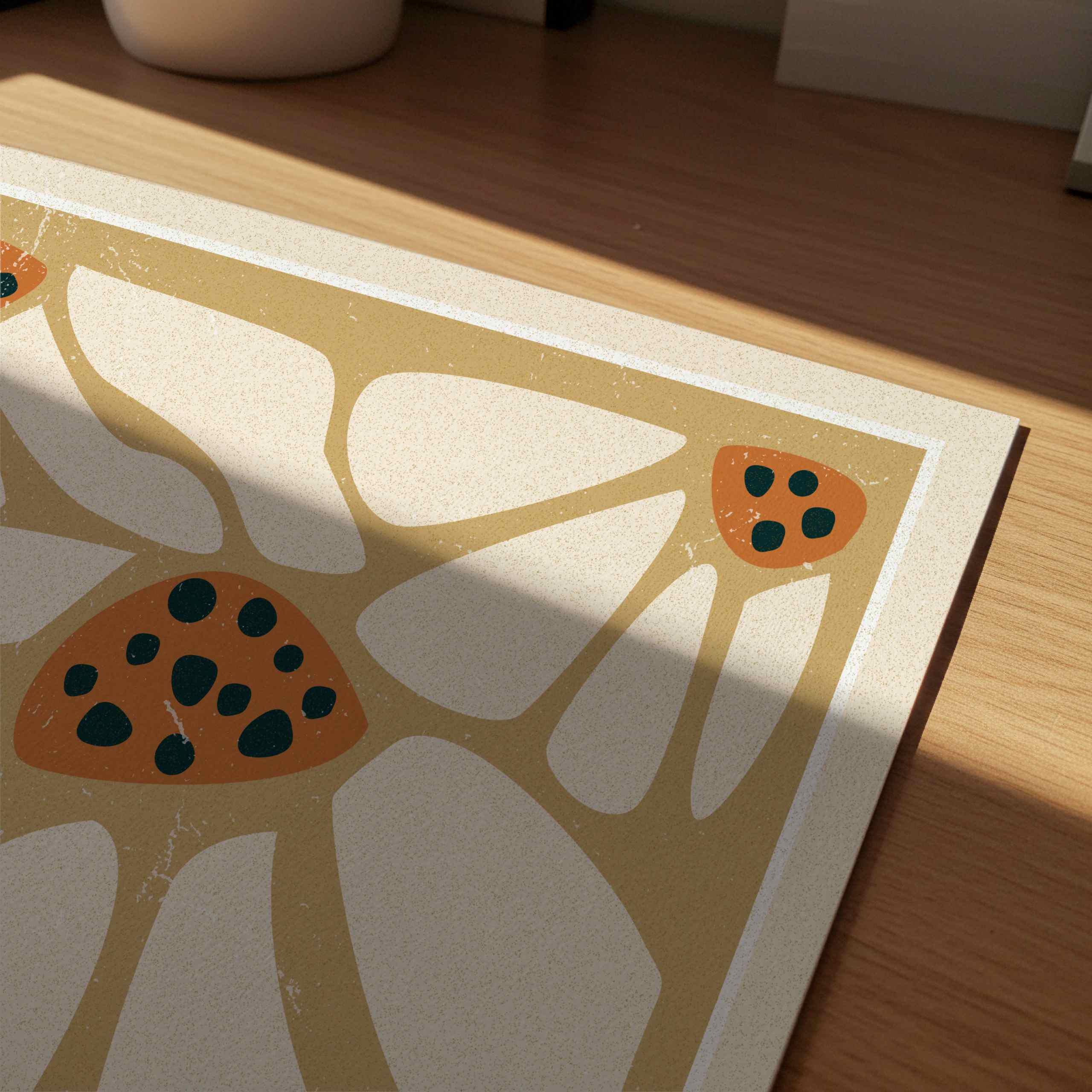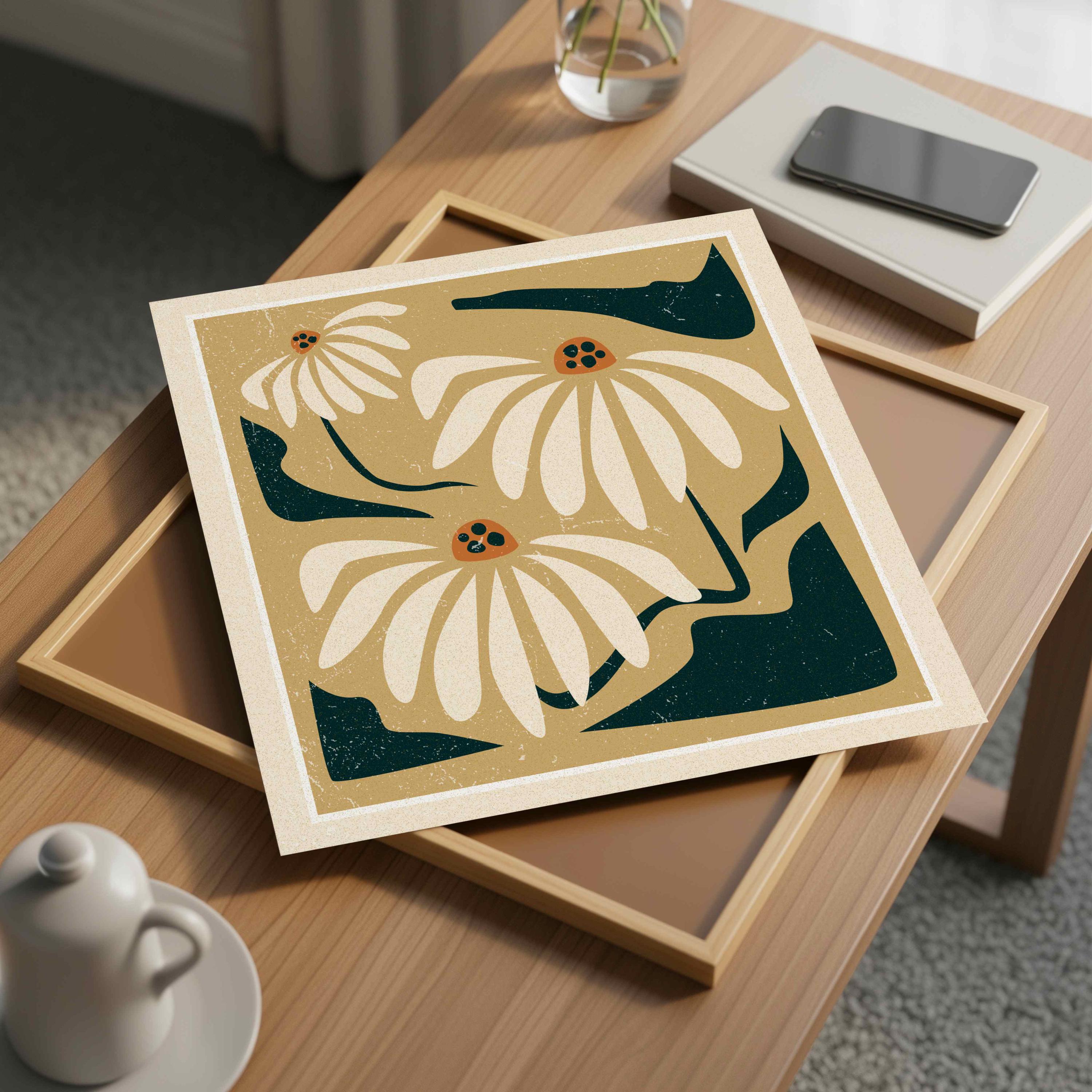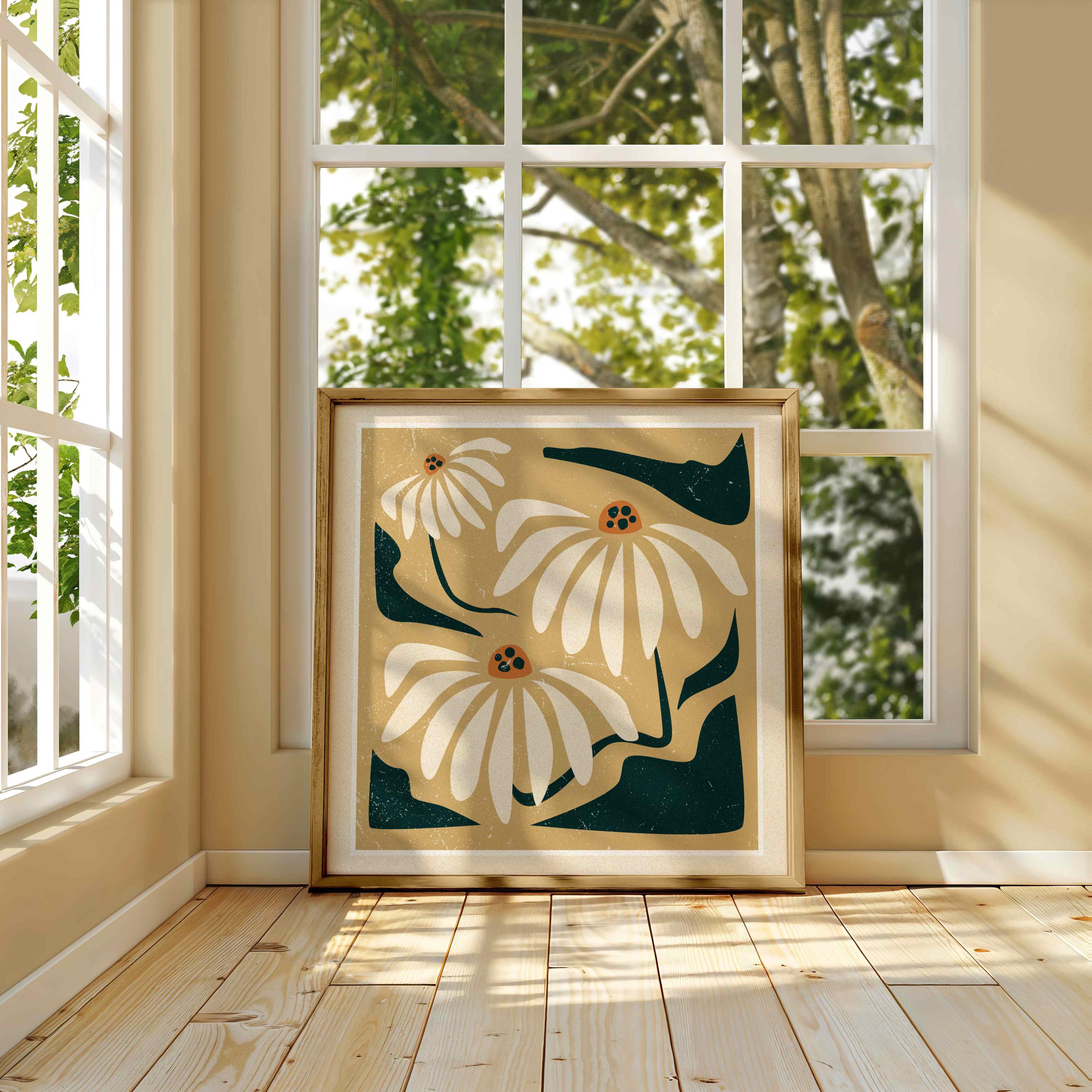Neutral retro floral wall art set of two square prints featuring abstract botanical forms in muted beige, warm orange and rich dark teal. Inspired by Matisse cutouts and 70s floral motifs, this set blends vintage style with modern minimalism. The square format makes them easy to pair or stack, and the gentle color palette works beautifully in boho, cozy, vintage-inspired or minimalist interiors.