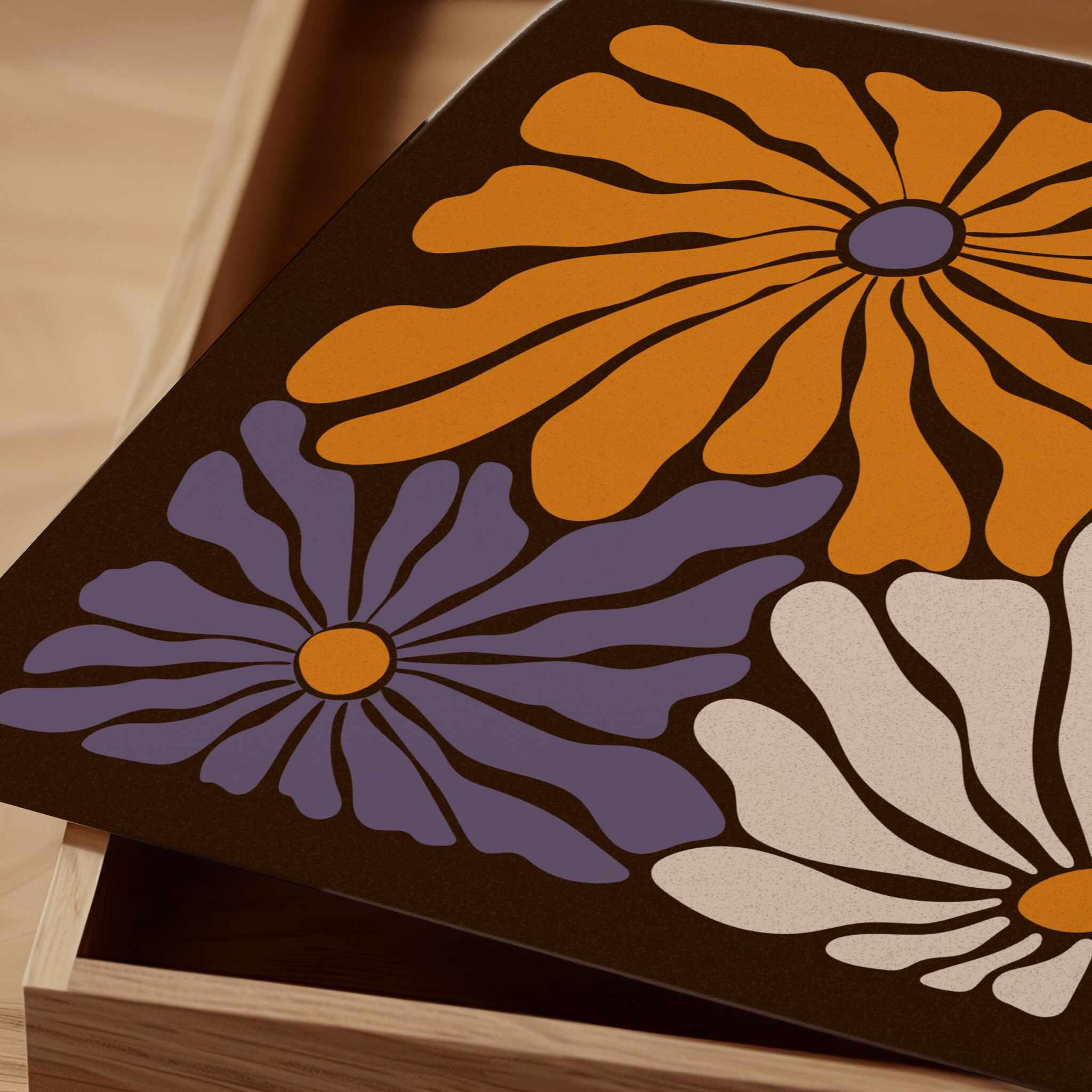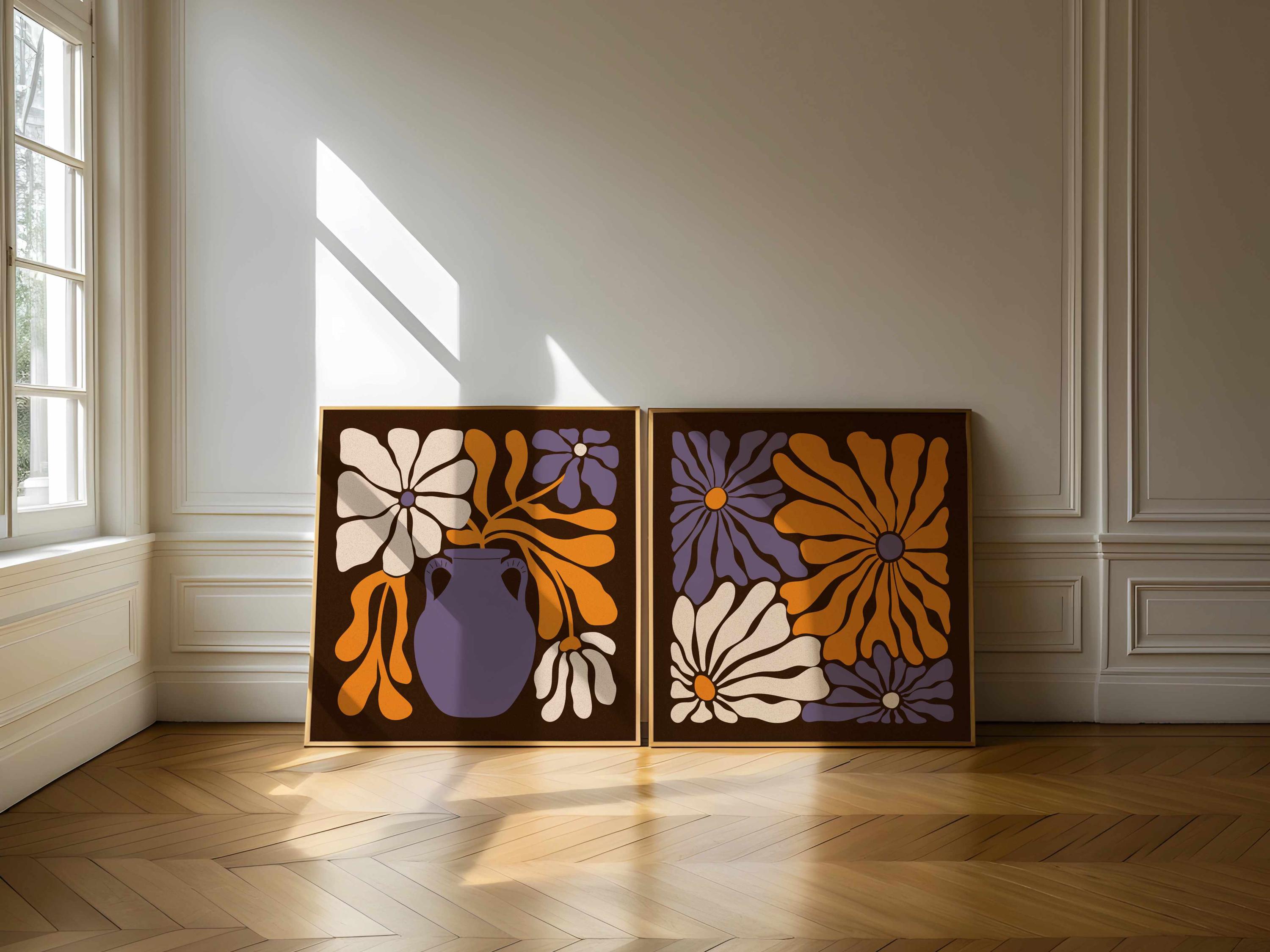 Groovy 60s-70s inspired retro botanical set with abstract flowers and vibrant colors. Perfect for enhancing up any boho, mid century or vintage style space, be it your living room, bedroom, office, nursery or anywhere else. This set also makes a thoughtful and unique gift for your friend for a special event like Christmas, birthday, or housewarming.