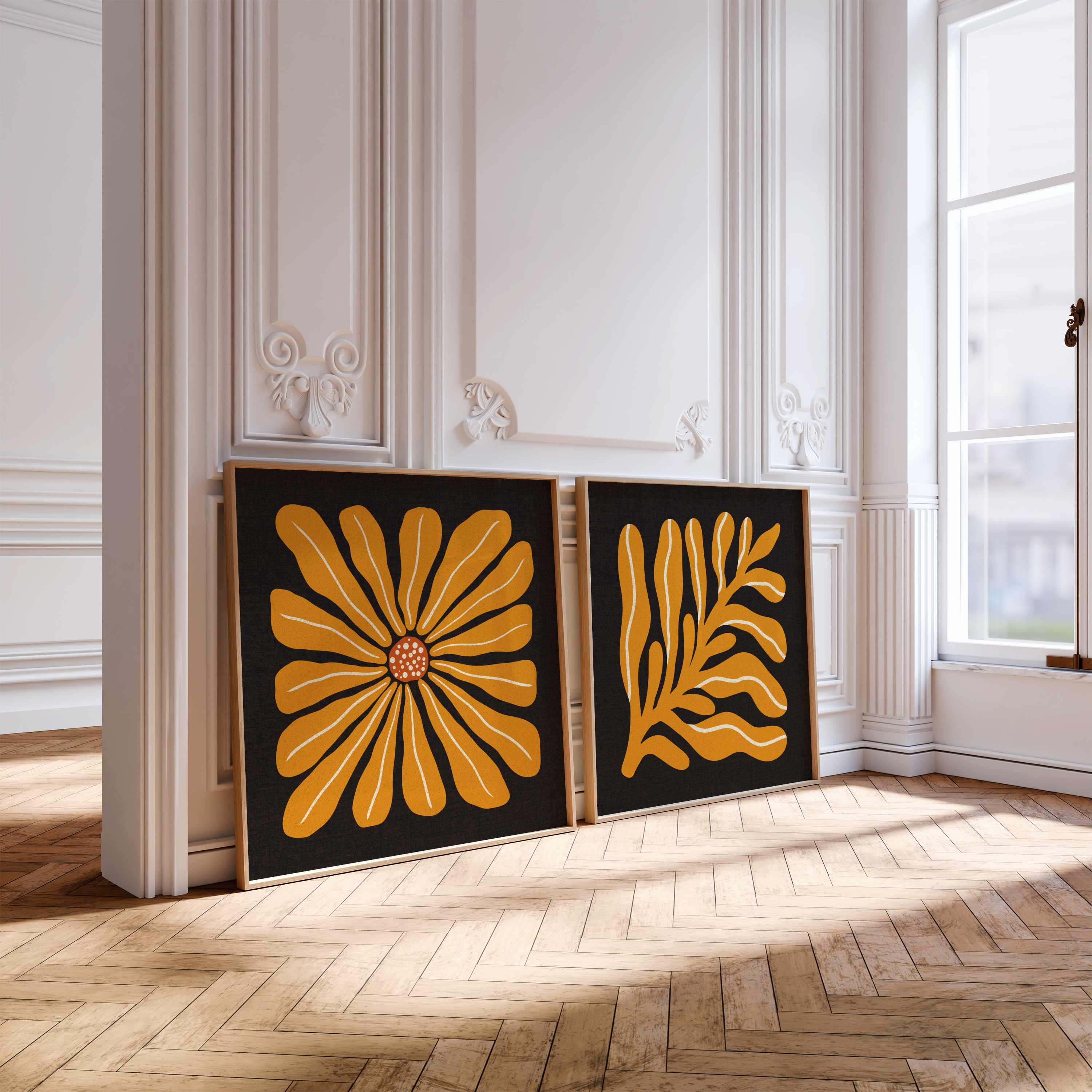 Retro two piece floral print set with abstract flowers and moody, atmospheric colors. This square duo is perfect for enhancing up any modern boho, mid century or vintage style space, be it your living room, bedroom, office, nursery or anywhere else.