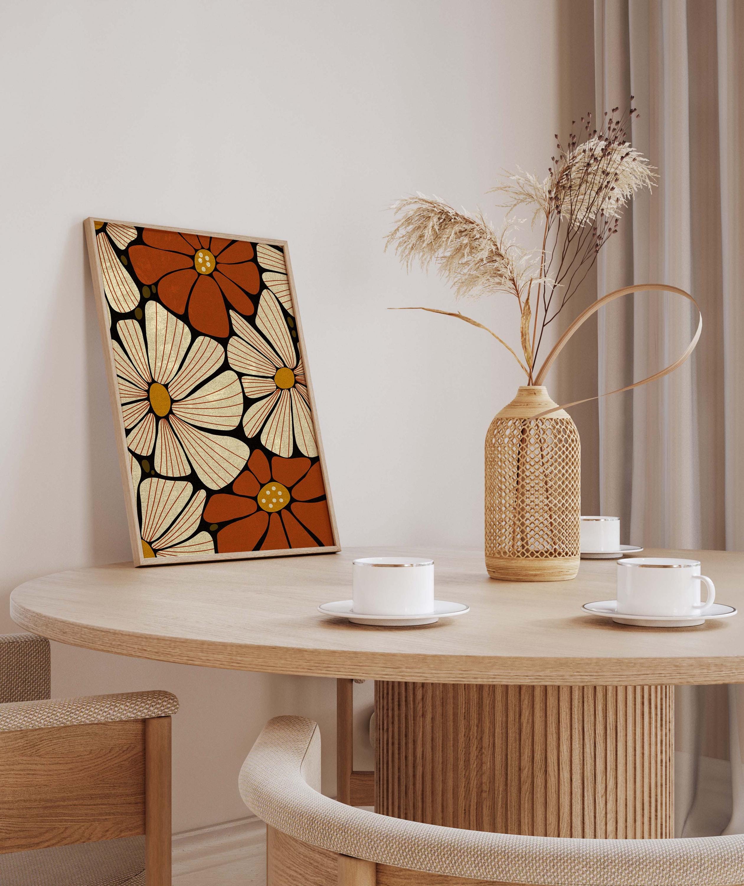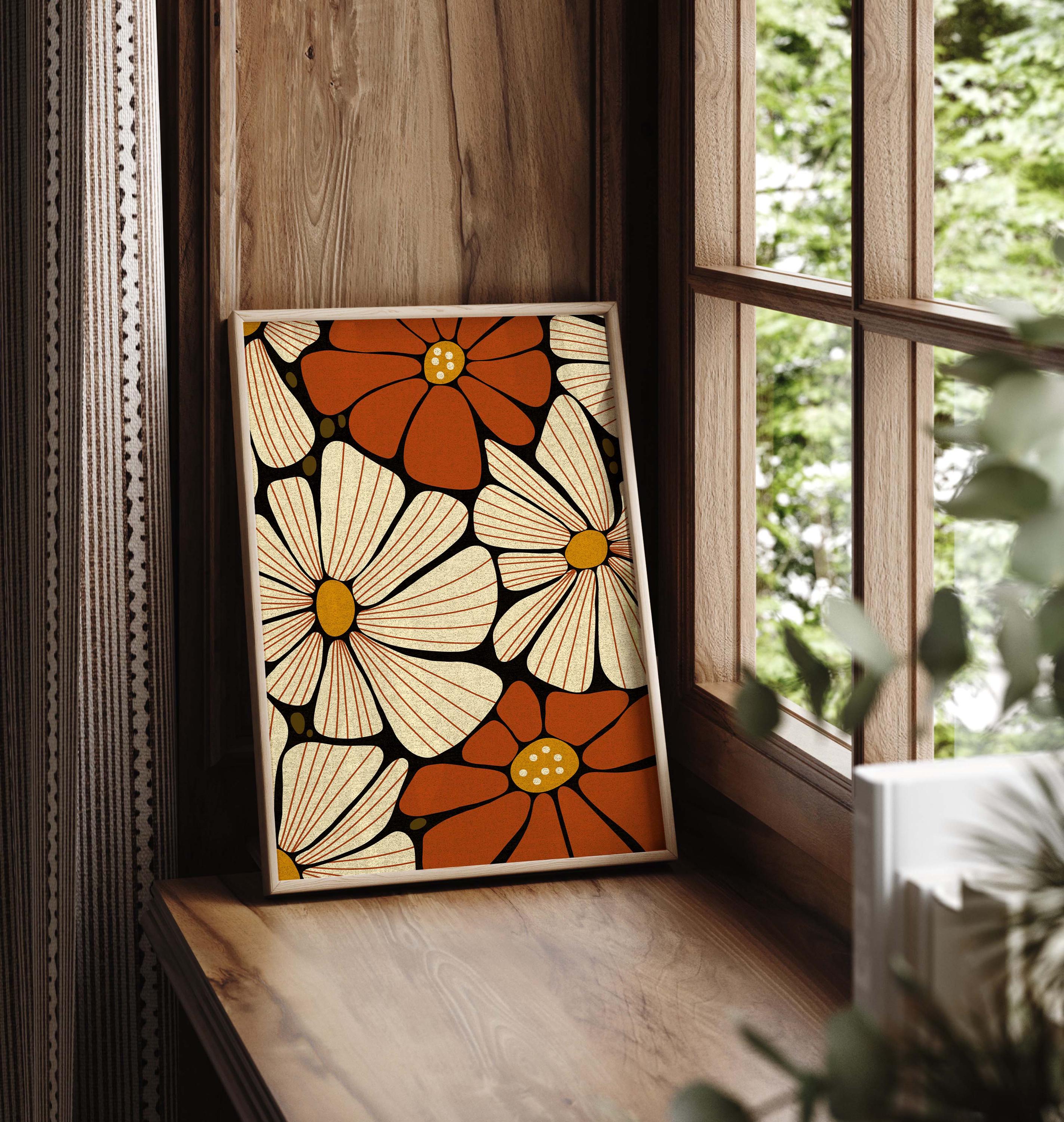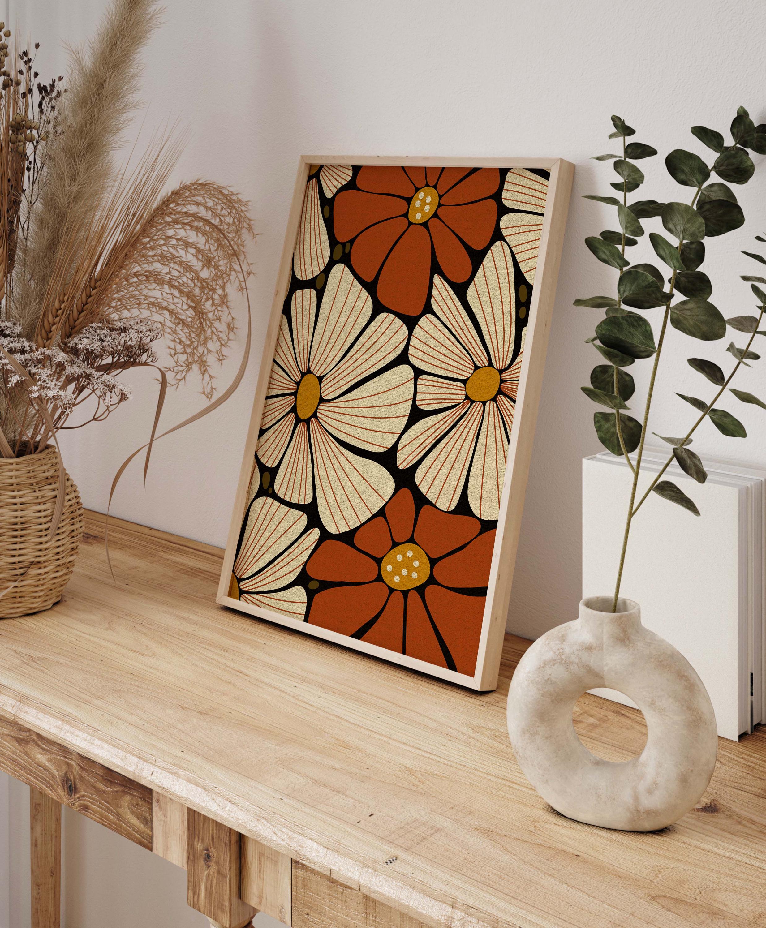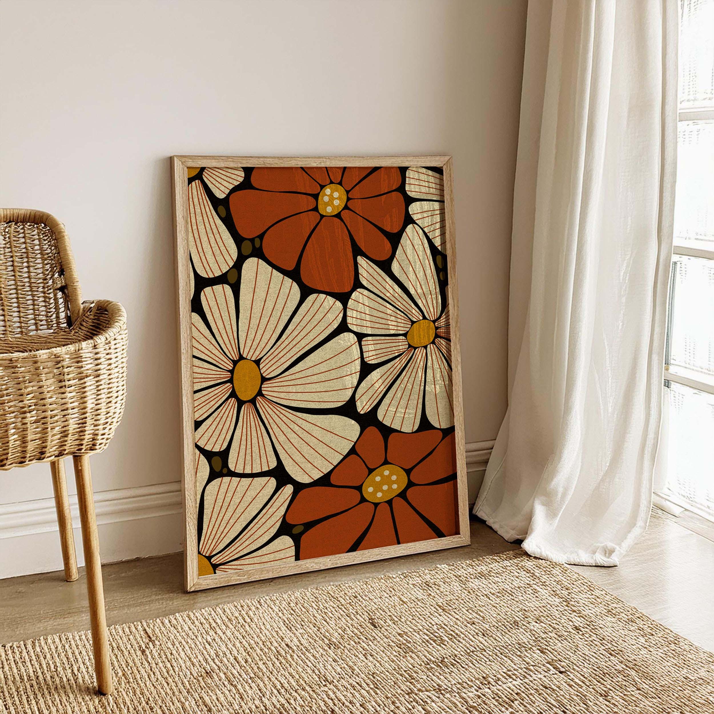 Retro floral wall art featuring 70s inspired flowers in burnt orange, cream and mustard. This retro botanical artwork blends flower power with modern simplicity — ideal for lovers of vintage decor, boho color, and mid century design.