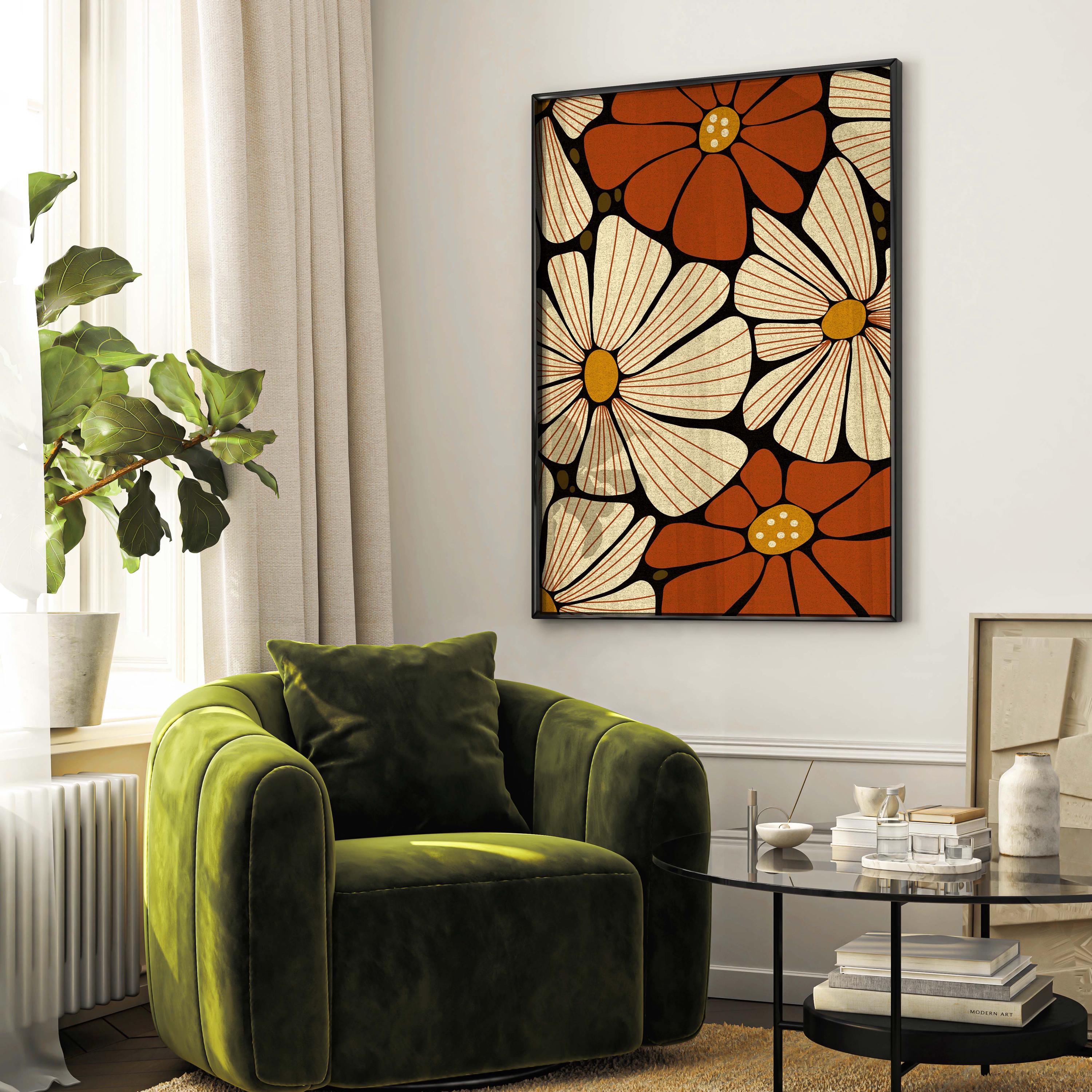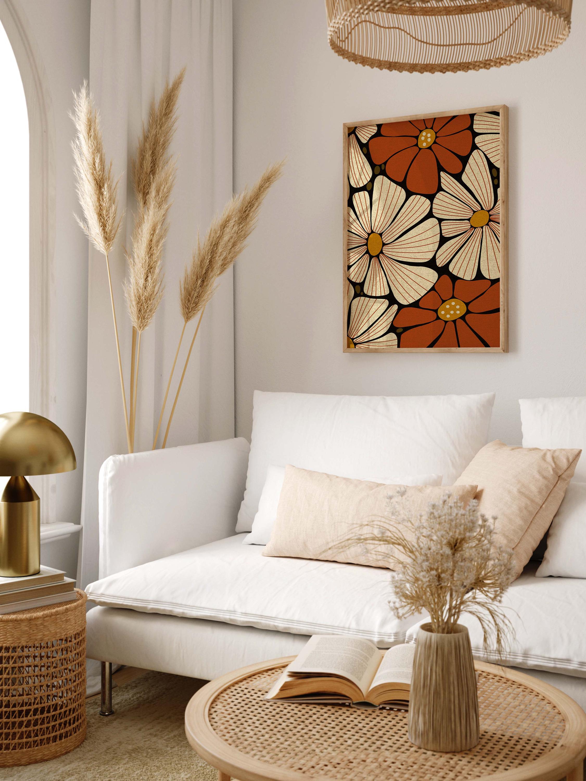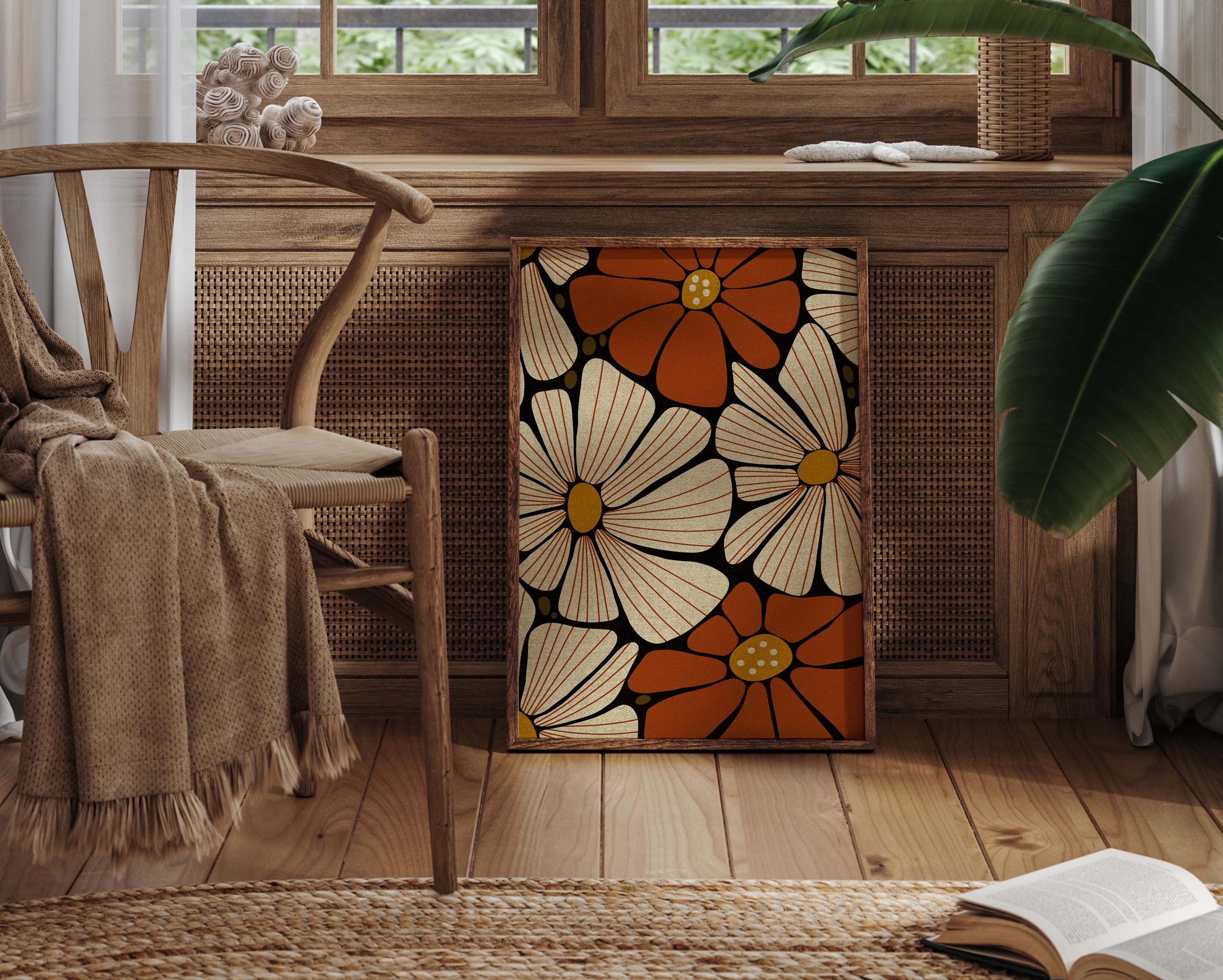 Retro floral wall art featuring 70s inspired flowers in burnt orange, cream and mustard. This retro botanical artwork blends flower power with modern simplicity — ideal for lovers of vintage decor, boho color, and mid century design.
