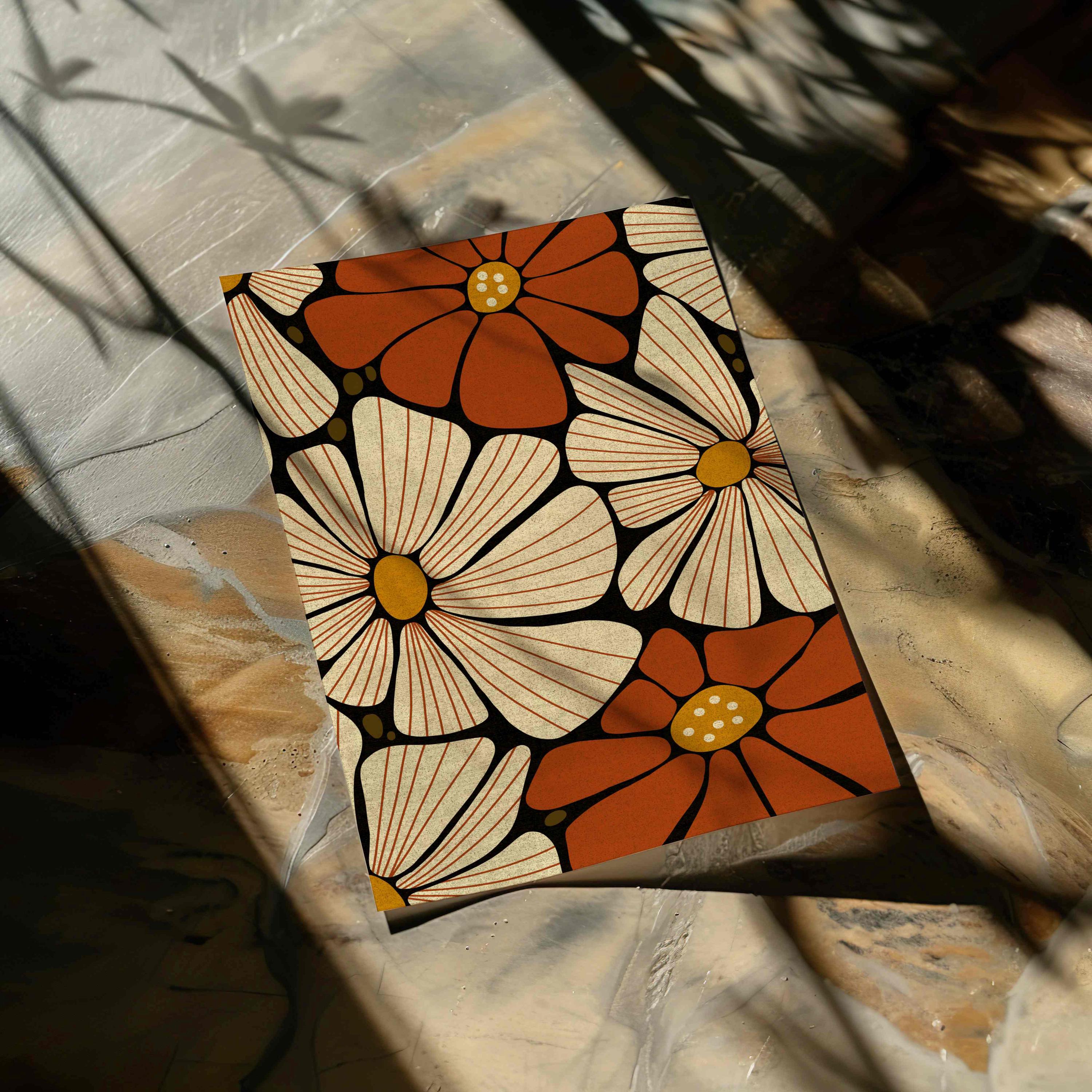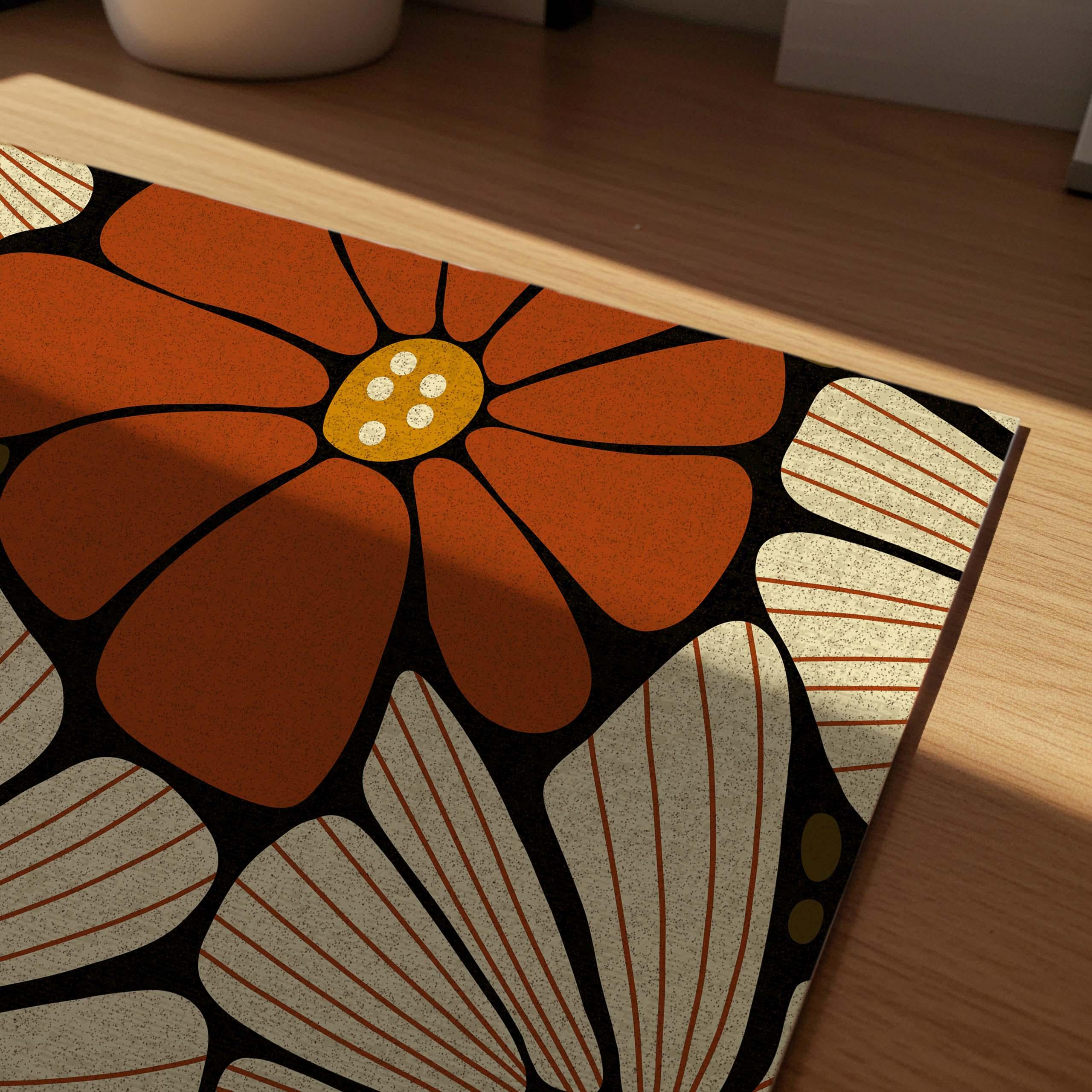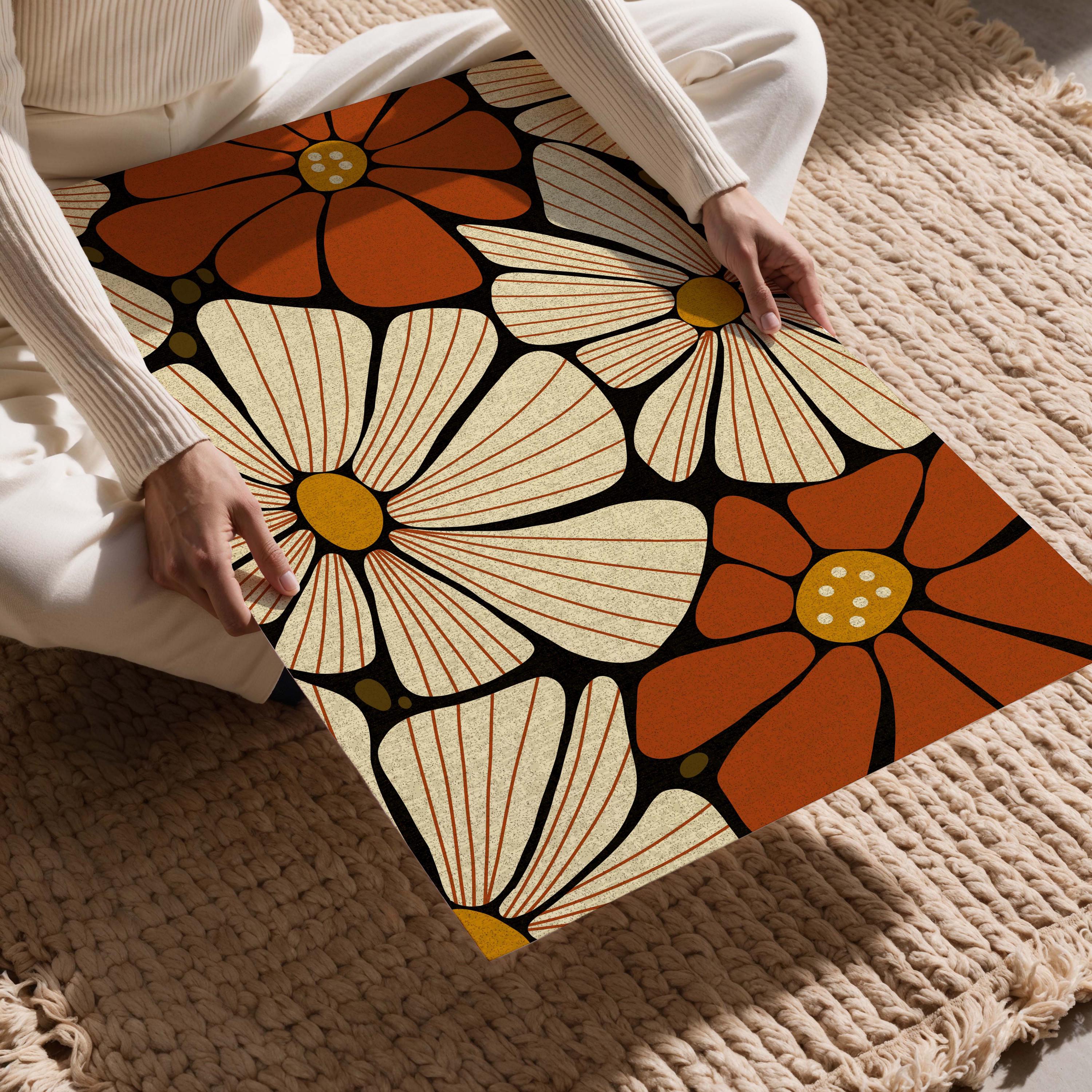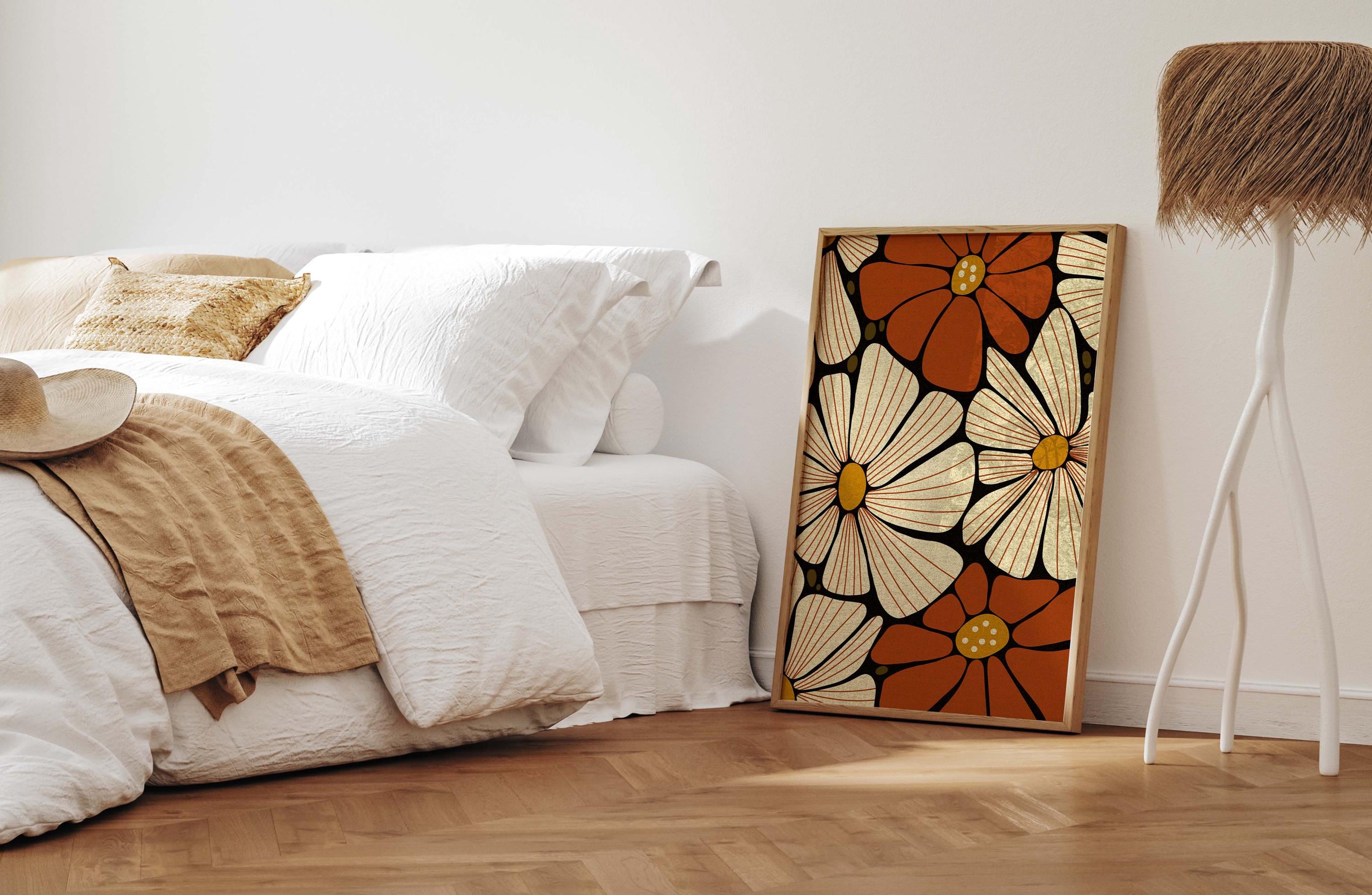 Retro floral wall art featuring 70s inspired flowers in burnt orange, cream and mustard. This retro botanical artwork blends flower power with modern simplicity — ideal for lovers of vintage decor, boho color, and mid century design.