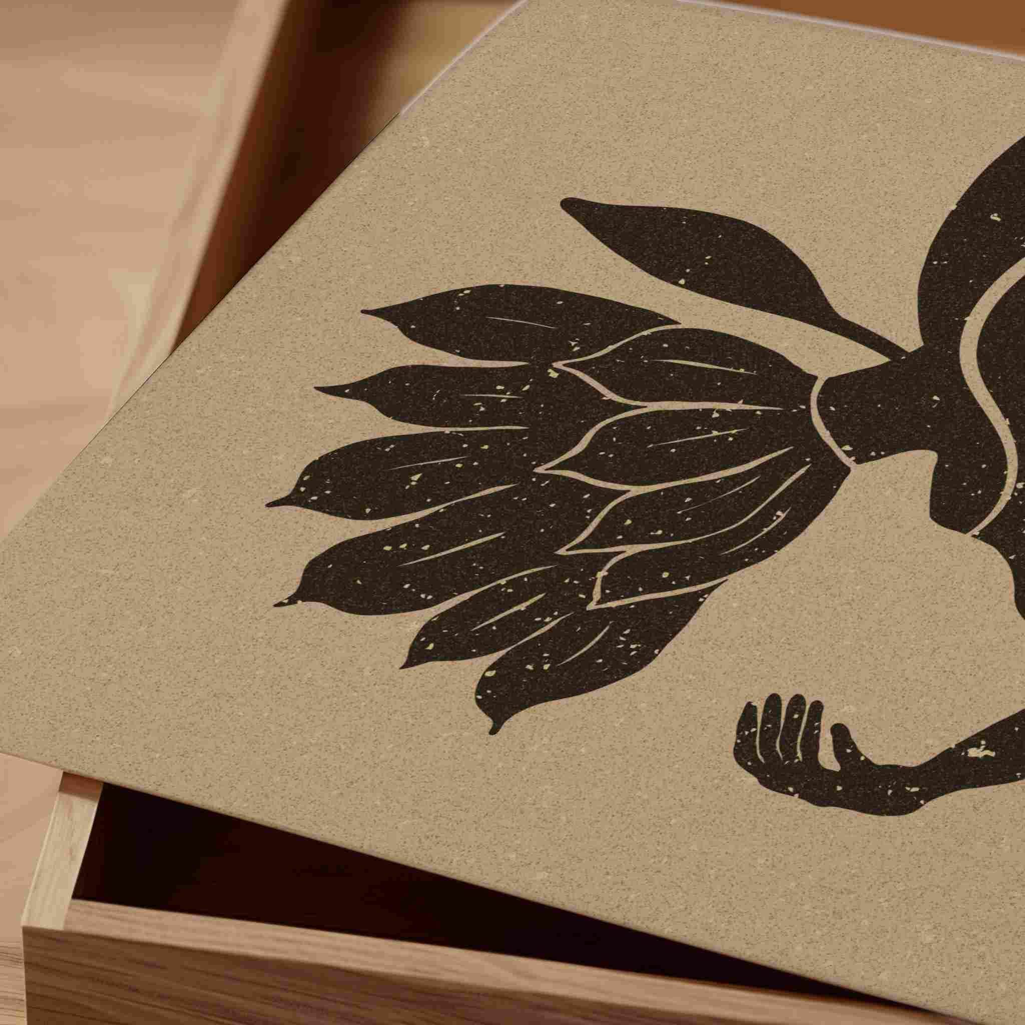 Mid century abstract art set featuring two complementary prints in a warm neutral and earthy palette. The clean lines and abstract organic shapes are hallmarks of mid century modern design and blend effortlessly with boho, eclectic, or contemporary interiors. One print showcases an abstract, figurative woman, while the other displays bold, minimalist flowers set in a vase in linocut style.