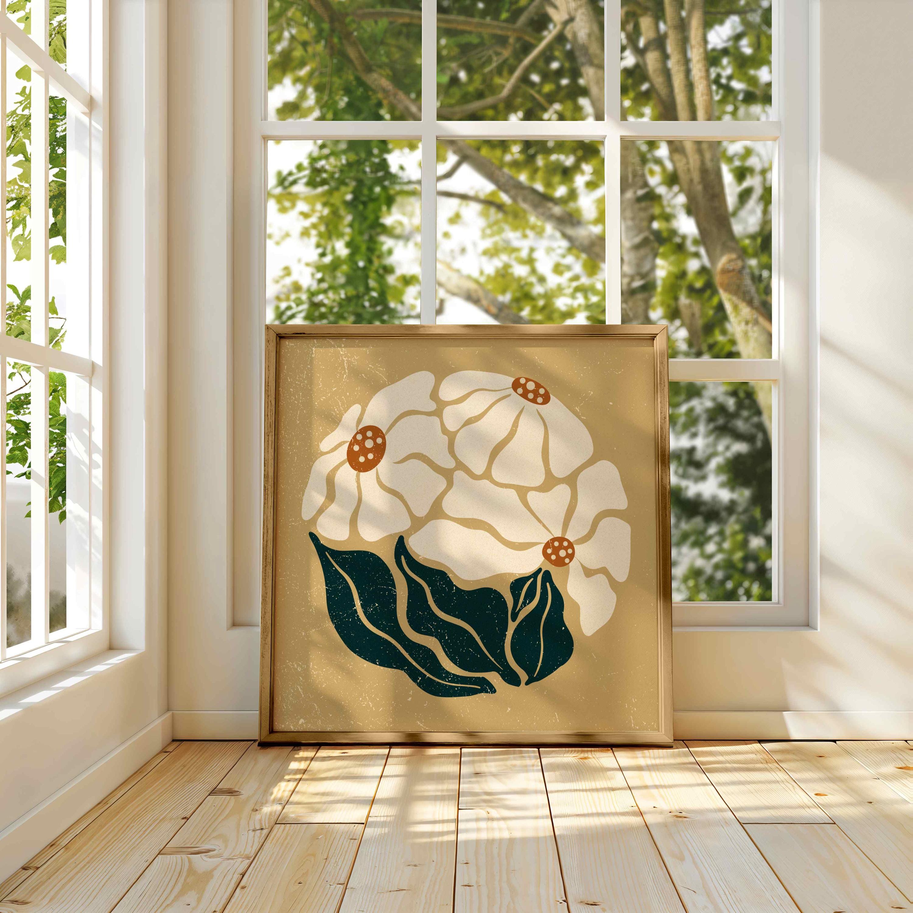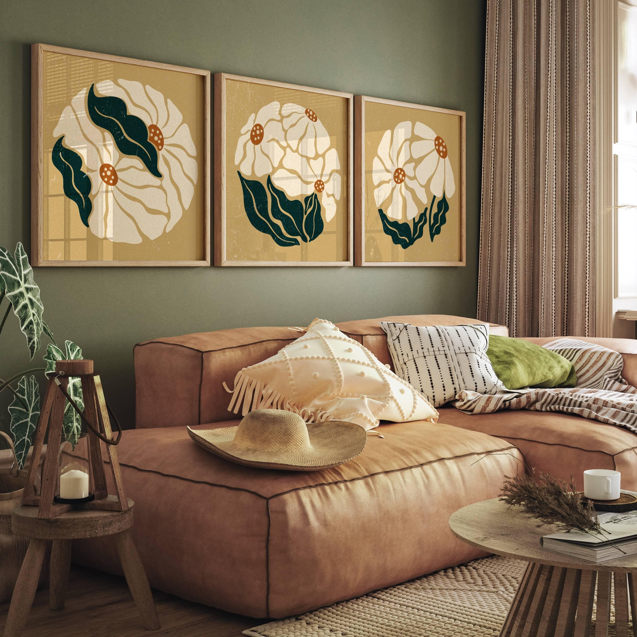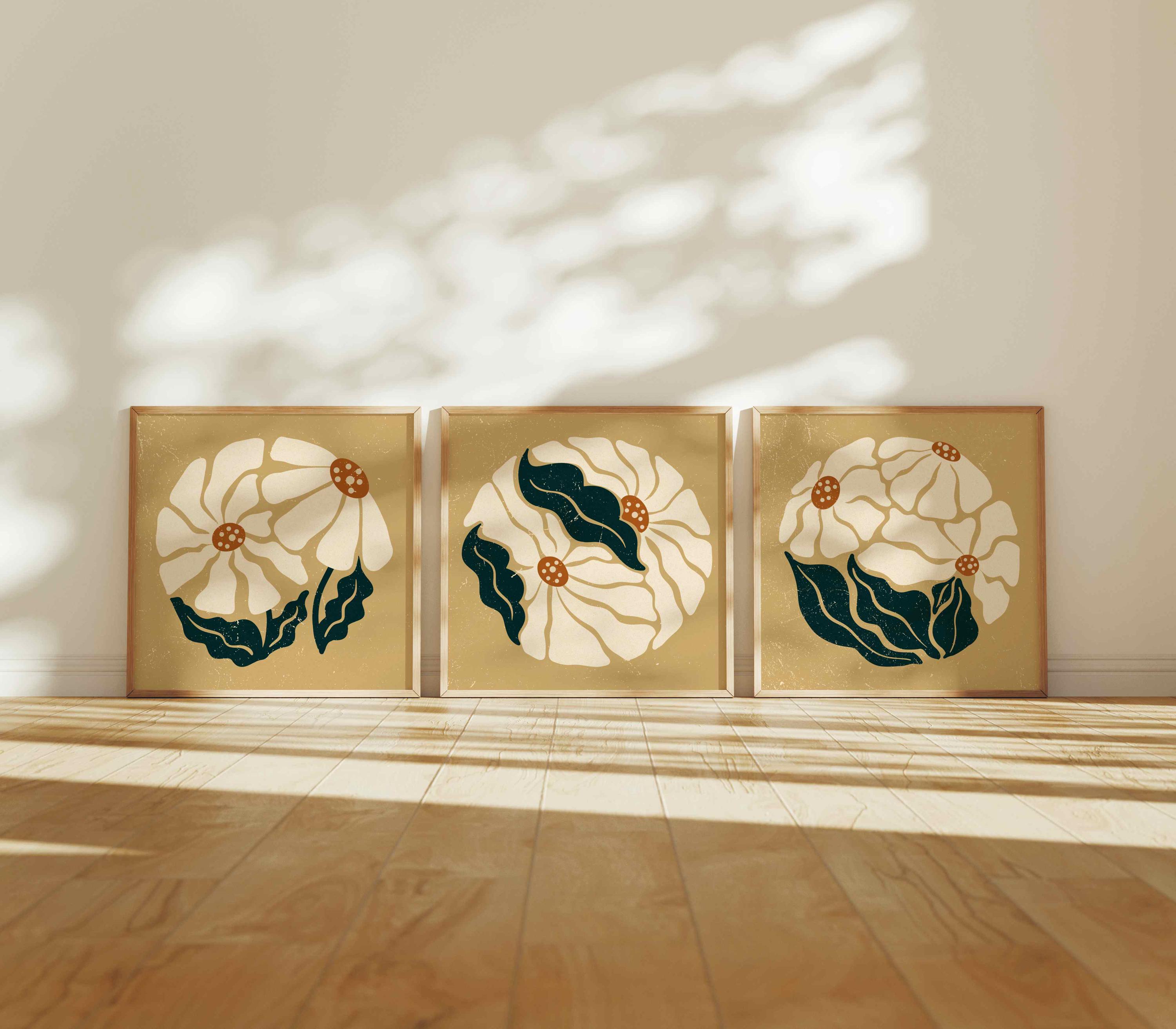 Retro floral wall art set inspired by abstract Matisse botanical shapes and groovy 70s design. This aesthetic square trio features soft cream blooms, rich orange pistils and dark teal leaves layered over a neutral beige background. Perfect for boho, eclectic, vintage-inspired or mid century modern interiors.