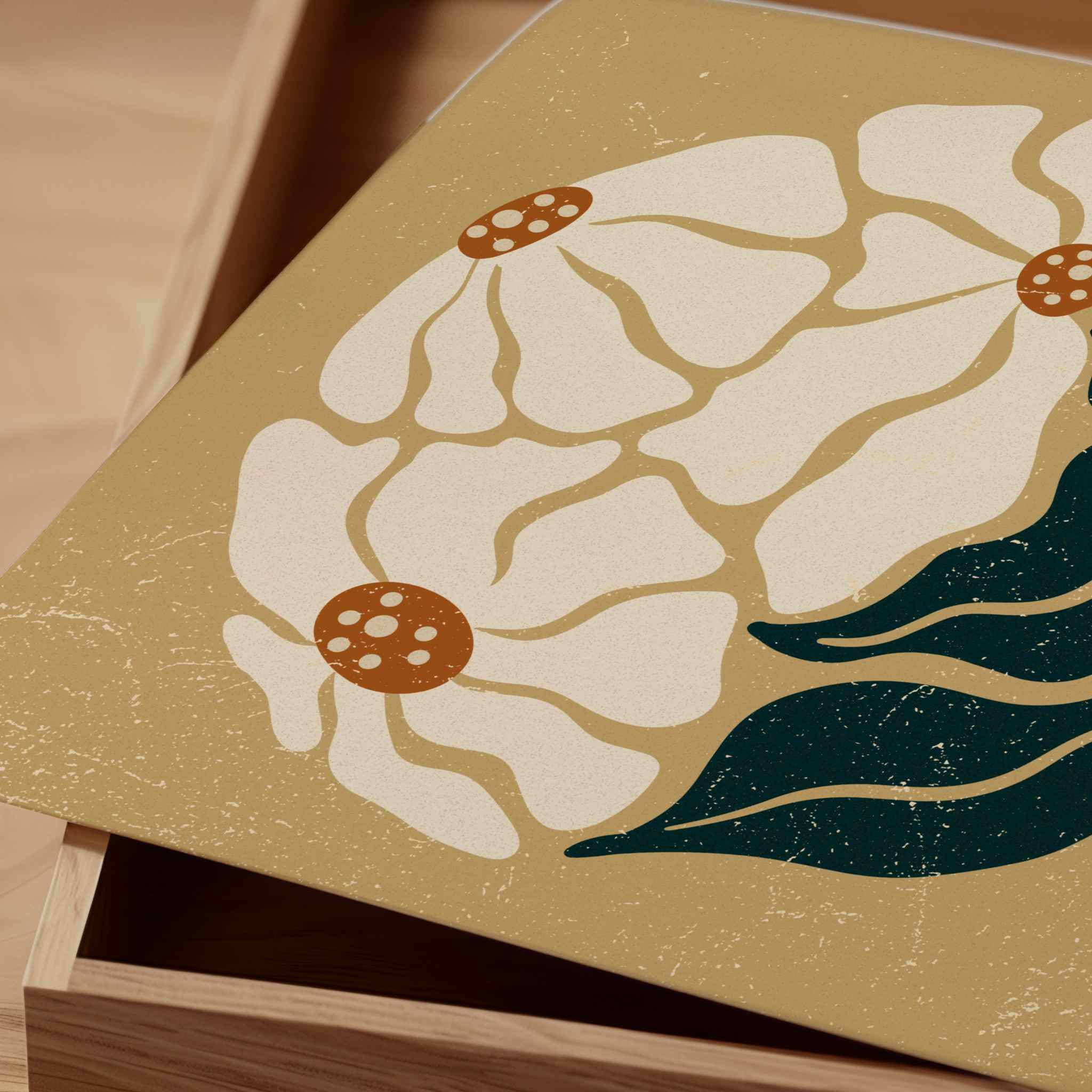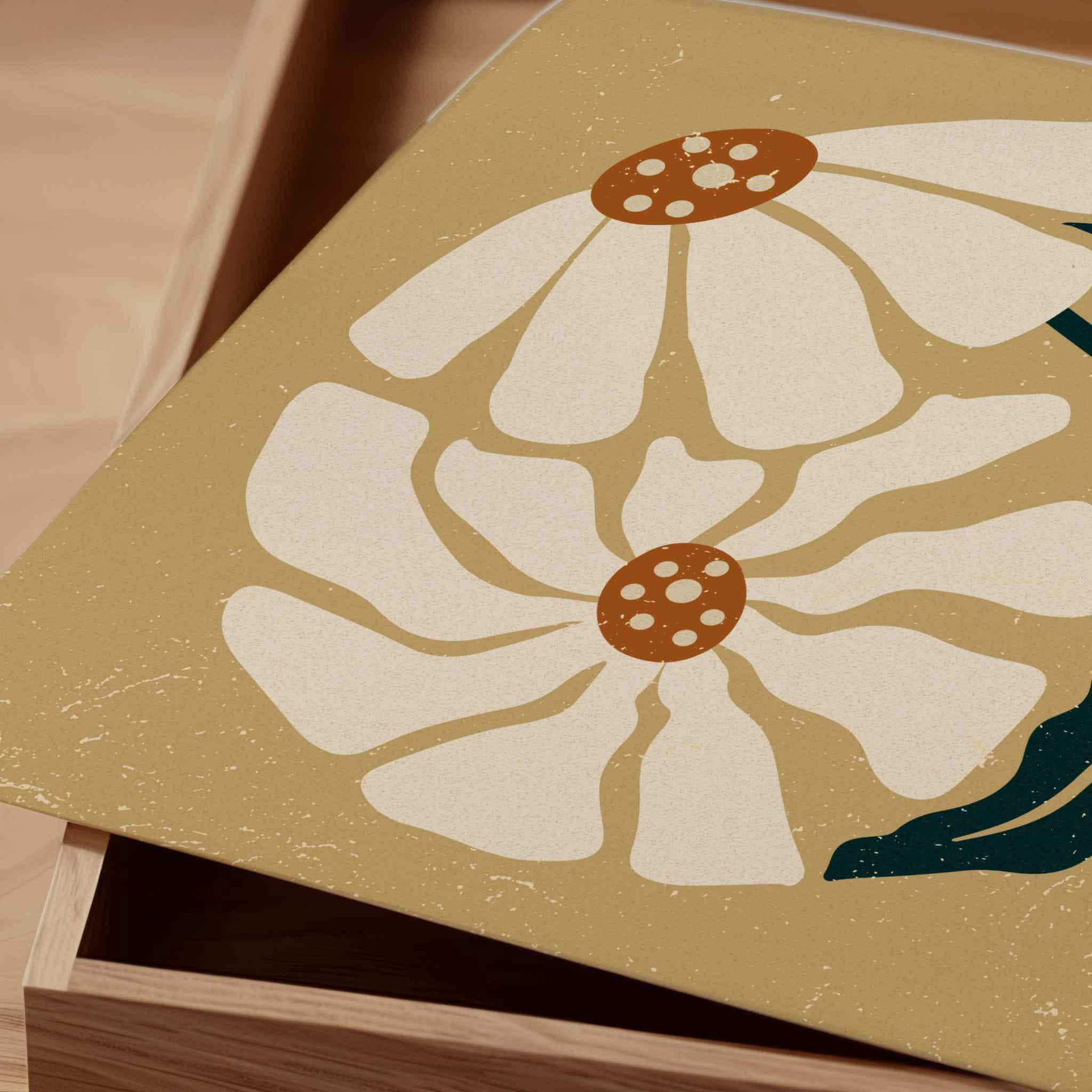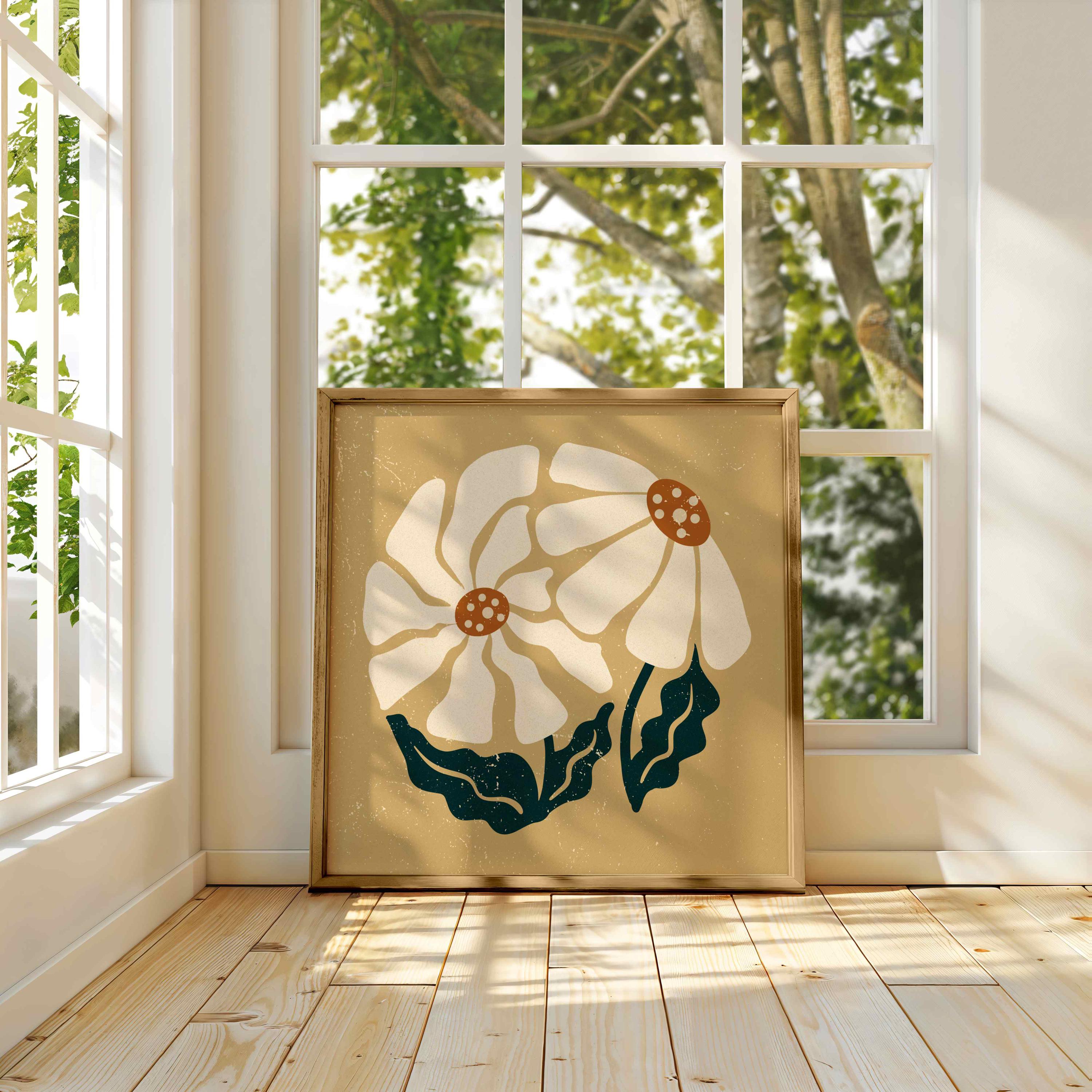 Retro floral wall art set inspired by abstract Matisse botanical shapes and groovy 70s design. This aesthetic square trio features soft cream blooms, rich orange pistils and dark teal leaves layered over a neutral beige background. Perfect for boho, eclectic, vintage-inspired or mid century modern interiors.