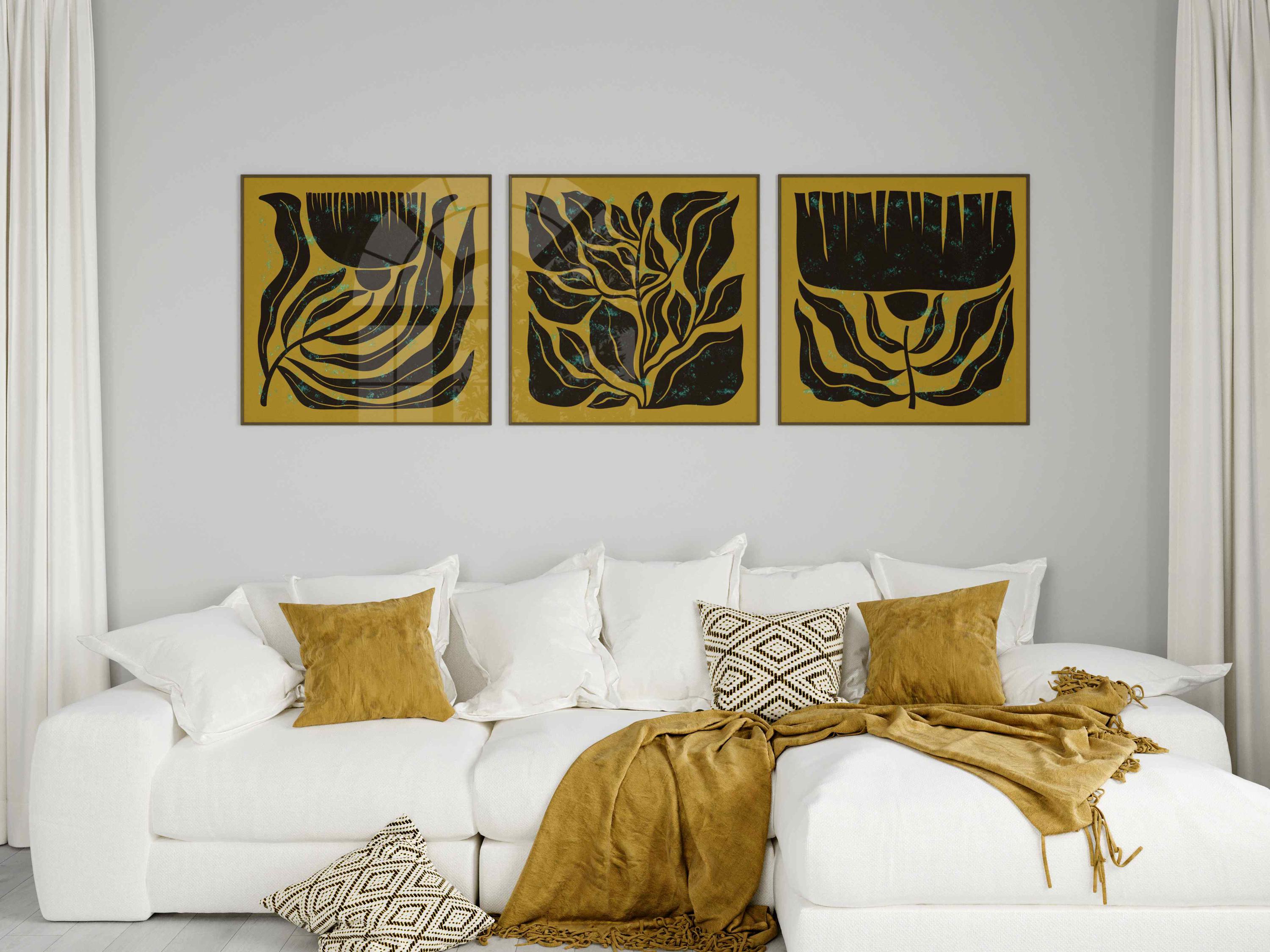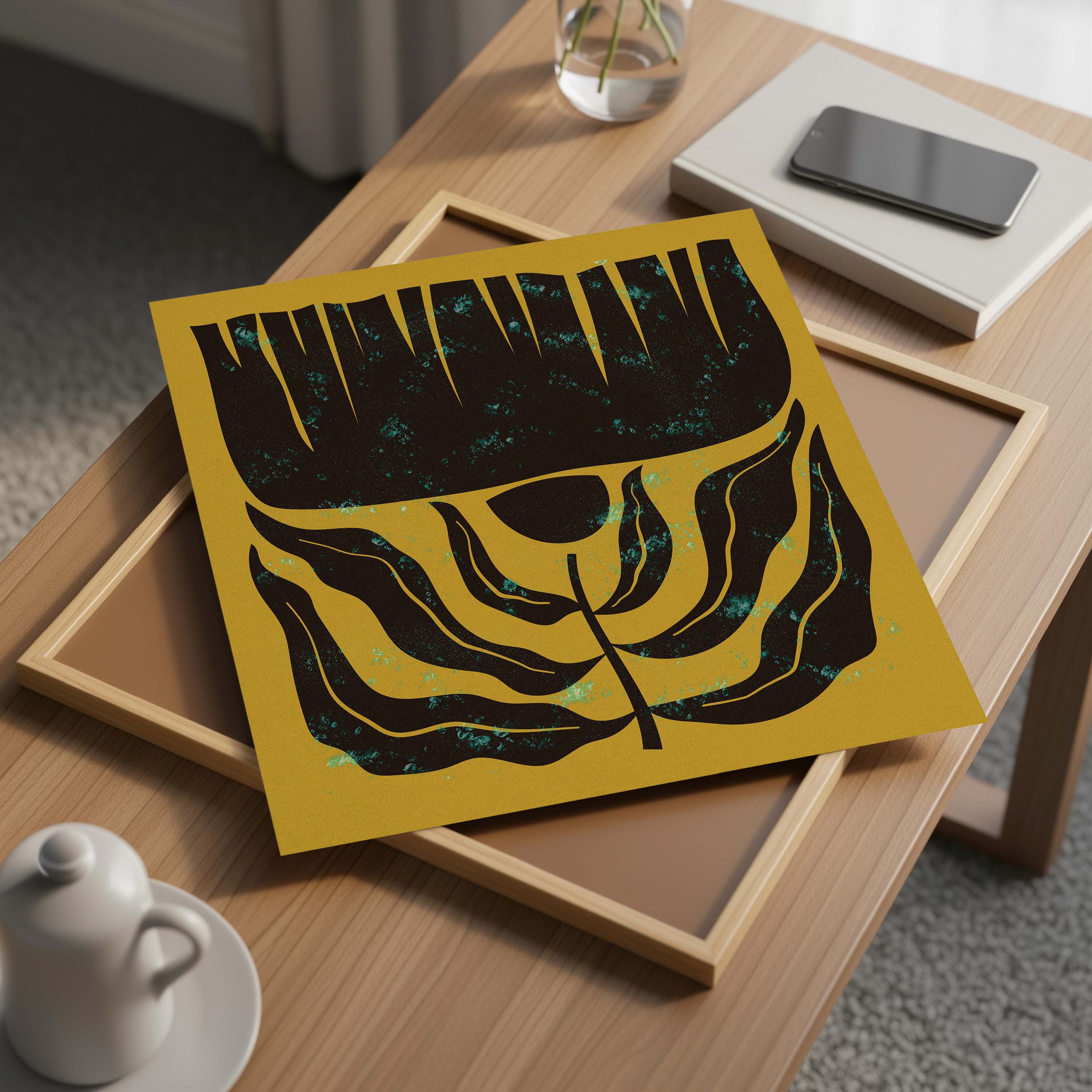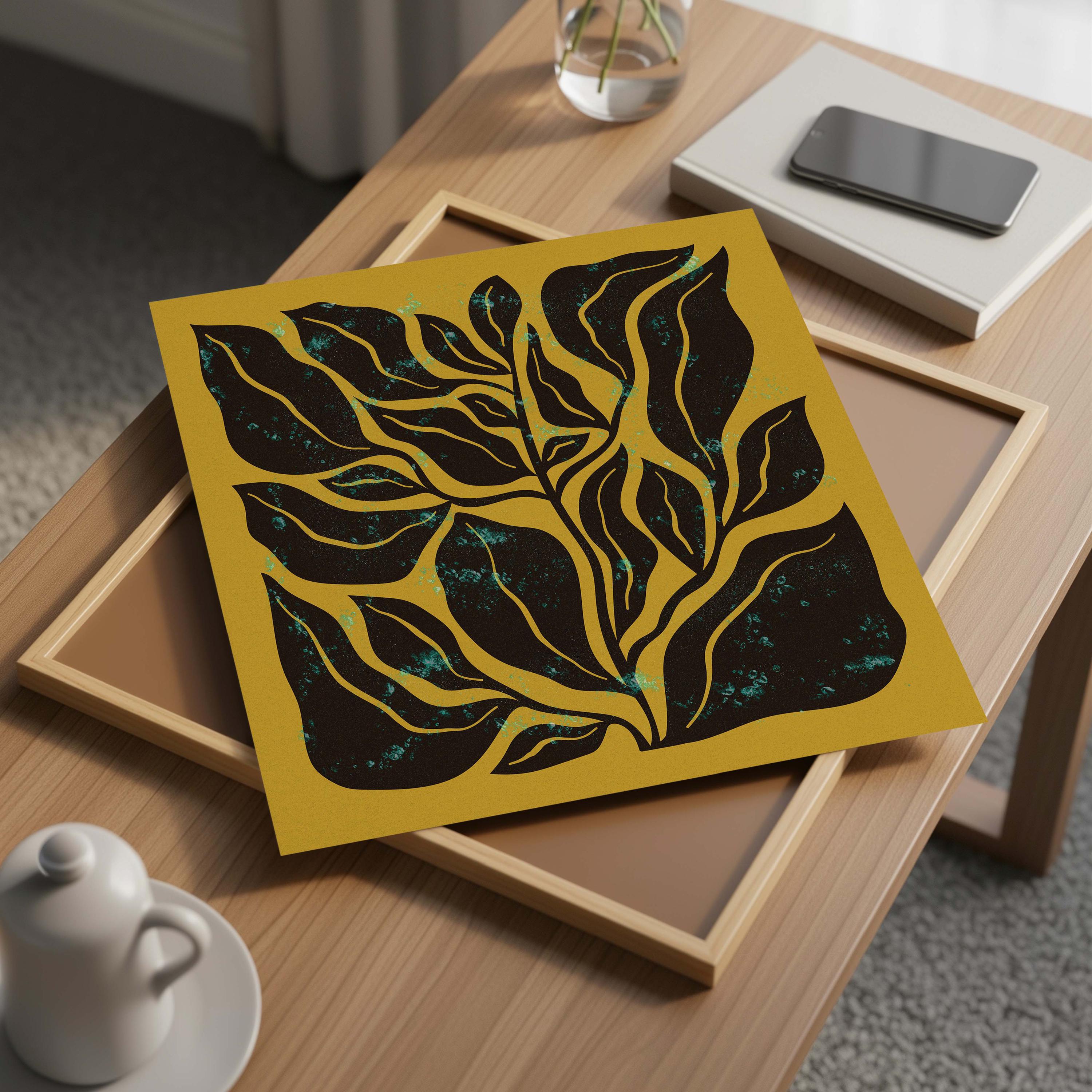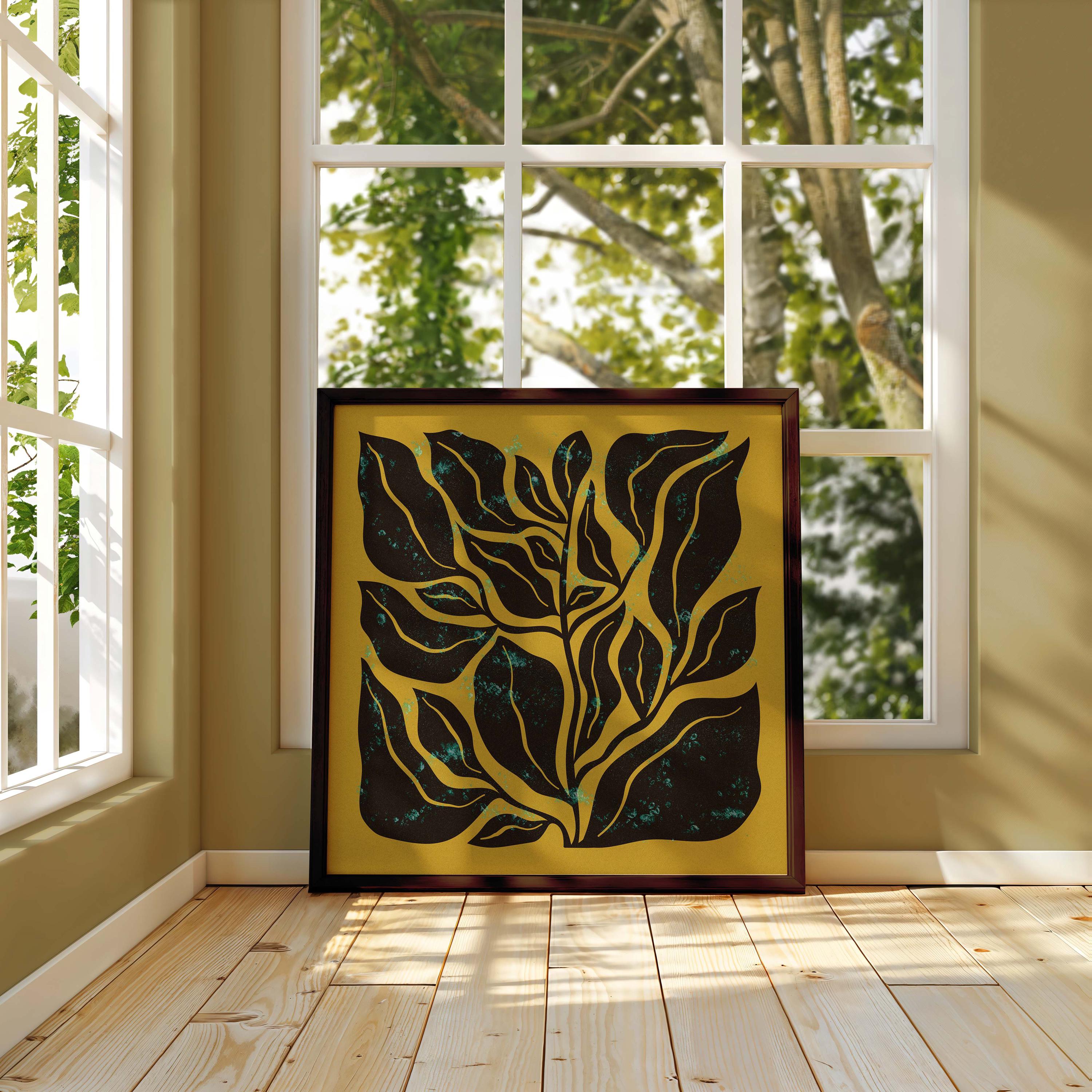 Mid century botanical prints featuring dark brown Matisse-inspired organic shapes on a mustard yellow background, and topped with a shimmery turquoise mist. Perfect for modern, mid century or vintage-inspired interiors, these square prints add a stylish vibe to any wall.