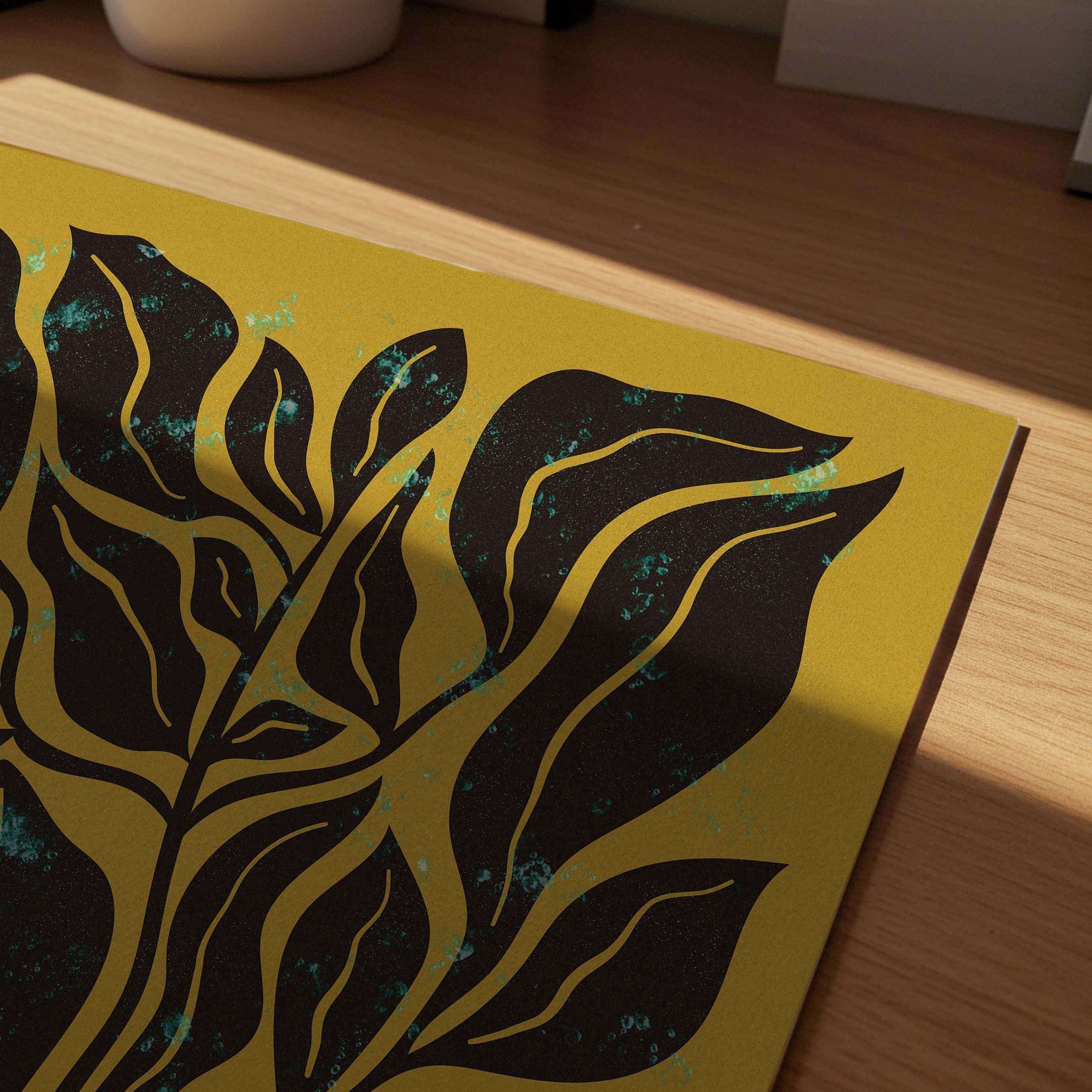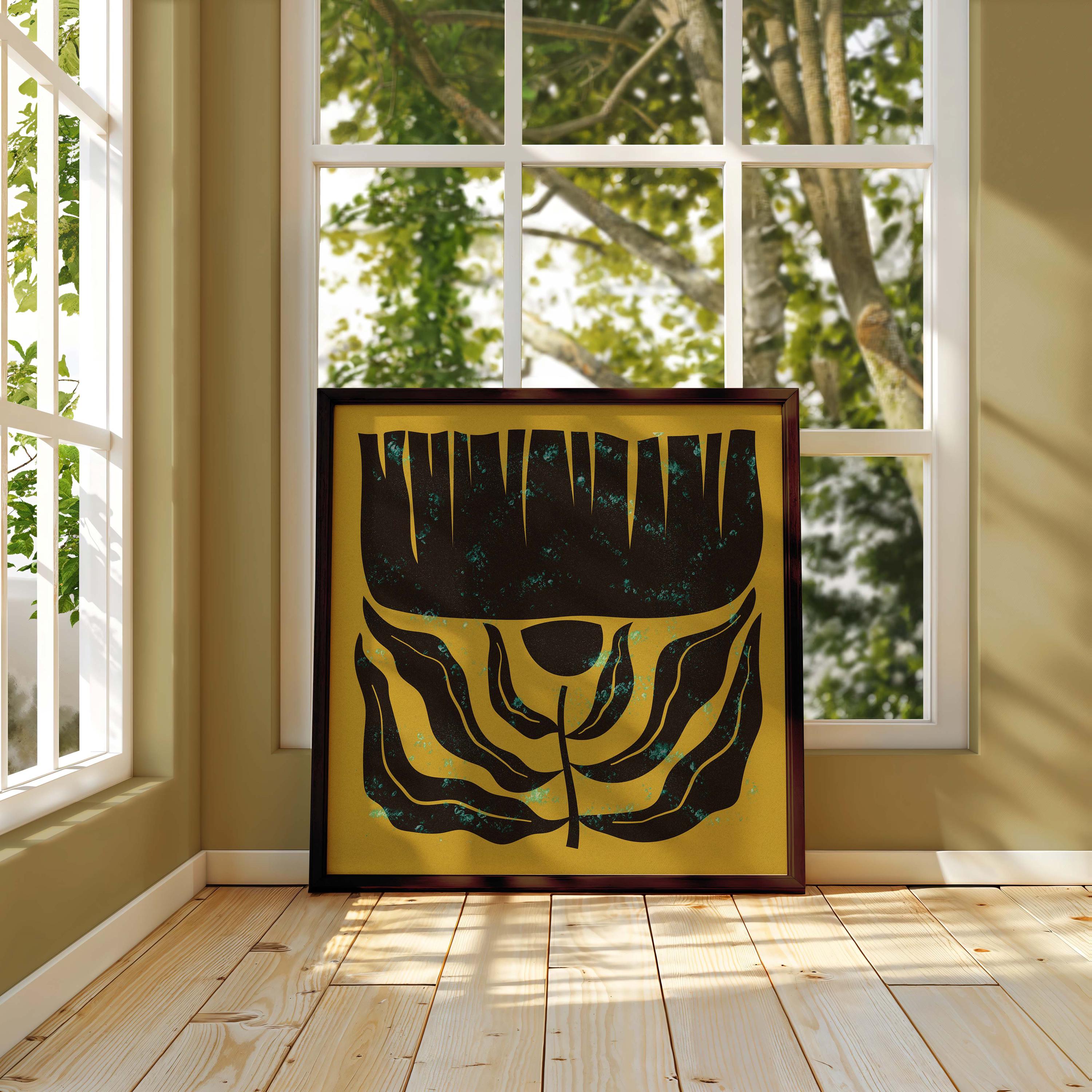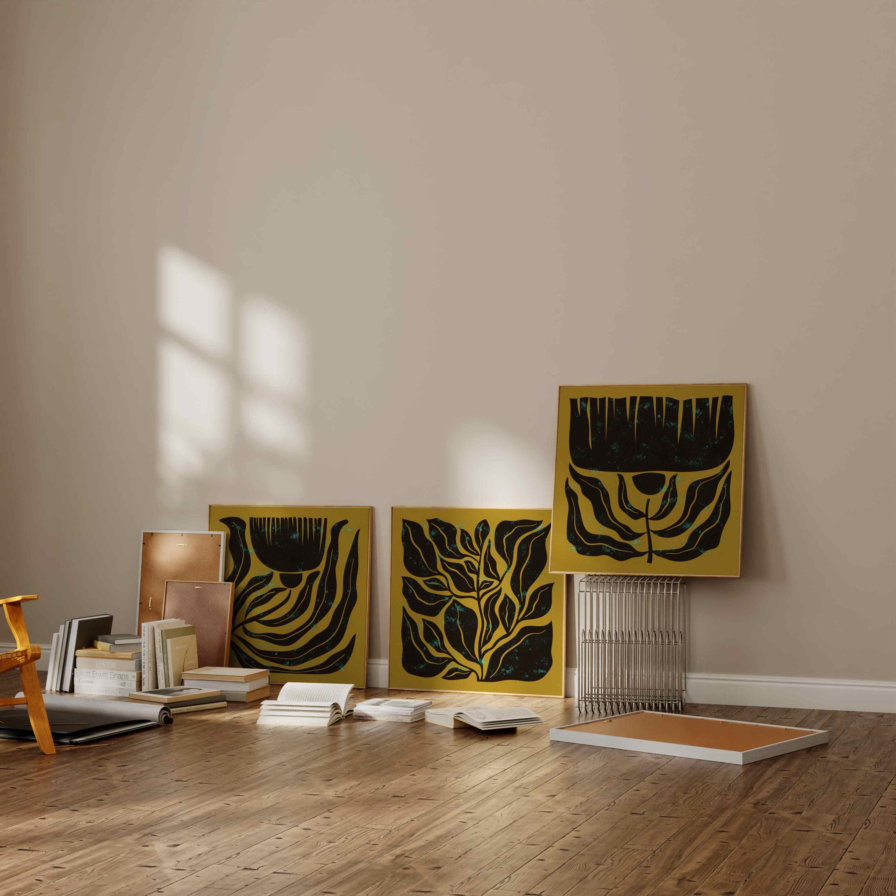 Mid century botanical prints featuring dark brown Matisse-inspired organic shapes on a mustard yellow background, and topped with a shimmery turquoise mist. Perfect for modern, mid century or vintage-inspired interiors, these square prints add a stylish vibe to any wall.