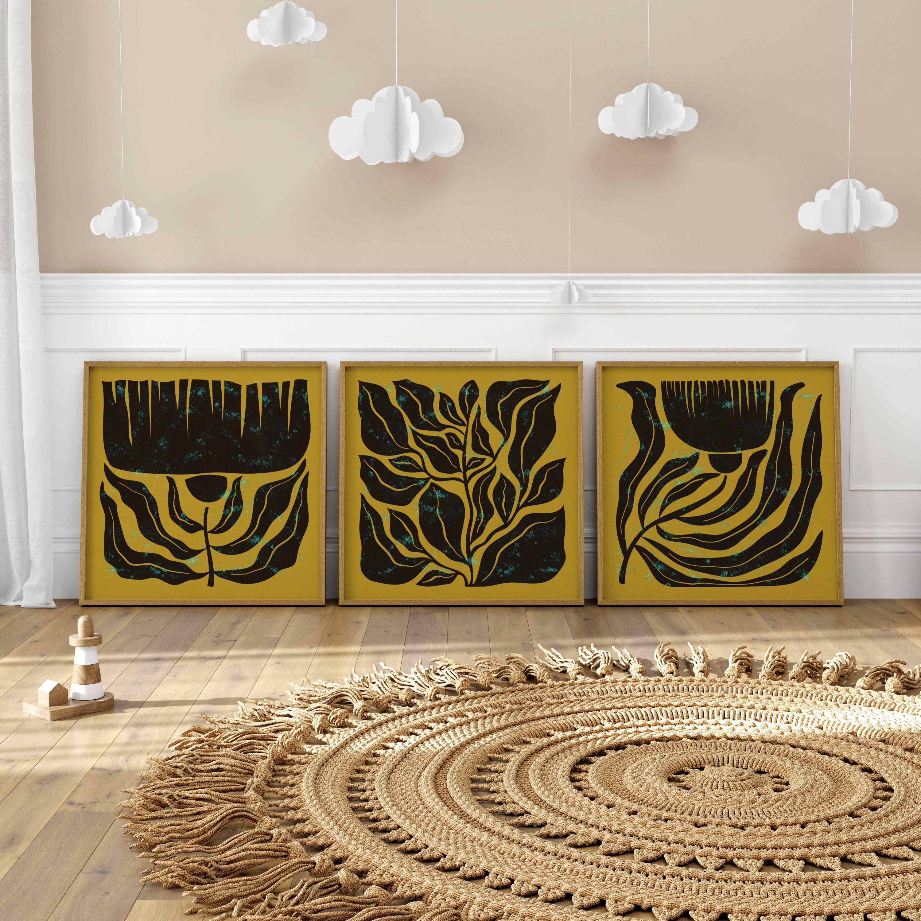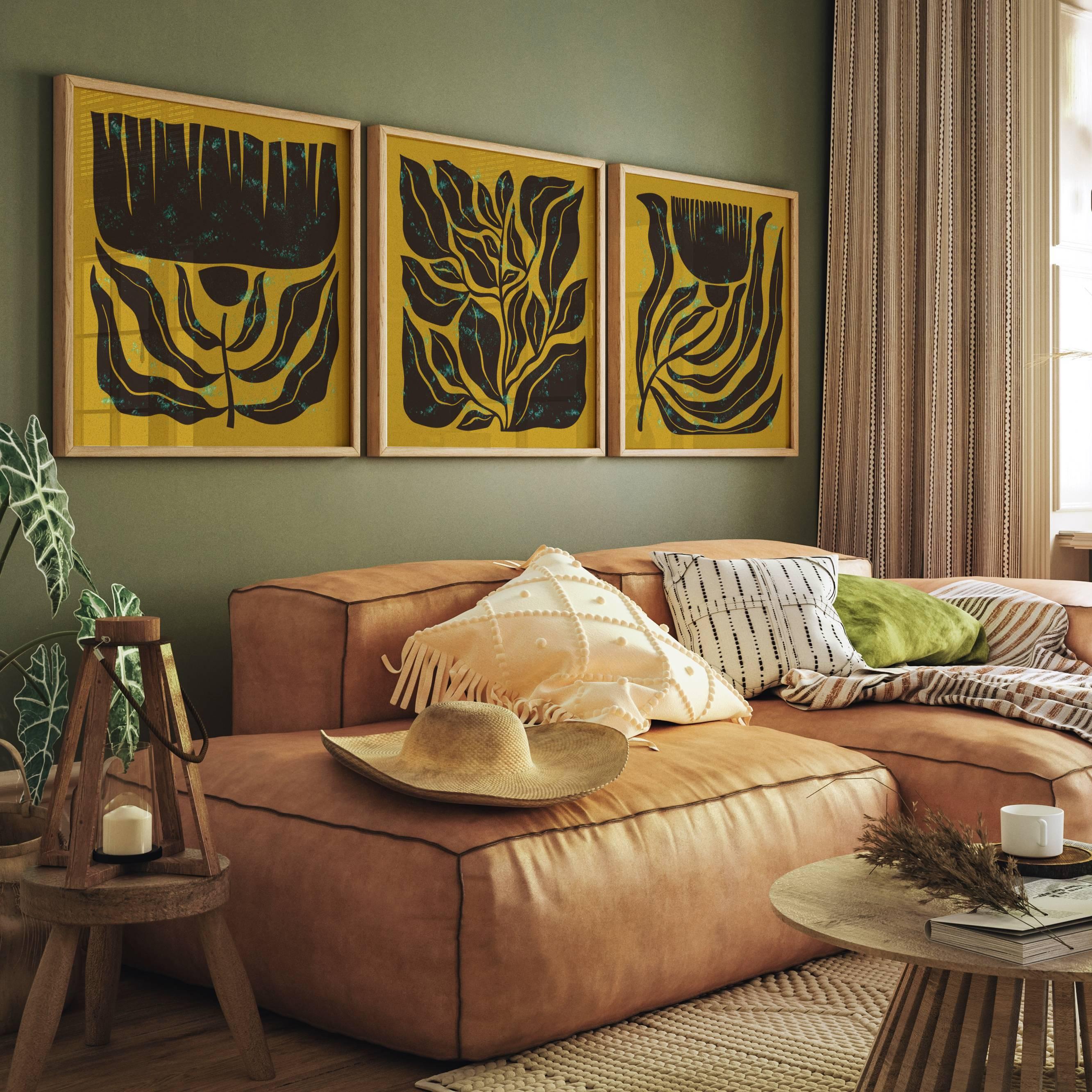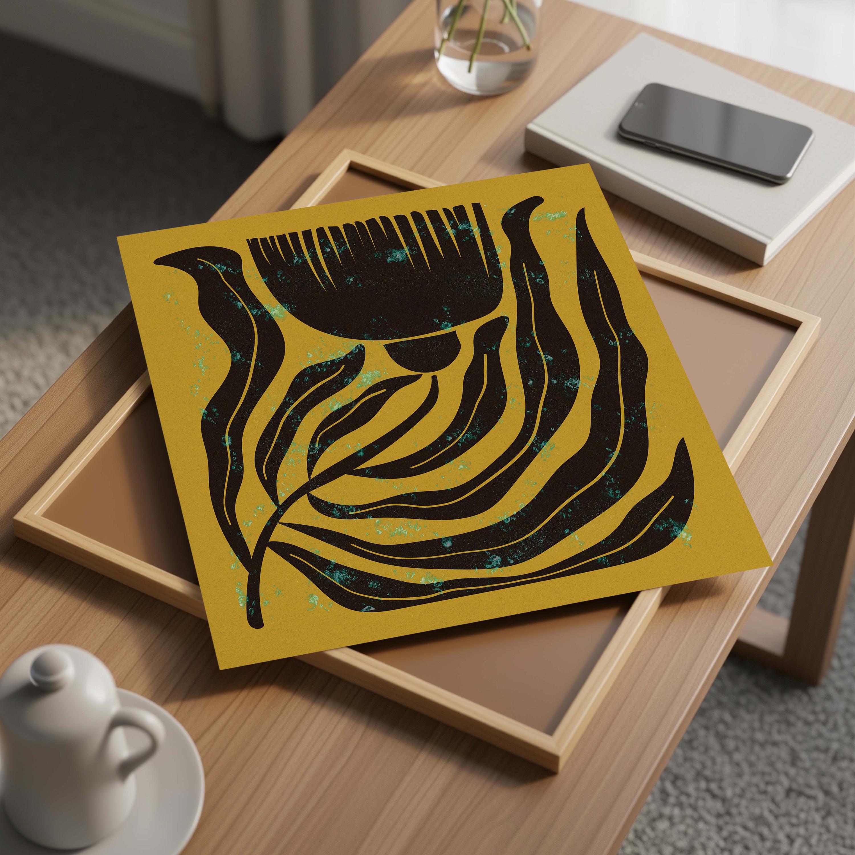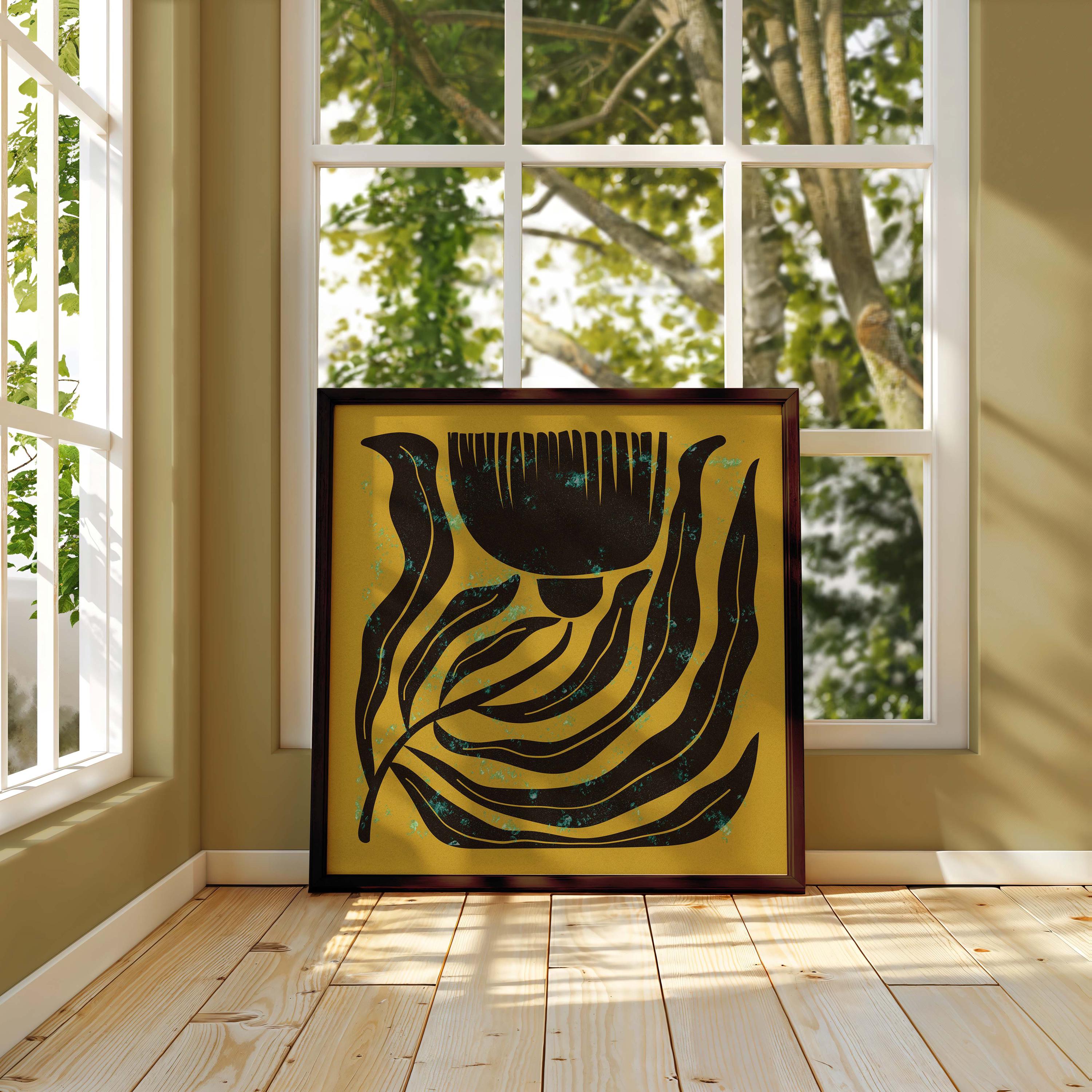 Mid century botanical prints featuring dark brown Matisse-inspired organic shapes on a mustard yellow background, and topped with a shimmery turquoise mist. Perfect for modern, mid century or vintage-inspired interiors, these square prints add a stylish vibe to any wall.