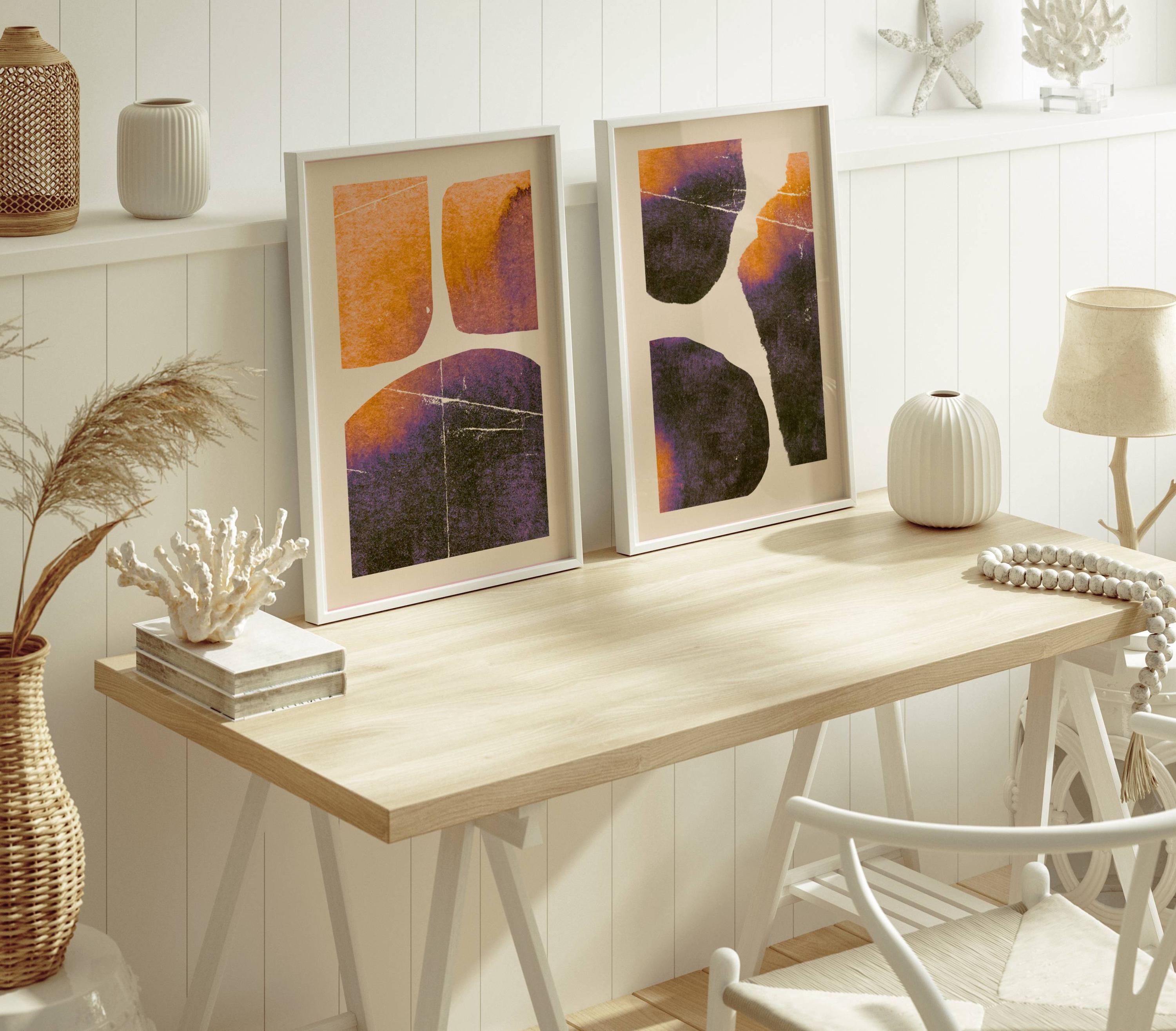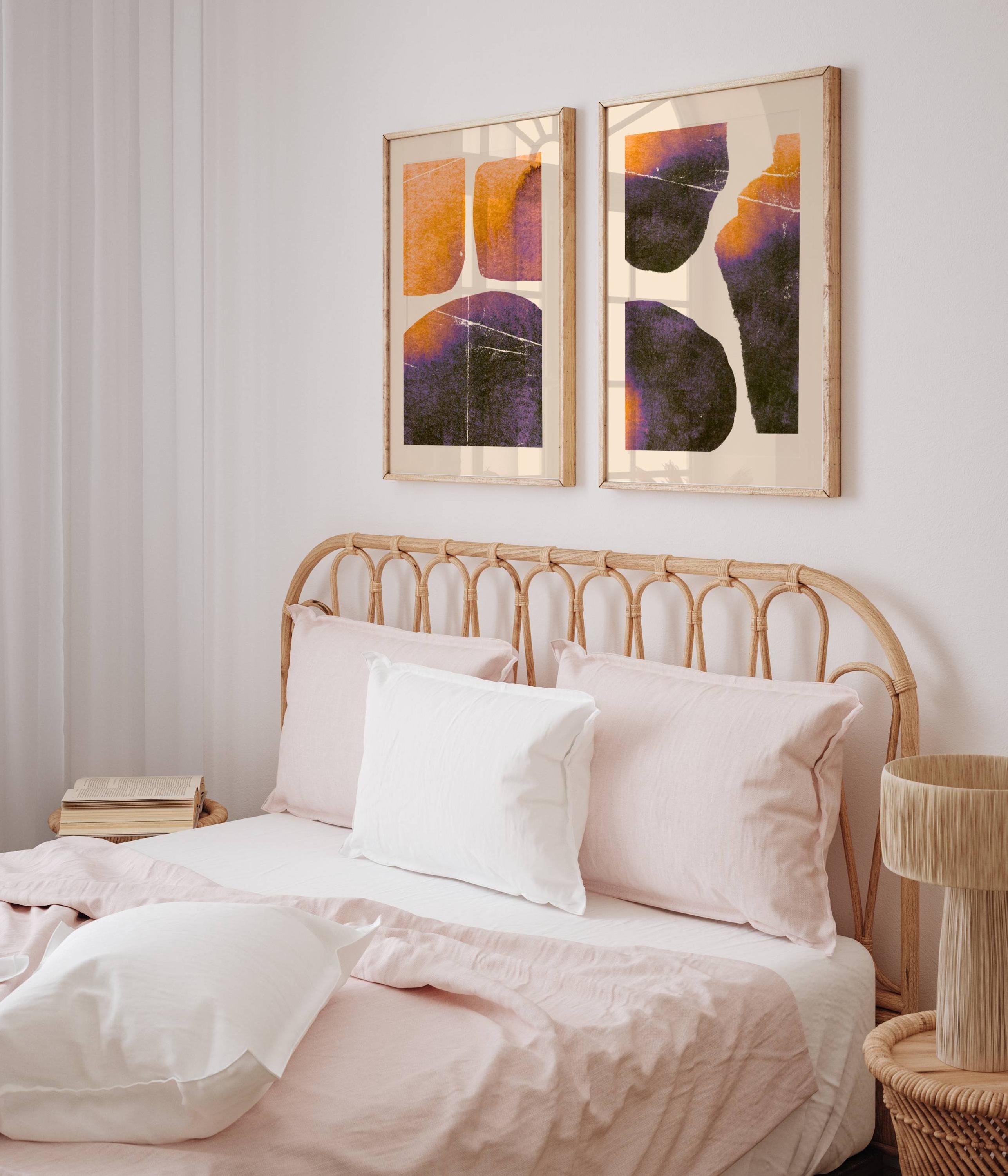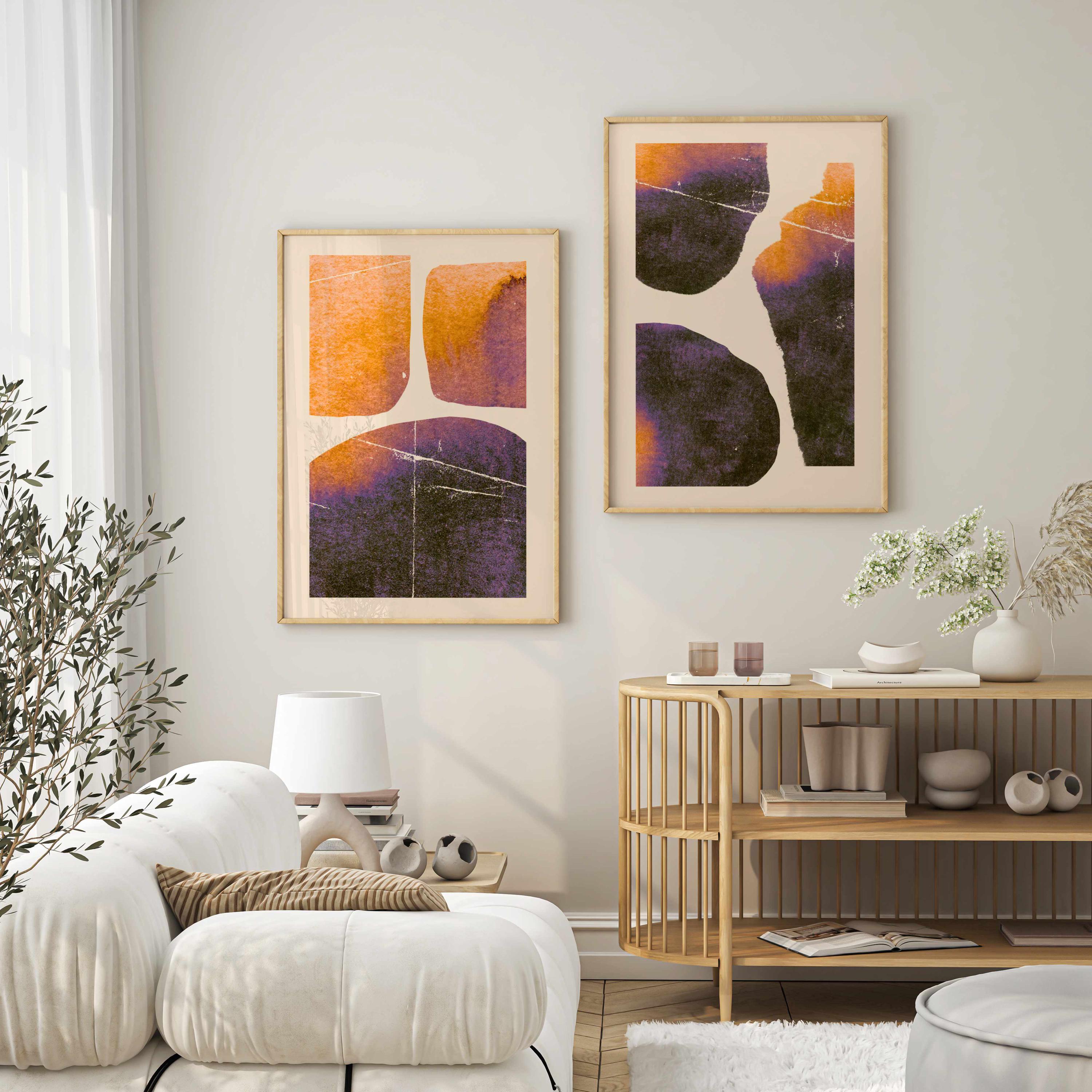 Abstract wall art print set of two featuring rich, textured forms in deep burnt orange, purple, and earthy charcoal tones. Mid-century graphics and earthy, organic abstraction make this set perfect for boho, eclectic, Japandi, or modern interiors. Style them together as a set or hang separately to tie multiple spaces together.