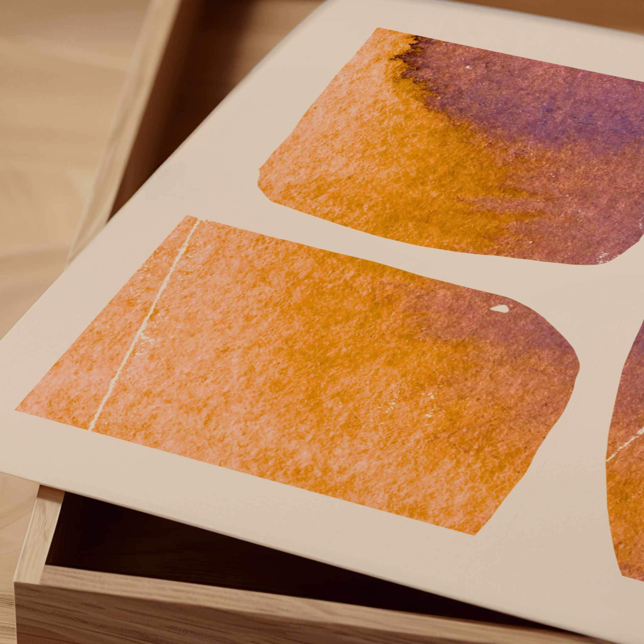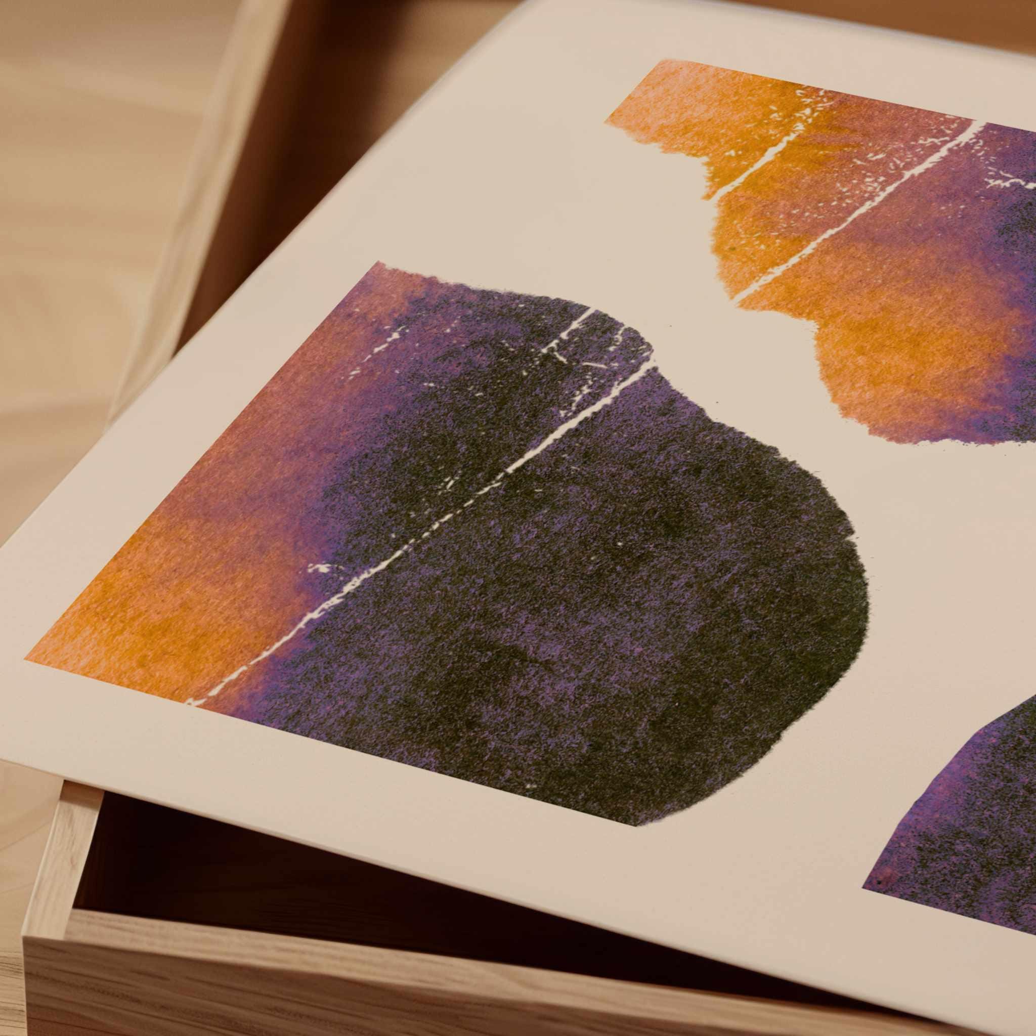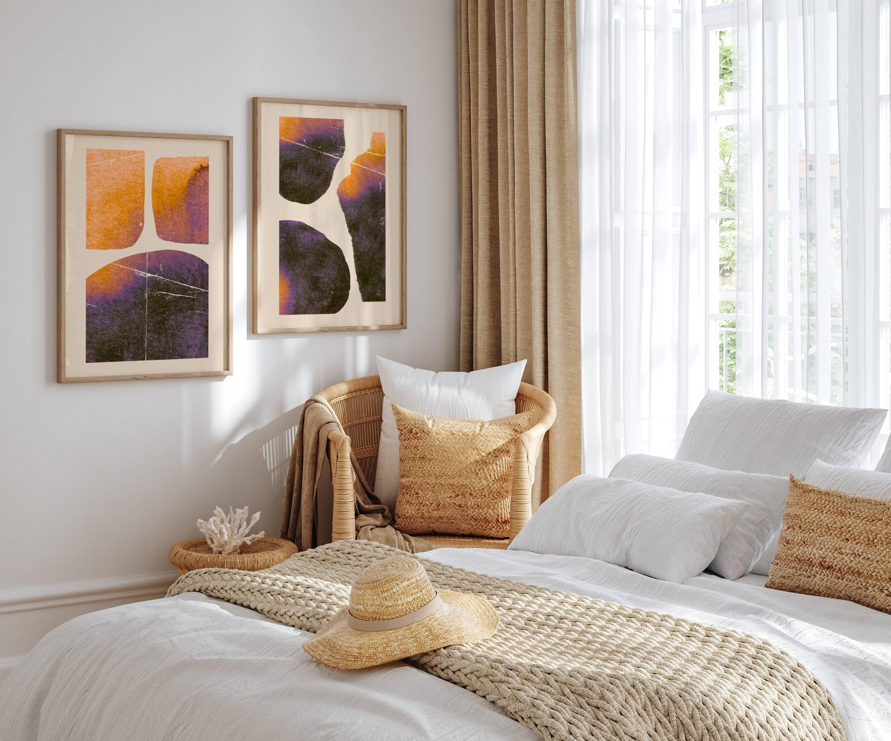 Abstract wall art print set of two featuring rich, textured forms in deep burnt orange, purple, and earthy charcoal tones. Mid-century graphics and earthy, organic abstraction make this set perfect for boho, eclectic, Japandi, or modern interiors. Style them together as a set or hang separately to tie multiple spaces together.