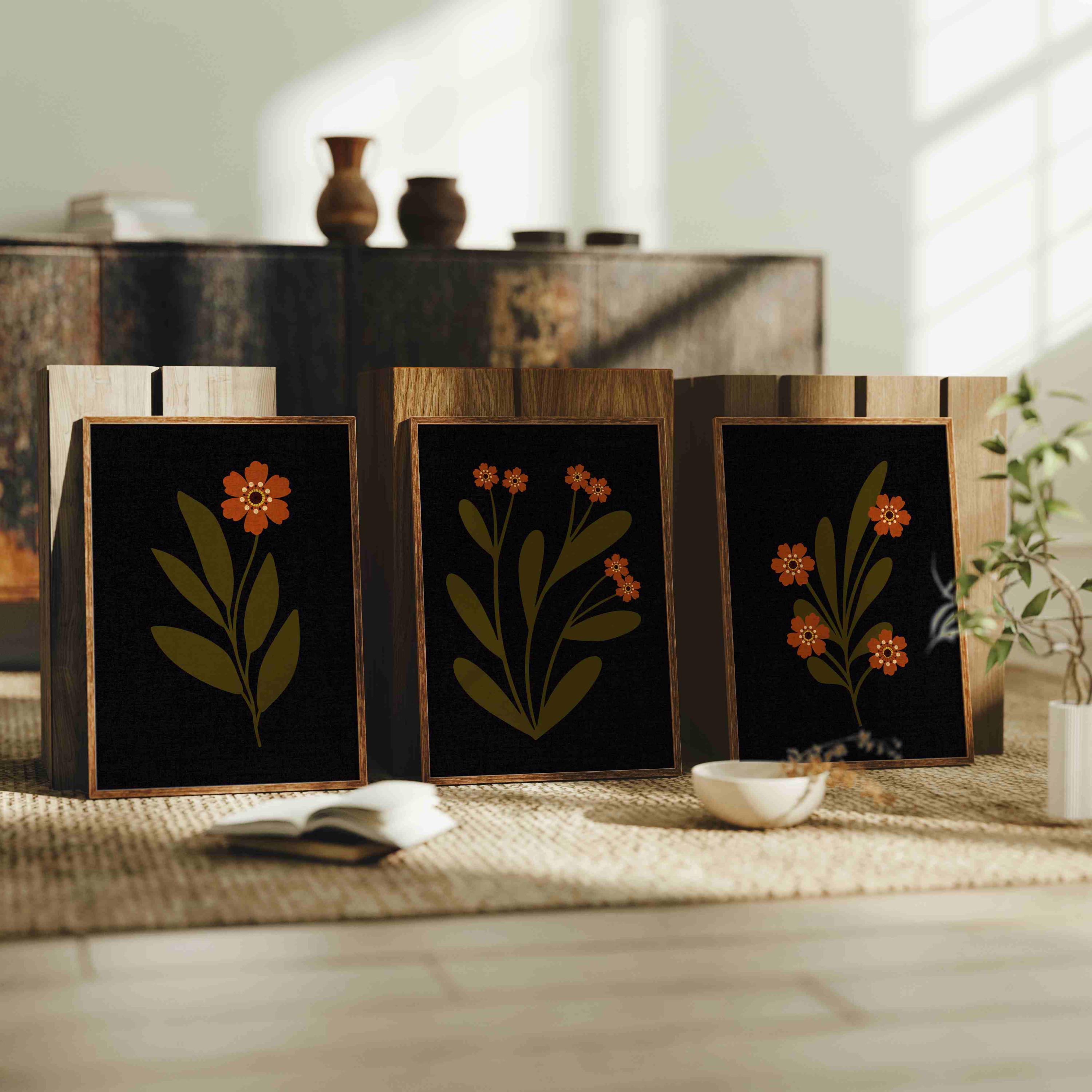 Botanical wall art set of three featuring minimalist wildflowers on a moody dark background. Perfect for adding a touch of retro charm to your living room, bedroom, or cozy reading nook. This vintage-inspired set also makes a thoughtful gift for nature enthusiasts or those who appreciate rustic decor.