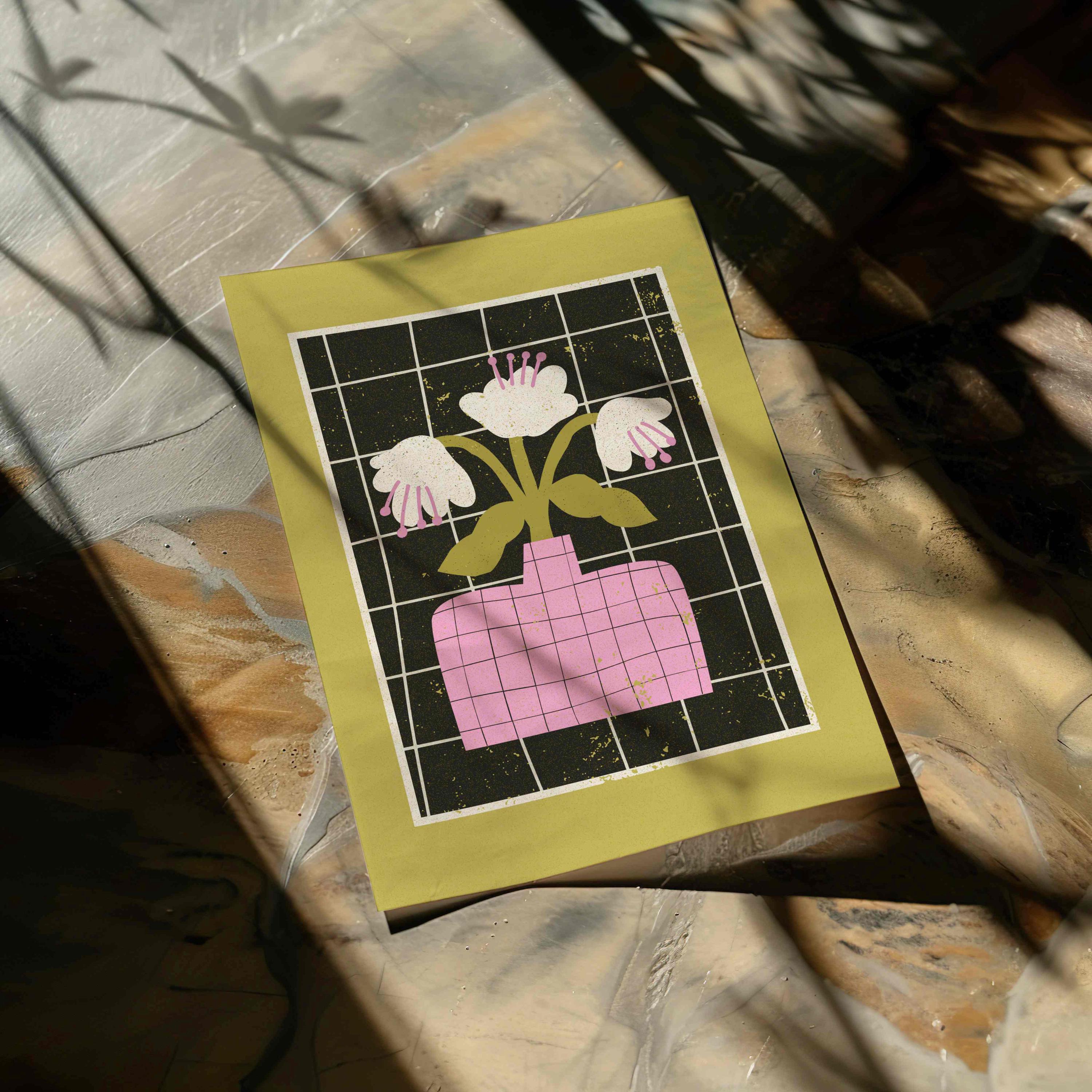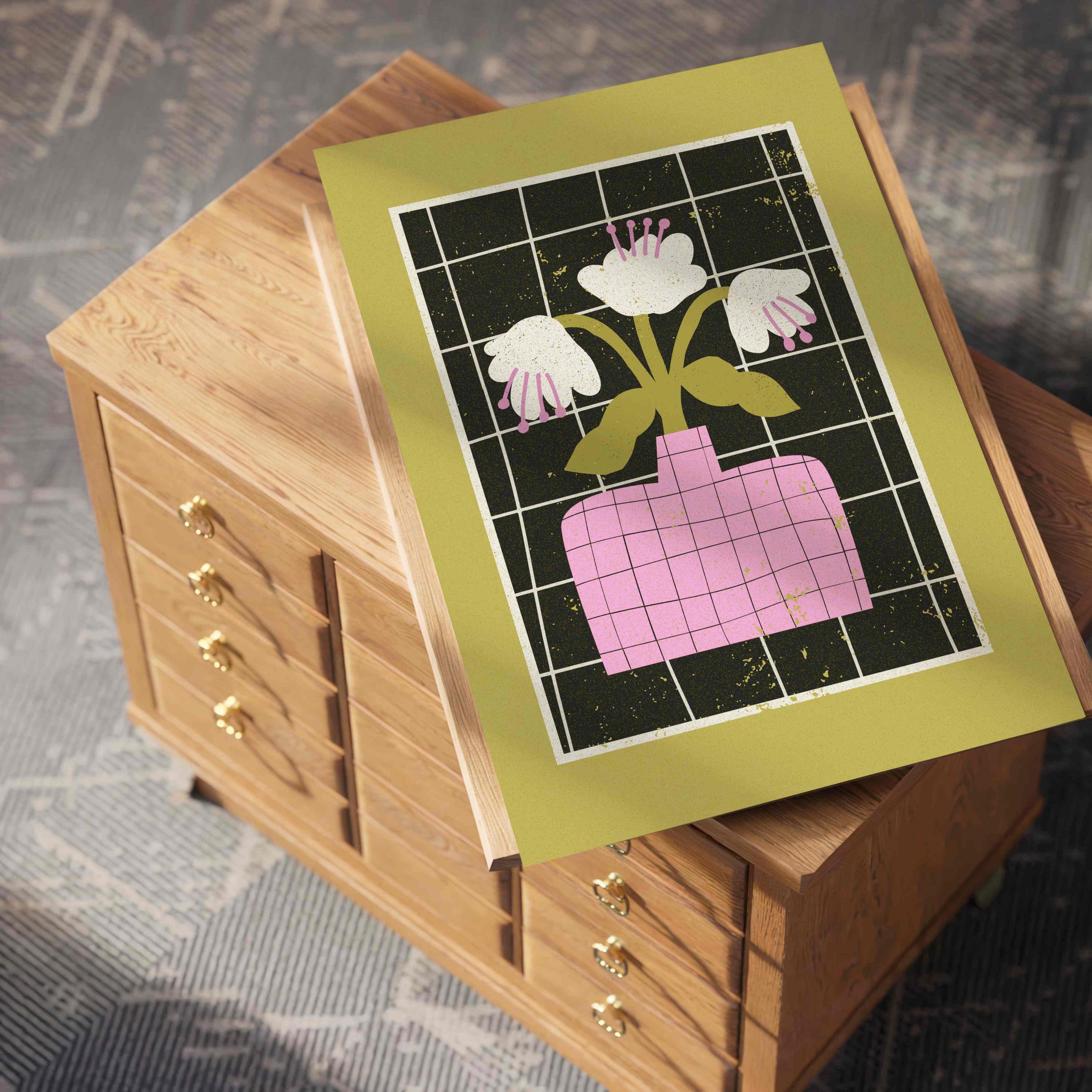 70s groovy floral art print featuring abstract white flowers in a funky pink checkered vase, set against a deep black background with a grid pattern. This unique botanical wall decor blends retro and mid-century modern design. With its vintage aesthetic and eclectic charm, it's ideal for adding a pop of color to your living room, bedroom, office, or dorm.