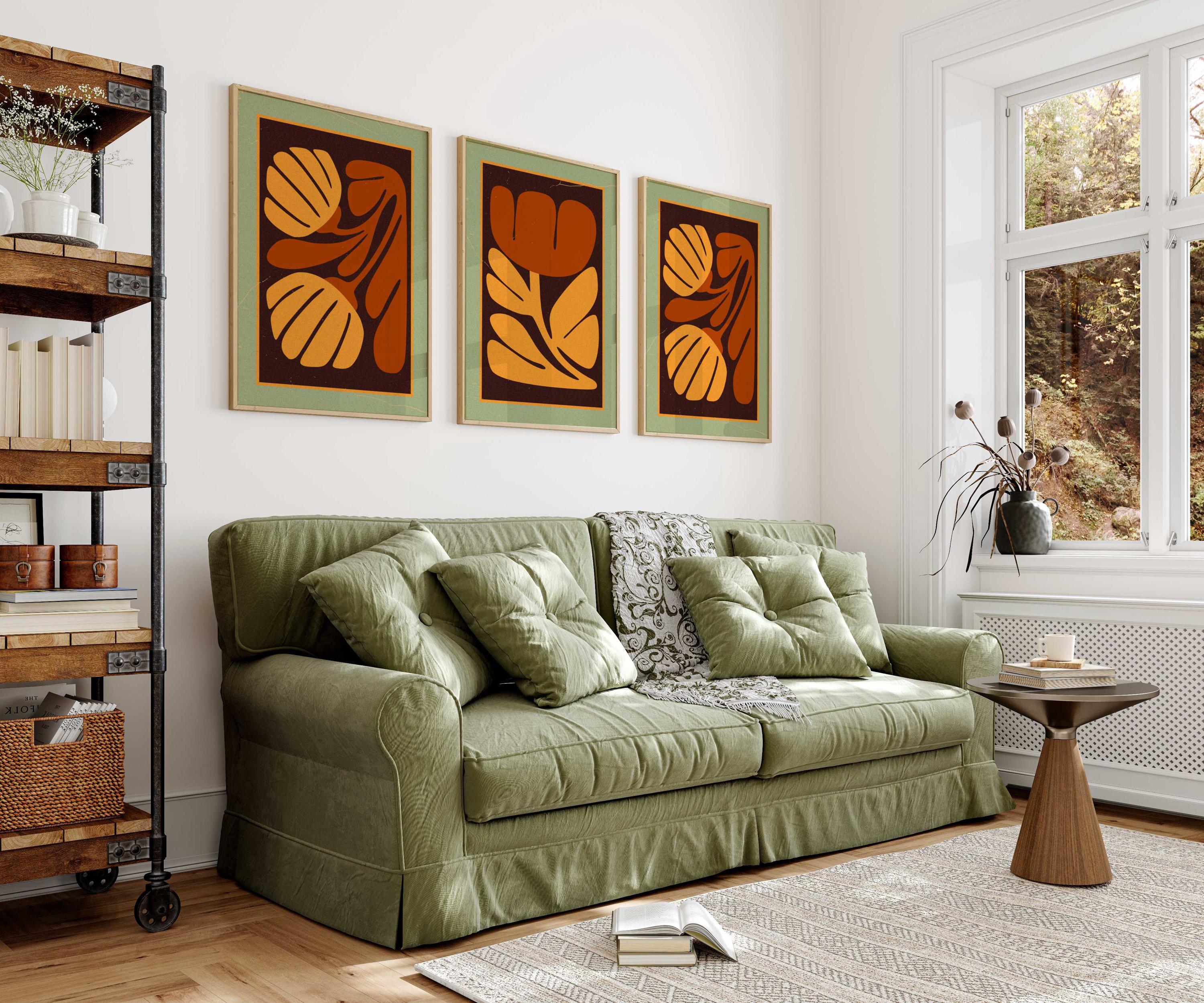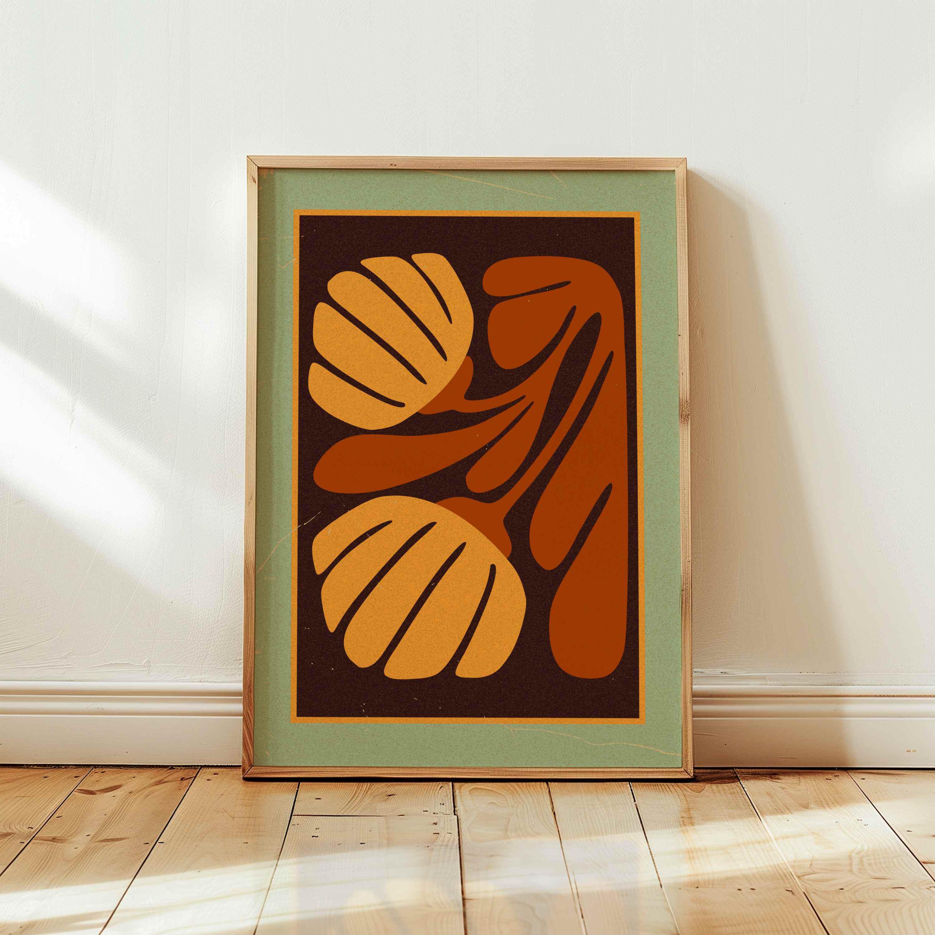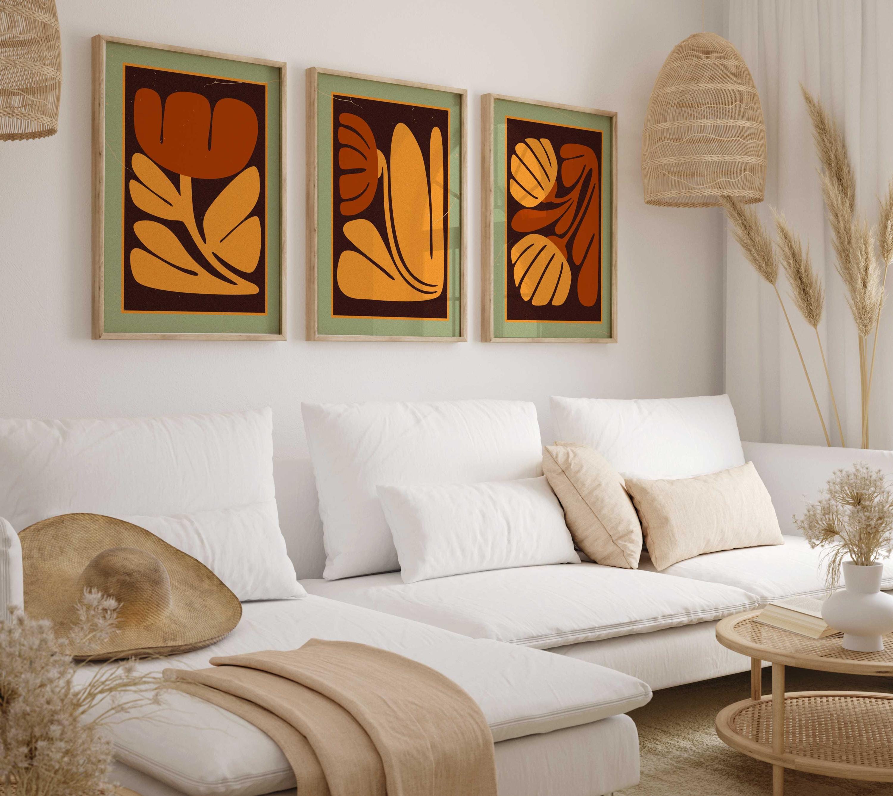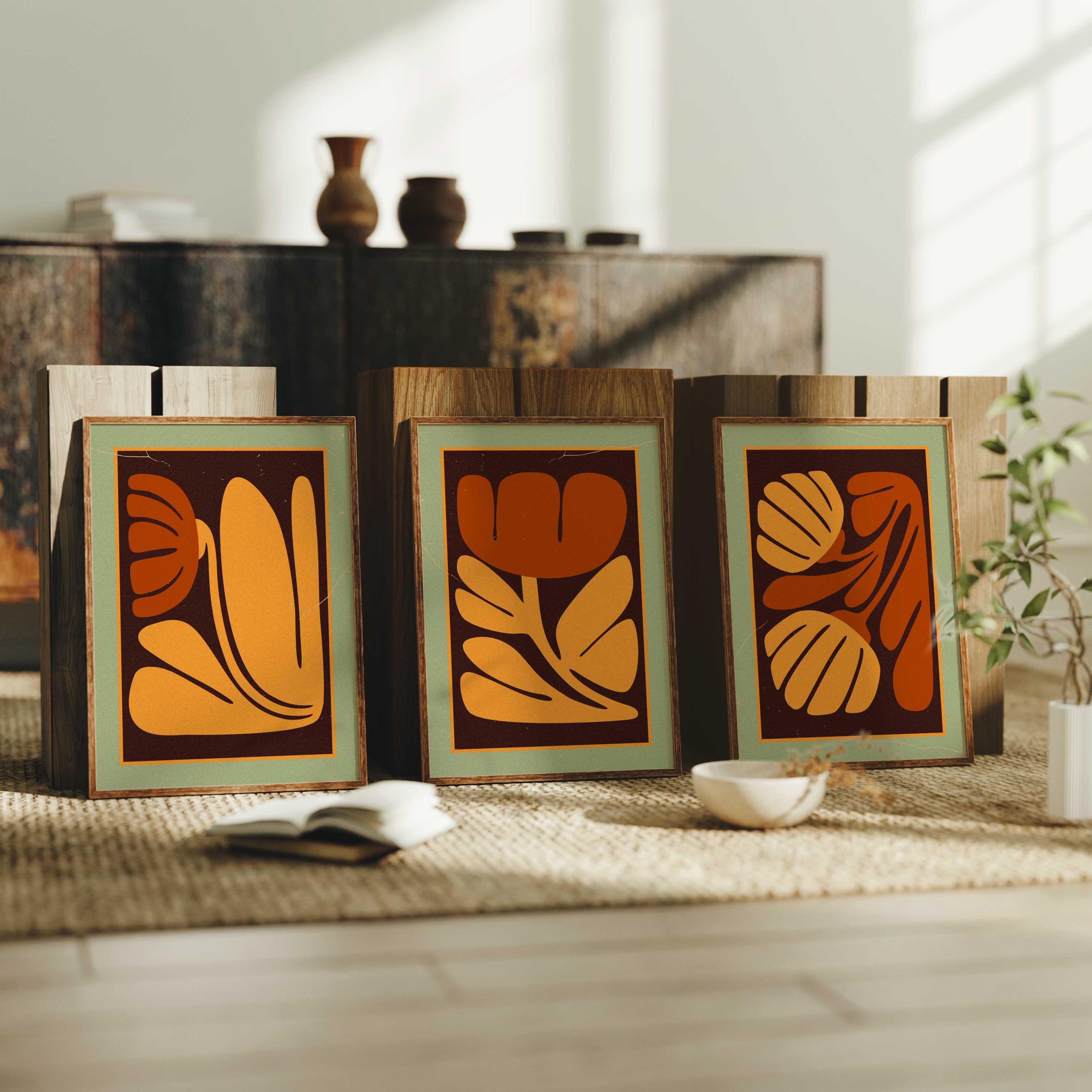 Abstract retro floral print set inspired by Matisse botanical shapes and groovy 70s design. These funky prints are the perfect addition to any boho, mid century, or vintage-inspired space, whether you choose to showcase them in the living room, office, bedroom, entryway, or anywhere else.