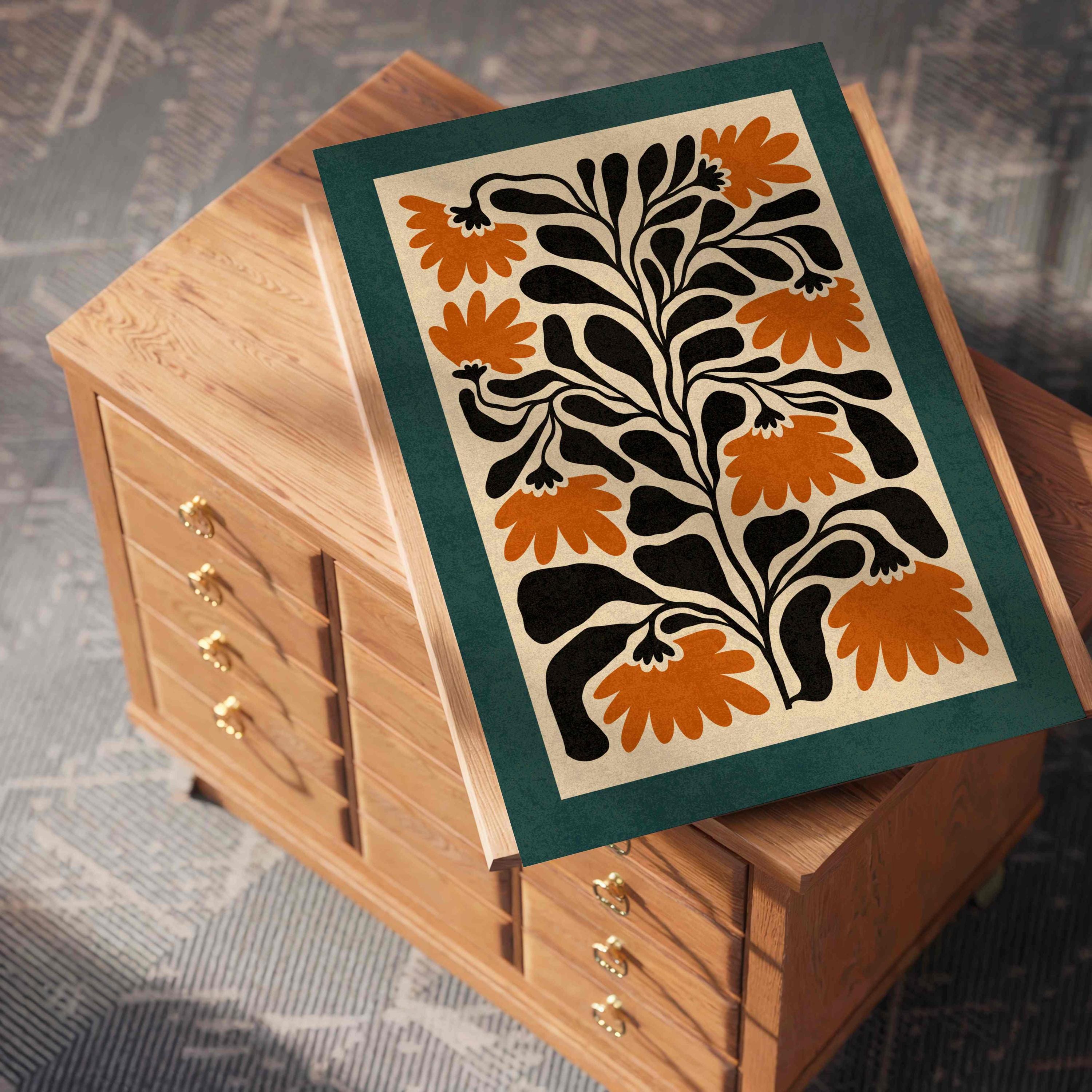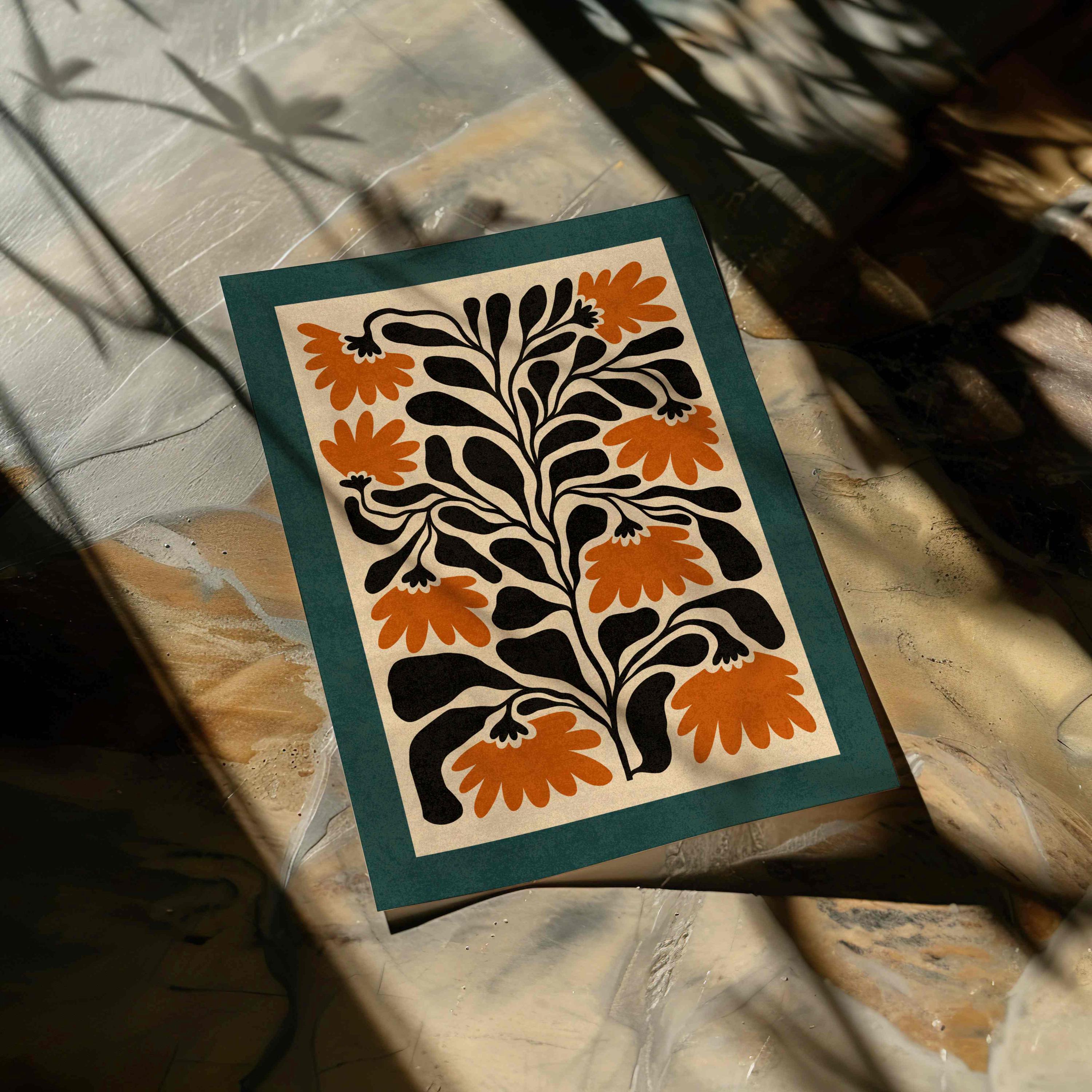 Retro floral print featuring an abstract Matisse-style botanical design in rich burnt orange, deep teal, warm cream and charcoal black.