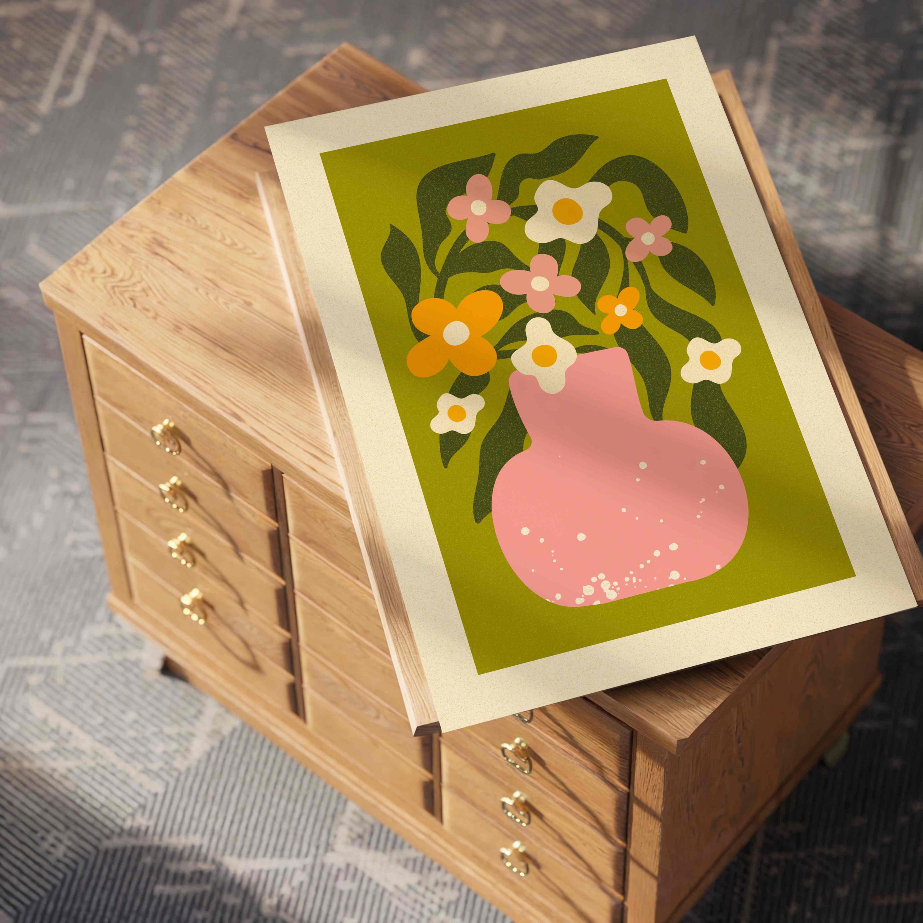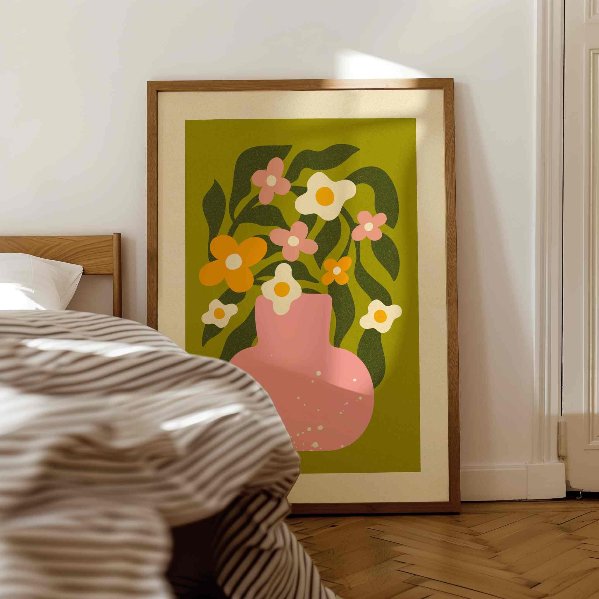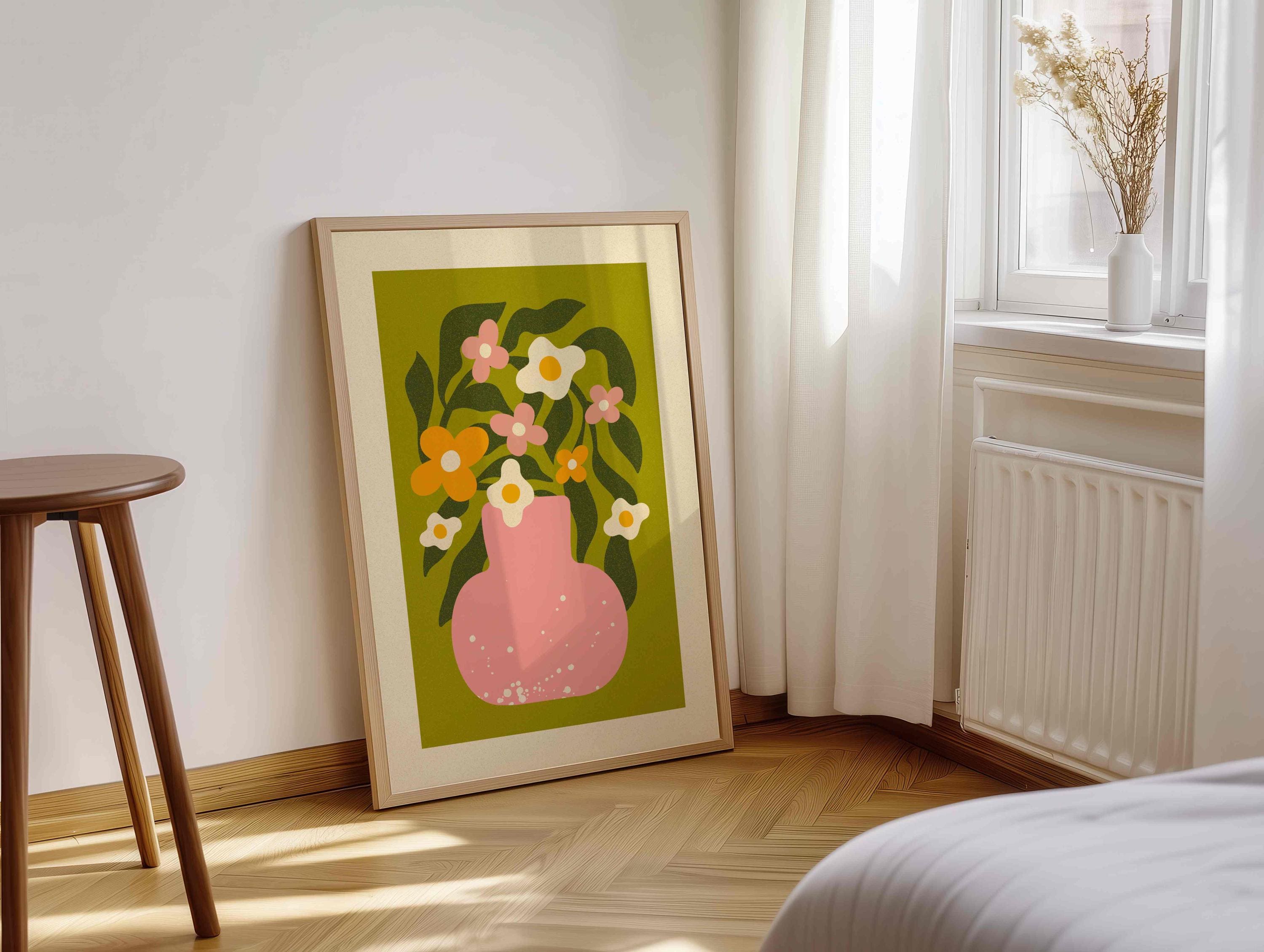 Retro 70s floral wall art print featuring orange, blush pink and white flowers in a funky pink vase, all set against a rich olive green background. This unique art blends retro vibes and mid century modern design, perfect for adding a statement to your living room, bedroom, office, or even a dorm room.