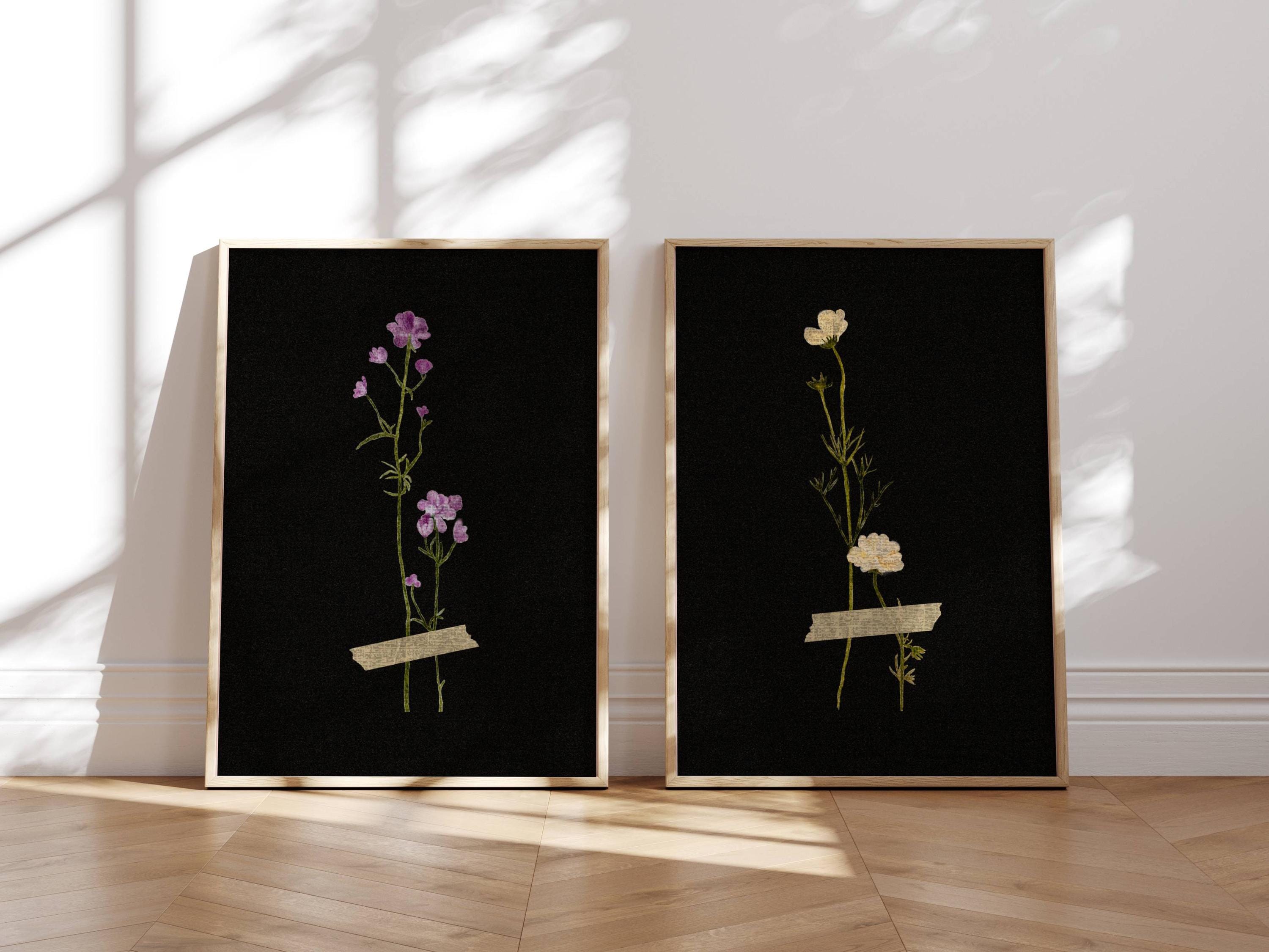 Floral wall art set of 2 prints featuring delicate wildflowers on a black background — perfect for vintage, botanical, and cottagecore decor. This elegant duo adds a soft, timeless touch to reading nooks, farmhouse spaces, or gallery-style displays. A beautiful choice for lovers of nature-inspired aesthetic and minimalist floral design.