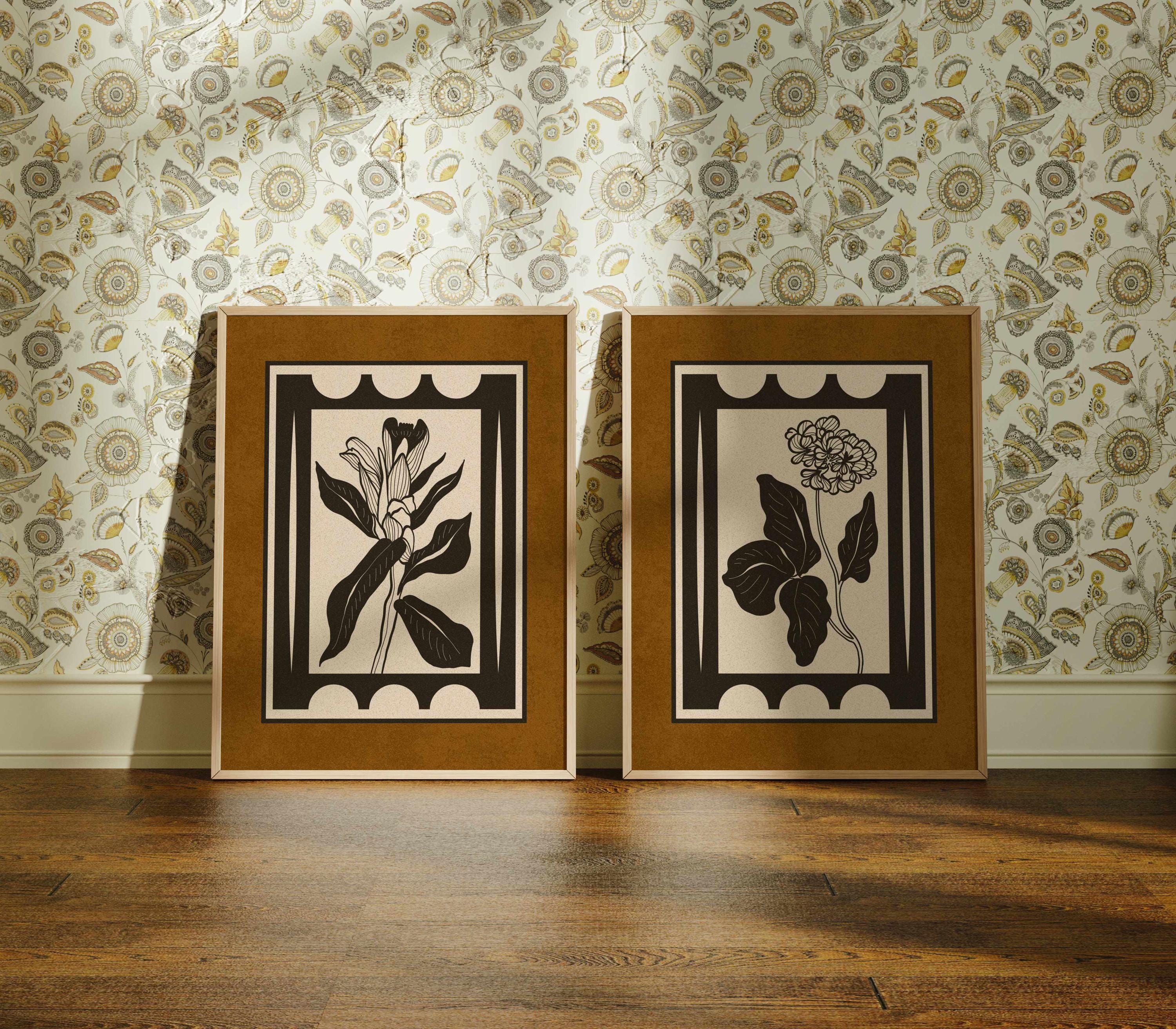 Set of two vintage botanical prints featuring delicate wildflowers inspired by retro design and nature’s quiet beauty. Designed in a stamp-style layout with earthy tones of charcoal black, warm brown, and light beige, this set blends mid-century design, retro florals, and cottagecore aesthetics — making it the perfect addition to a gallery wall, reading nook, bedroom, or cozy kitchen.