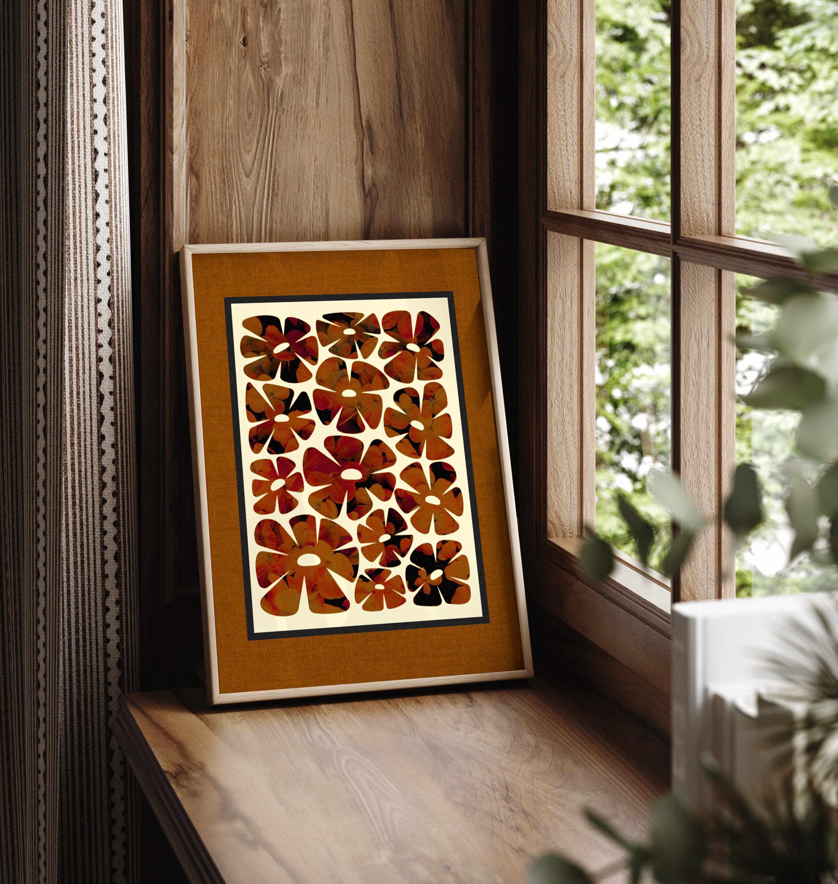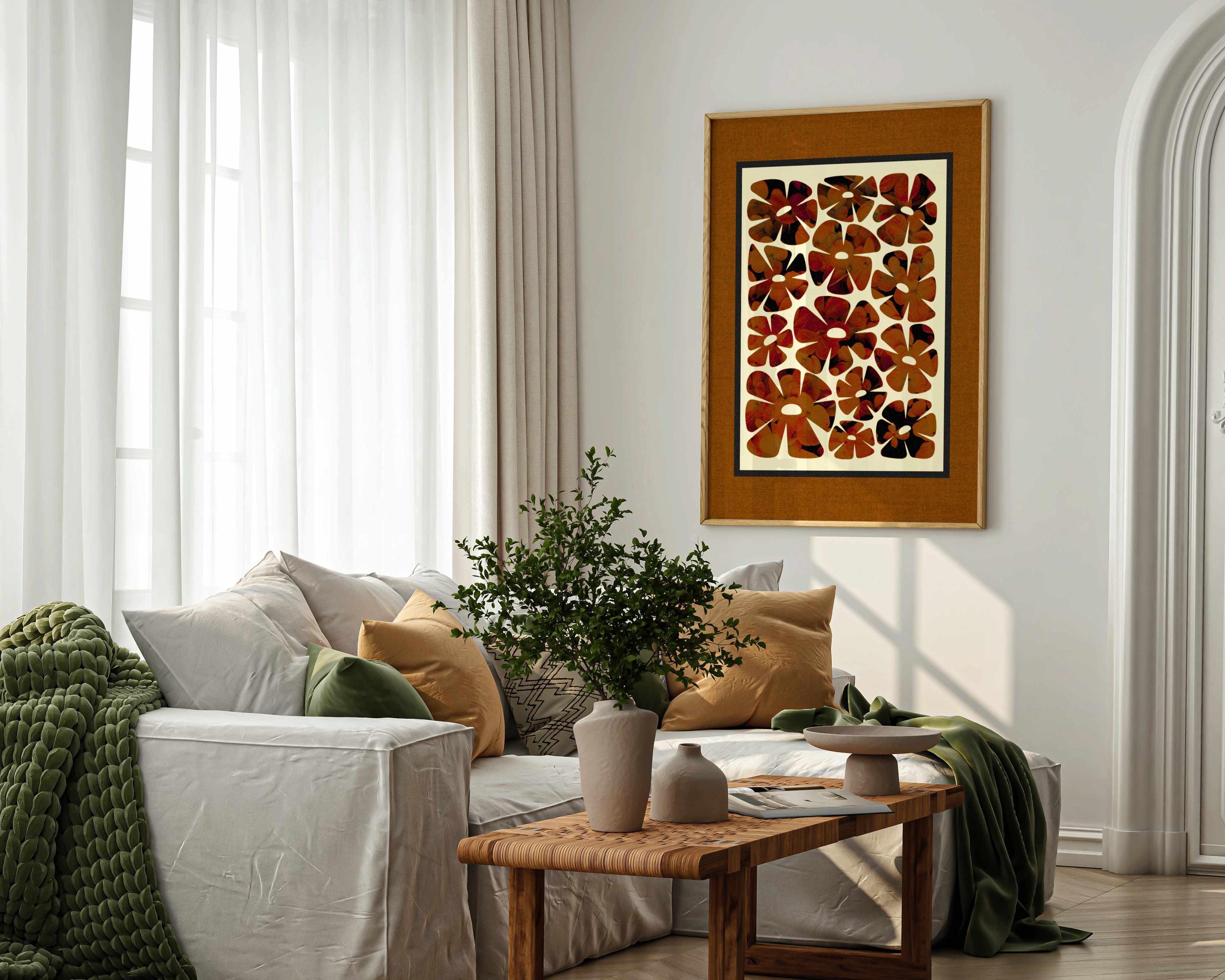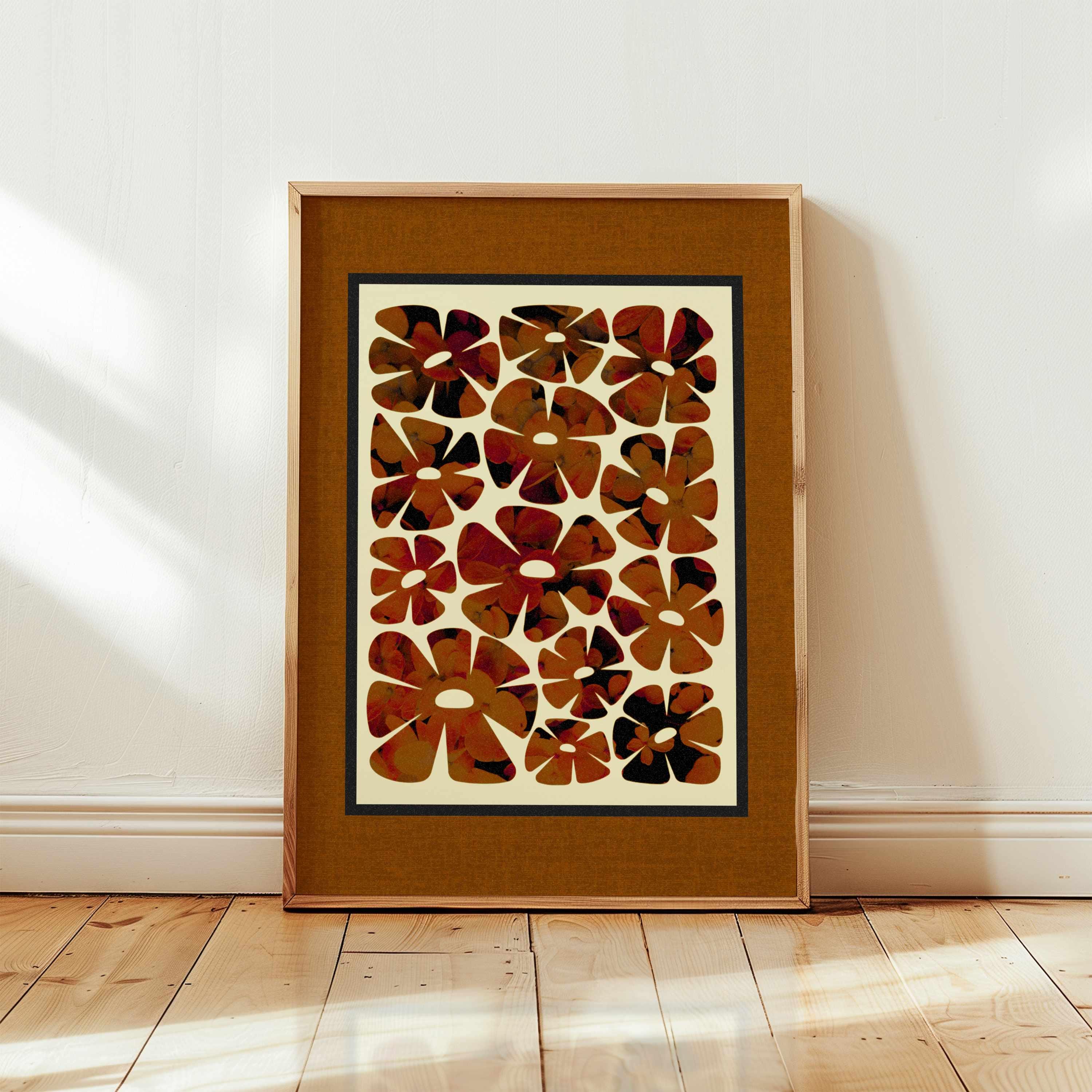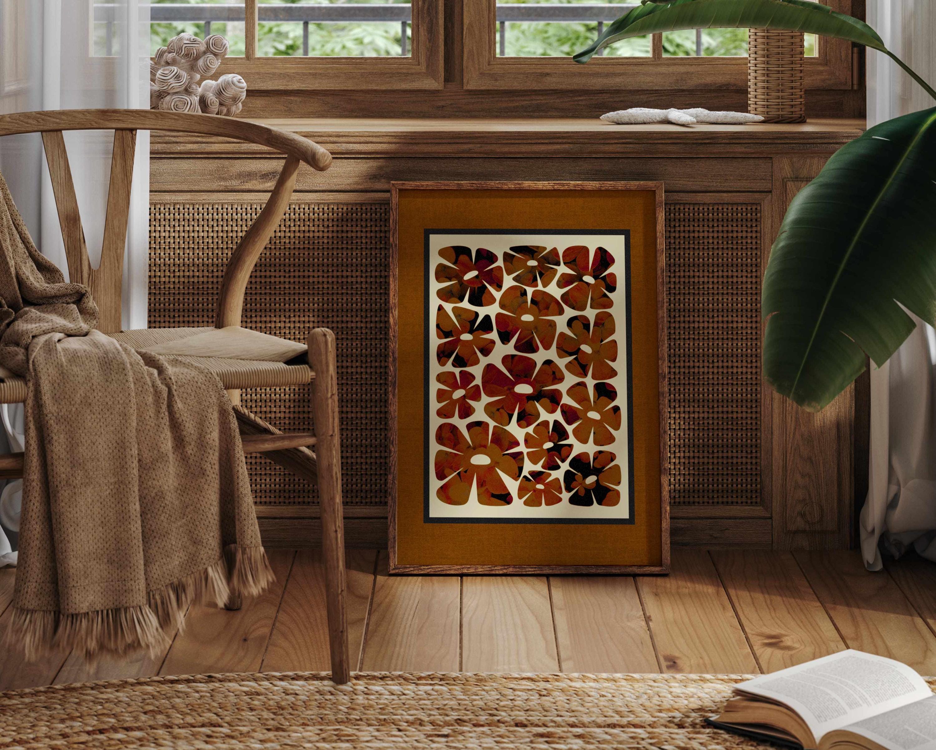 Abstract botanical print featuring soft organic plant shapes and a neutral retro floral design bordered with a warm brown mat. This artwork blends vintage-inspired aesthetics with a modern, boho home vibe, making it perfect for living rooms, bedrooms, offices, or gallery walls.