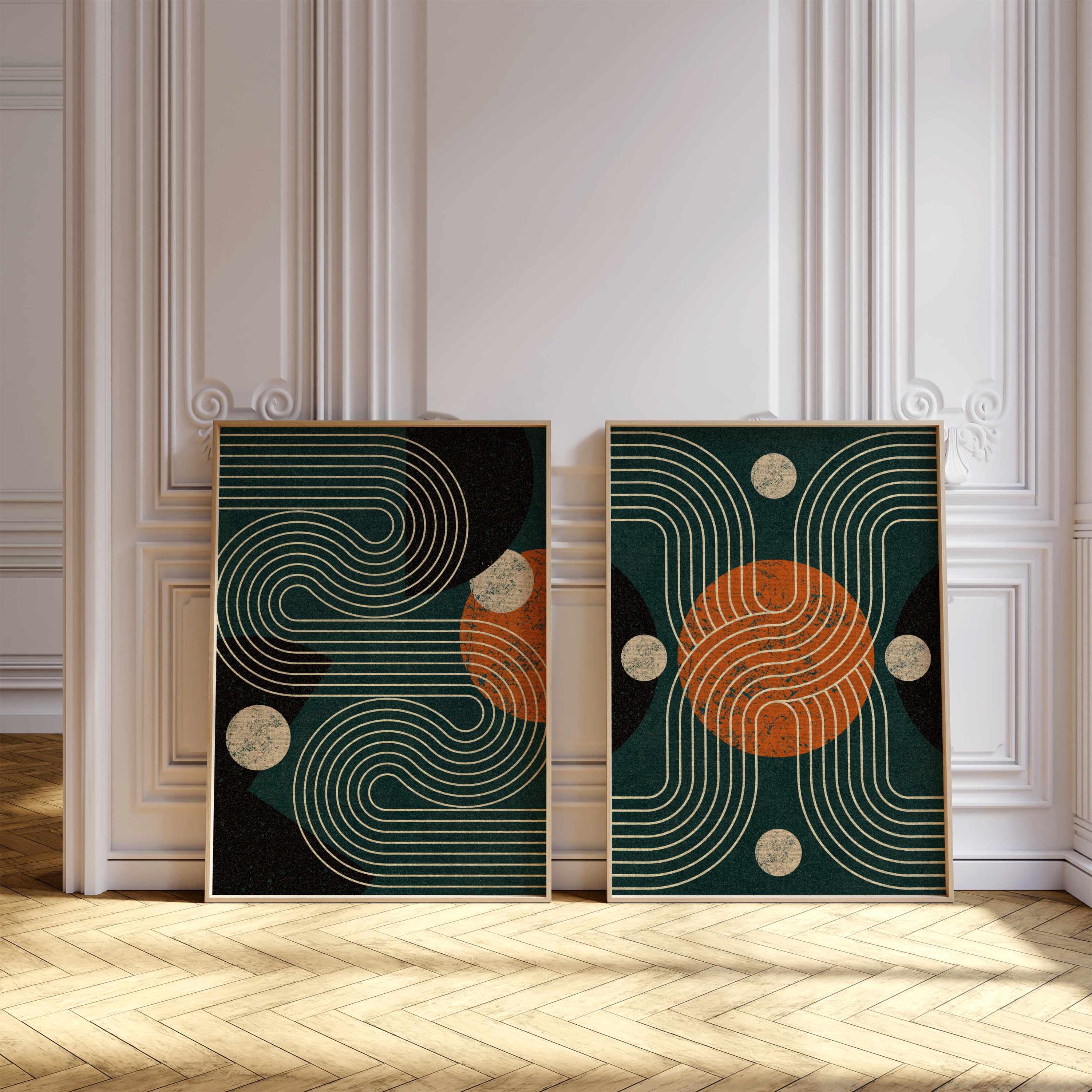 Abstract mid century modern print set featuring geometric shapes and minimalist lines in deep dark teal, warm orange, black and off-white colors. This Japandi-inspired set is designed to be displayed as the focal point on your living room, bedroom, dining room or office wall. It also makes a thoughtful and unique gift for your friend for a special event like Christmas, birthday, or housewarming.