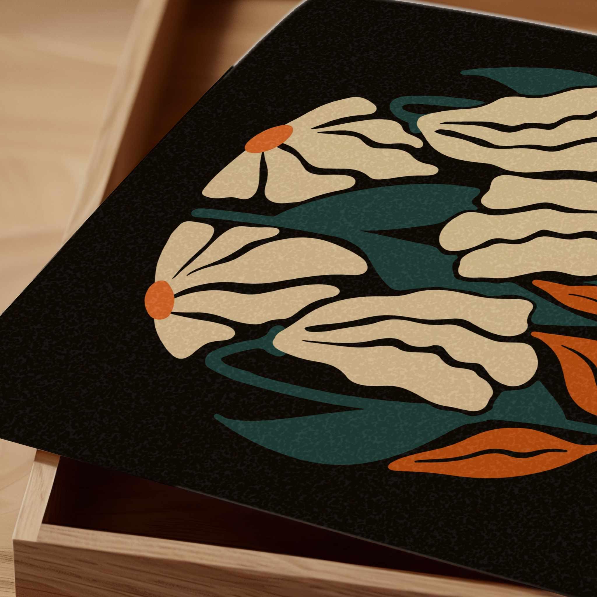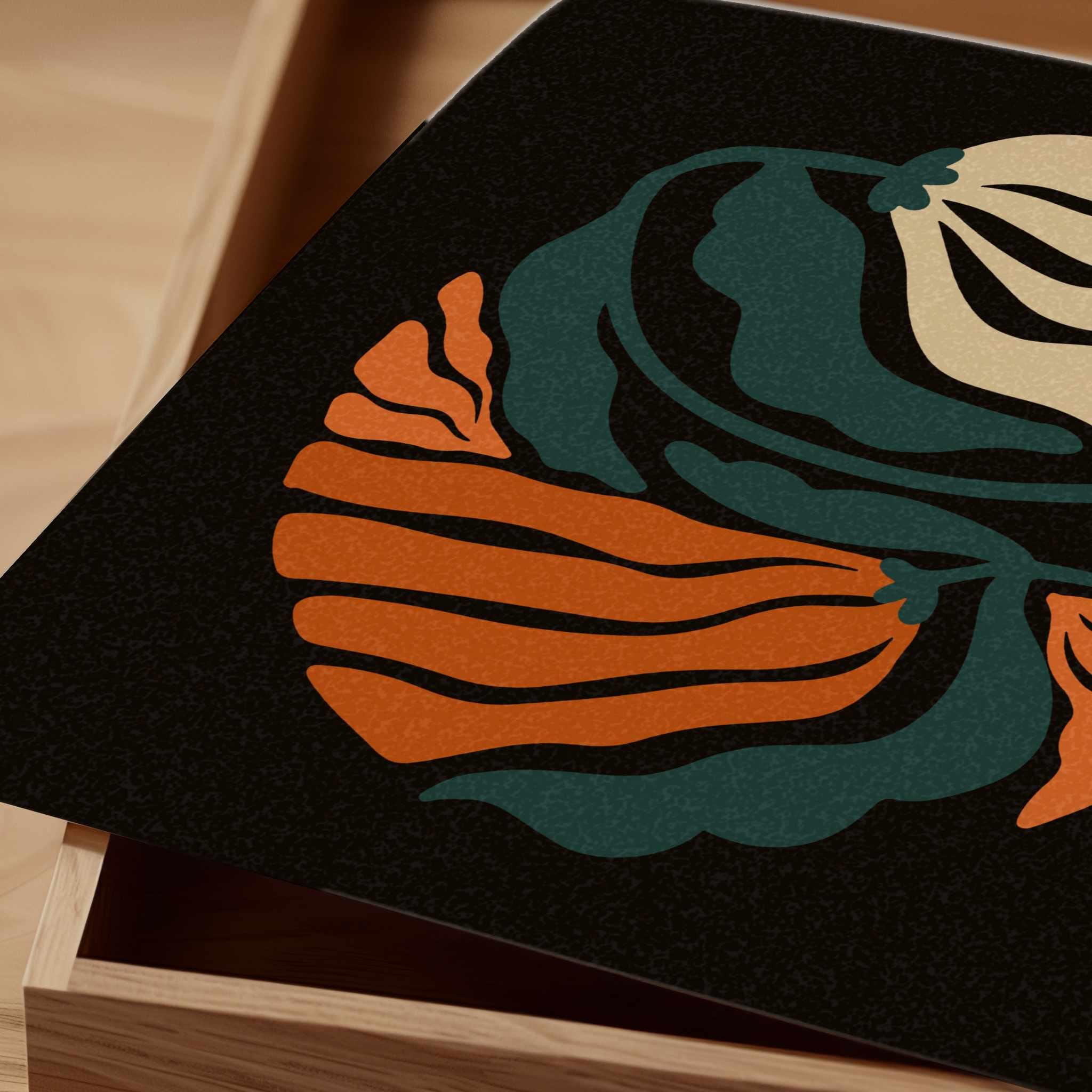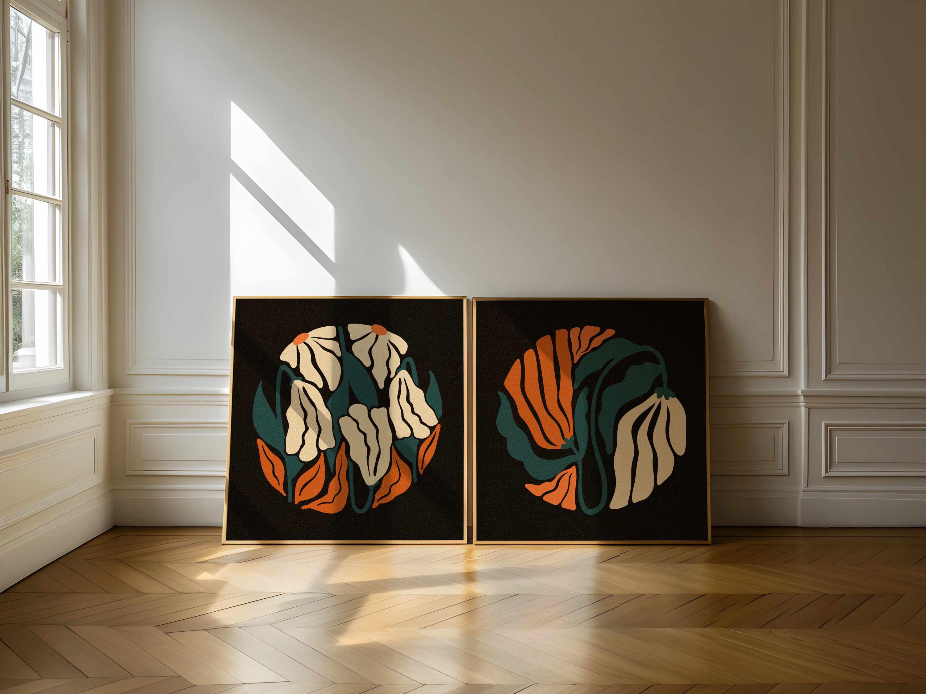 Abstract retro floral wall art set of two featuring groovy botanical forms in dark teal, rich orange and light beige set on a deep black background. Inspired by Matisse cutouts and mid century design, this square set blends vintage style with modern minimalism. Perfect for boho, minimalist, retro-inspired or mid century style interiors.