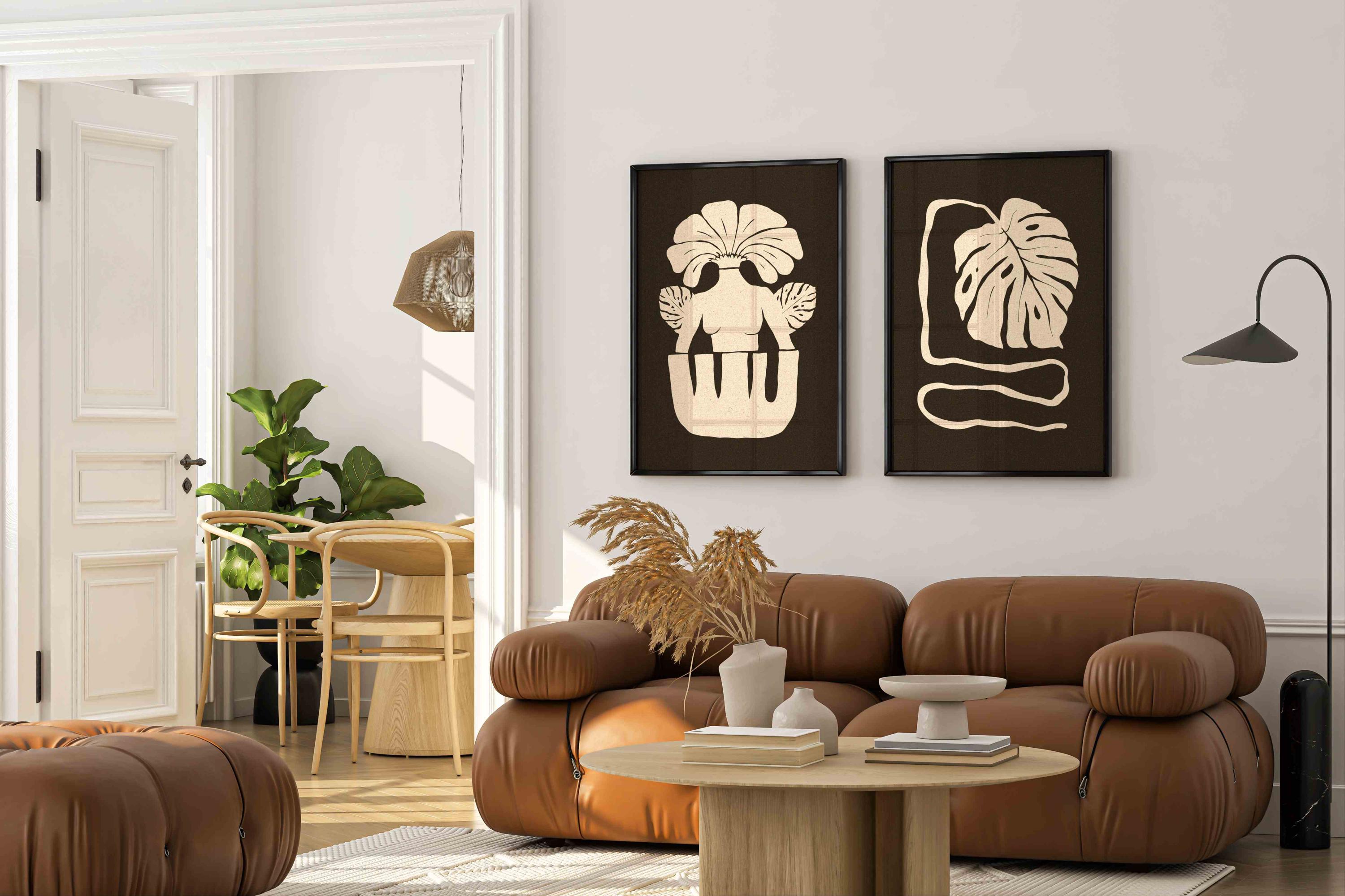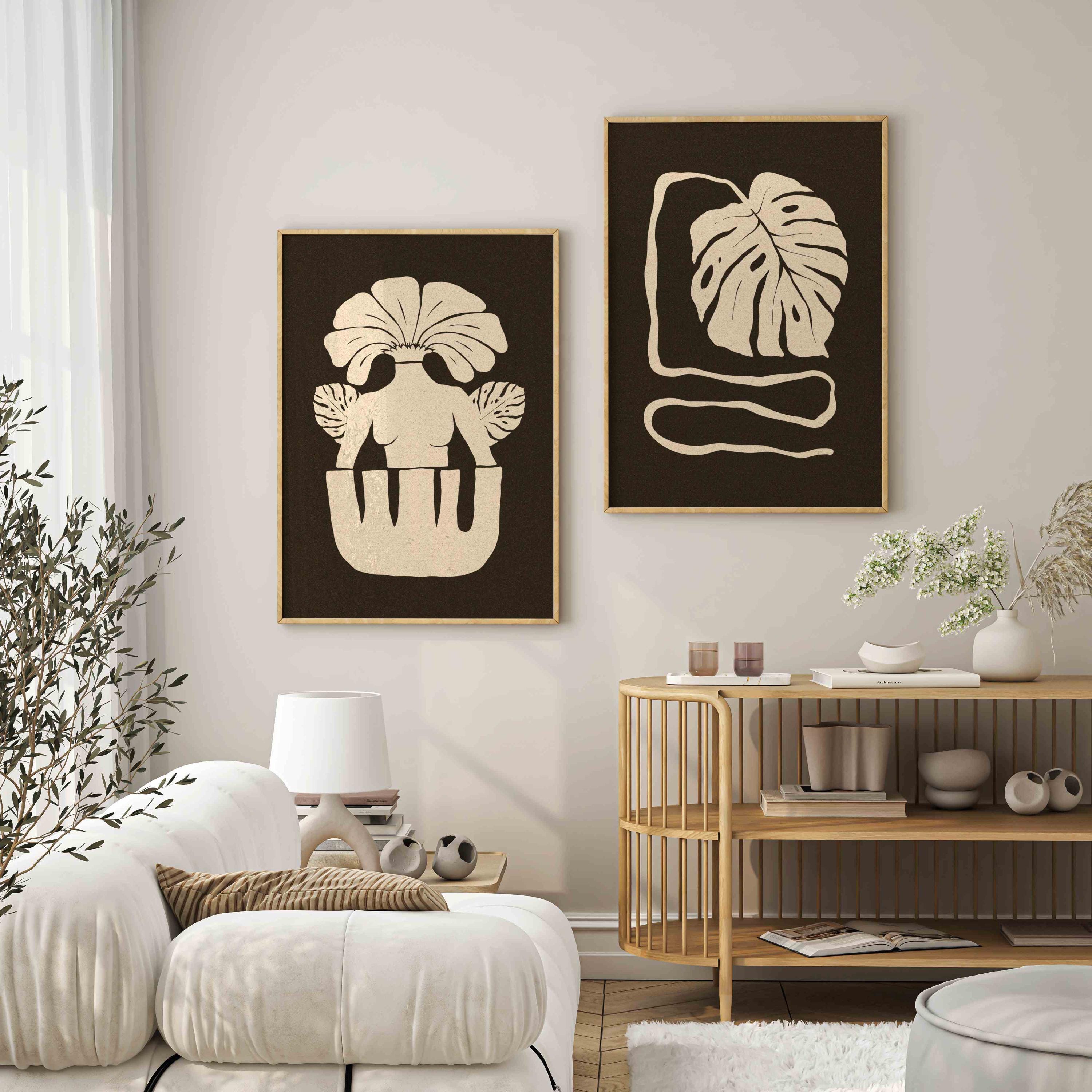Set of two mid-century modern botanical prints. Designed with earthy tones and abstract retro-inspired organic shapes, these artworks fit perfectly into boho, Scandinavian, and mid century interiors.