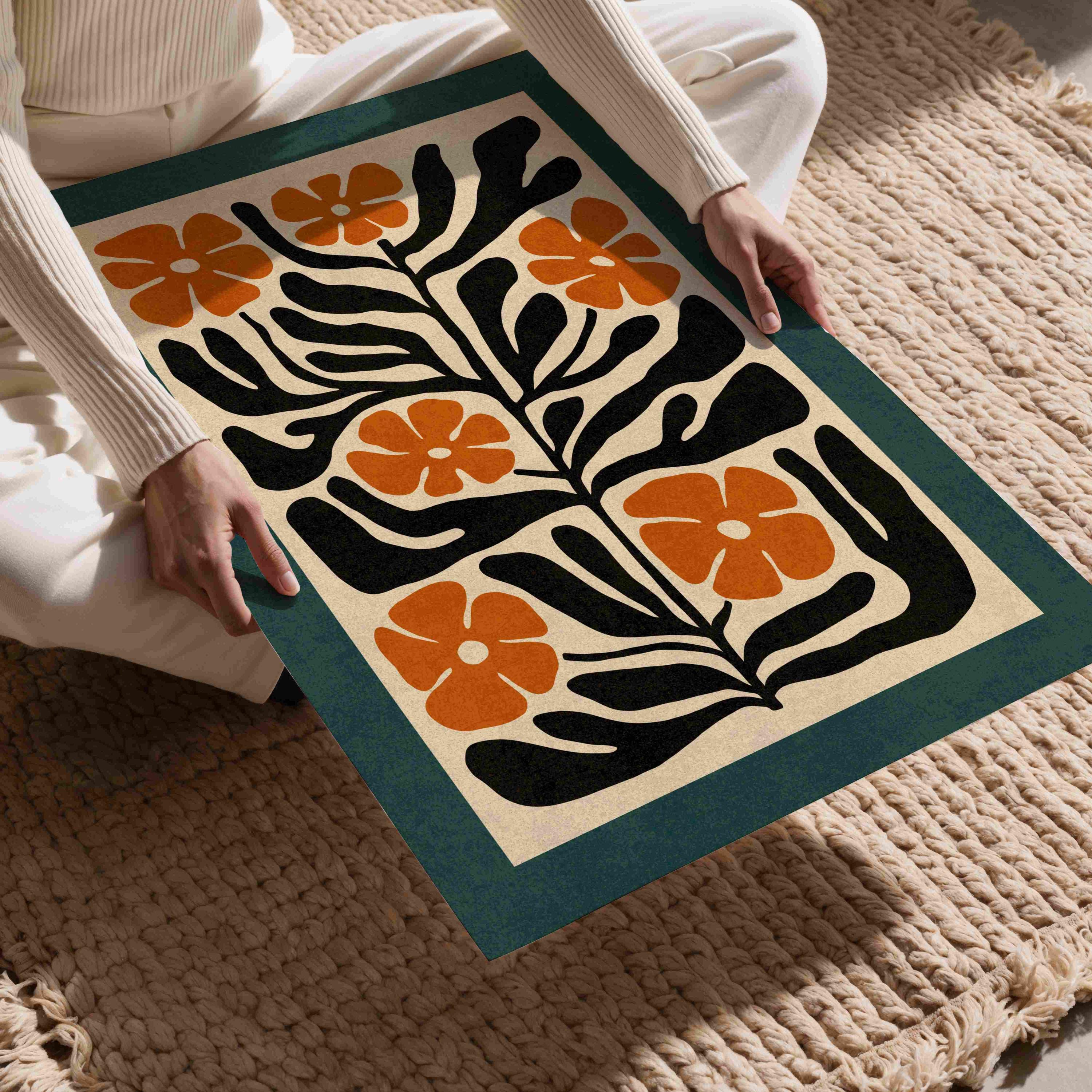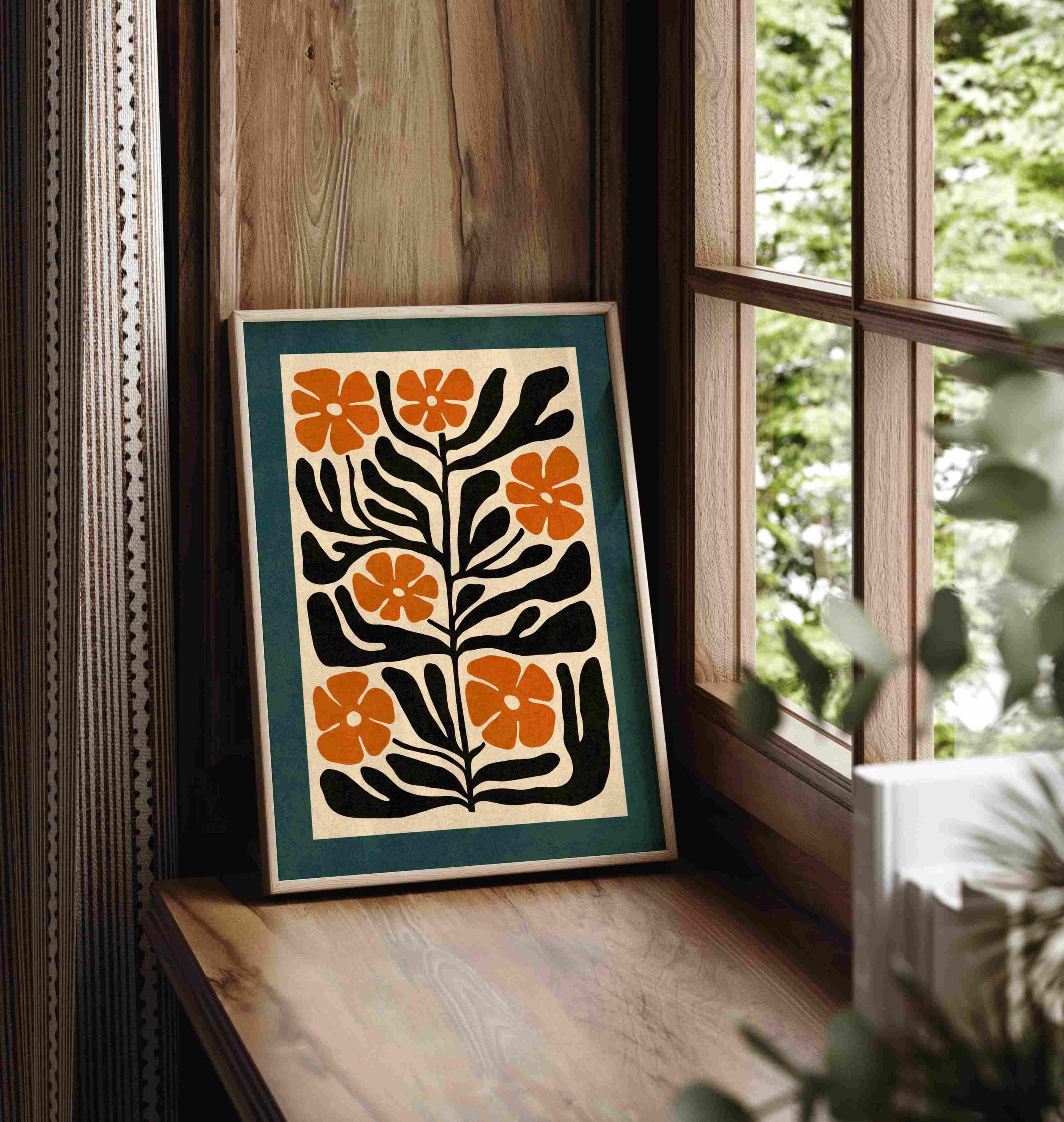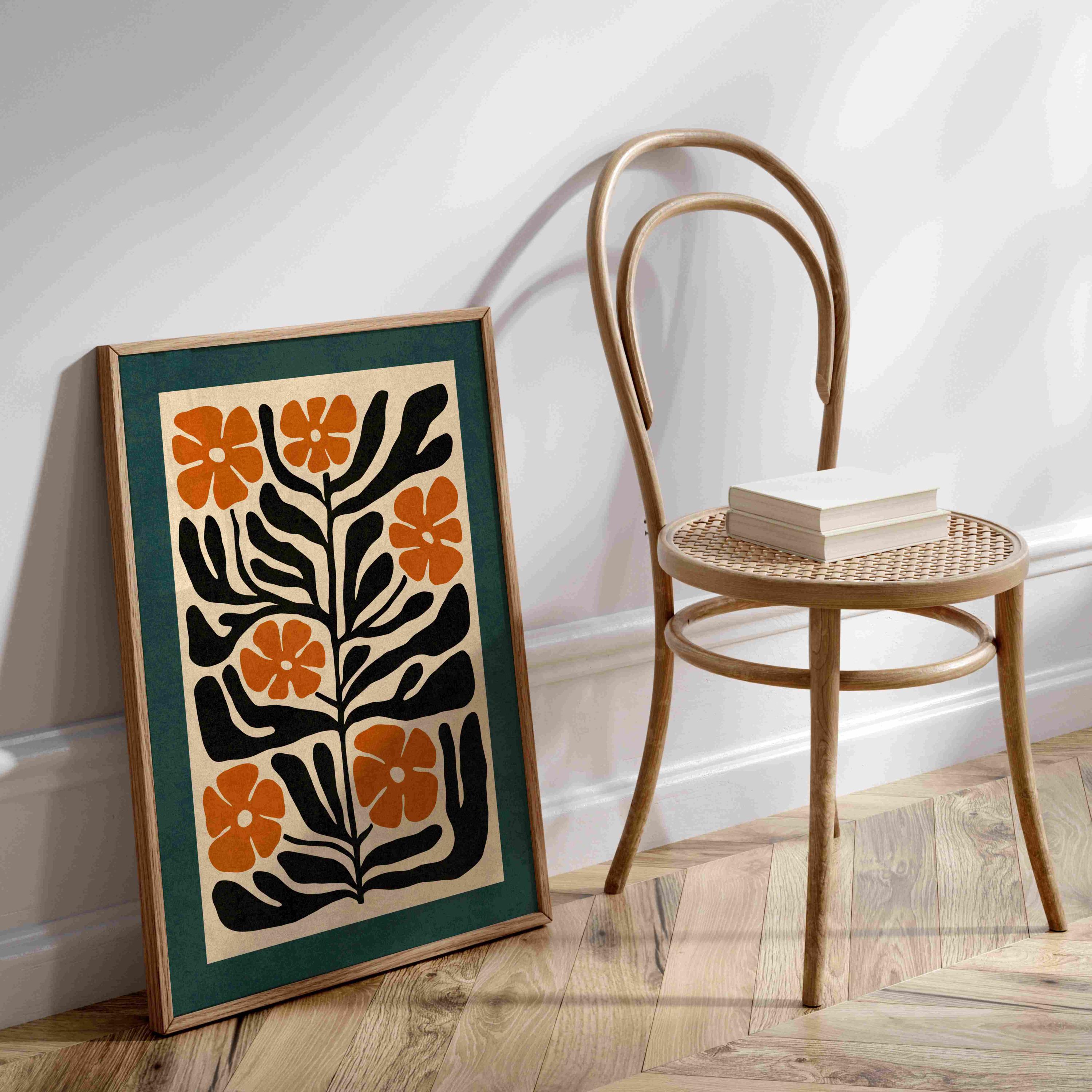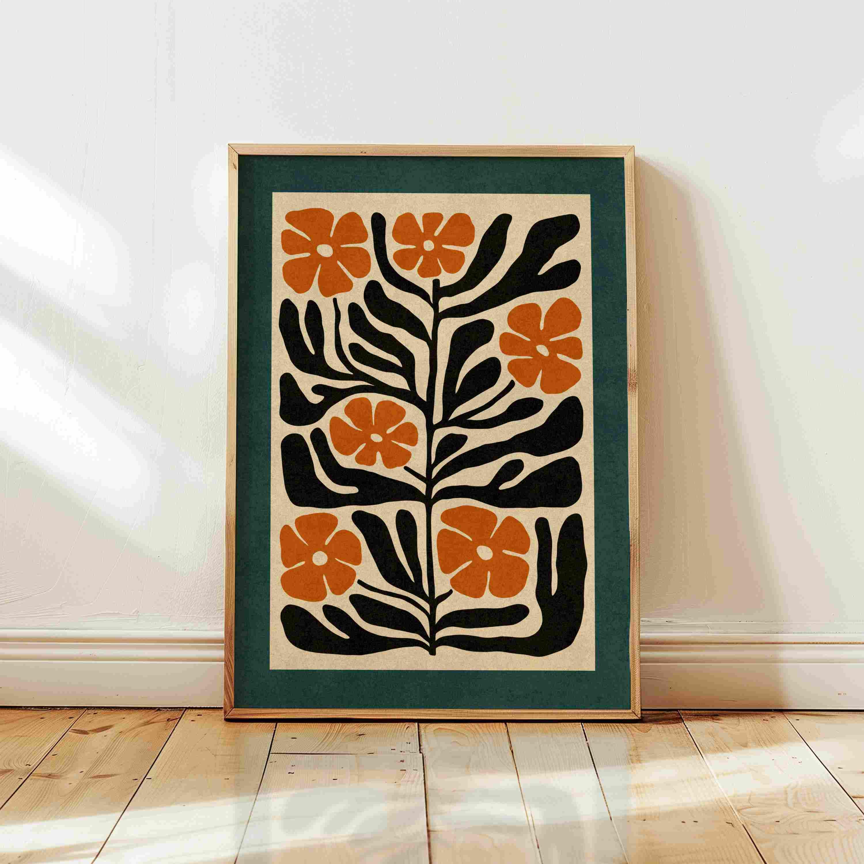 Retro floral wall art featuring an abstract Matisse-style botanical design in rich burnt orange, deep teal, warm cream and charcoal black.